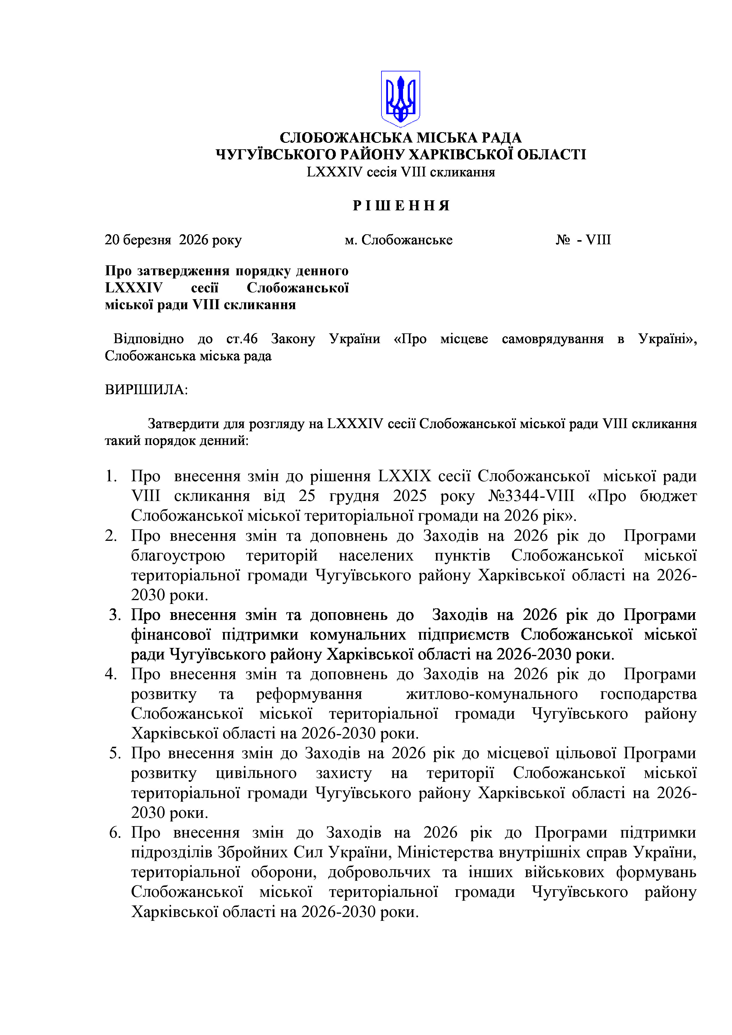 ПРОЄКТ рішення сесії №1 Про затвердження порядку денного LХХХІV сесії Слобожанської міської ради VІIІ скликання