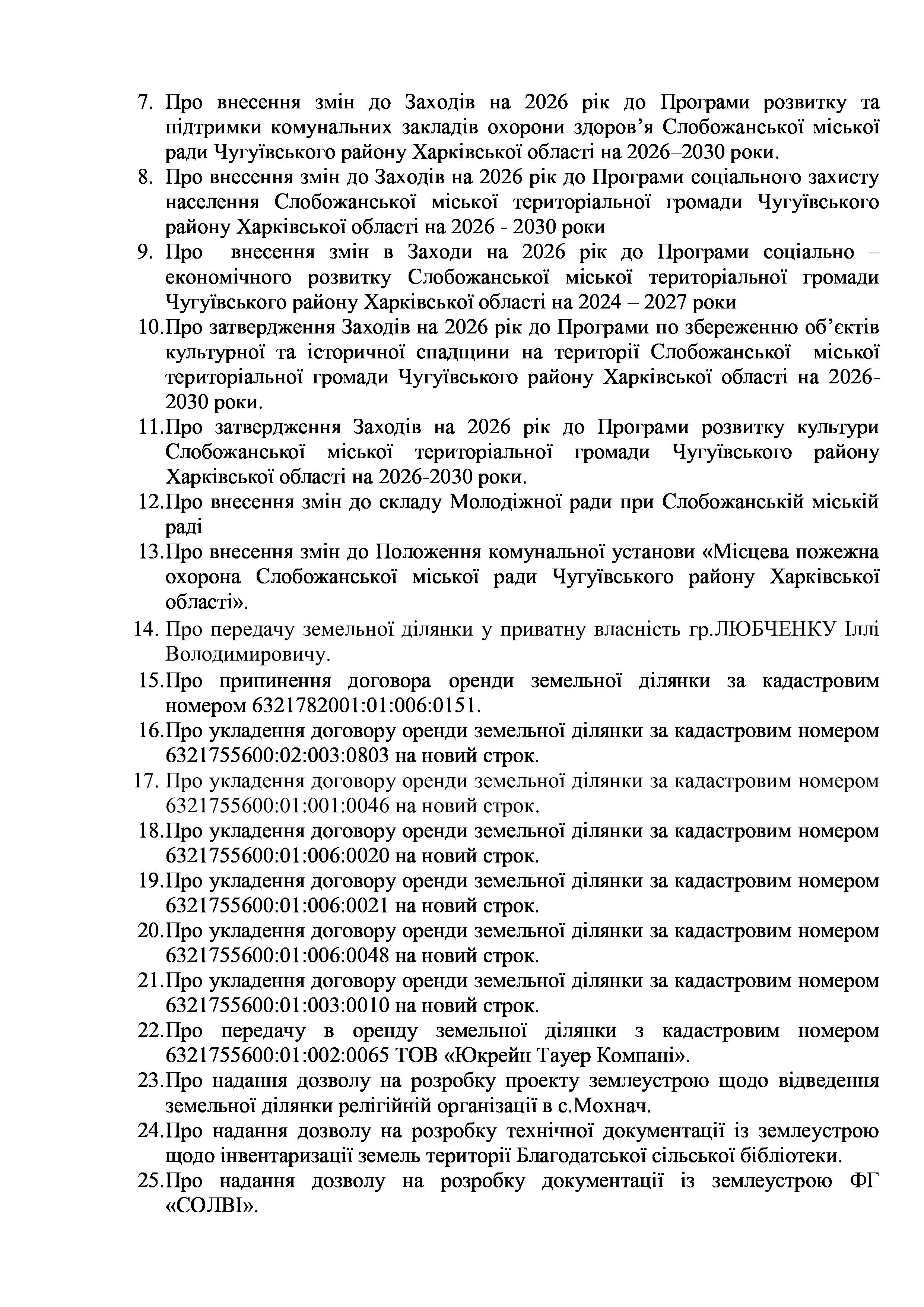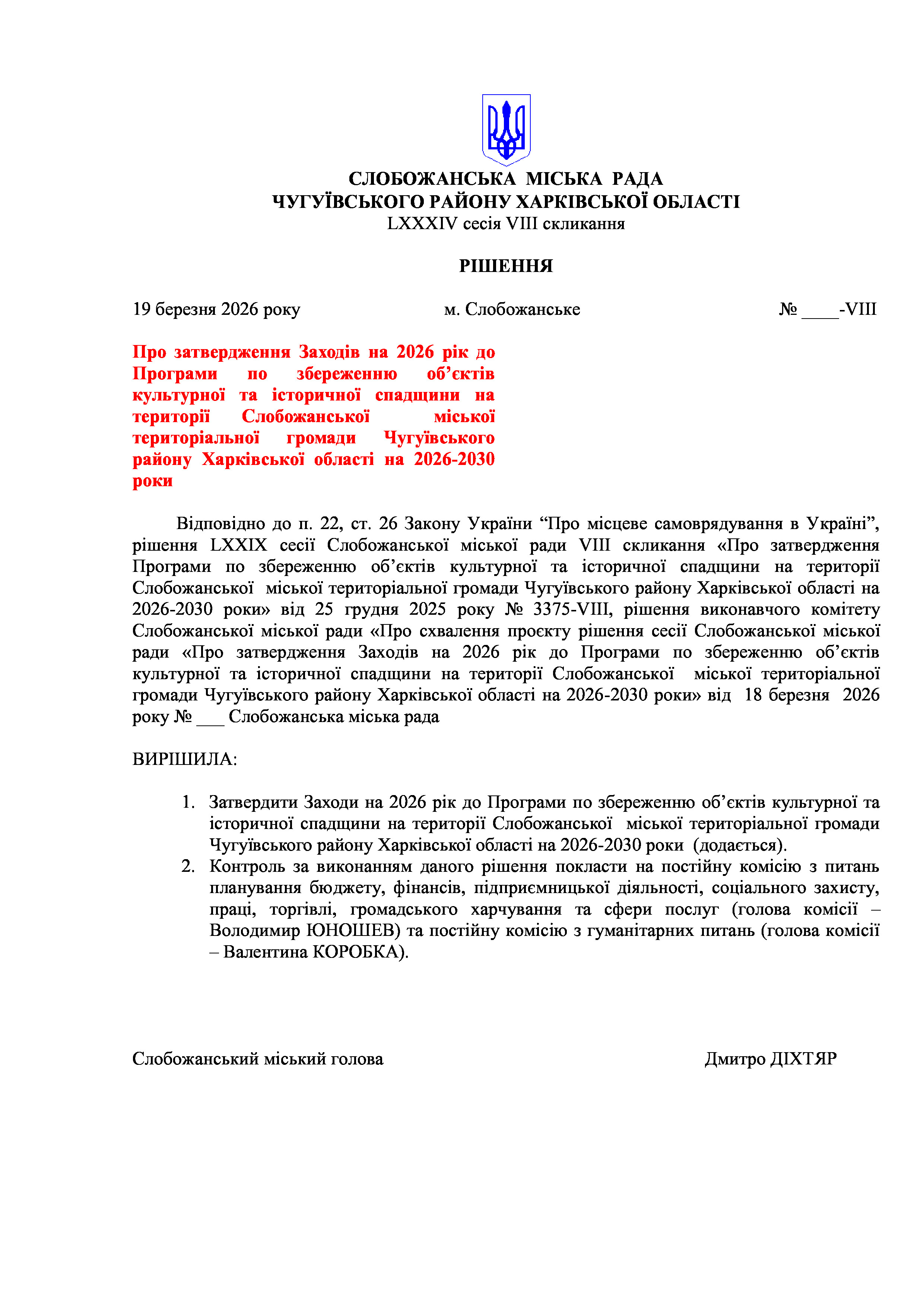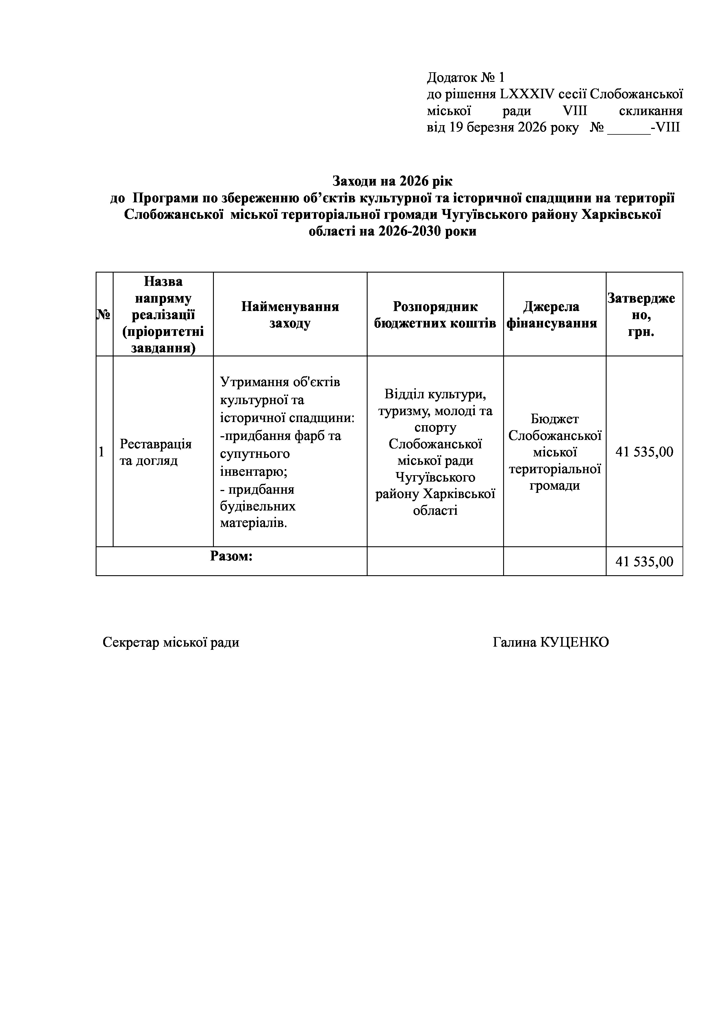 ПРОЄКТ рішення сесії №11 Про затвердження Заходів на 2026 рік до Програми по збереженню об’єктів культурної та історичної спадщини на території Слобожанської міської територіальної громади Чугуївського району Харківської області на 2026-2030 роки