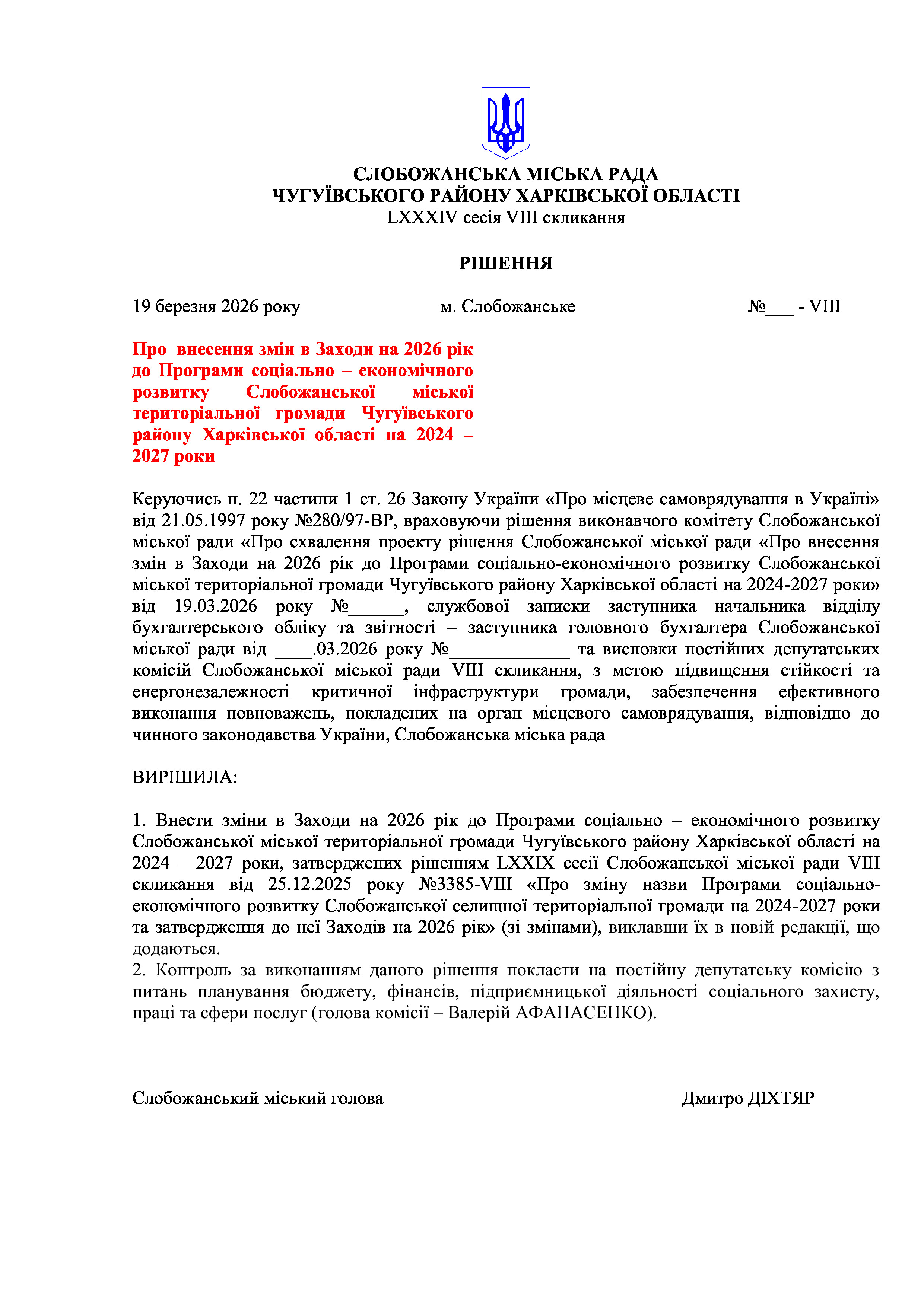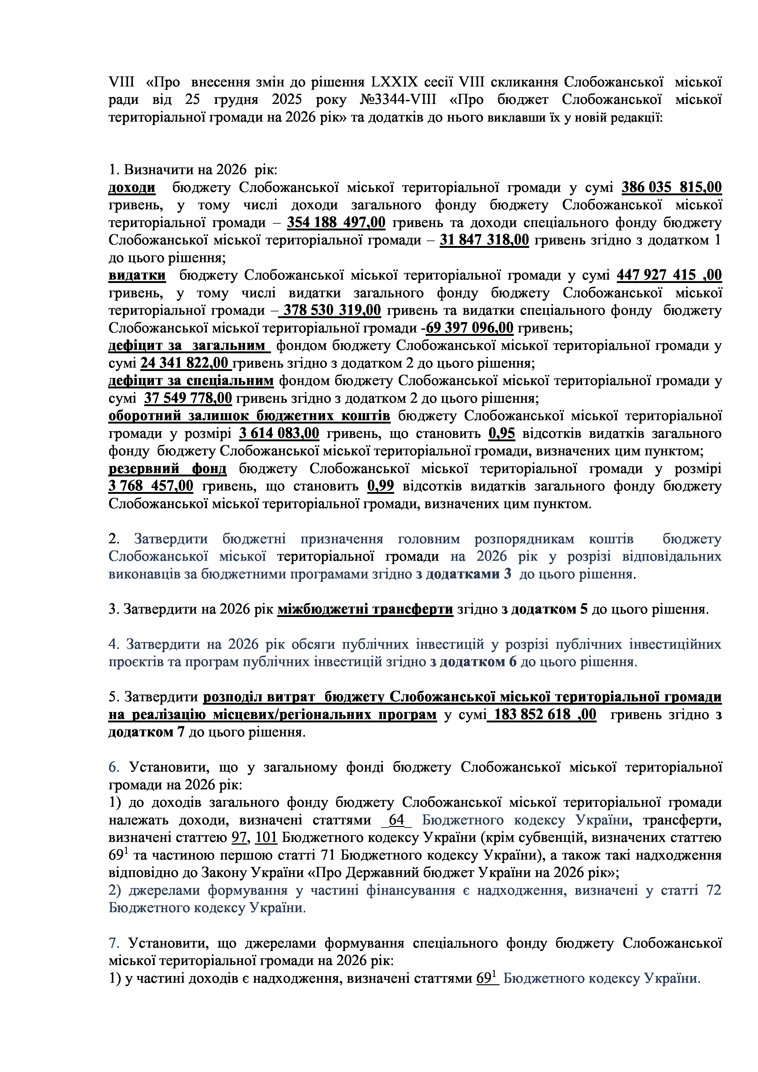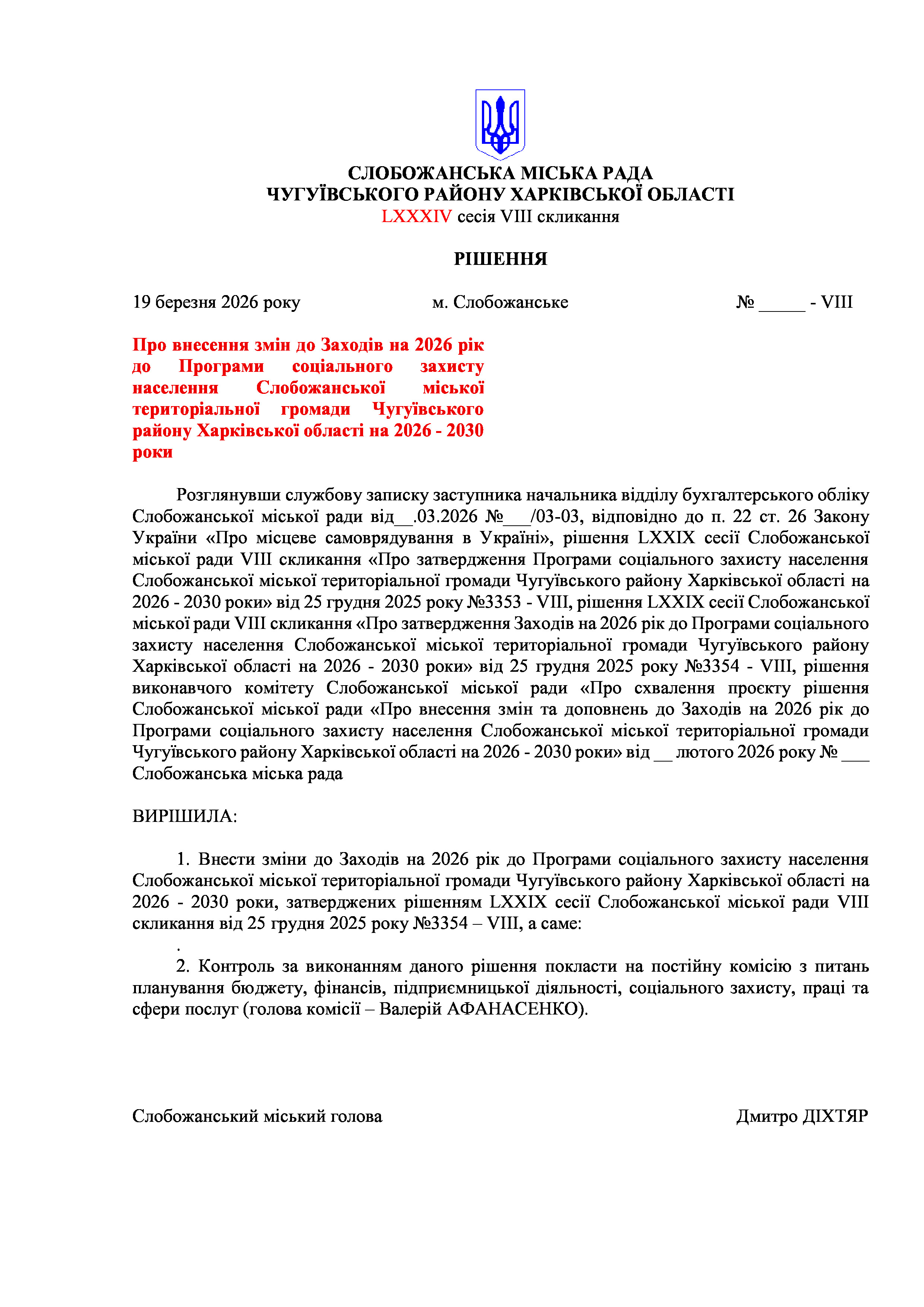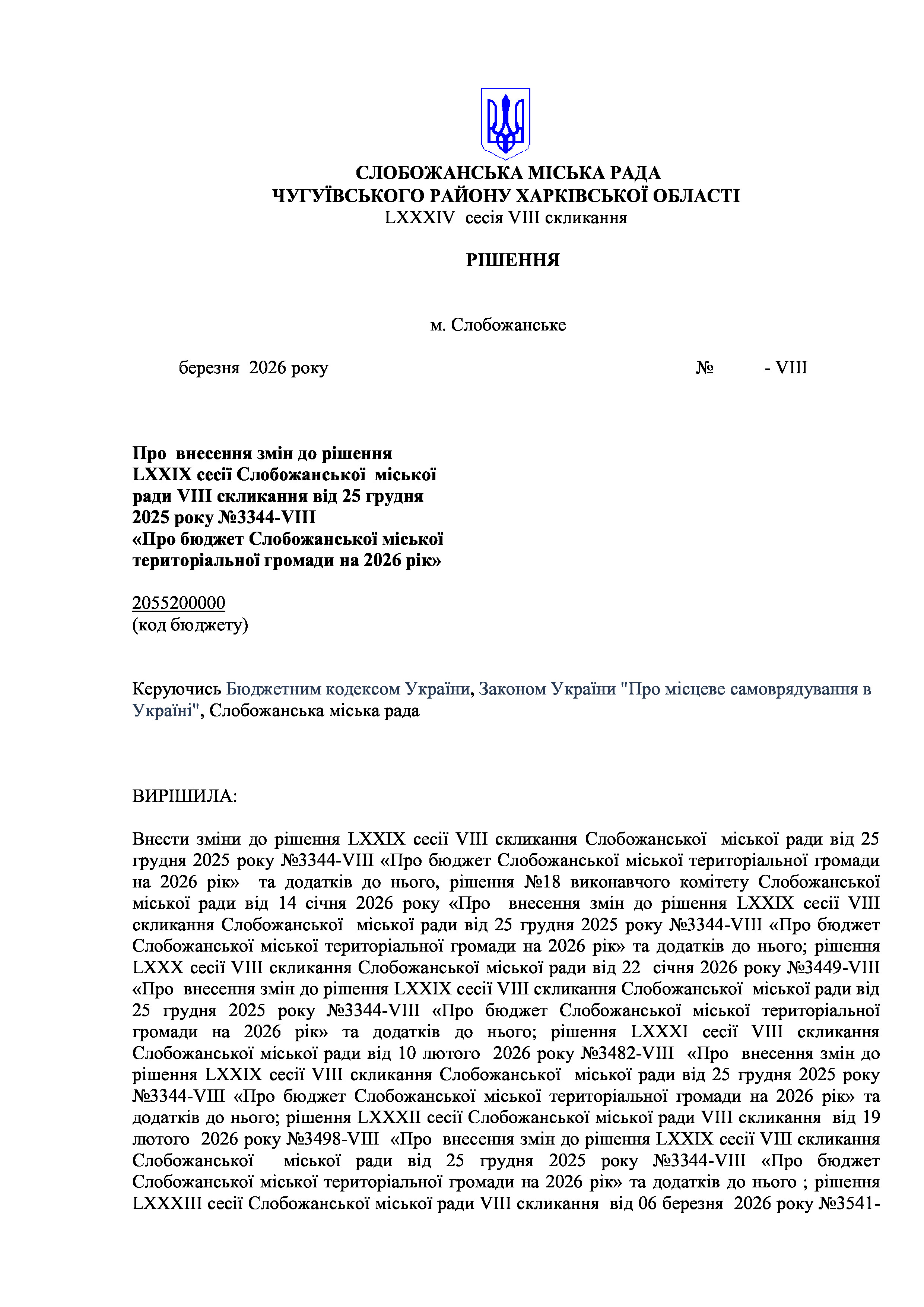 ПРОЄКТ рішення сесії №2 Про внесення змін до рішення LXXIX сесії Слобожанської міської ради VIII скликання від 25 грудня 2025 року №3344-VIII «Про бюджет Слобожанської міської територіальної громади на 2026 рік»