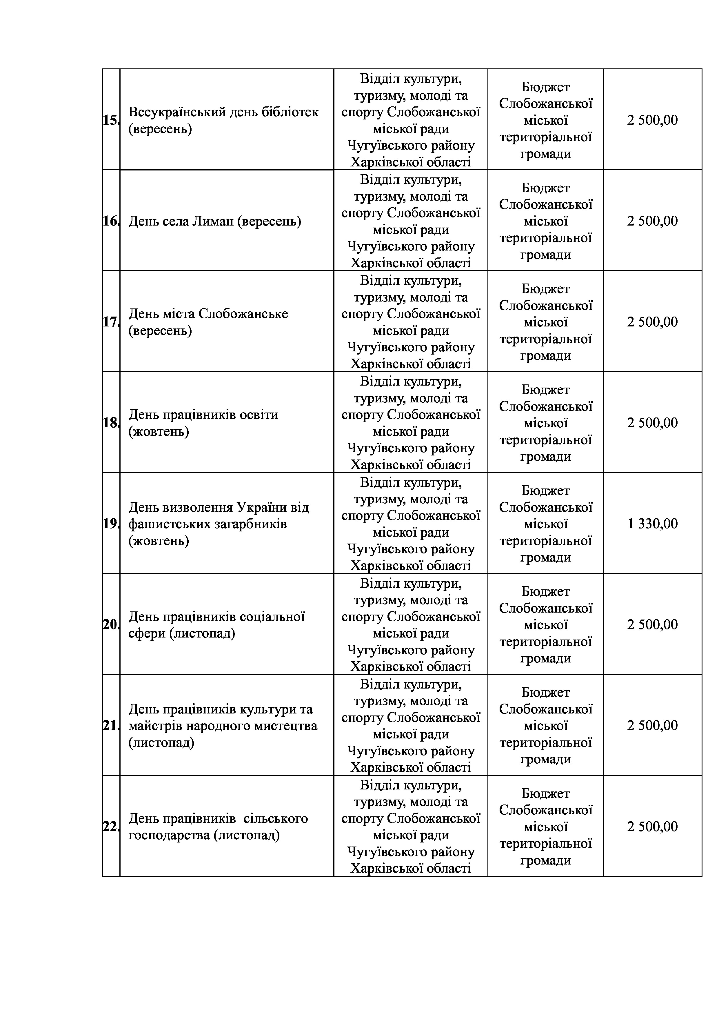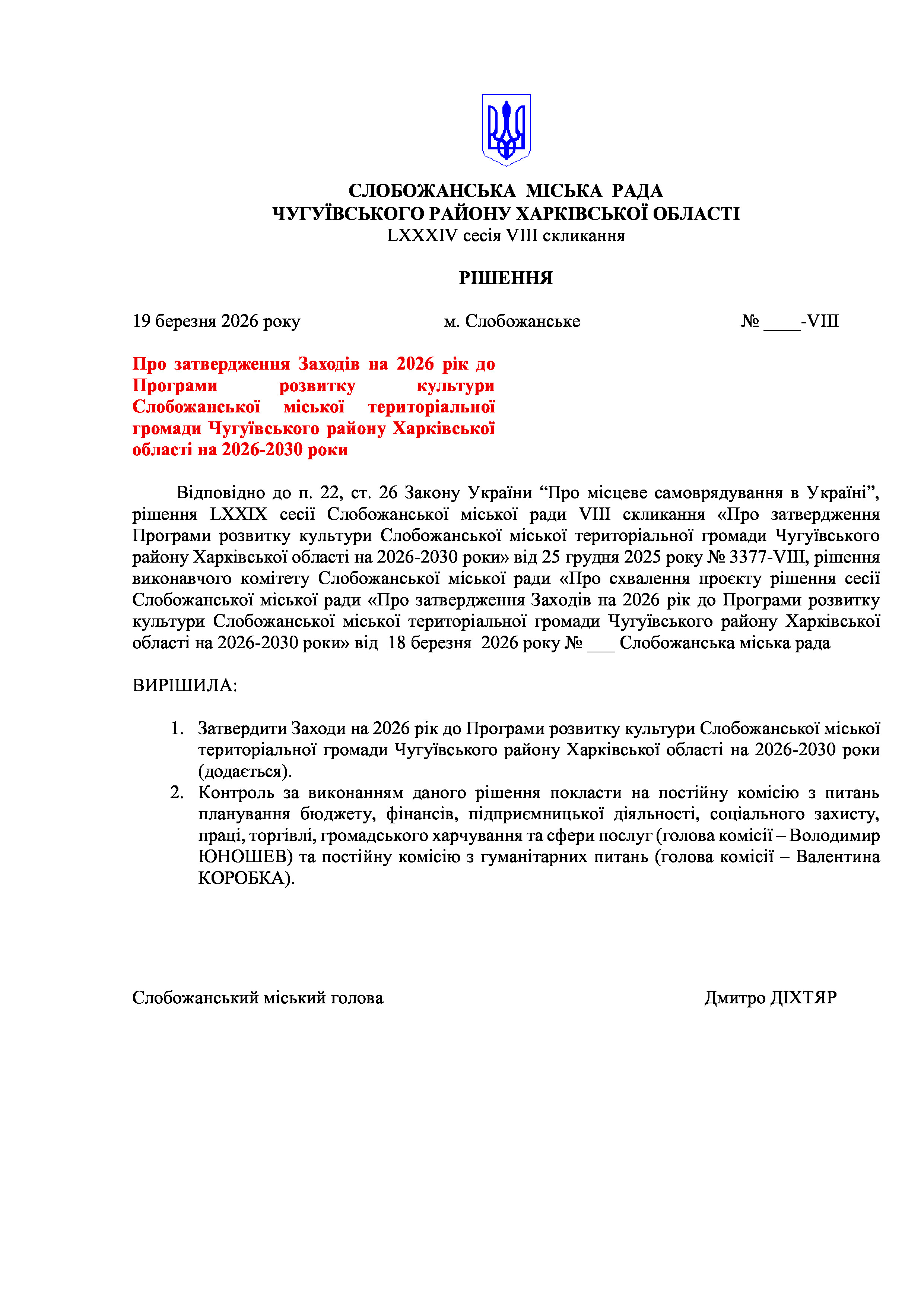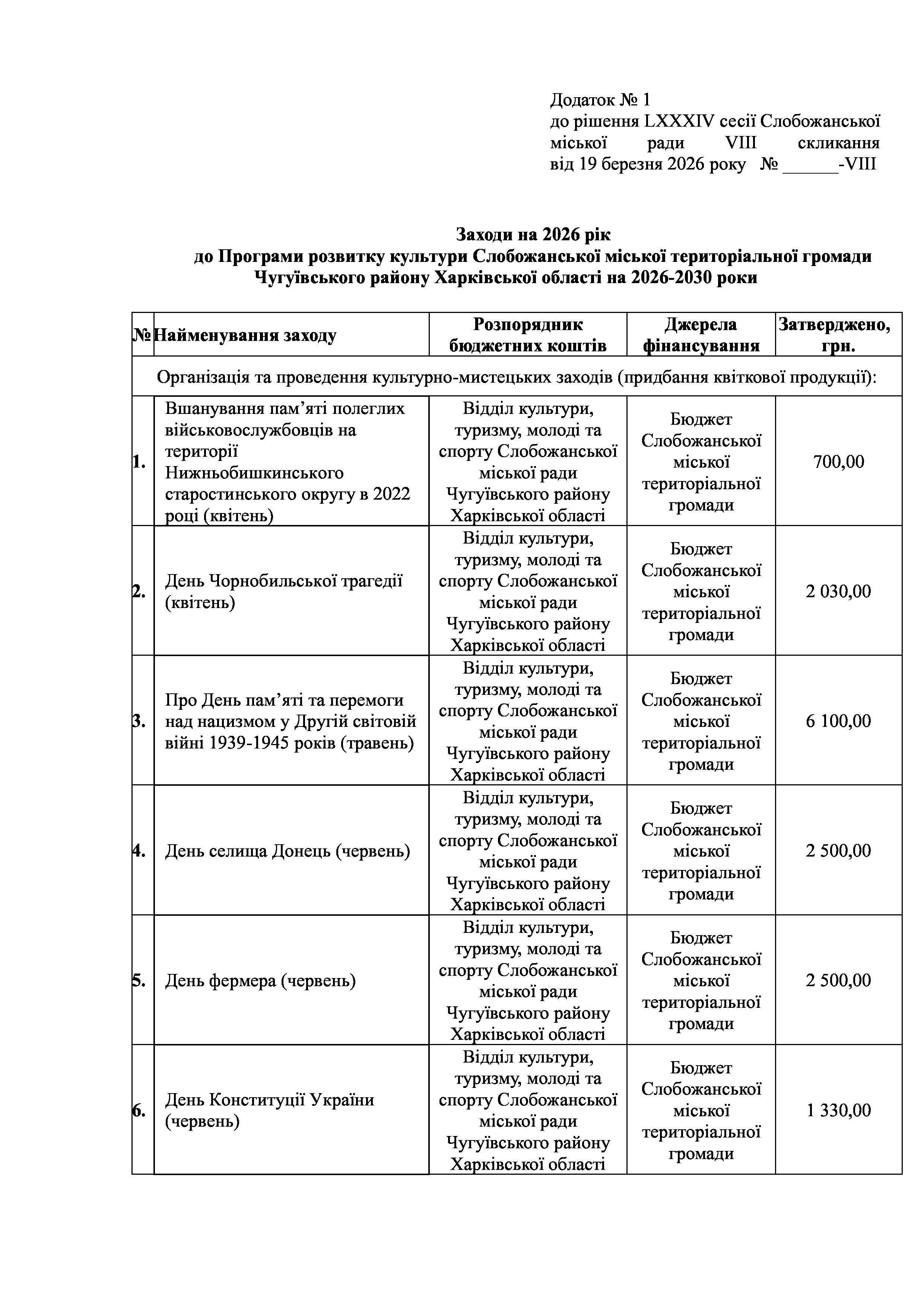 ПРОЄКТ рішення сесії №12 Про затвердження Заходів на 2026 рік до Програми розвитку культури Слобожанської міської територіальної громади Чугуївського району Харківської області на 2026-2030 роки