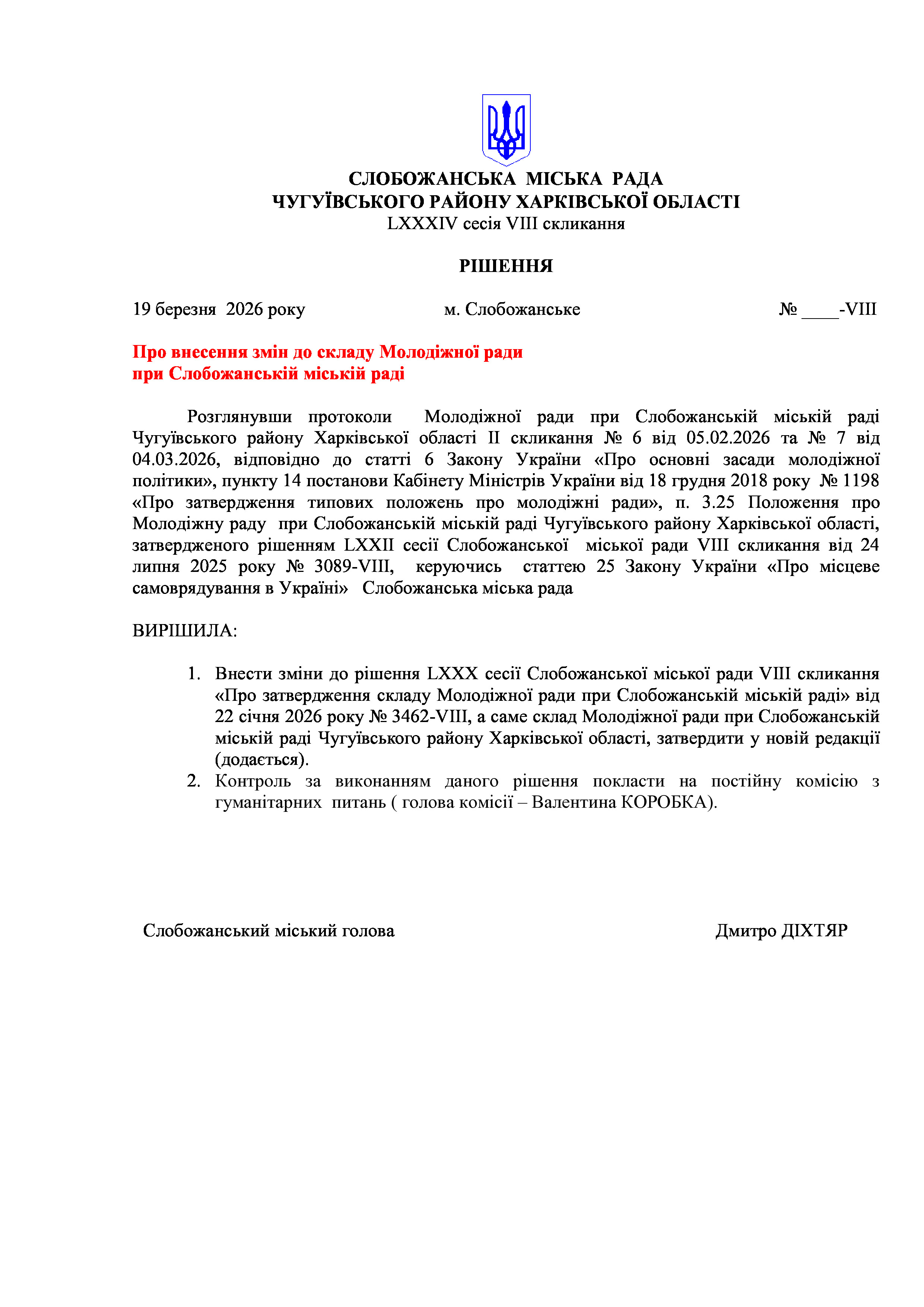 ПРОЄКТ рішення сесії №13 Про внесення змін до складу Молодіжної ради при Слобожанській міській раді