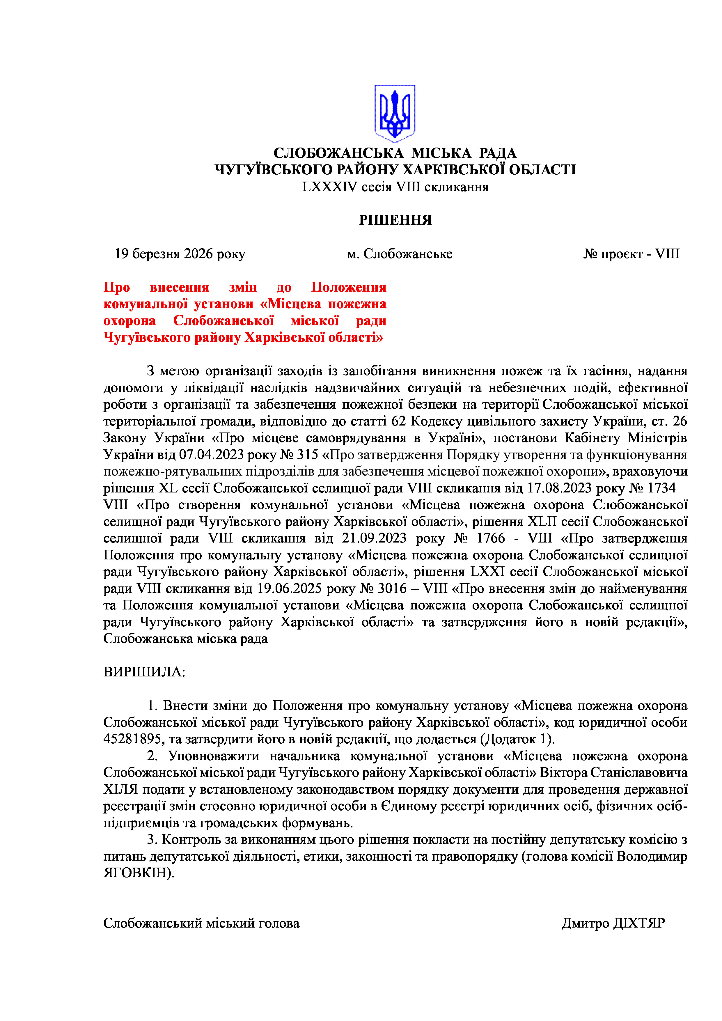 ПРОЄКТ рішення сесії №14 Про внесення змін до Положення комунальної установи «Місцева пожежна охорона Слобожанської міської ради Чугуївського району Харківської області»