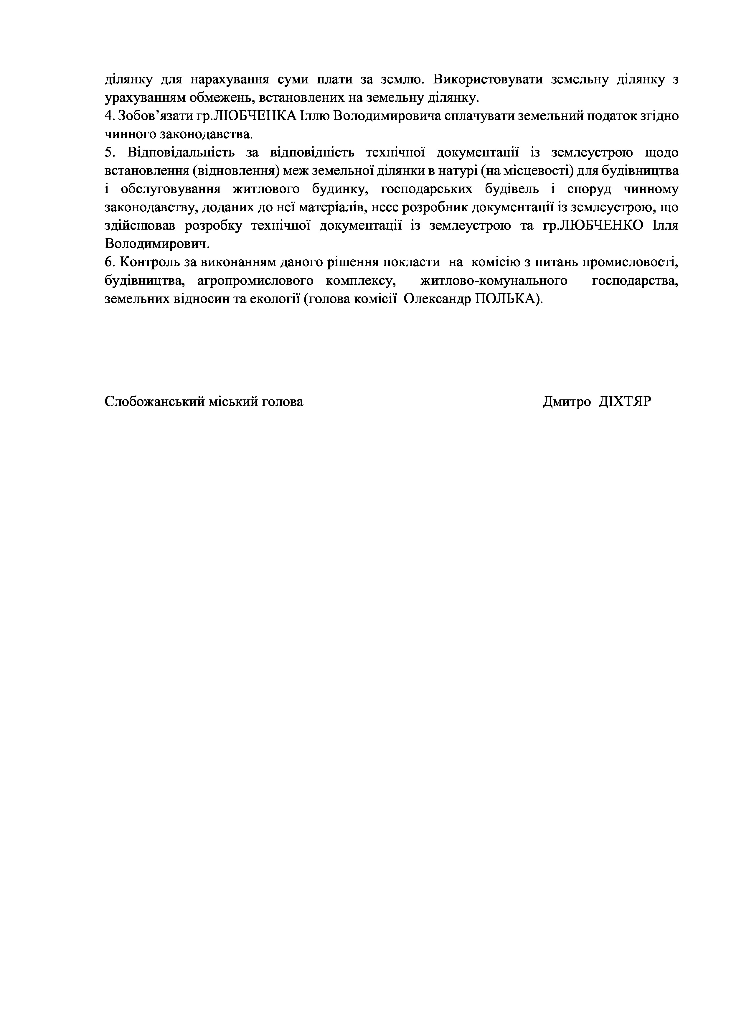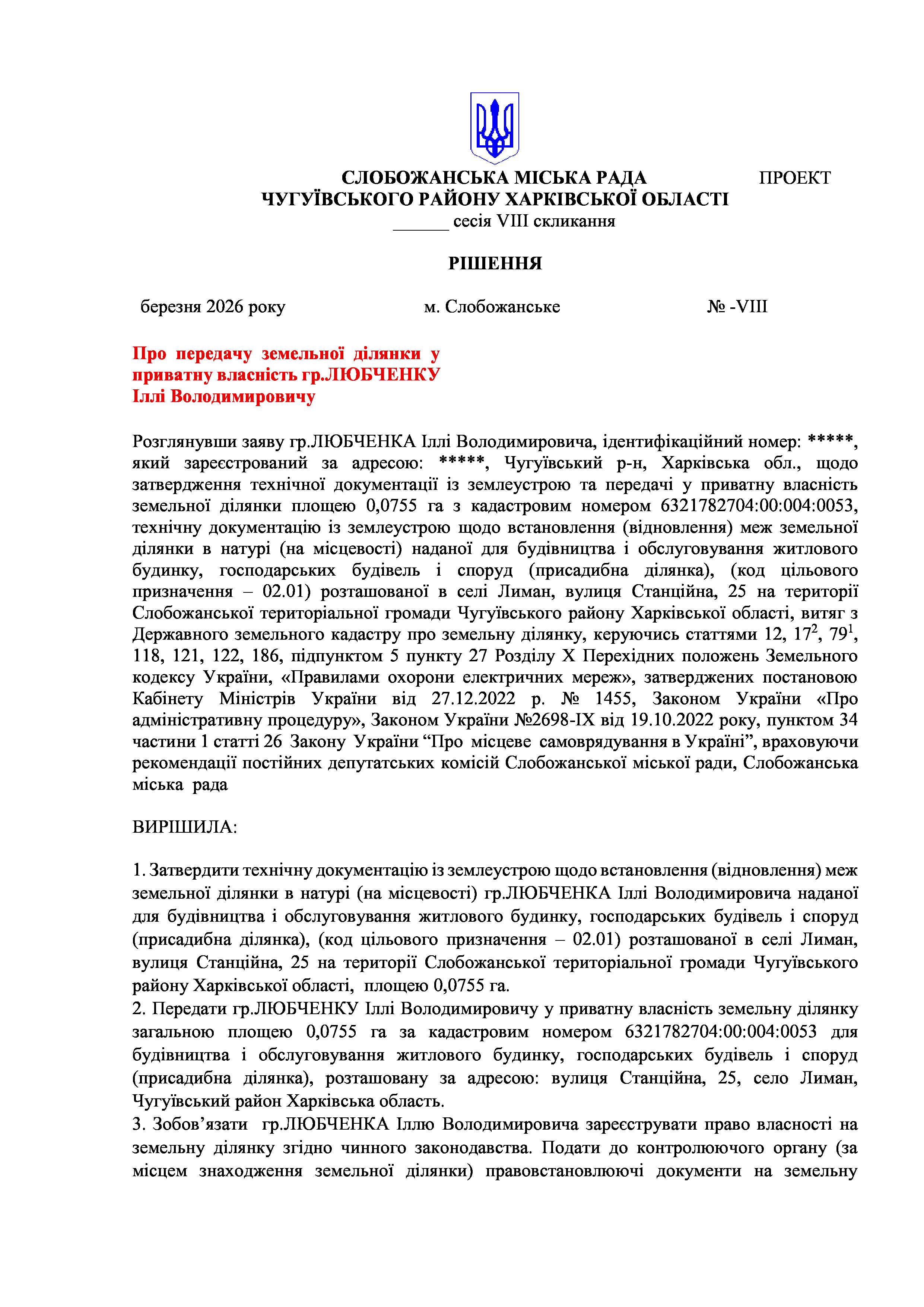 ПРОЄКТ рішення сесії №15 Про передачу земельної ділянки у приватну власність гр.ЛЮБЧЕНКУ Іллі Володимировичу