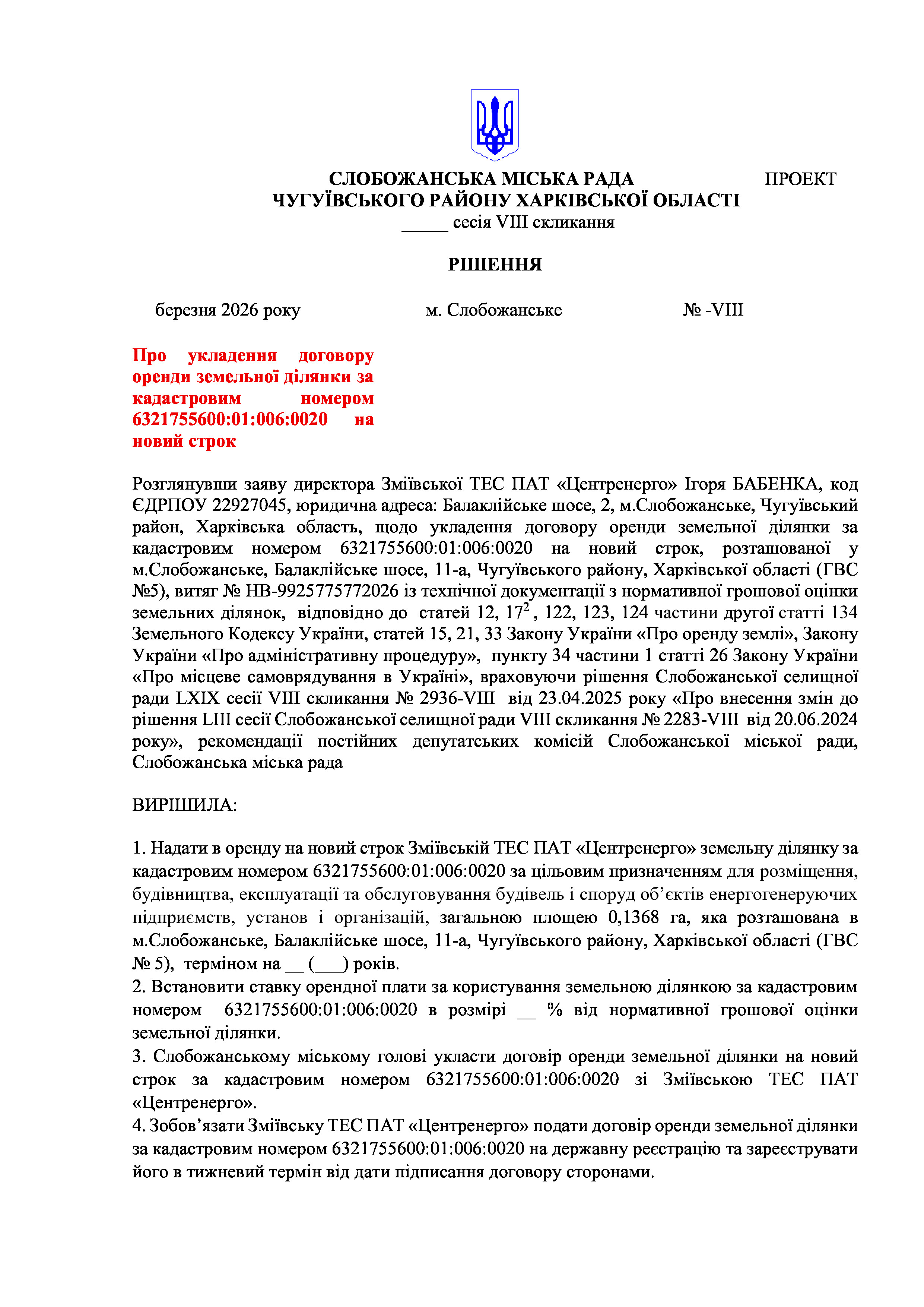 ПРОЄКТ рішення сесії №19 Про укладення договору оренди земельної ділянки за кадастровим номером 6321755600:01:006:0020 на новий строк