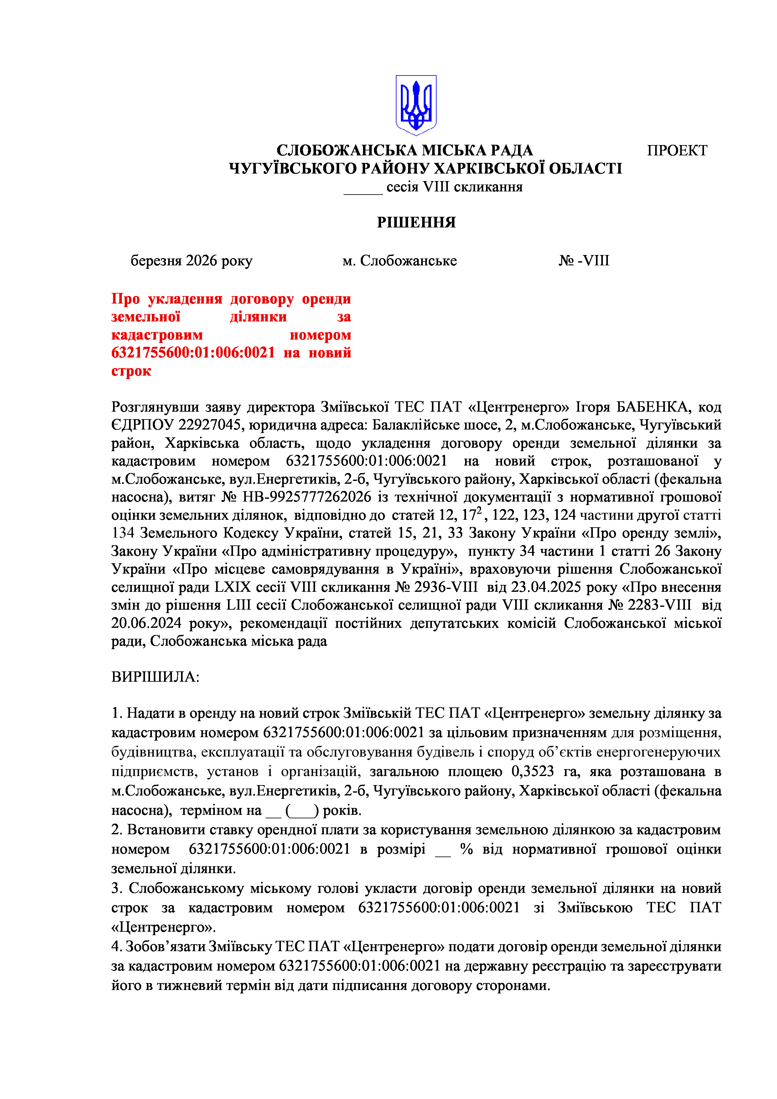 ПРОЄКТ рішення сесії №20 Про укладення договору оренди земельної ділянки за кадастровим номером 6321755600:01:006:0021 на новий строк