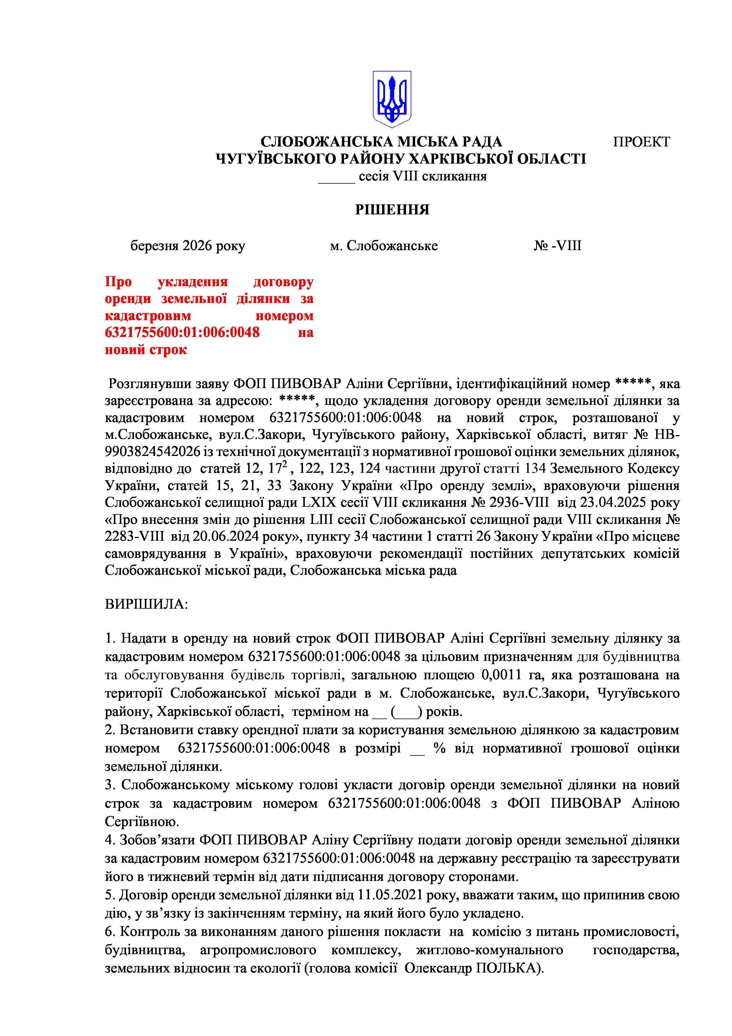 ПРОЄКТ рішення сесії №21 Про укладення договору оренди земельної ділянки за кадастровим номером 6321755600:01:006:0048 на новий строк