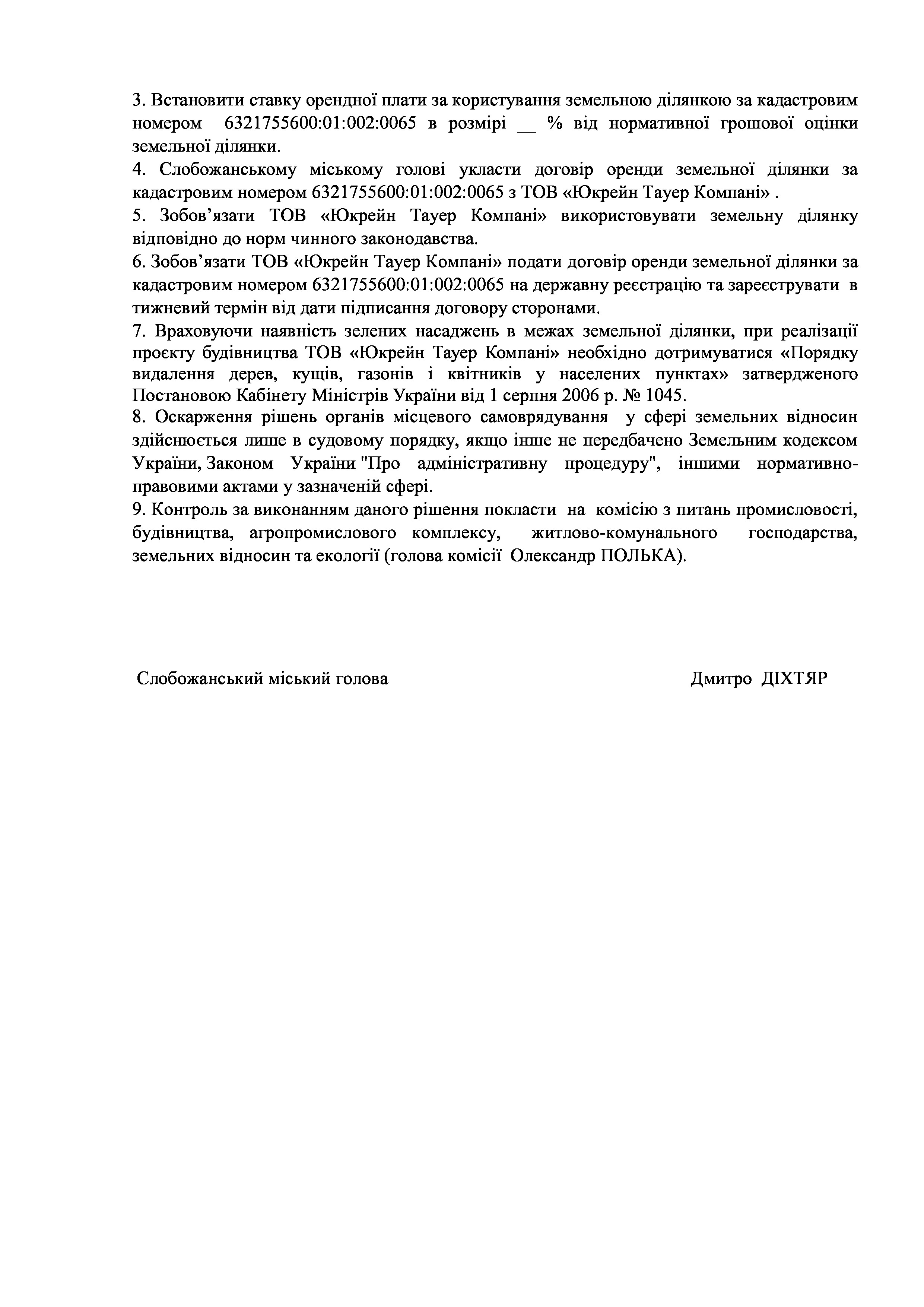 ПРОЄКТ рішення сесії №23 Про передачу в оренду земельної ділянки з кадастровим номером 6321755600:01:002:0065 ТОВ «Юкрейн Тауер Компані»