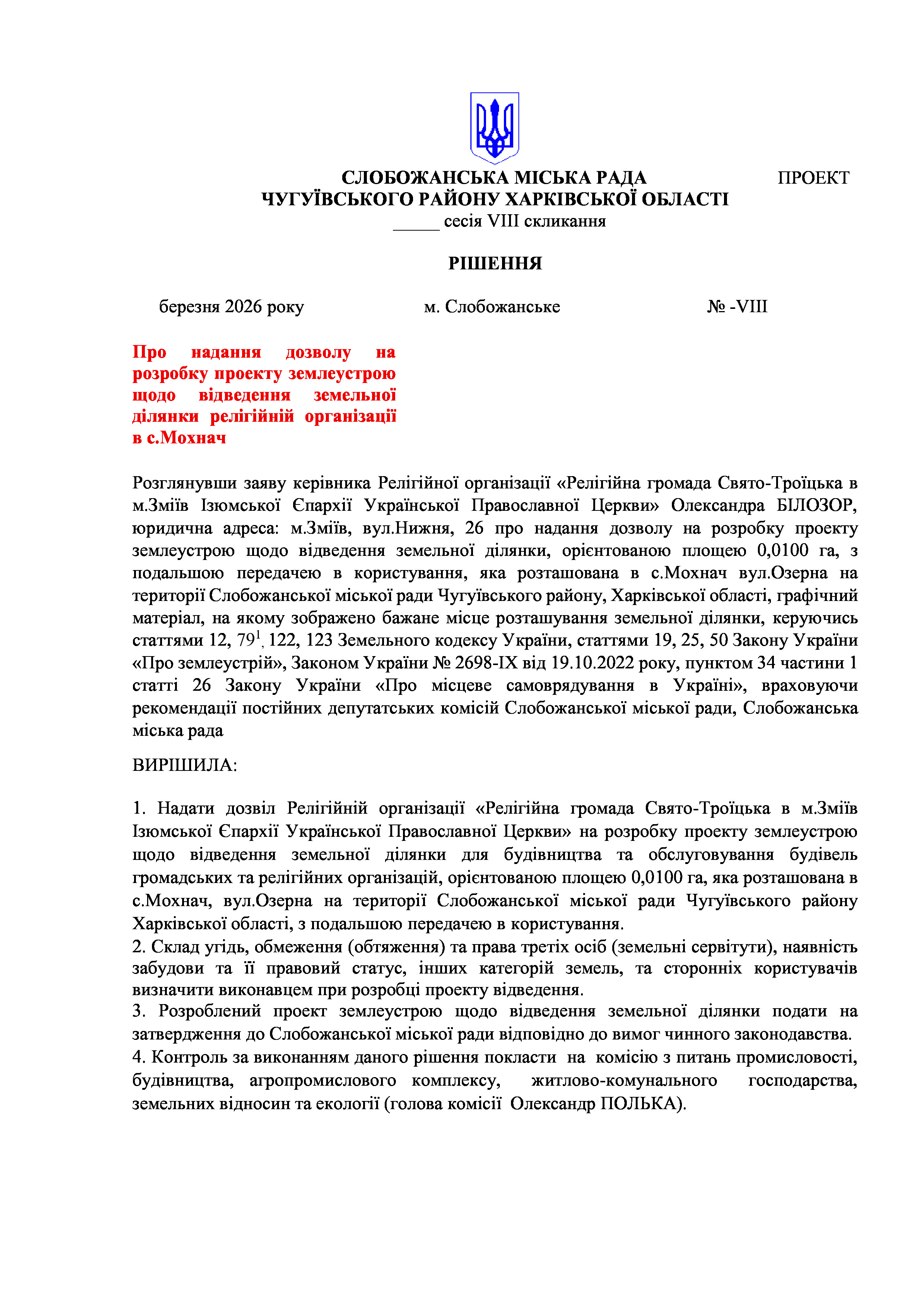 ПРОЄКТ рішення сесії №24 Про надання дозволу на розробку проекту землеустрою щодо відведення земельної ділянки релігійній організації в с.Мохнач