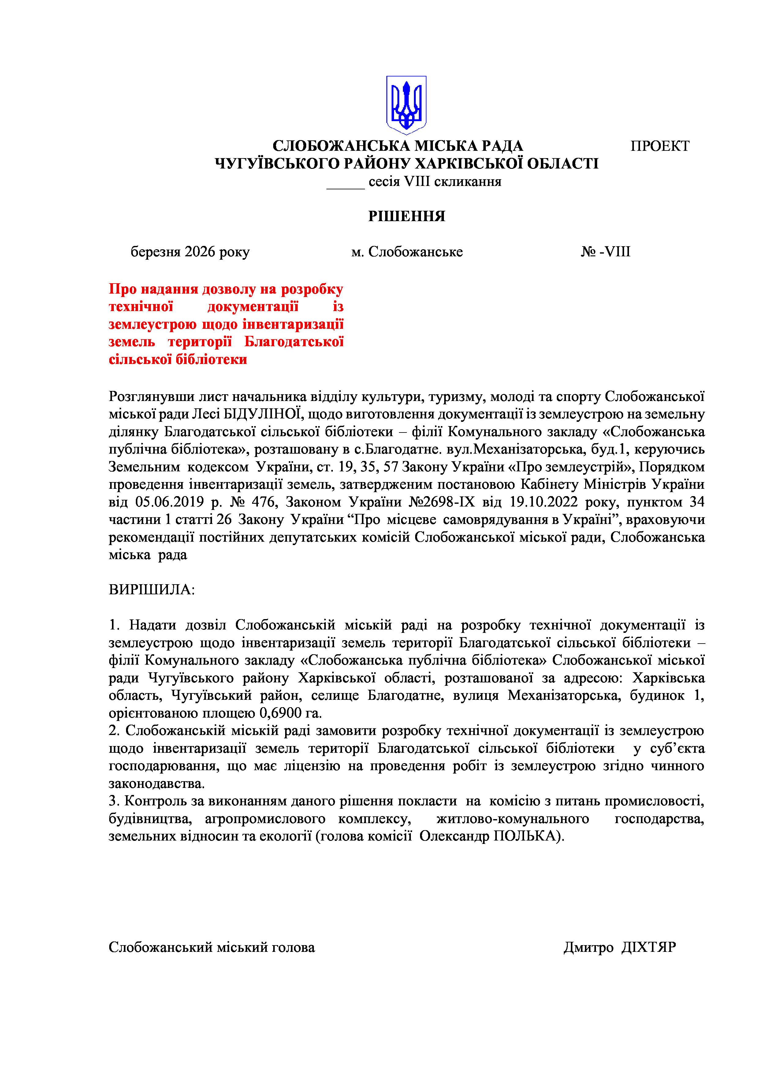 ПРОЄКТ рішення сесії №25 Про надання дозволу на розробку технічної документації із землеустрою щодо інвентаризації земель території Благодатської сільської бібліотеки