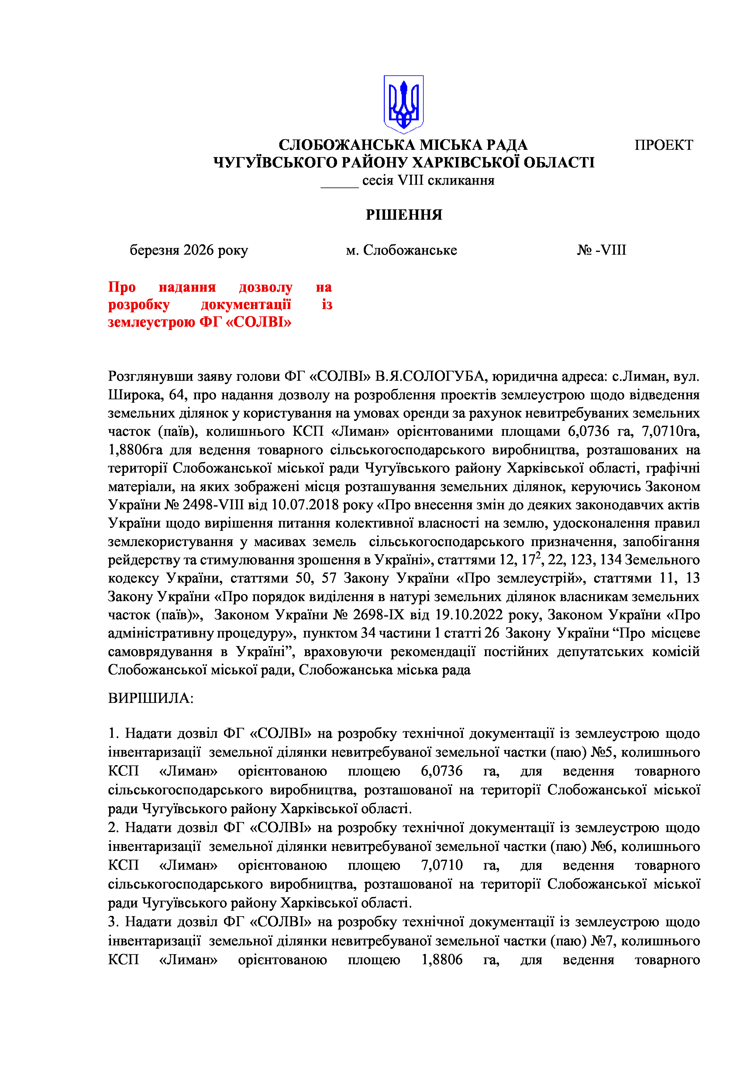 ПРОЄКТ рішення сесії №26 Про надання дозволу на розробку документації із землеустрою ФГ «СОЛВІ»