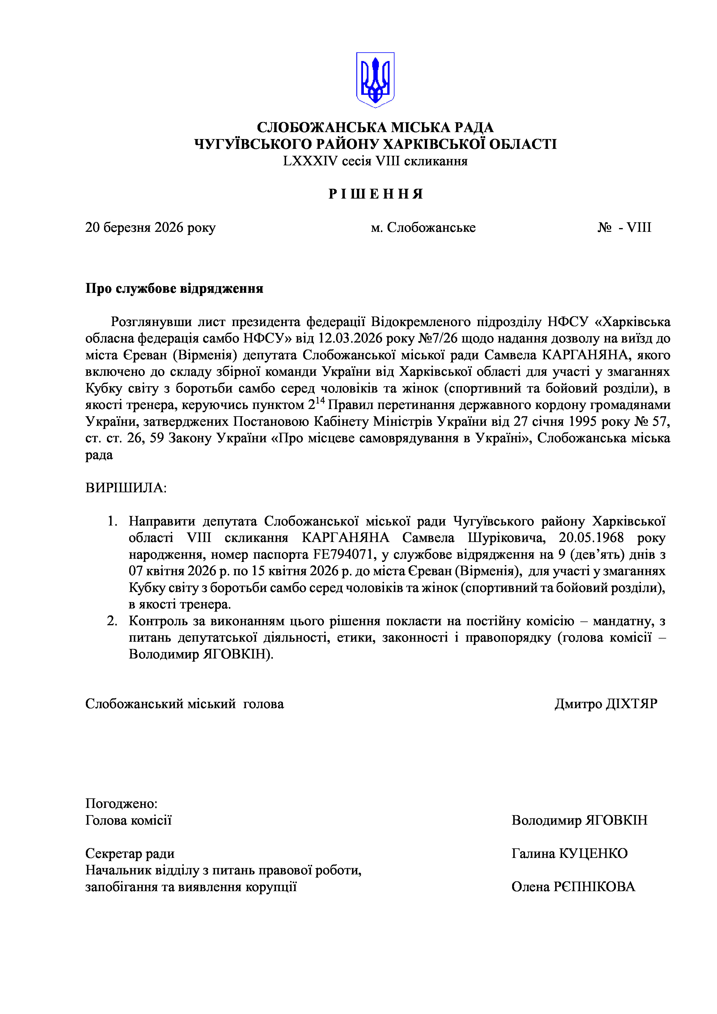 ПРОЄКТ рішення сесії №29 Про службове відрядження