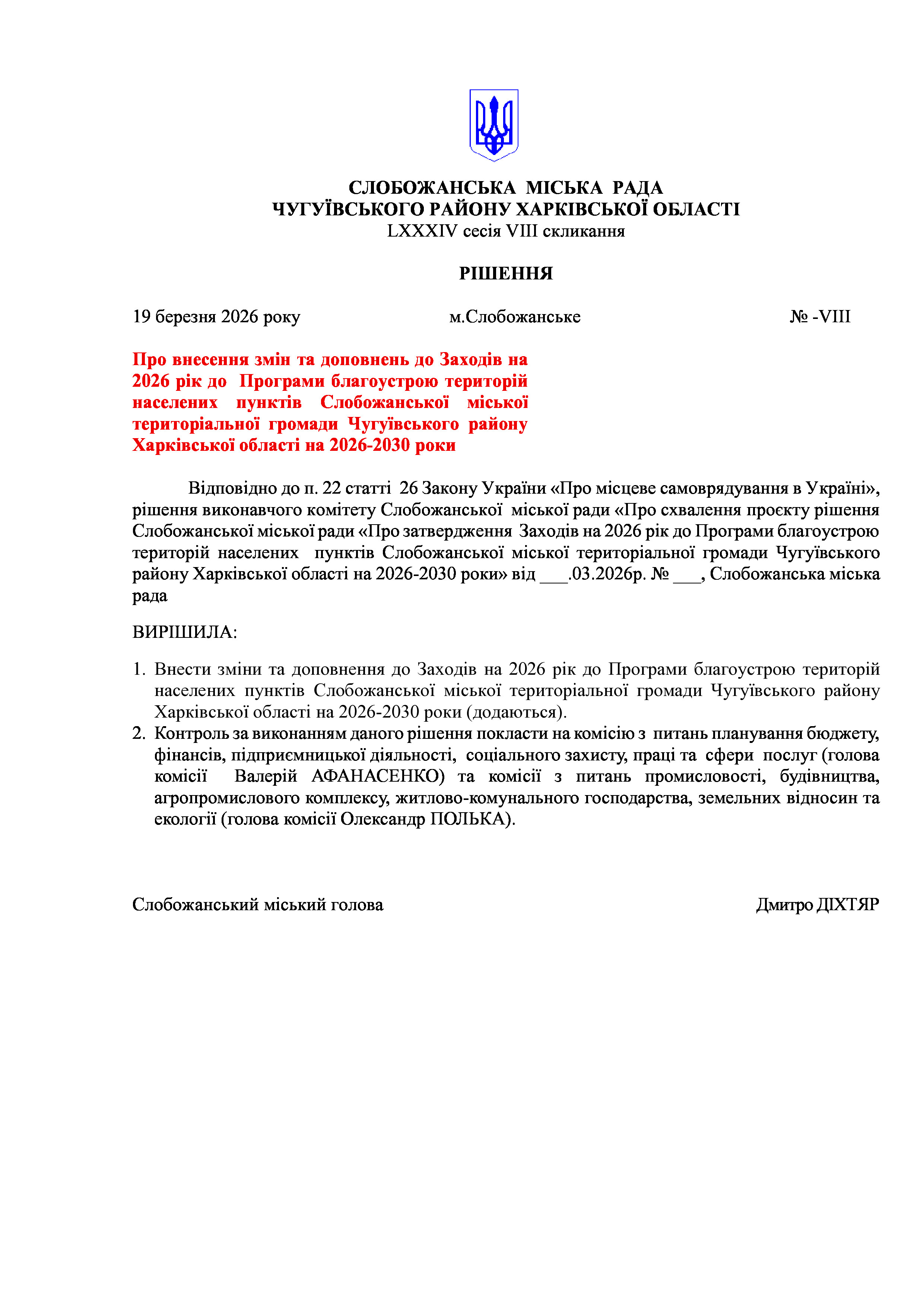 ПРОЄКТ рішення сесії №3 Про внесення змін та доповнень до Заходів на 2026 рік до Програми благоустрою територій населених пунктів Слобожанської міської територіальної громади Чугуївського району Харківської області на 2026-2030 роки