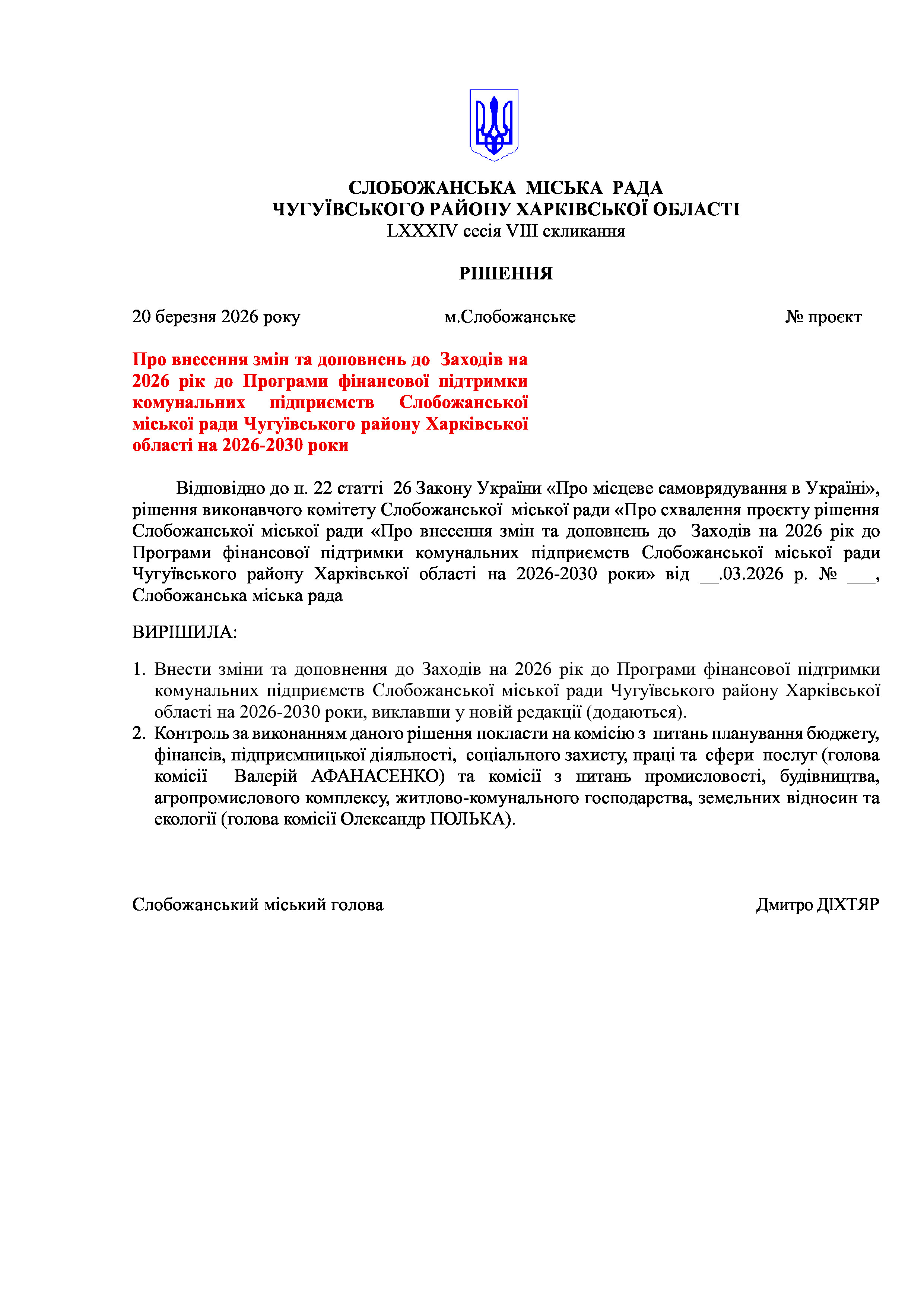 ПРОЄКТ рішення сесії №4 Про внесення змін та доповнень до Заходів на 2026 рік до Програми фінансової підтримки комунальних підприємств Слобожанської міської ради Чугуївського району Харківської області на 2026-2030 роки