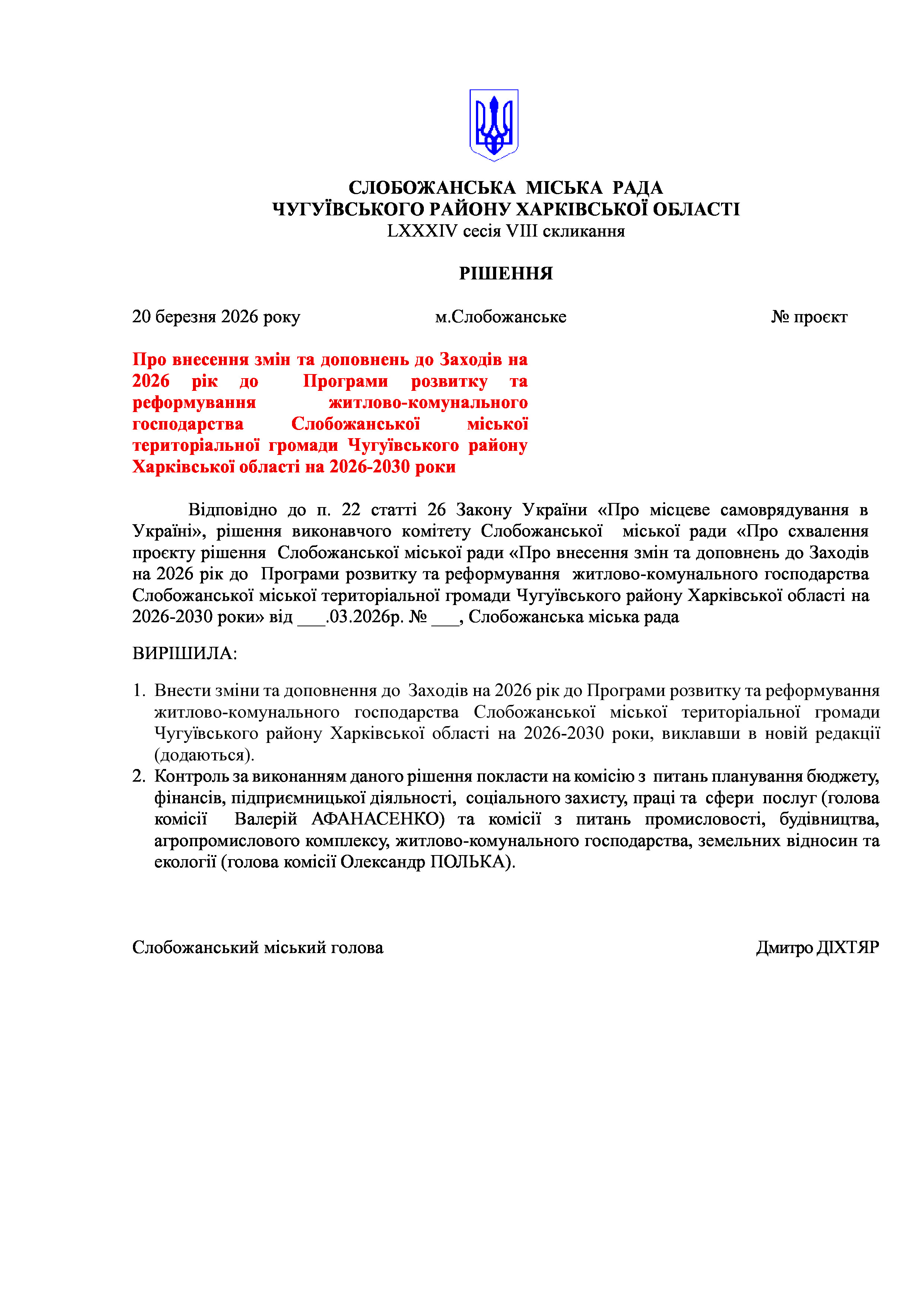 ПРОЄКТ рішення сесії №5 Про внесення змін та доповнень до Заходів на 2026 рік до Програми розвитку та реформування житлово-комунального господарства Слобожанської міської територіальної громади Чугуївського району Харківської області на 2026-2030 роки