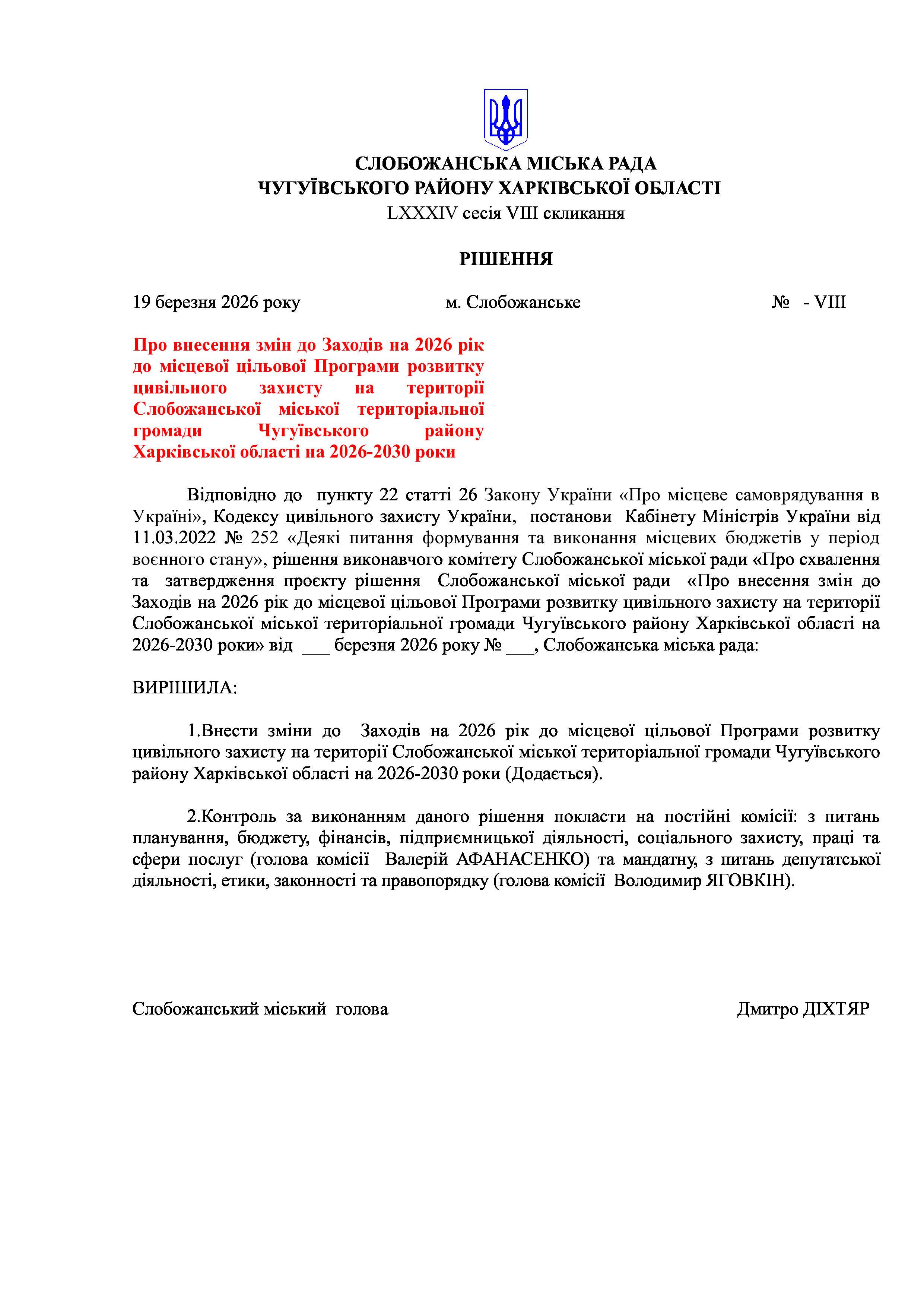 ПРОЄКТ рішення сесії №6 Про внесення змін до Заходів на 2026 рік до місцевої цільової Програми розвитку цивільного захисту на території Слобожанської міської територіальної громади Чугуївського району Харківської області на 2026-2030 роки