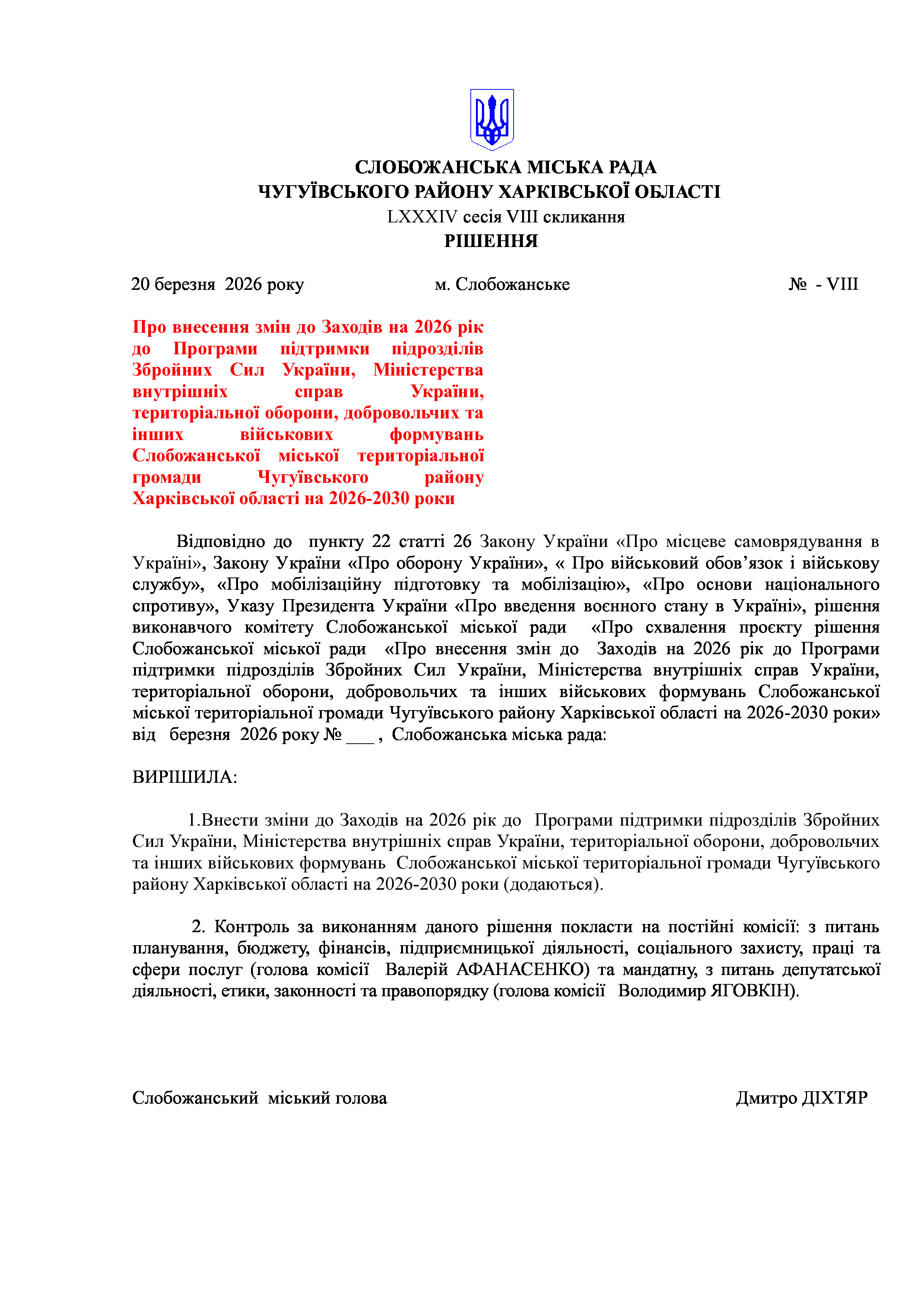 ПРОЄКТ рішення сесії №7 Про внесення змін до Заходів на 2026 рік до Програми підтримки підрозділів Збройних Сил України, Міністерства внутрішніх справ України, територіальної оборони, добровольчих та інших військових формувань Слобожанської міської територіальної громади Чугуївського району Харківської області на 2026-2030 роки