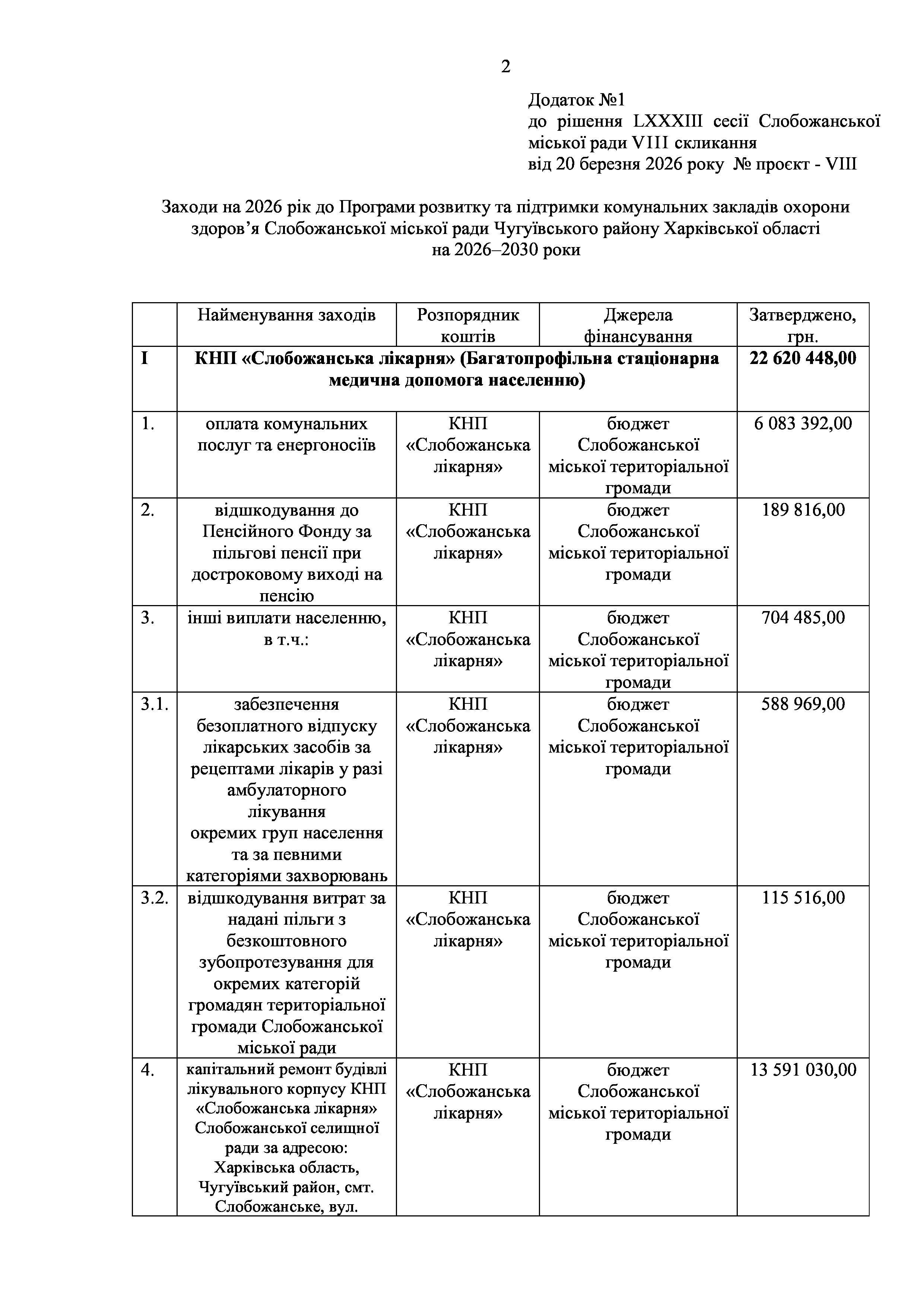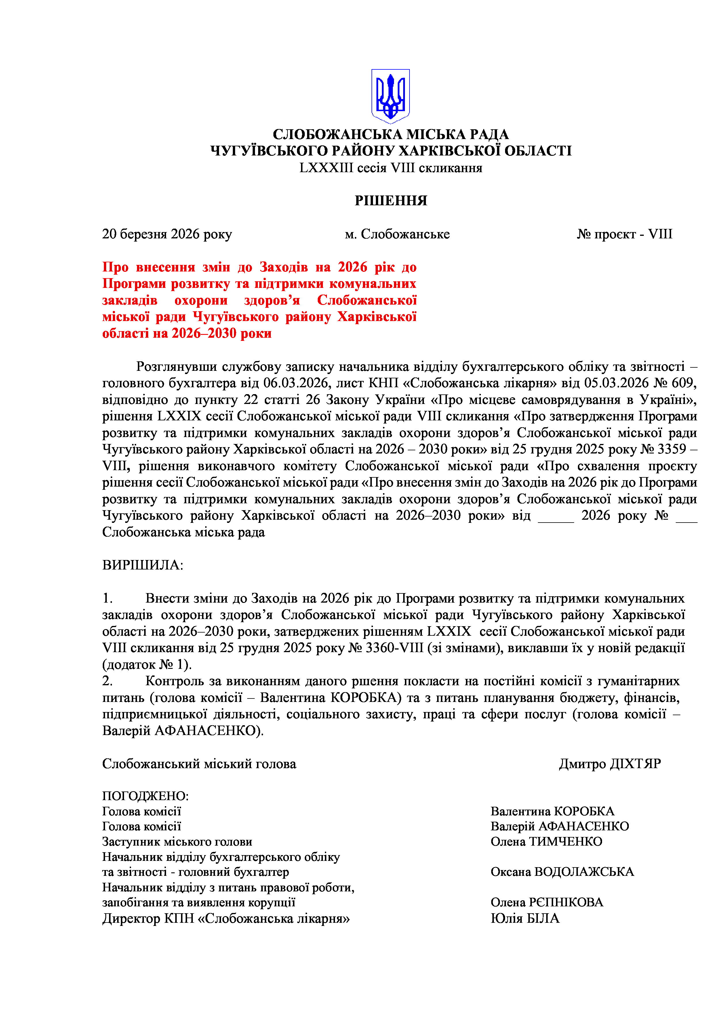 ПРОЄКТ рішення сесії №8 Про внесення змін до Заходів на 2026 рік до Програми розвитку та підтримки комунальних закладів охорони здоров’я Слобожанської міської ради Чугуївського району Харківської області на 2026–2030 роки