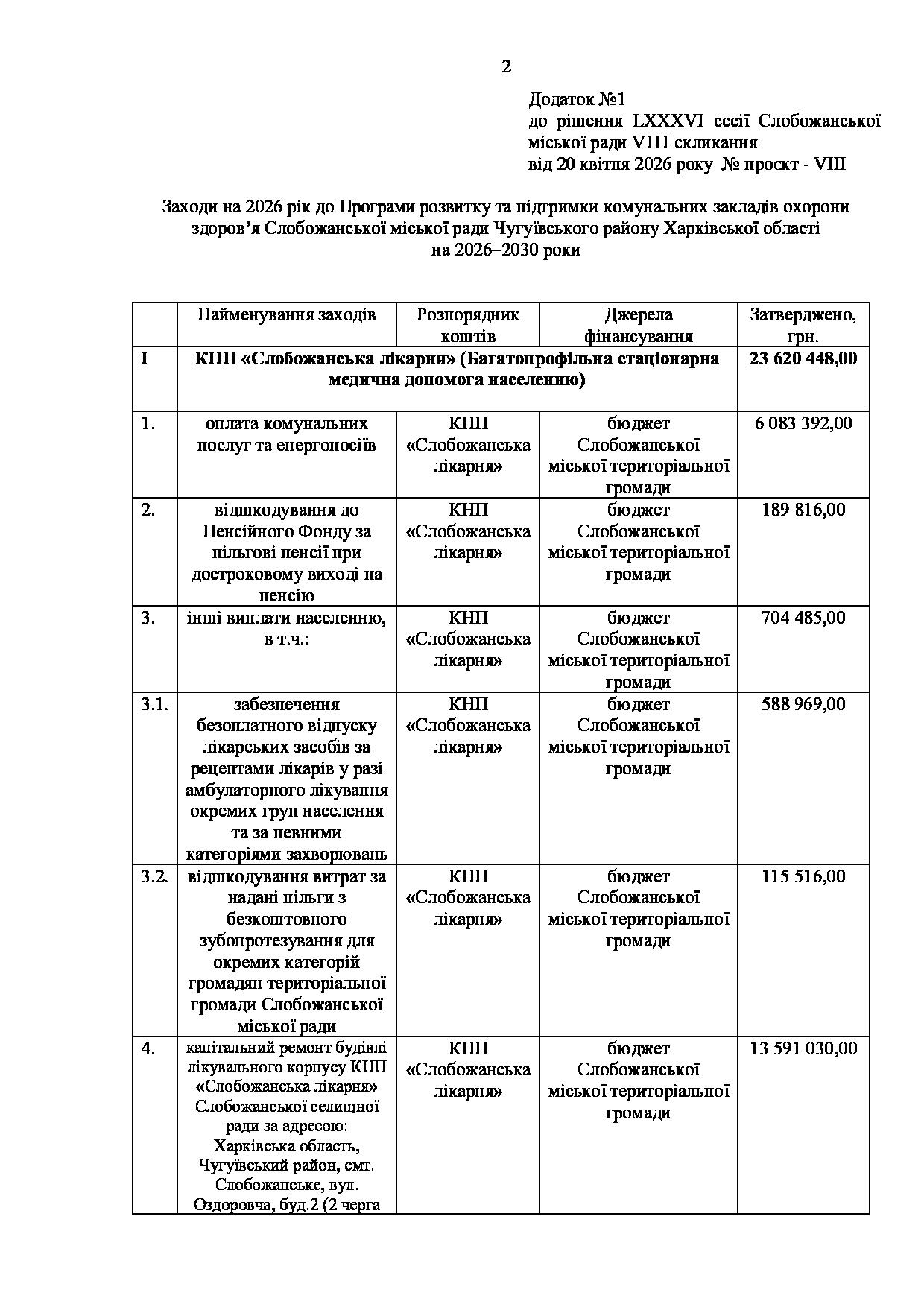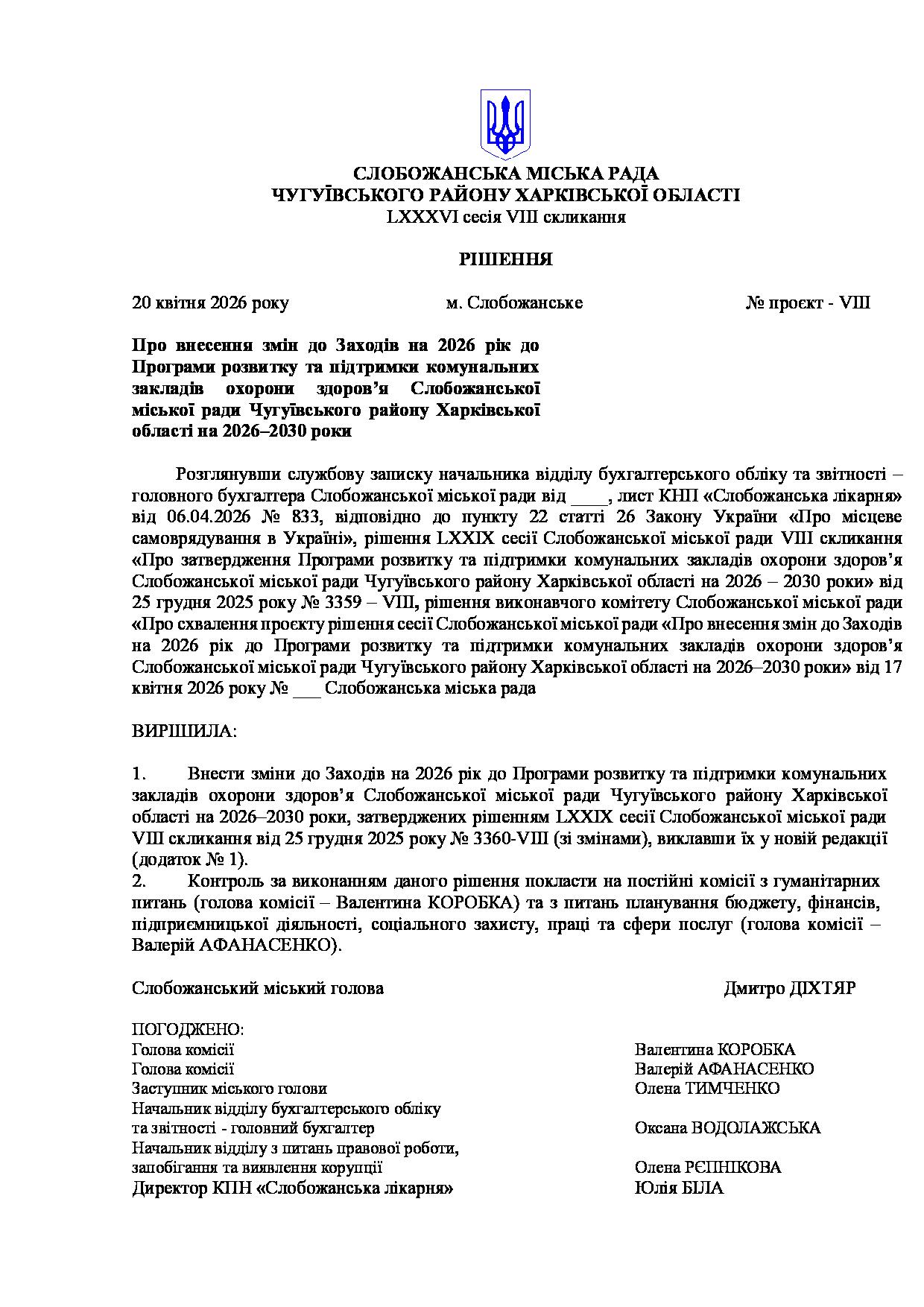 ПРОЄКТ рішення сесії №45 Про внесення змін до Заходів на 2026 рік до Програми розвитку та підтримки комунальних закладів охорони здоров’я Слобожанської міської ради Чугуївського району Харківської області на 2026–2030 роки