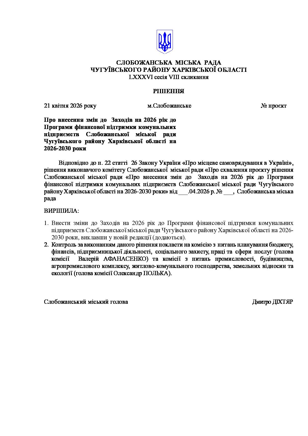 ПРОЄКТ рішення сесії №46 Про внесення змін до Заходів на 2026 рік до Програми фінансової підтримки комунальних підприємств Слобожанської міської ради Чугуївського району Харківської області на 2026-2030 роки