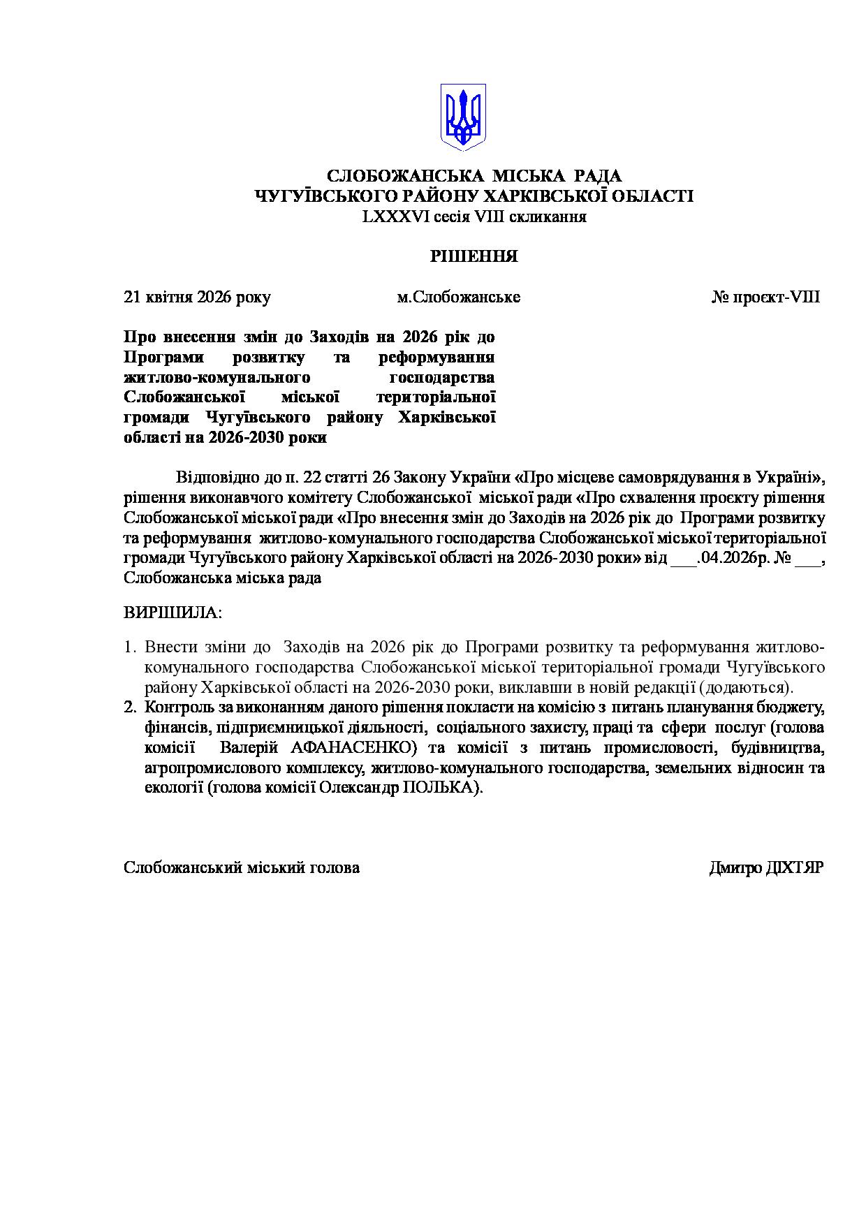 ПРОЄКТ рішення сесії №47 Про внесення змін до Заходів на 2026 рік до Програми розвитку та реформування житлово-комунального господарства Слобожанської міської територіальної громади Чугуївського району Харківської області на 2026-2030 роки