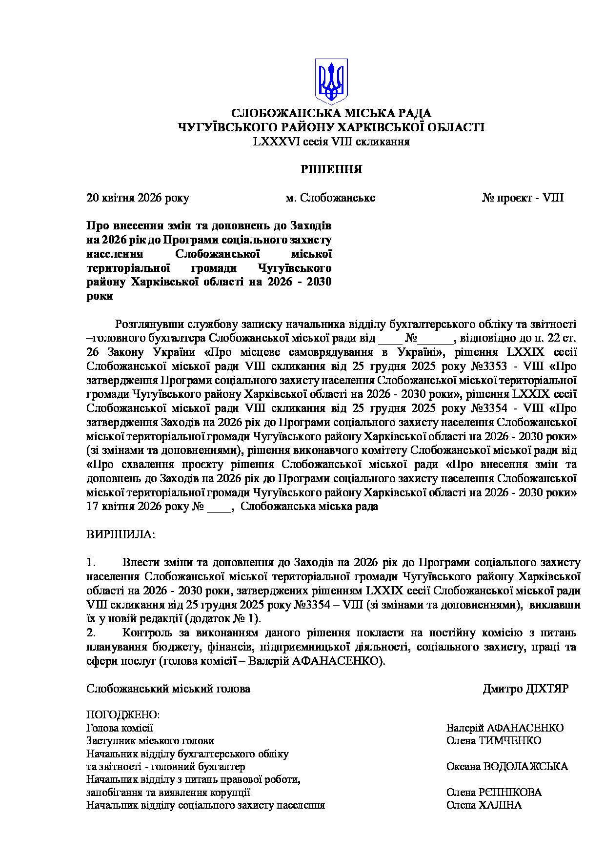 ПРОЄКТ рішення сесії №48 Про внесення змін та доповнень до Заходів на 2026 рік до Програми соціального захисту населення Слобожанської міської територіальної громади Чугуївського району Харківської області на 2026 - 2030 роки