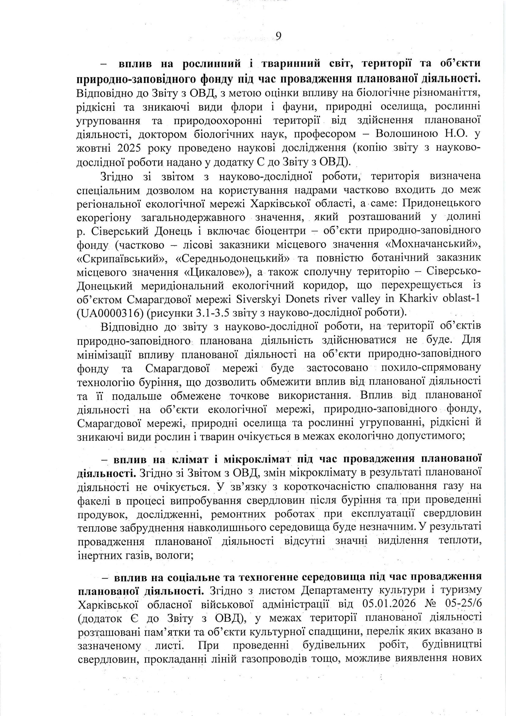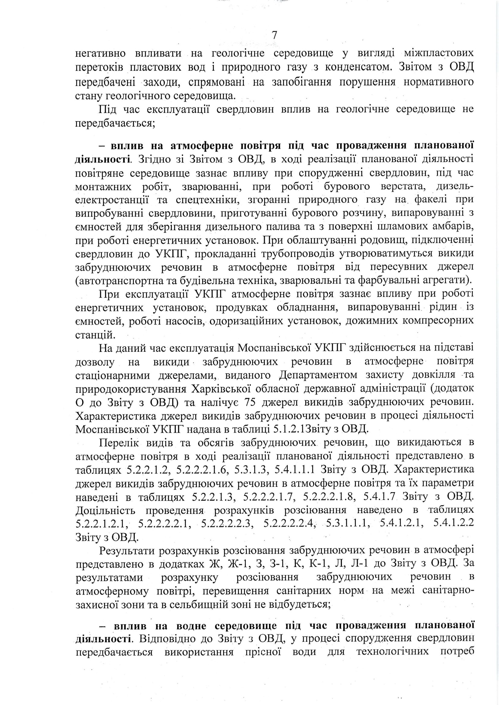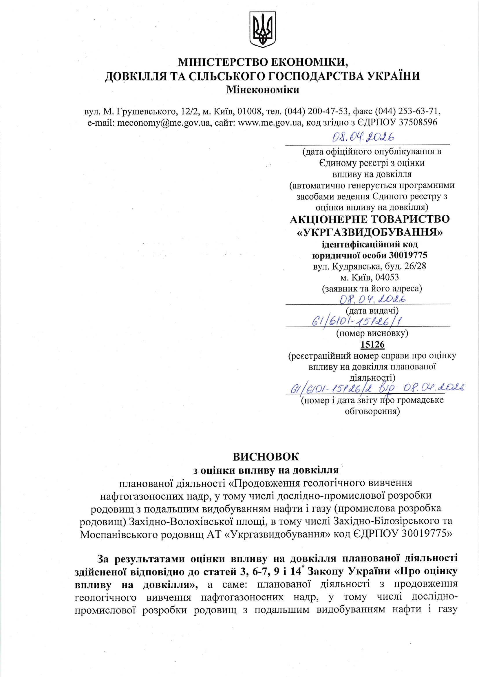 ВИСНОВОК з оцінки впливу на довкілля планованої діяльності «Продовження геологічного вивченнянафтогазоносних надр, у тому числі дослідно-промислової розробки родовищ з подальшим видобуванням нафти і газу (промислова розроб кародовищ) Західно-Волохівської площі, в тому числі Західно-Білозірського та Моспанівського родовищ AT «Укргазвидобування» код ЄДРПОУ 30019775»