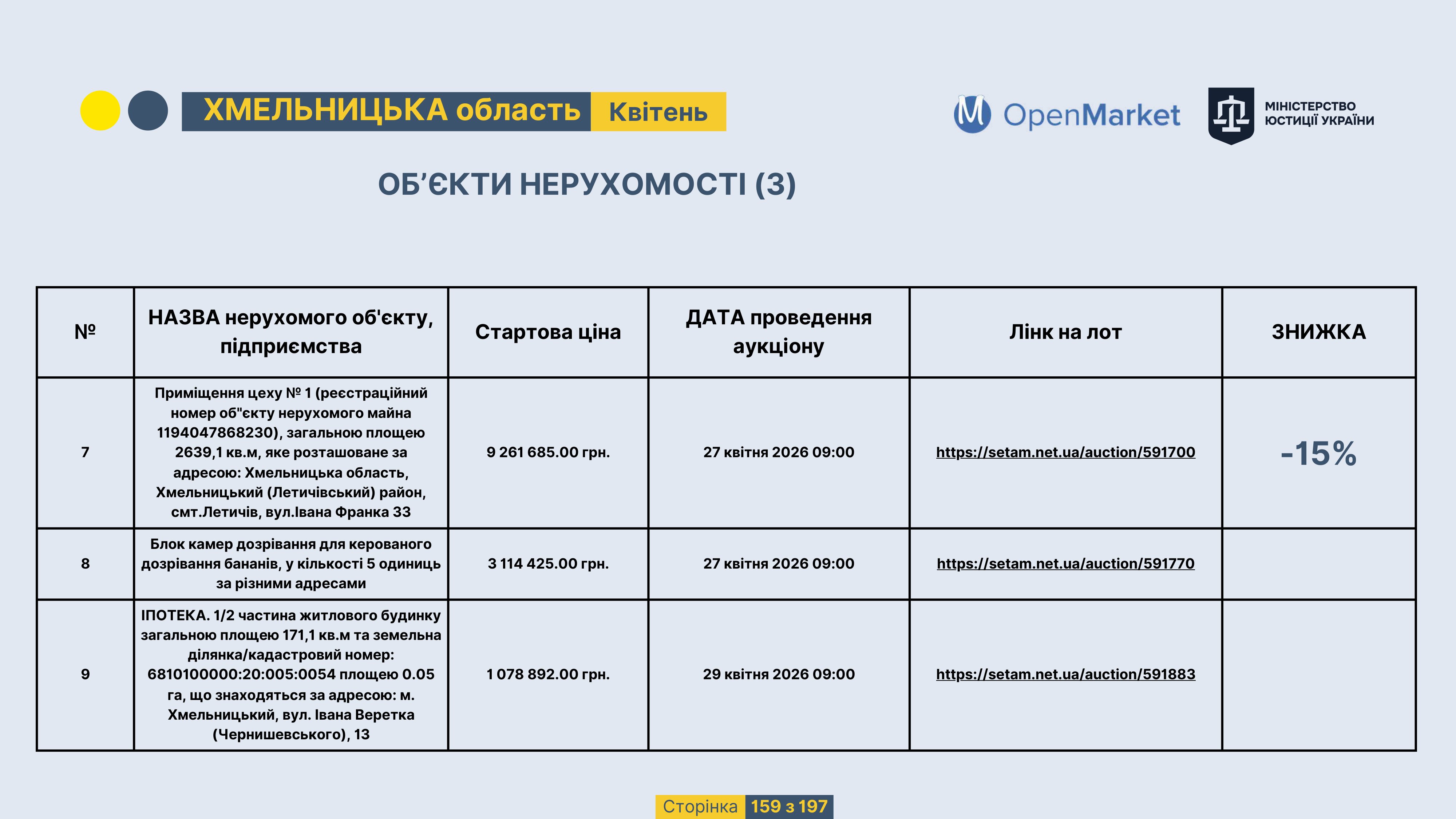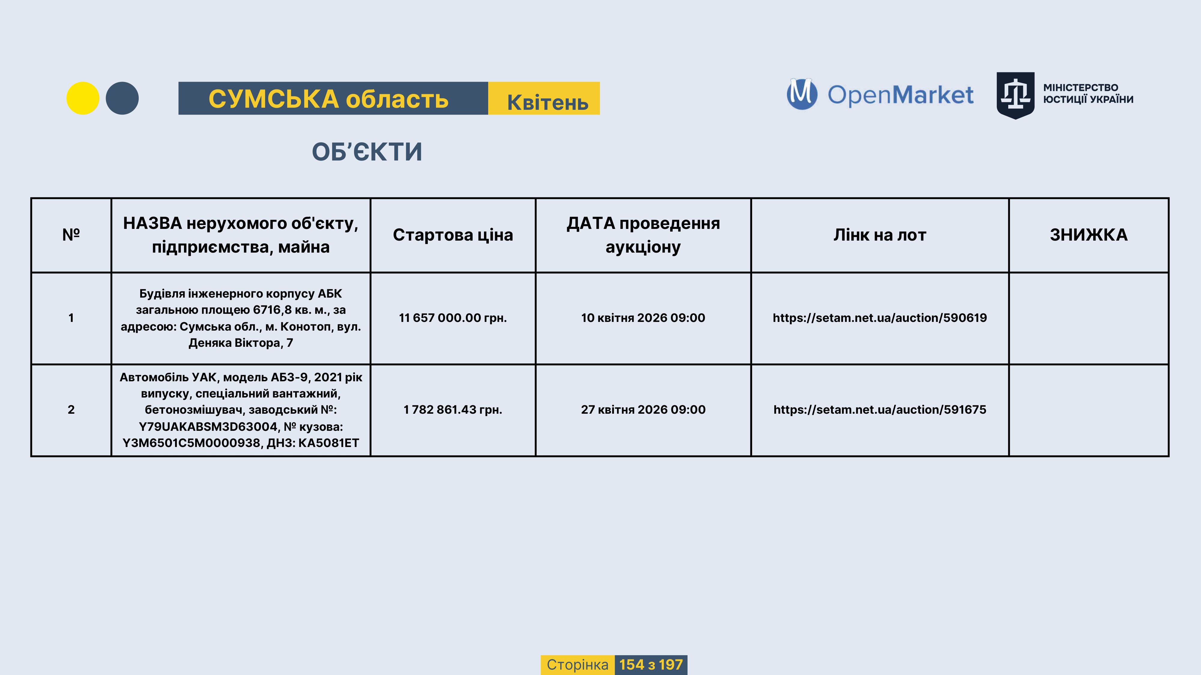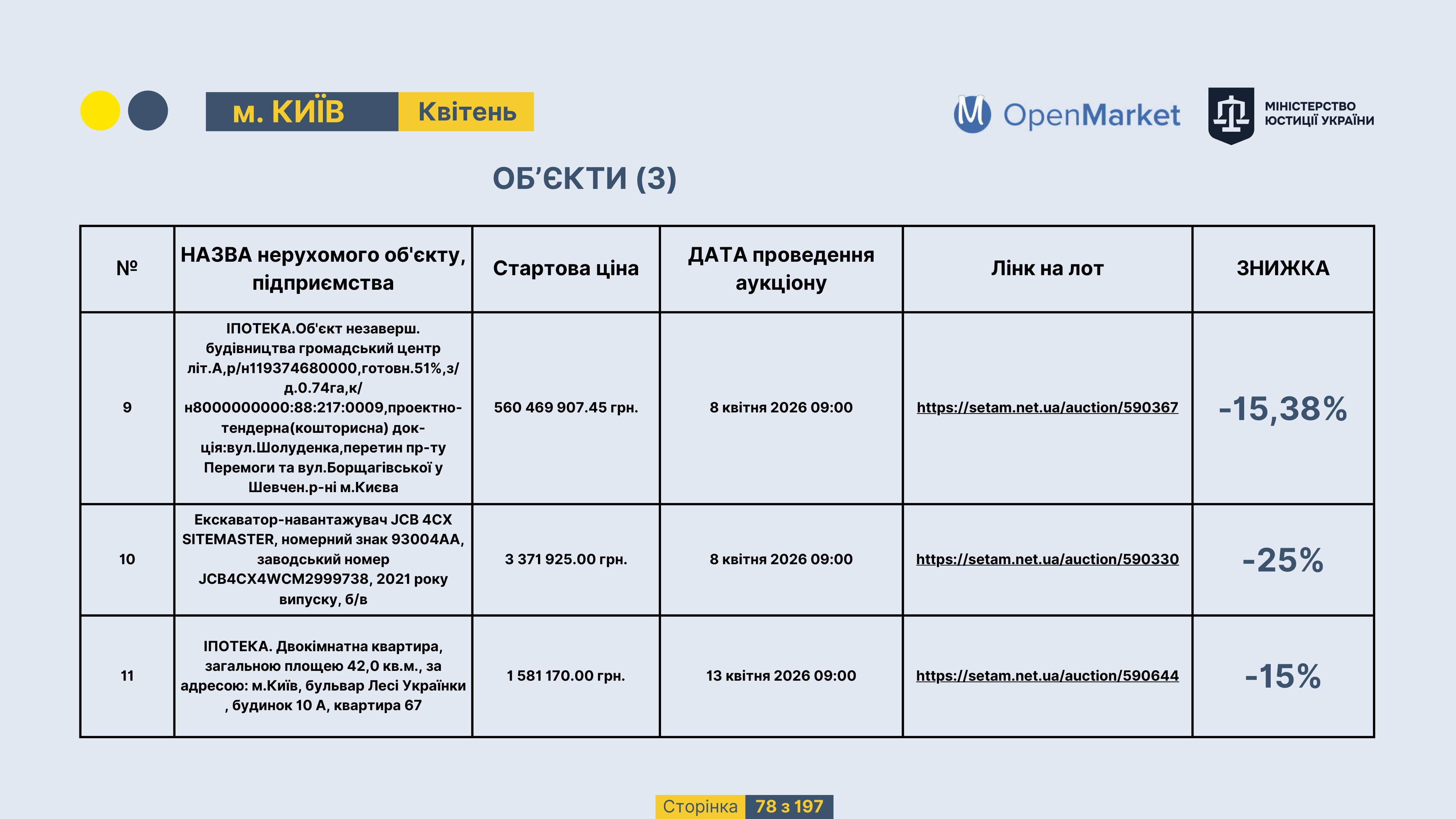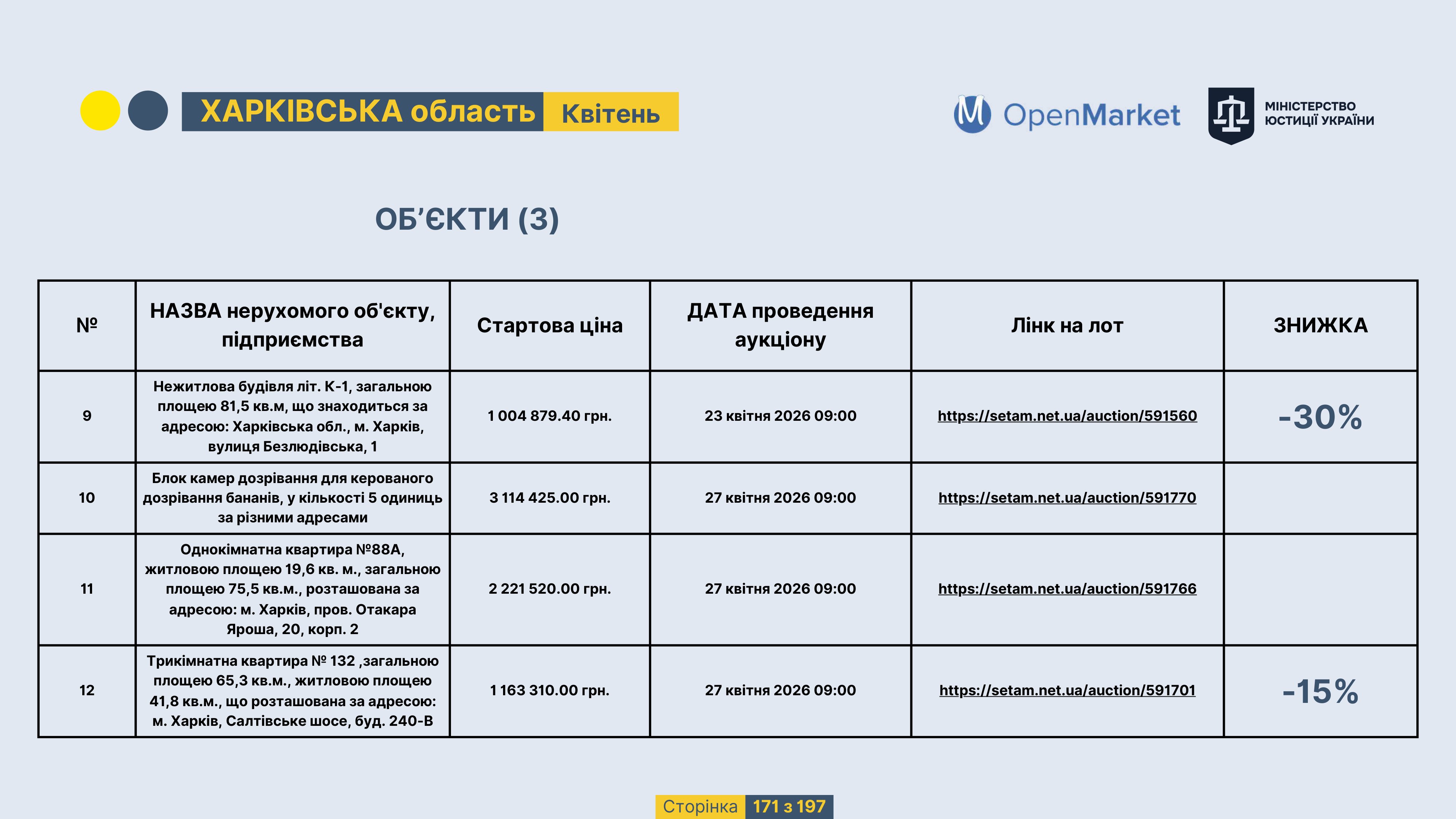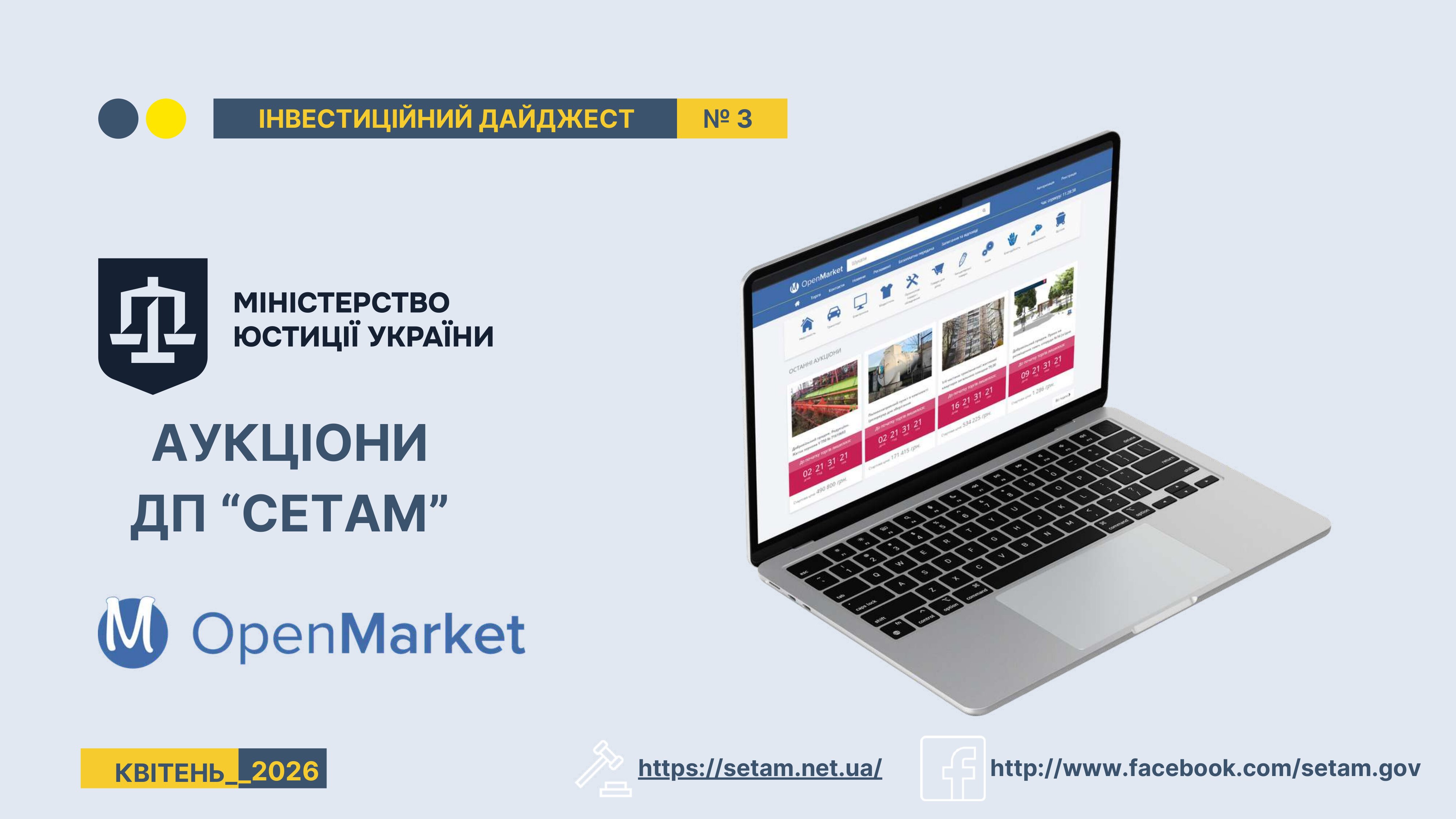 Державне підприємство «СЕТАМ» Міністерства юстиції України (далі - ДП «СЕТАМ»), повідомляє, що відповідно до Порядку реалізації арештованого майна, затвердженого наказом Міністерства юстиції України 29.09.2016 №2831/5, зареєстрованим в Міністерстві юстиції України 30.09.2016 за №1301/29431 (далі - Порядок реалізації), відповідно до частини другої та четвертої статті 61 Закону України від 02.06.2016 «Про виконавче провадження» через державну електронну аукціонну платформу OpenMarket ДП «СЕТАМ» у поточному місяці 2026 року оголошено проведення низки електронних аукціонів («Інвестиційний дайджест №3», що додається).
