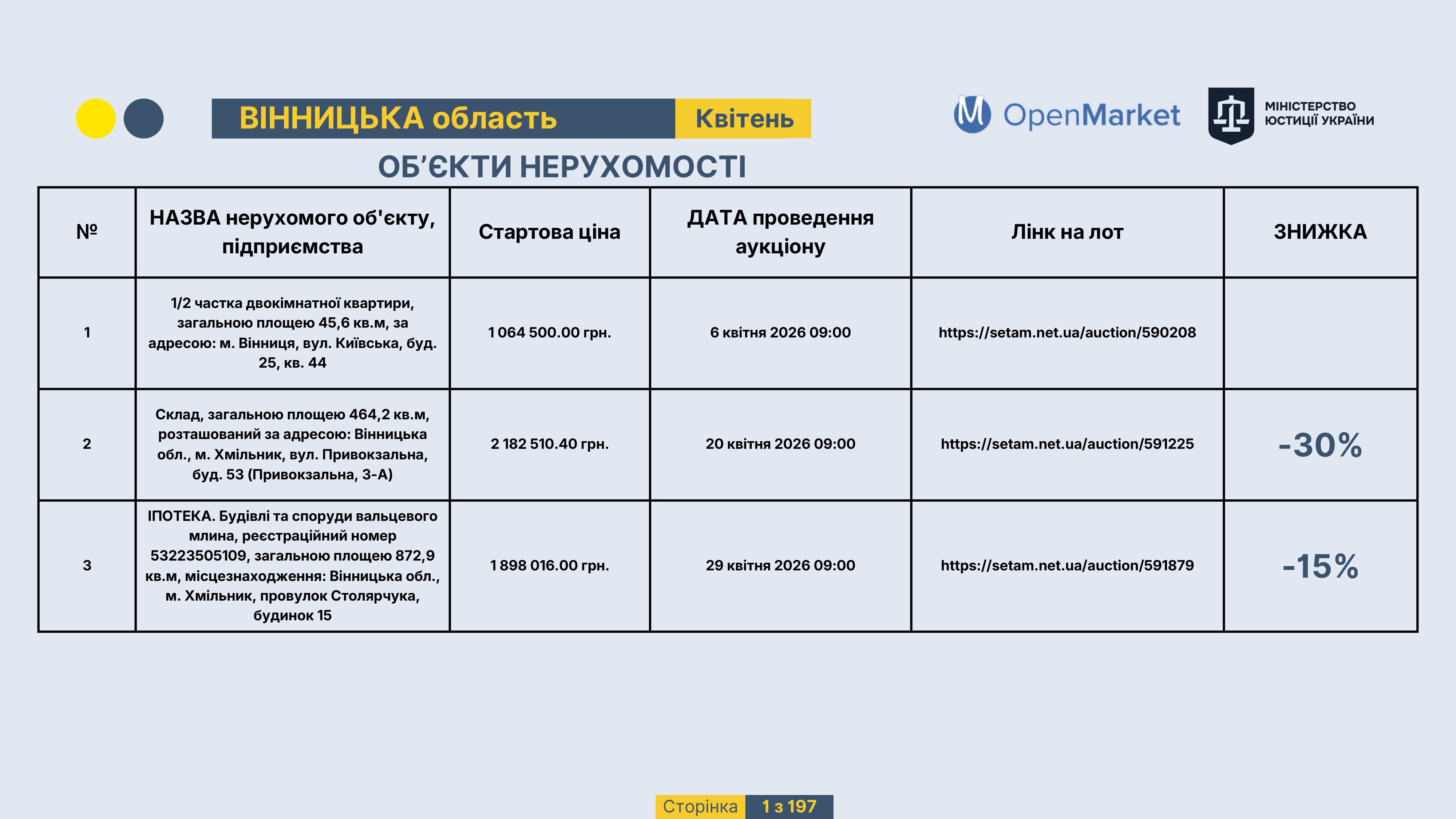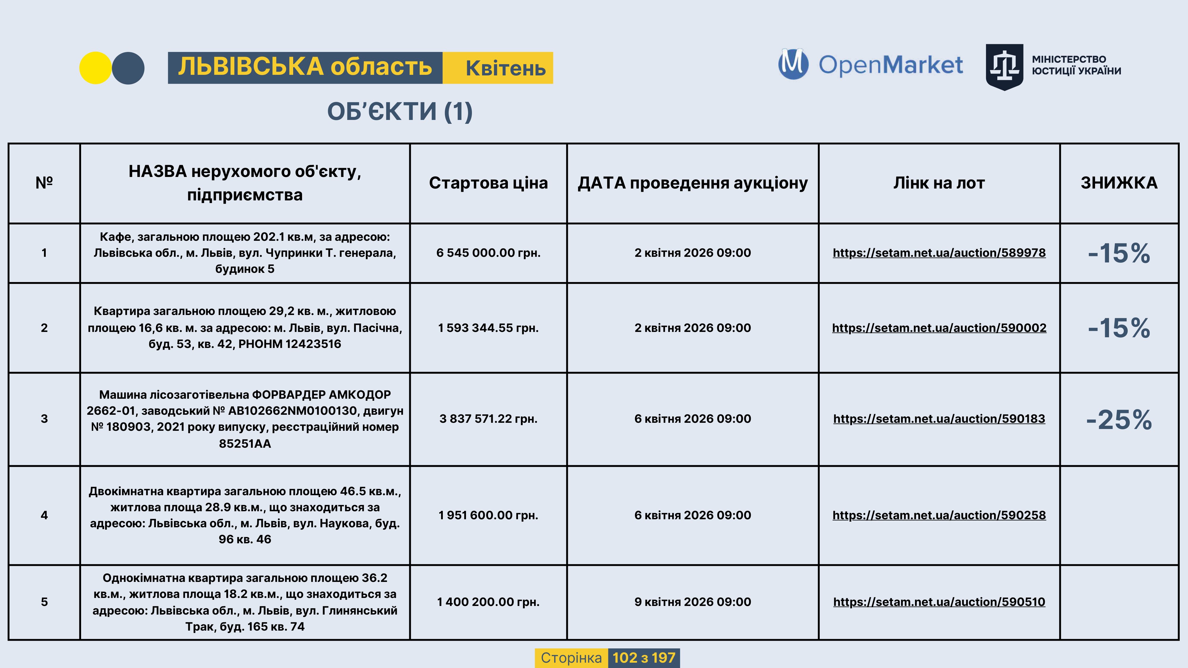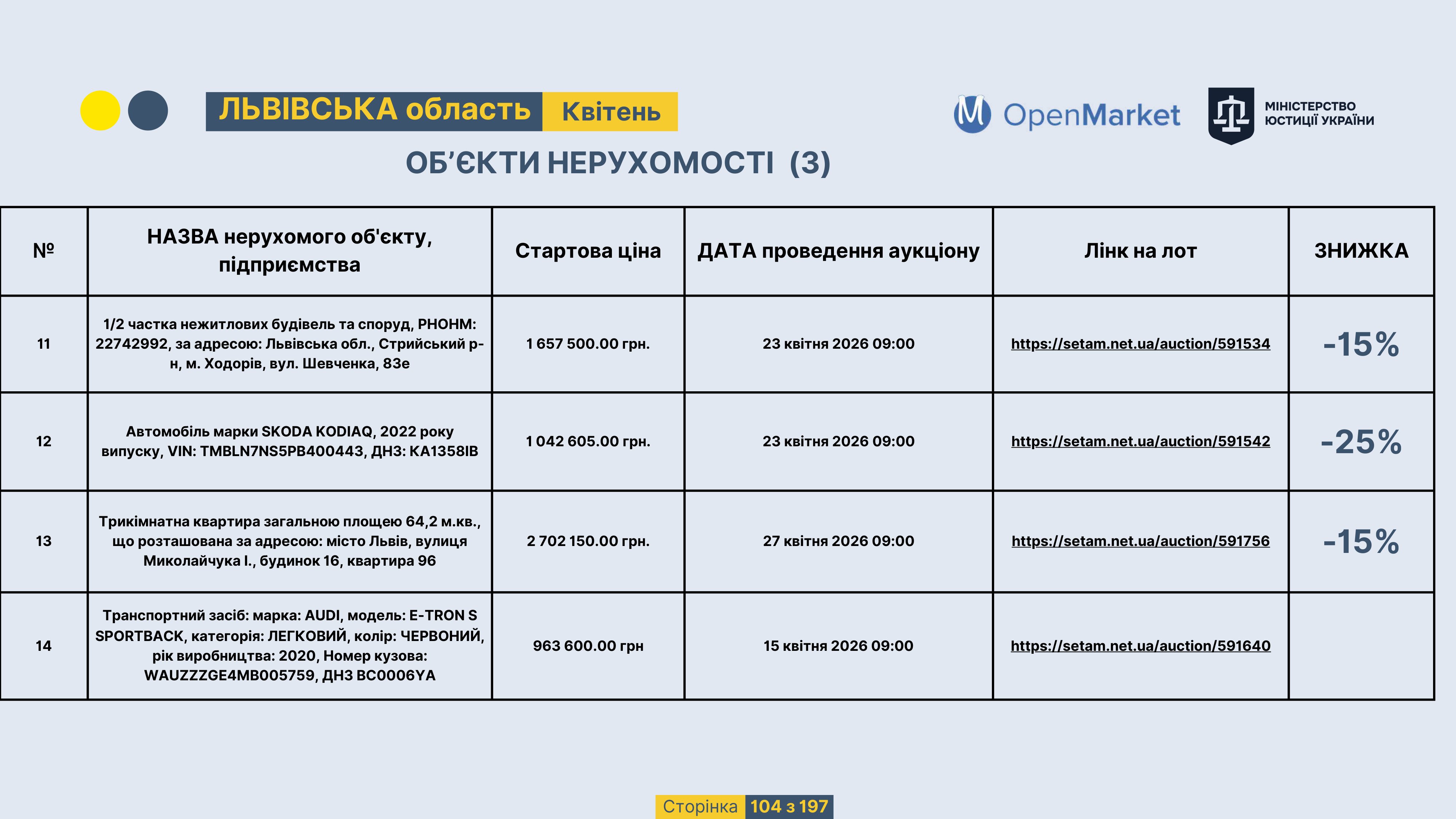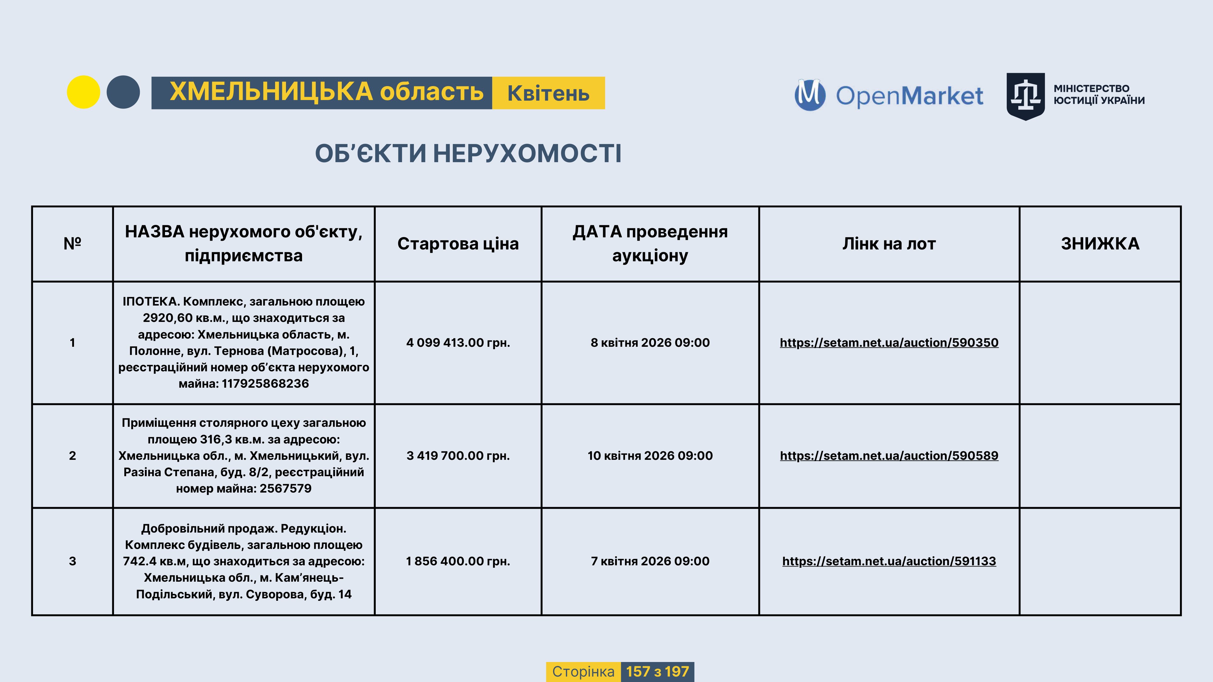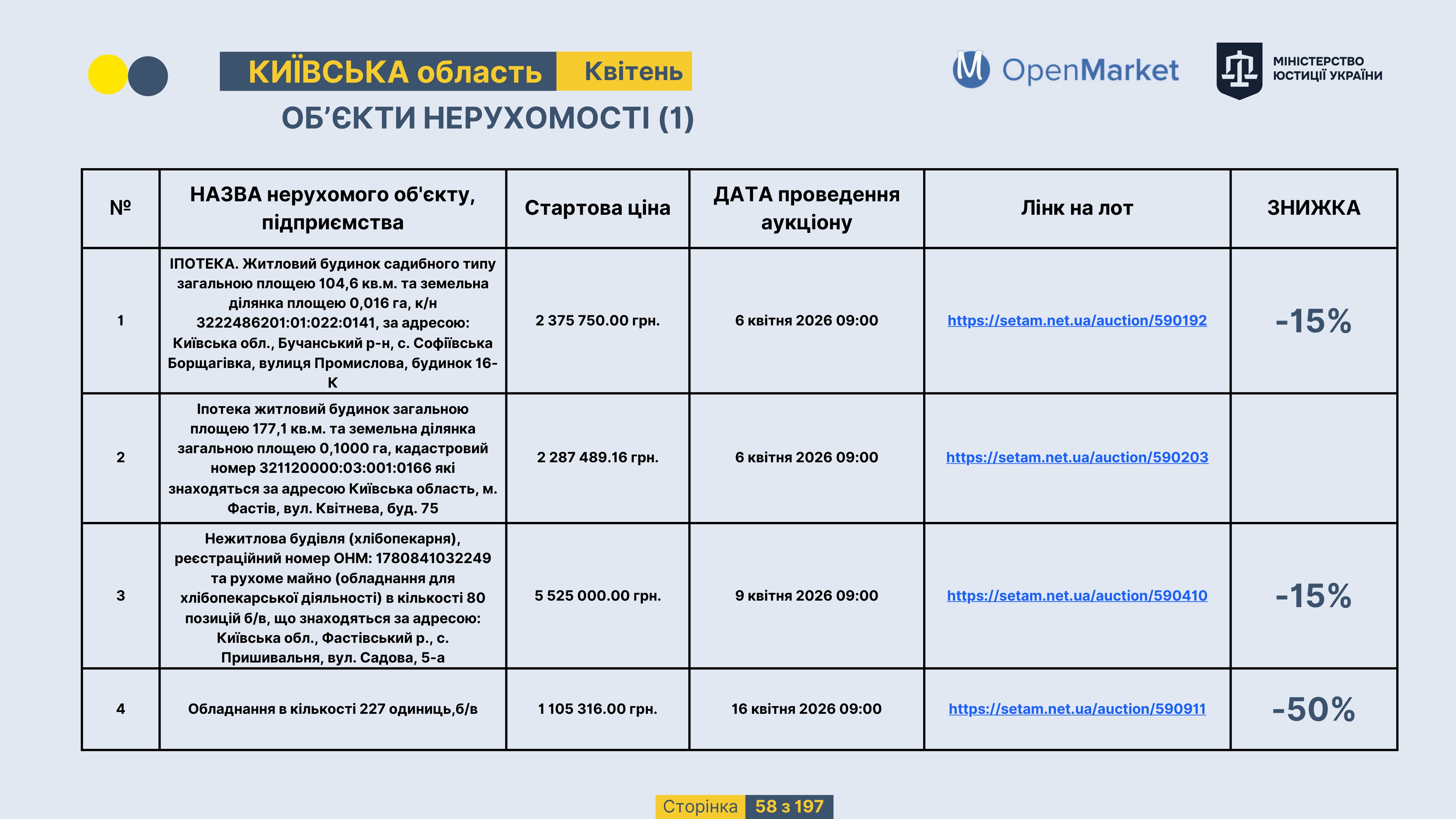 Державне підприємство «СЕТАМ» Міністерства юстиції України (далі - ДП «СЕТАМ»), повідомляє, що відповідно до Порядку реалізації арештованого майна, затвердженого наказом Міністерства юстиції України 29.09.2016 №2831/5, зареєстрованим в Міністерстві юстиції України 30.09.2016 за №1301/29431 (далі - Порядок реалізації), відповідно до частини другої та четвертої статті 61 Закону України від 02.06.2016 «Про виконавче провадження» через державну електронну аукціонну платформу OpenMarket ДП «СЕТАМ» у поточному місяці 2026 року оголошено проведення низки електронних аукціонів («Інвестиційний дайджест №3», що додається).