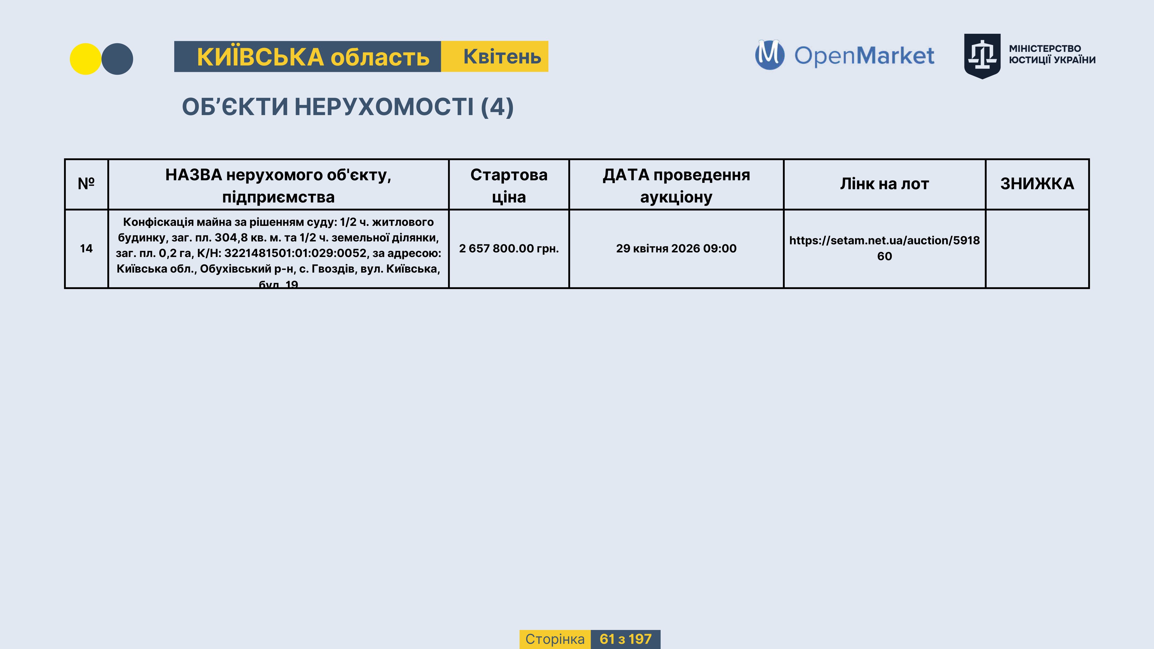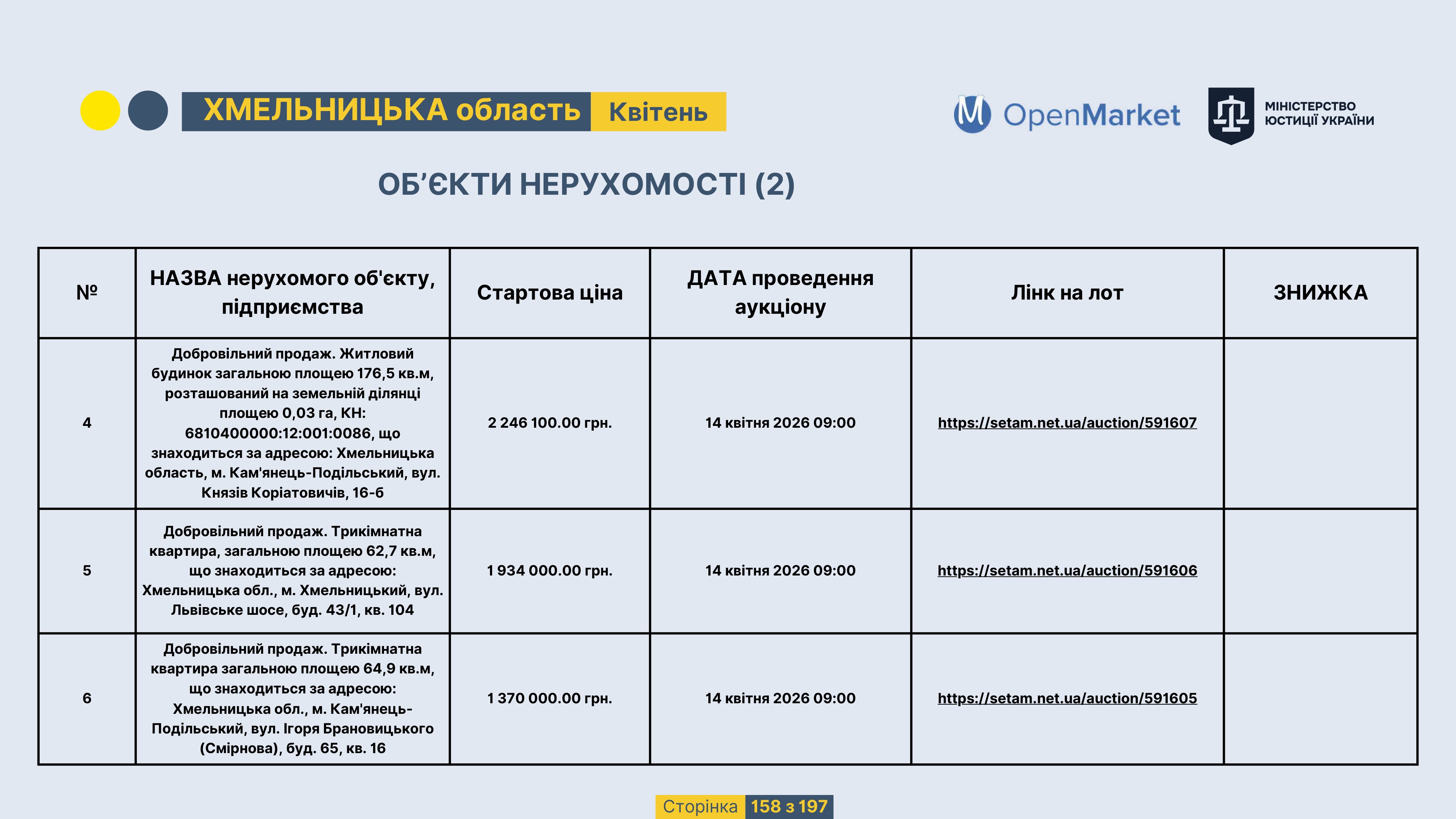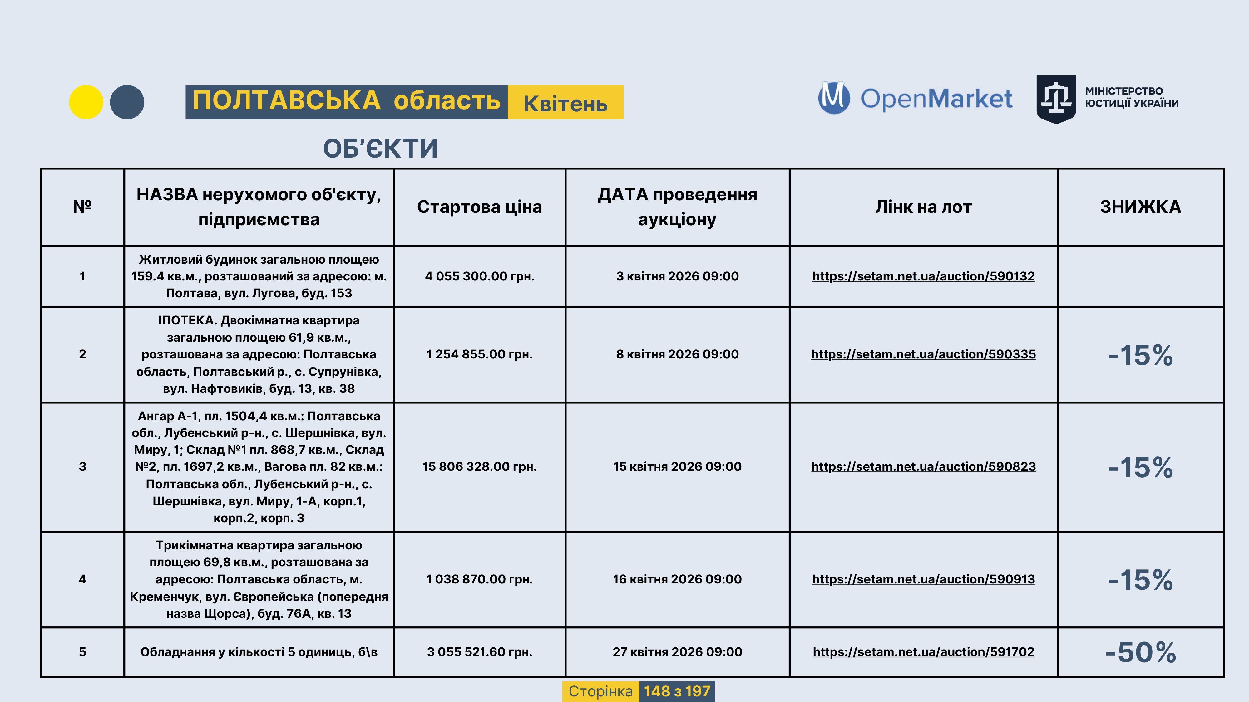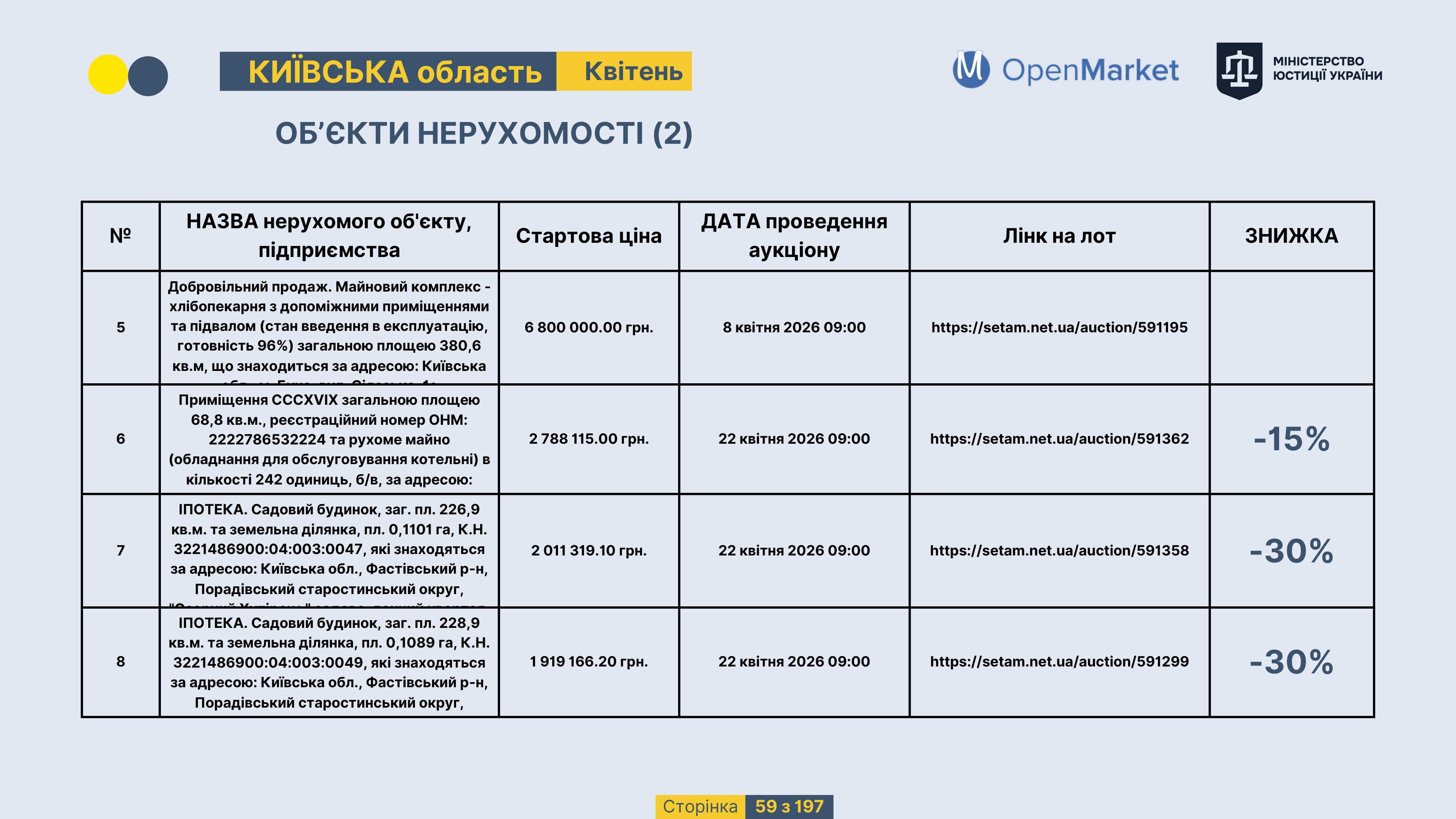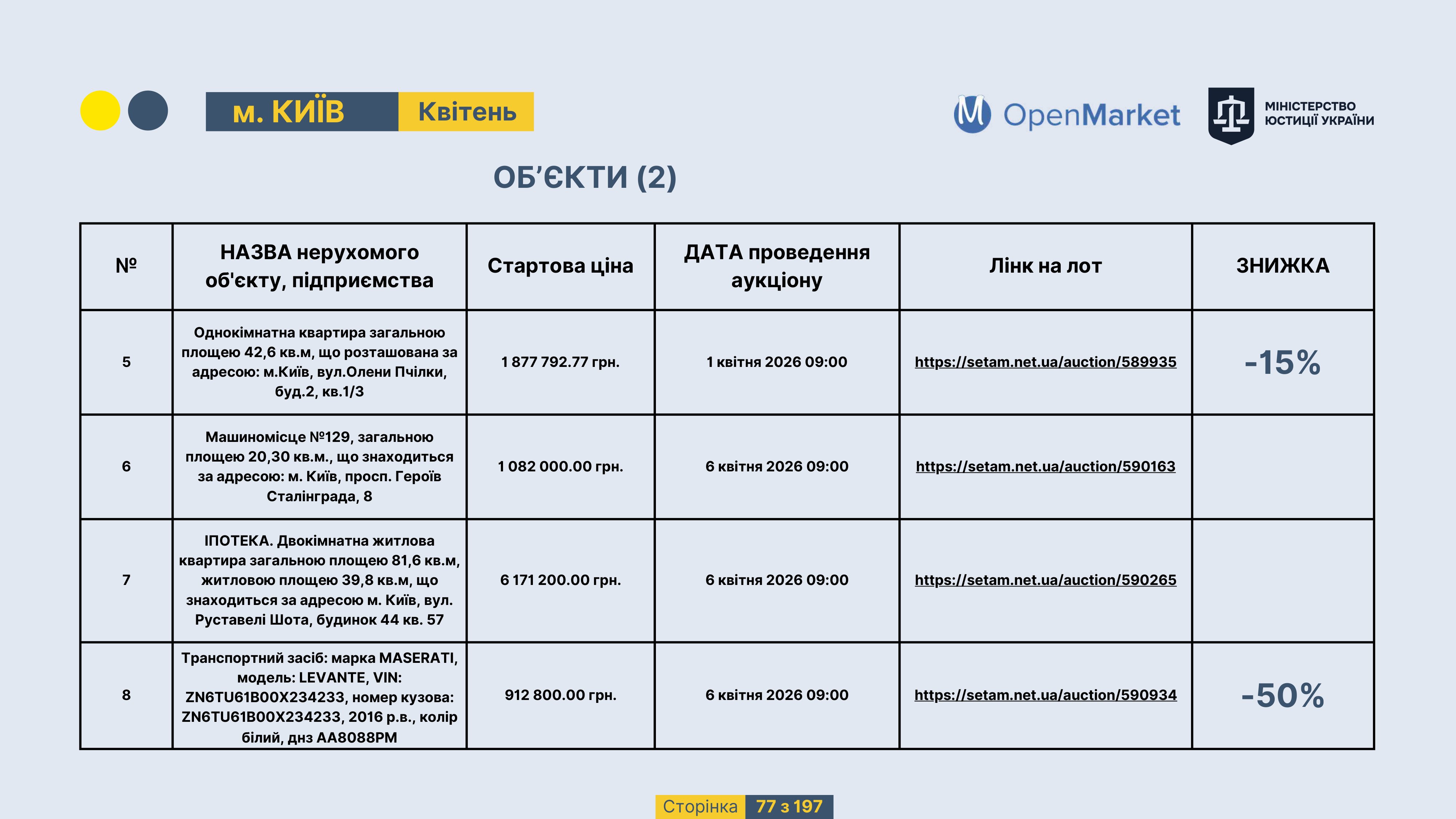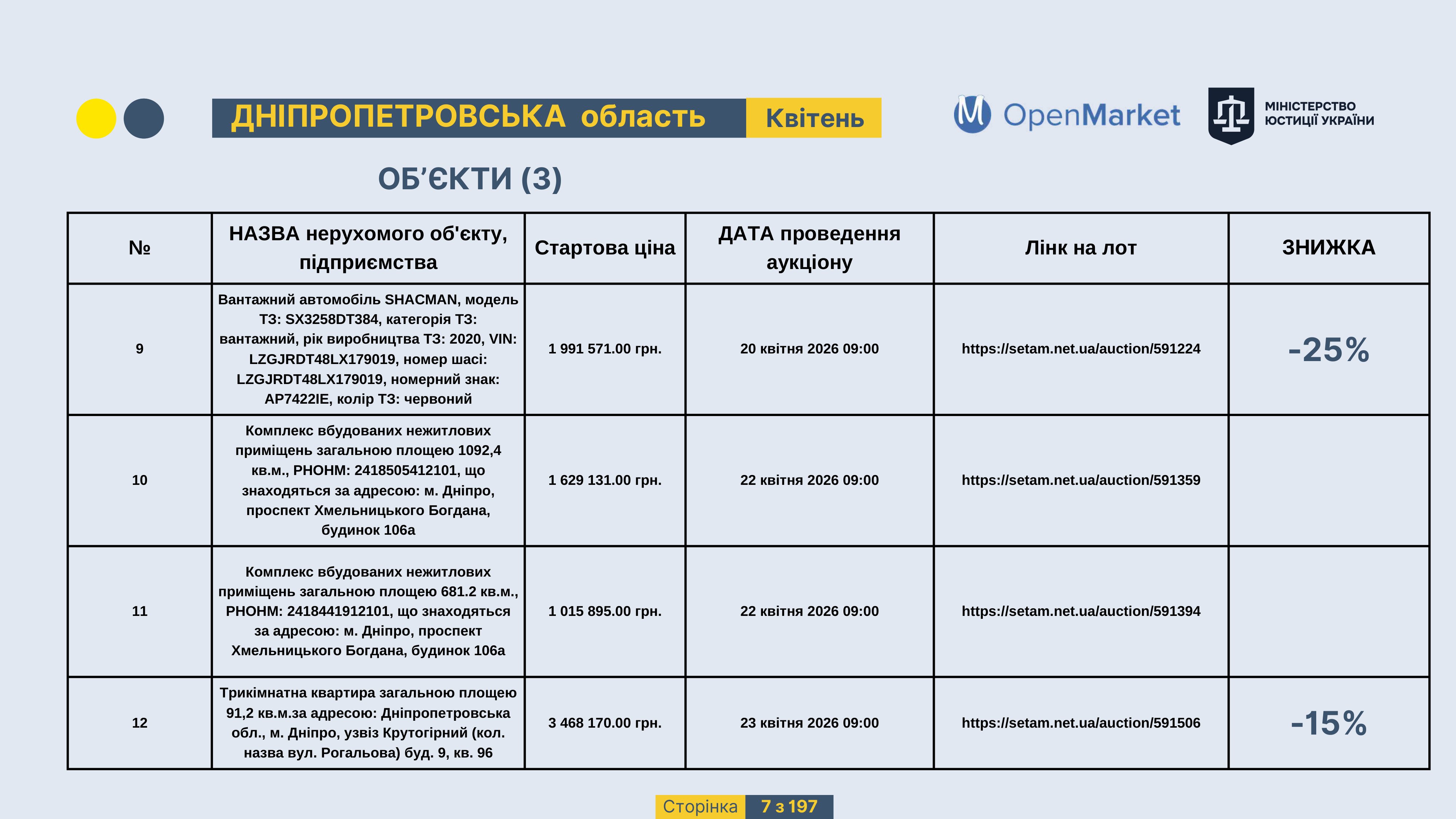 Державне підприємство «СЕТАМ» Міністерства юстиції України (далі - ДП «СЕТАМ»), повідомляє, що відповідно до Порядку реалізації арештованого майна, затвердженого наказом Міністерства юстиції України 29.09.2016 №2831/5, зареєстрованим в Міністерстві юстиції України 30.09.2016 за №1301/29431 (далі - Порядок реалізації), відповідно до частини другої та четвертої статті 61 Закону України від 02.06.2016 «Про виконавче провадження» через державну електронну аукціонну платформу OpenMarket ДП «СЕТАМ» у поточному місяці 2026 року оголошено проведення низки електронних аукціонів («Інвестиційний дайджест №3», що додається).