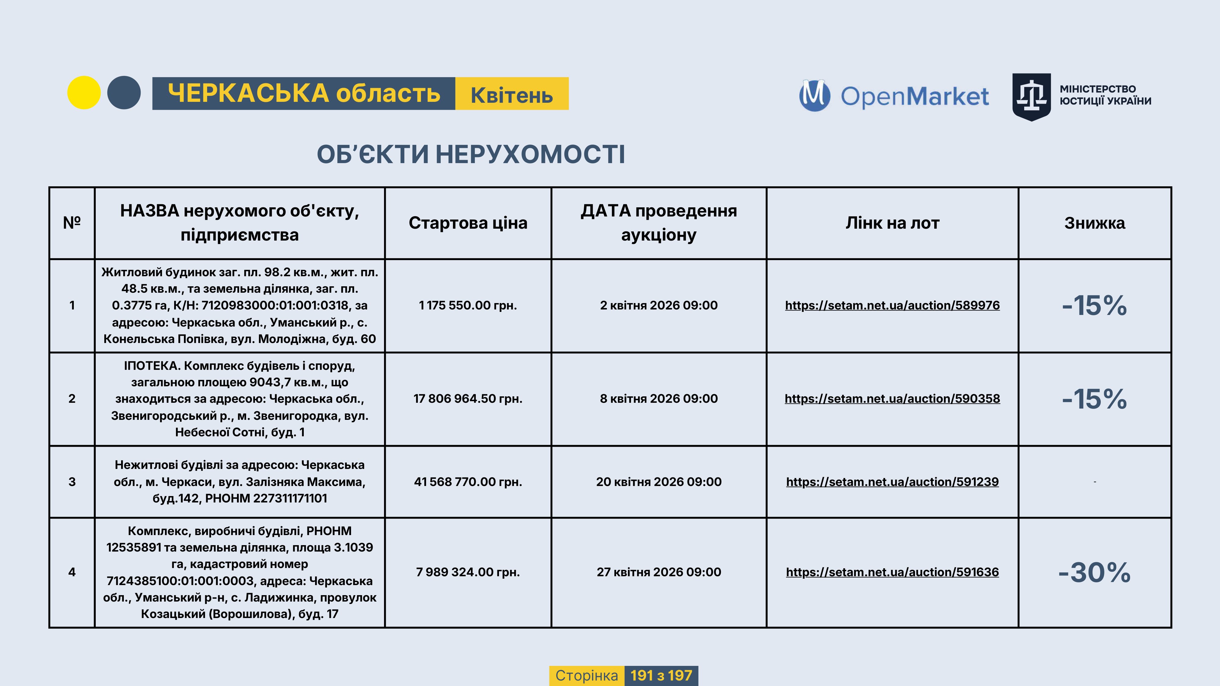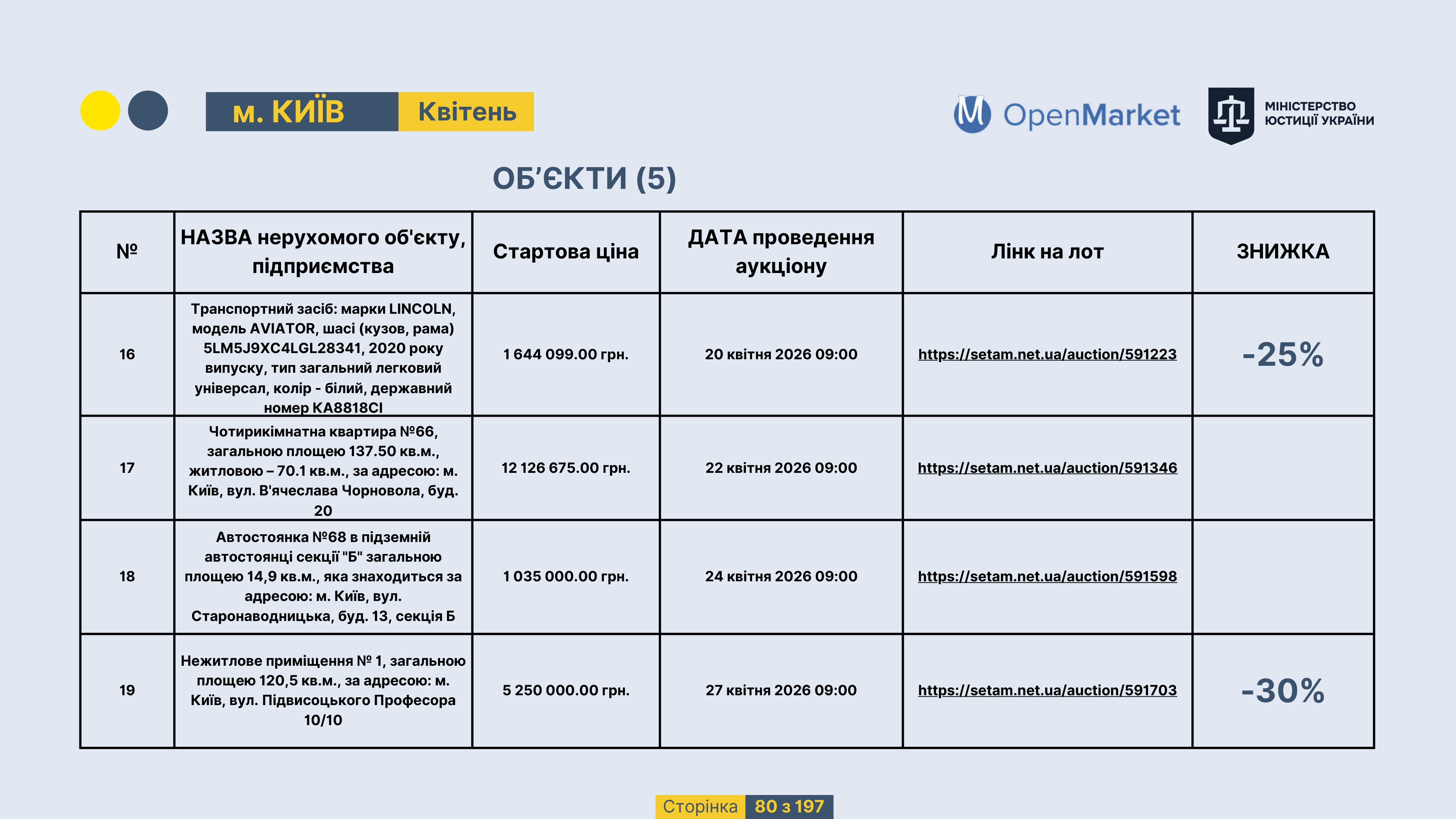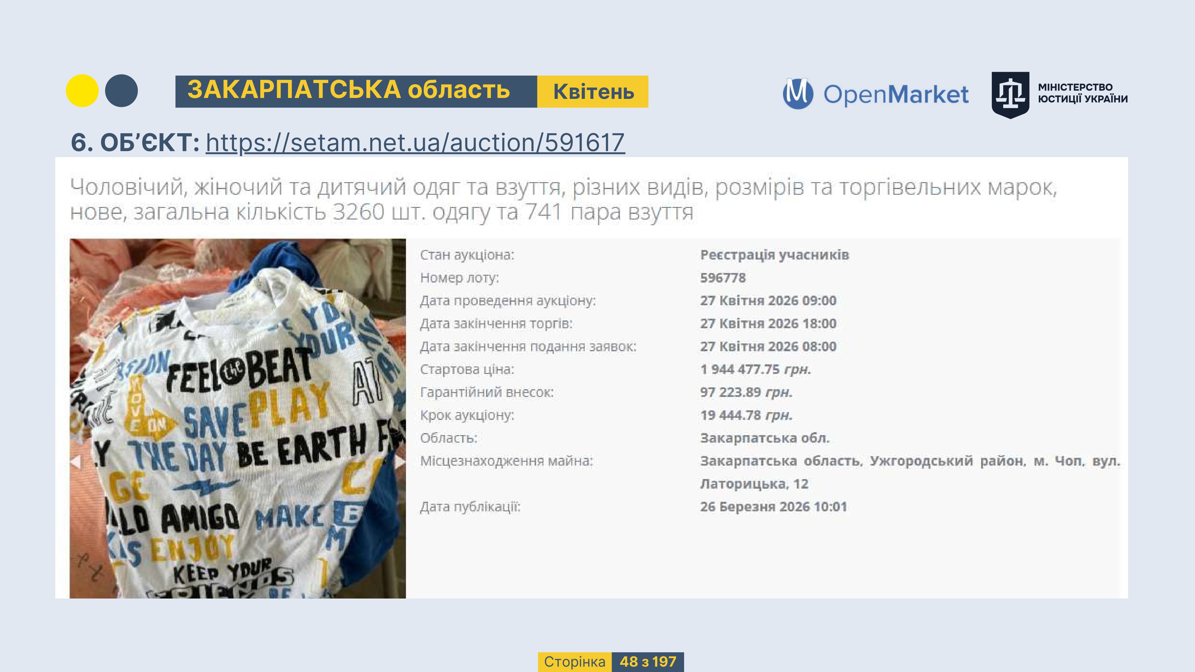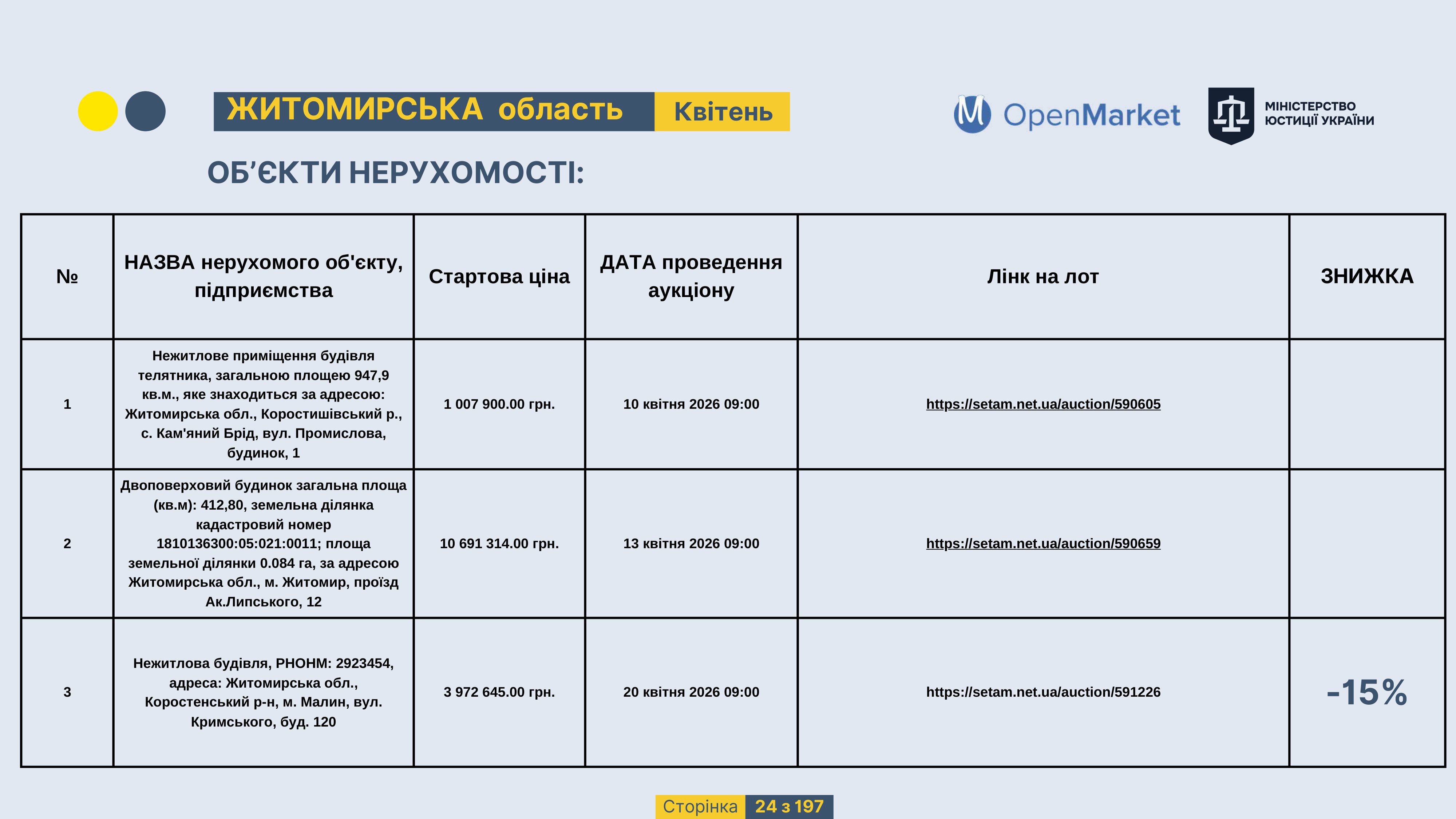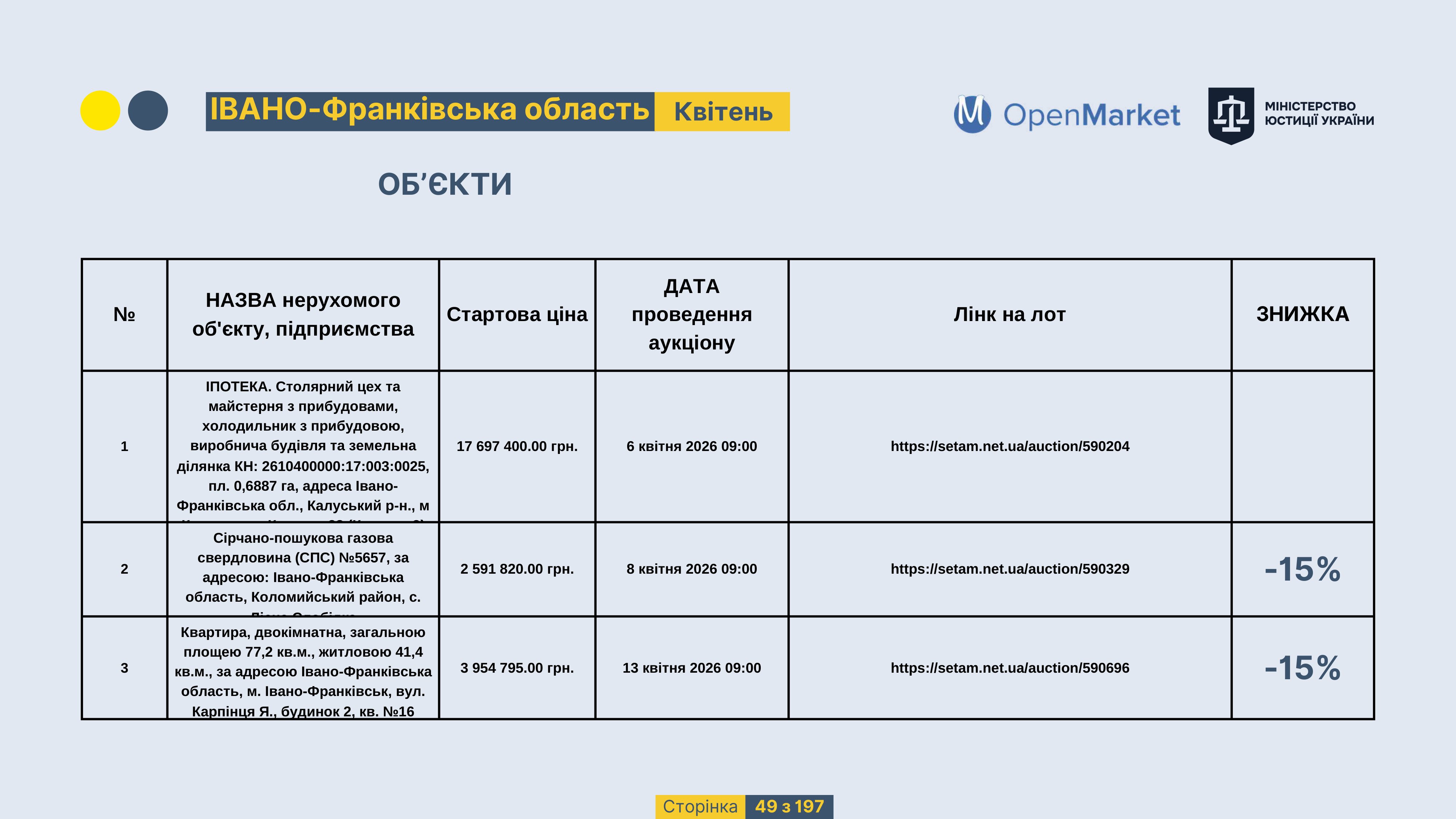 Державне підприємство «СЕТАМ» Міністерства юстиції України (далі - ДП «СЕТАМ»), повідомляє, що відповідно до Порядку реалізації арештованого майна, затвердженого наказом Міністерства юстиції України 29.09.2016 №2831/5, зареєстрованим в Міністерстві юстиції України 30.09.2016 за №1301/29431 (далі - Порядок реалізації), відповідно до частини другої та четвертої статті 61 Закону України від 02.06.2016 «Про виконавче провадження» через державну електронну аукціонну платформу OpenMarket ДП «СЕТАМ» у поточному місяці 2026 року оголошено проведення низки електронних аукціонів («Інвестиційний дайджест №3», що додається).