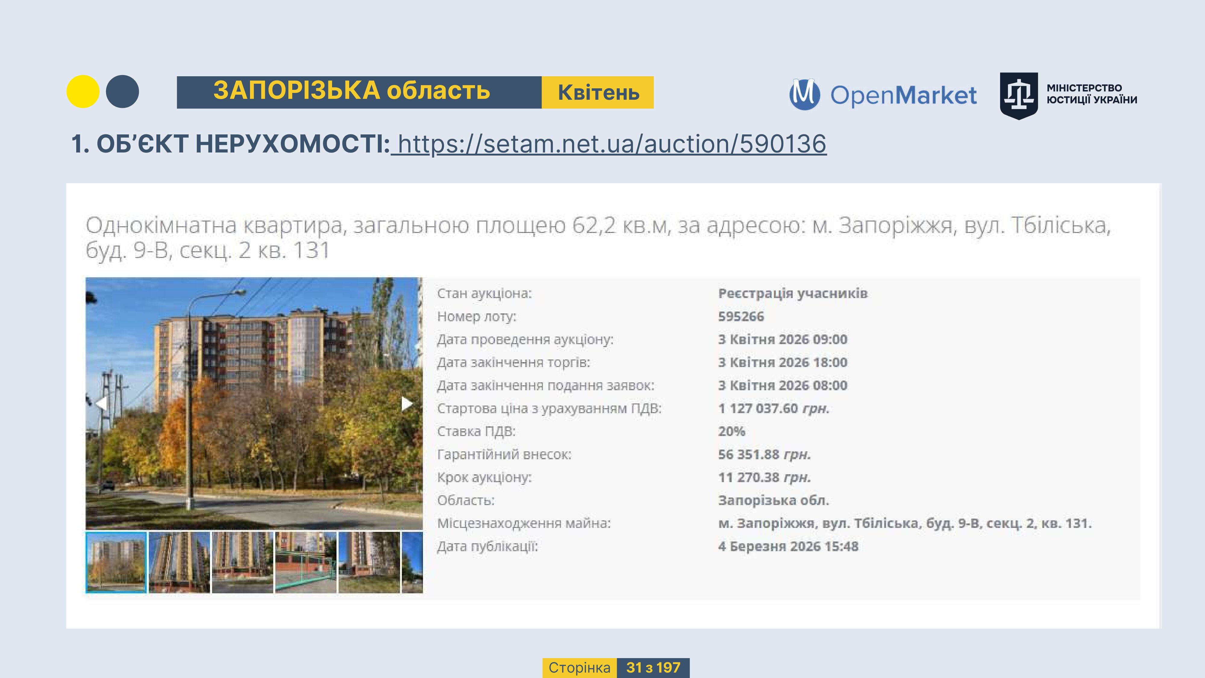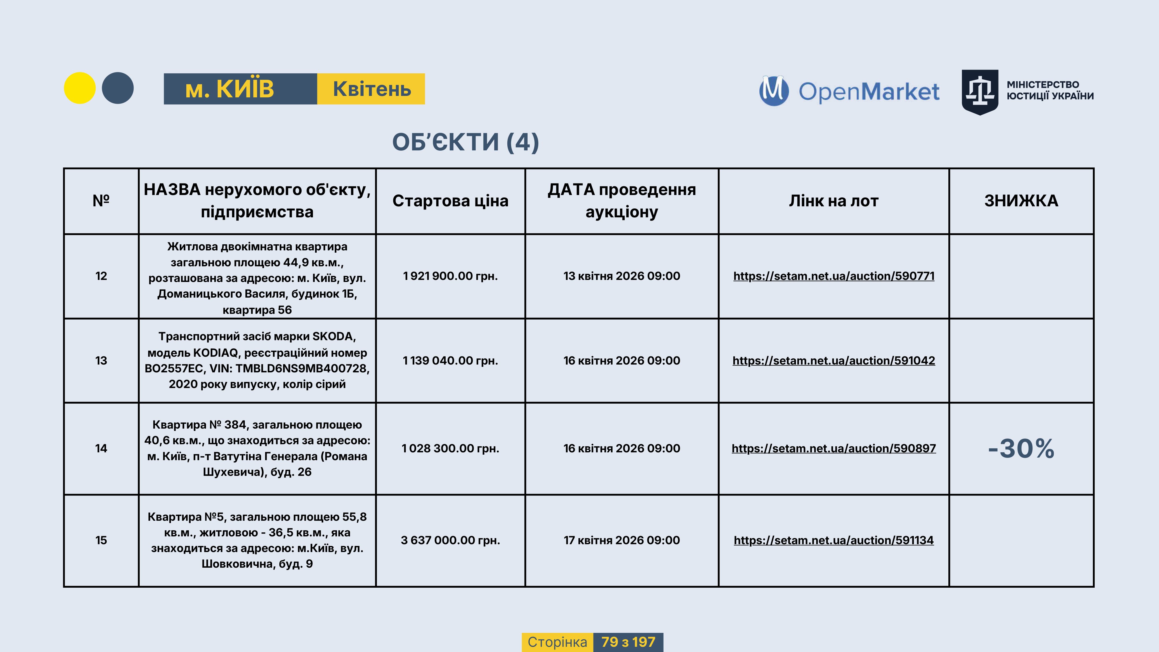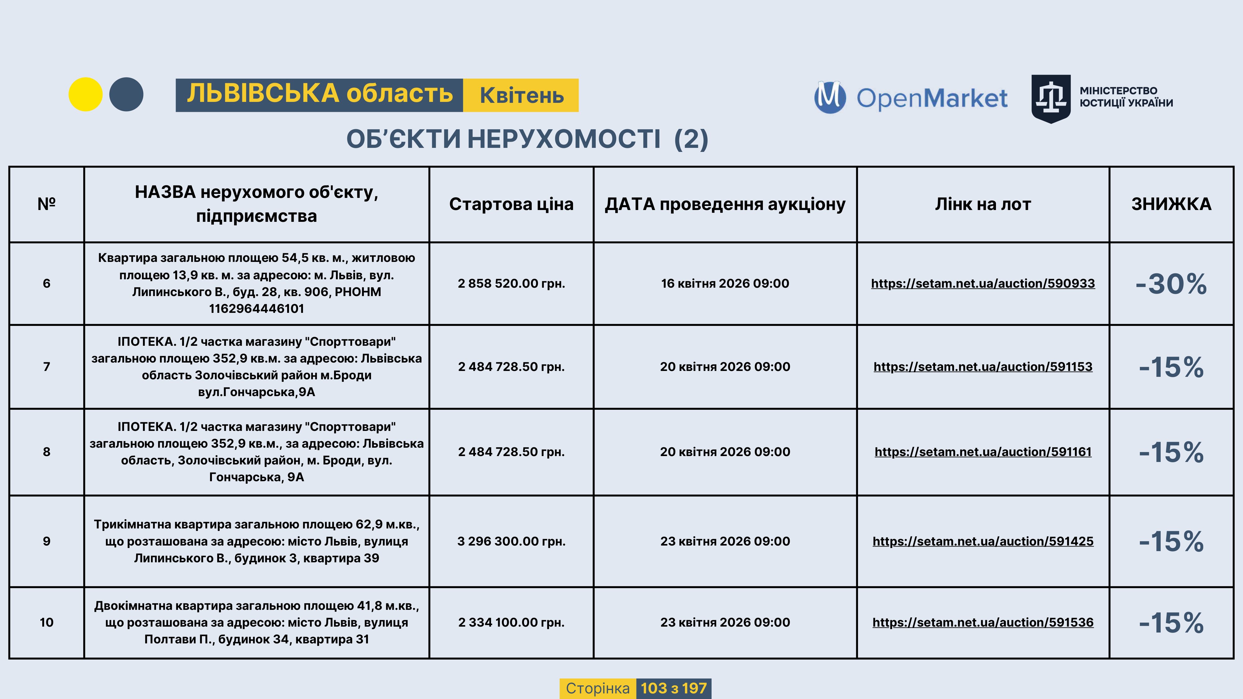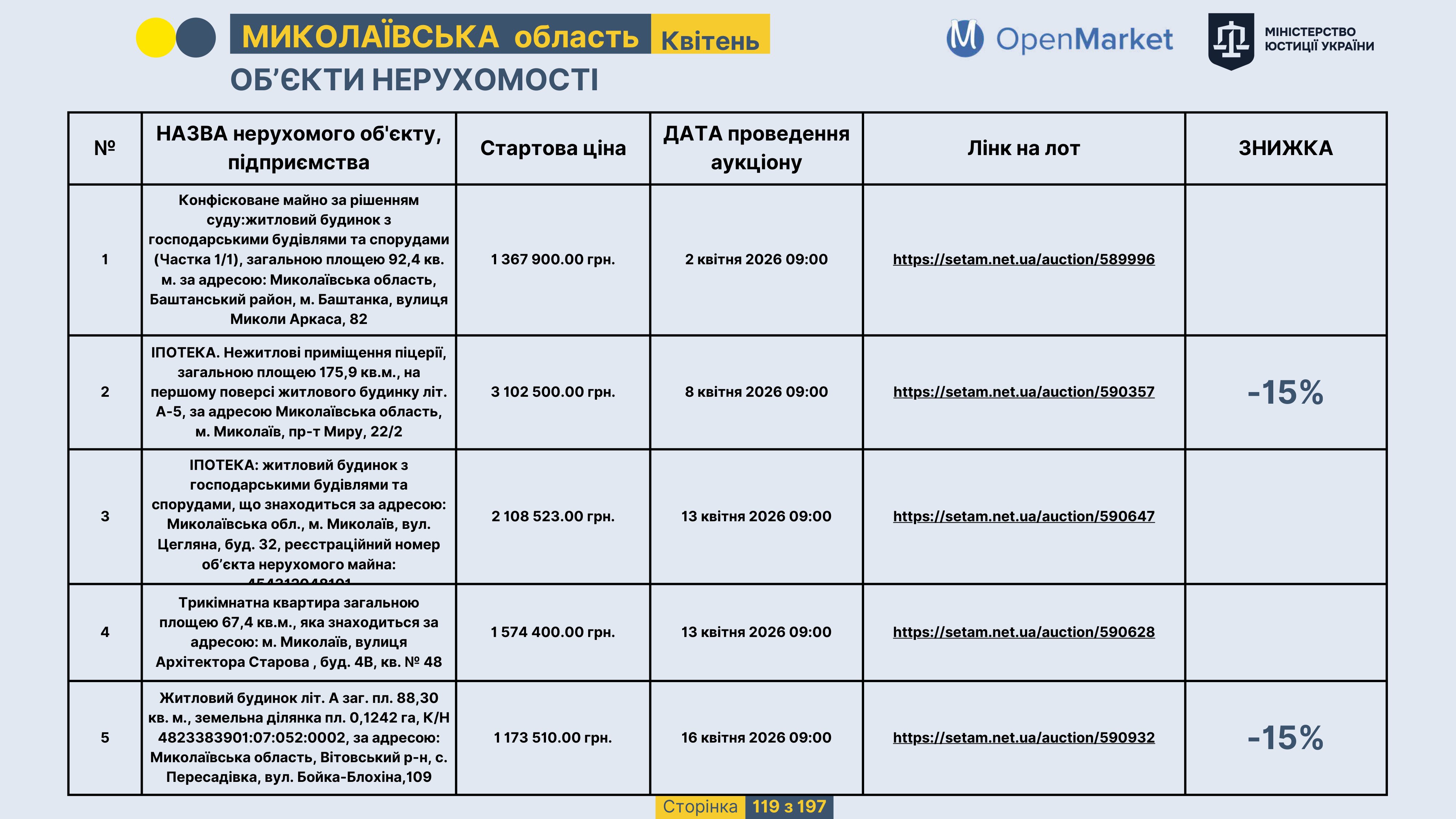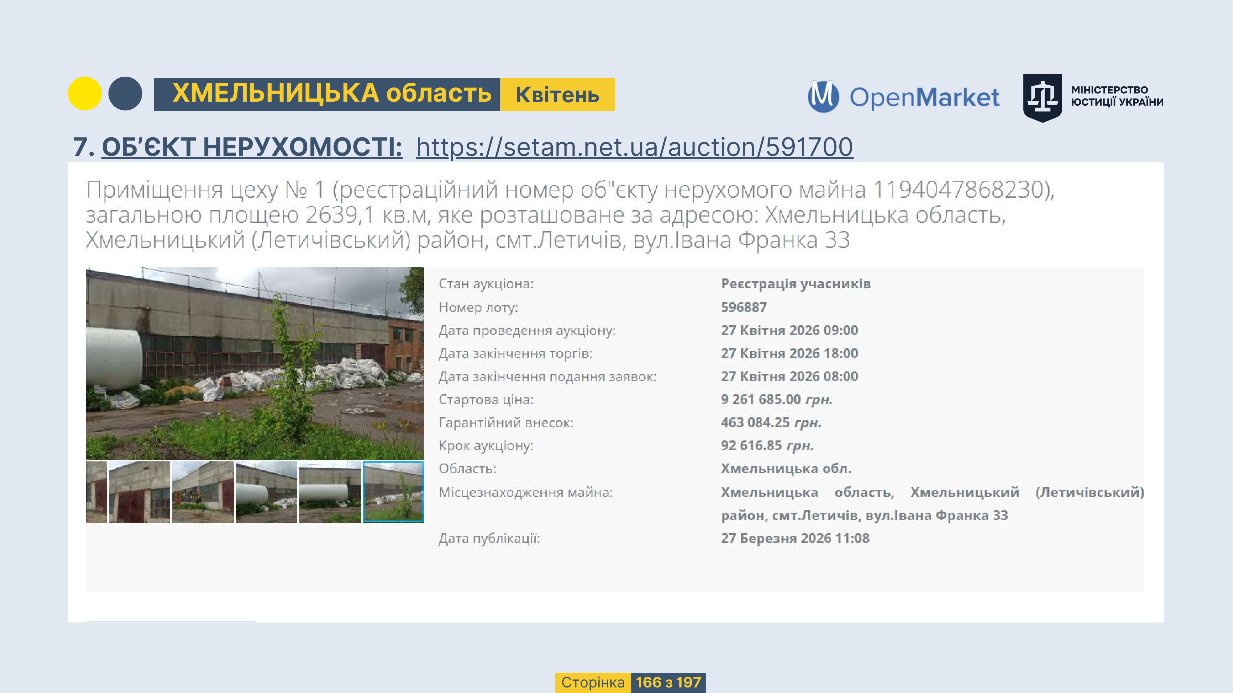 Державне підприємство «СЕТАМ» Міністерства юстиції України (далі - ДП «СЕТАМ»), повідомляє, що відповідно до Порядку реалізації арештованого майна, затвердженого наказом Міністерства юстиції України 29.09.2016 №2831/5, зареєстрованим в Міністерстві юстиції України 30.09.2016 за №1301/29431 (далі - Порядок реалізації), відповідно до частини другої та четвертої статті 61 Закону України від 02.06.2016 «Про виконавче провадження» через державну електронну аукціонну платформу OpenMarket ДП «СЕТАМ» у поточному місяці 2026 року оголошено проведення низки електронних аукціонів («Інвестиційний дайджест №3», що додається).