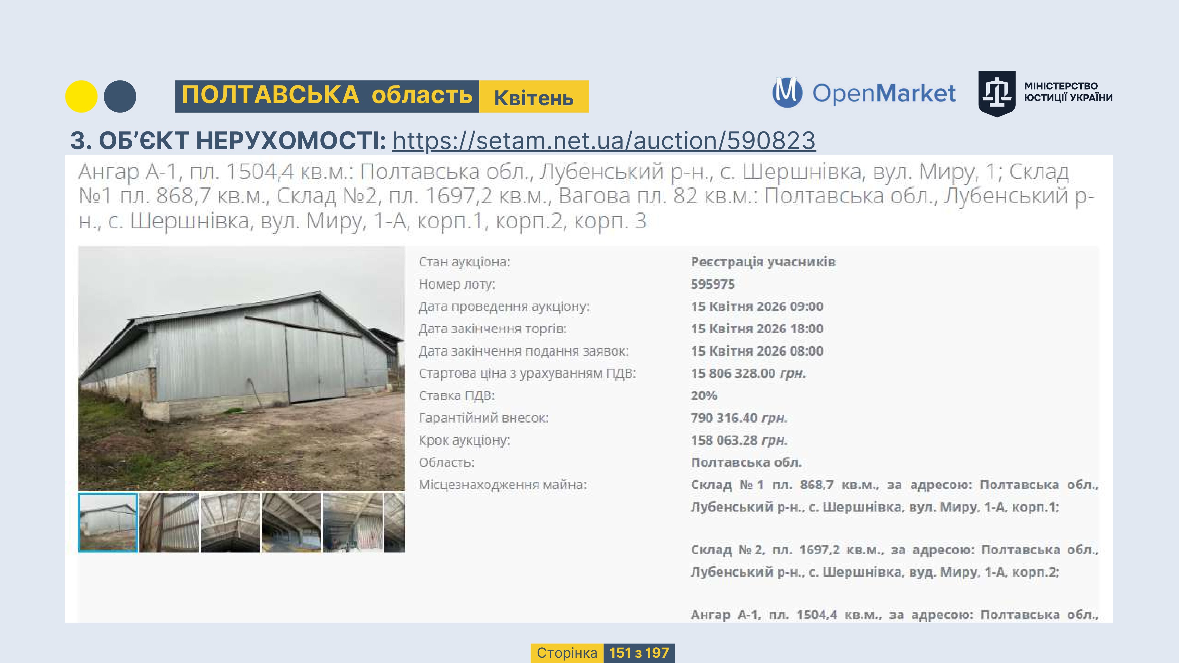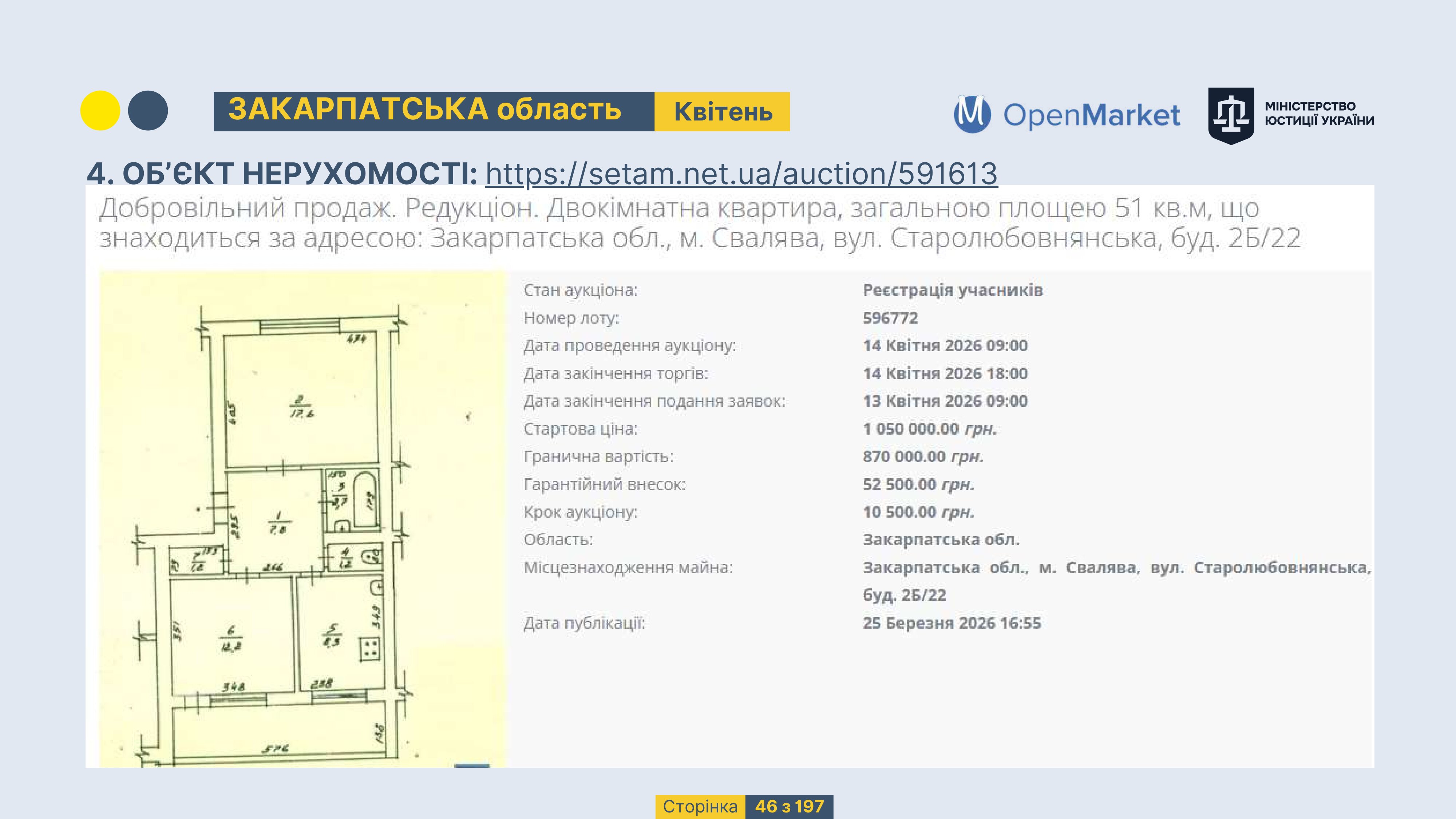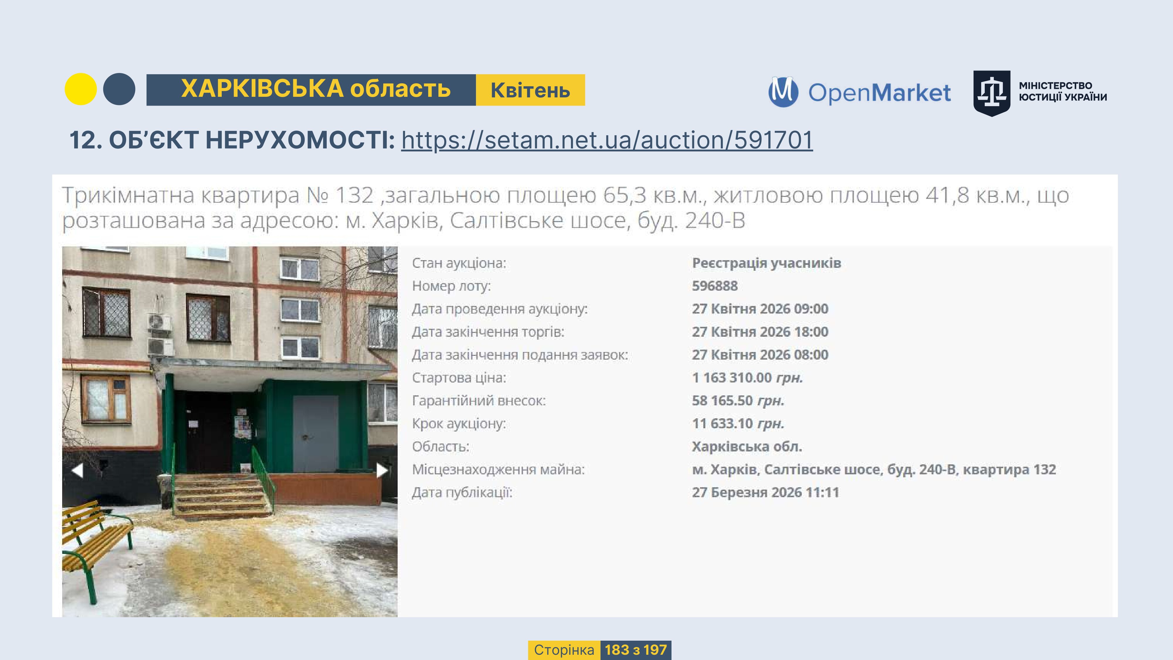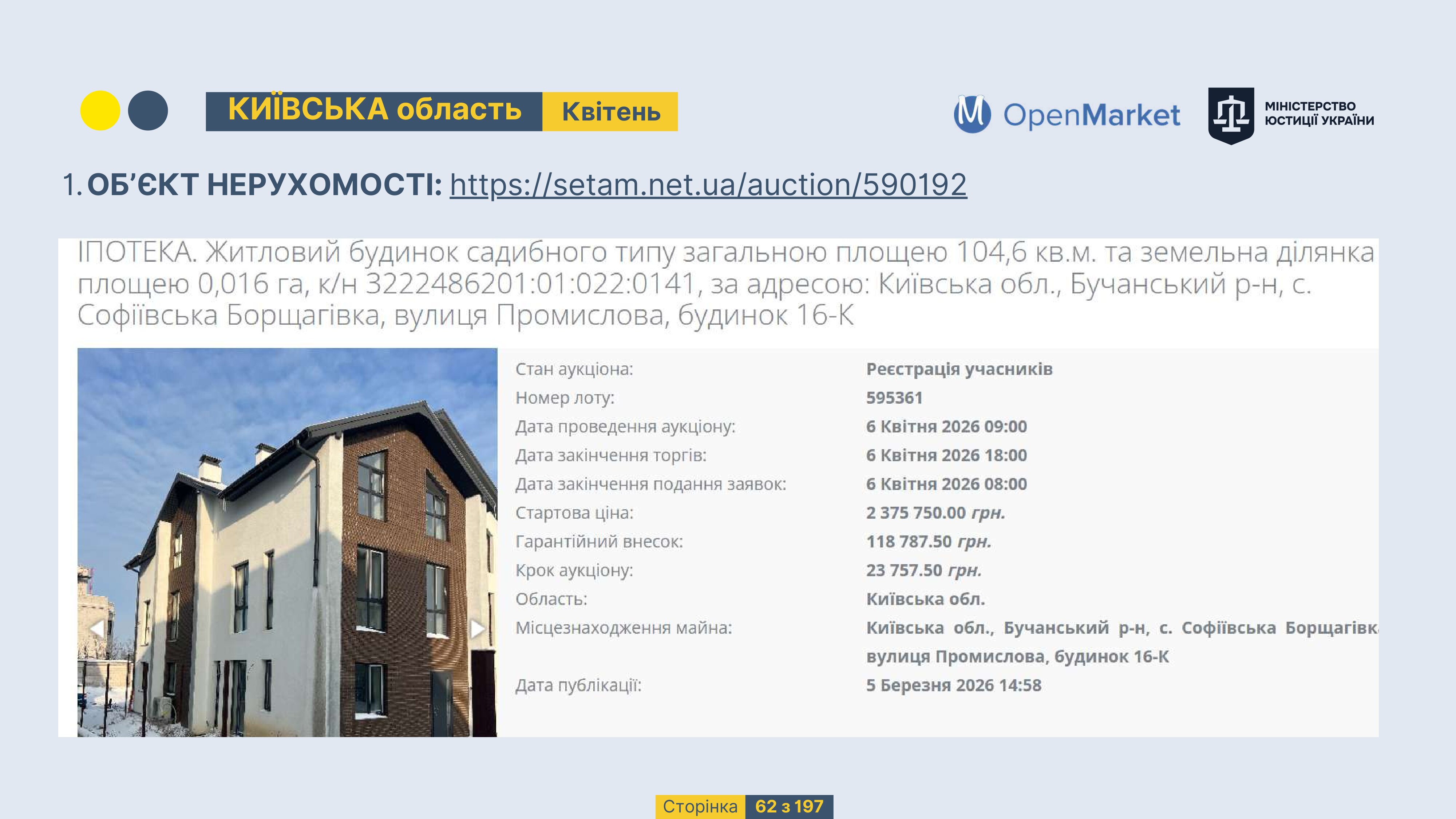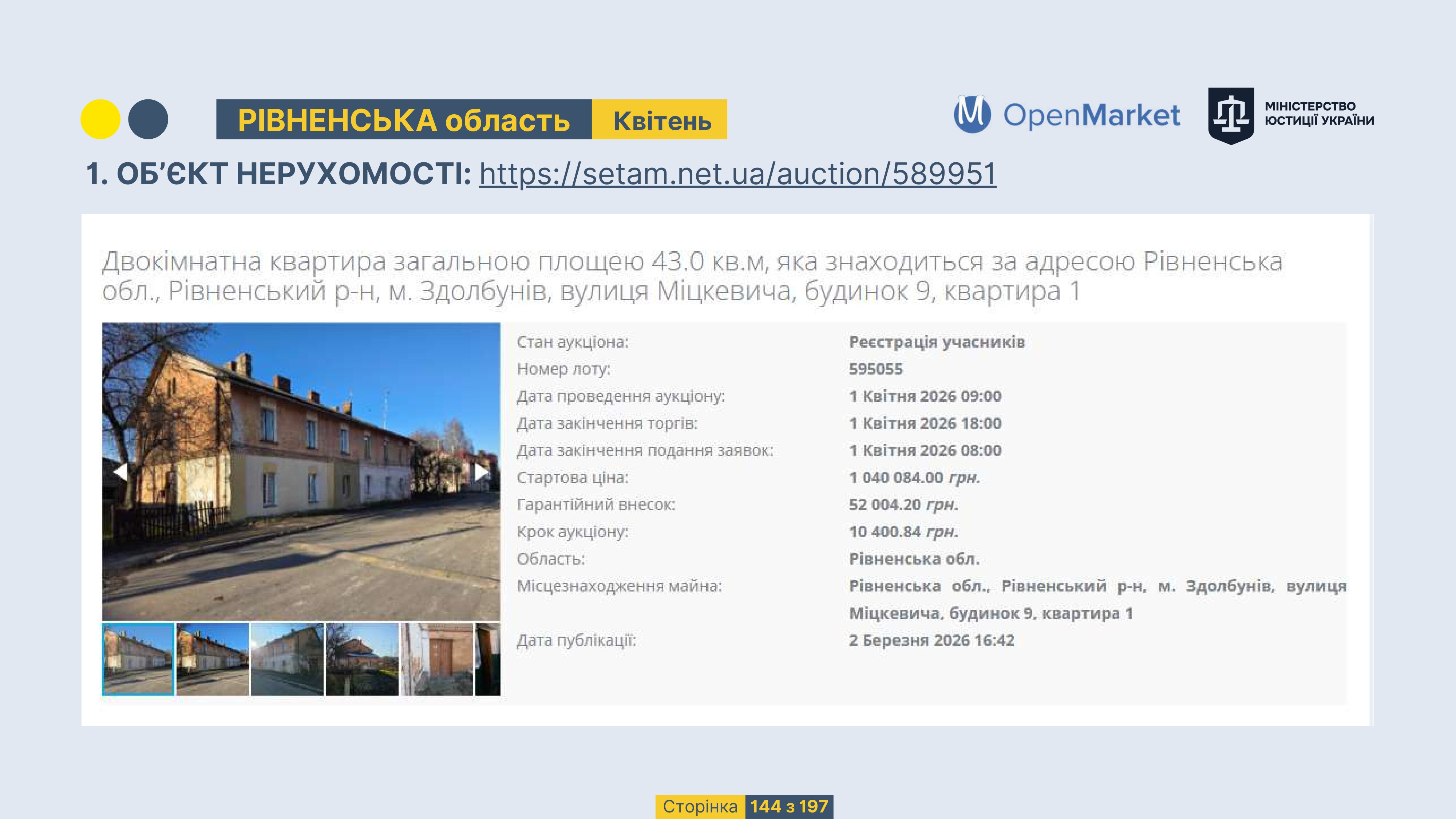 Державне підприємство «СЕТАМ» Міністерства юстиції України (далі - ДП «СЕТАМ»), повідомляє, що відповідно до Порядку реалізації арештованого майна, затвердженого наказом Міністерства юстиції України 29.09.2016 №2831/5, зареєстрованим в Міністерстві юстиції України 30.09.2016 за №1301/29431 (далі - Порядок реалізації), відповідно до частини другої та четвертої статті 61 Закону України від 02.06.2016 «Про виконавче провадження» через державну електронну аукціонну платформу OpenMarket ДП «СЕТАМ» у поточному місяці 2026 року оголошено проведення низки електронних аукціонів («Інвестиційний дайджест №3», що додається).