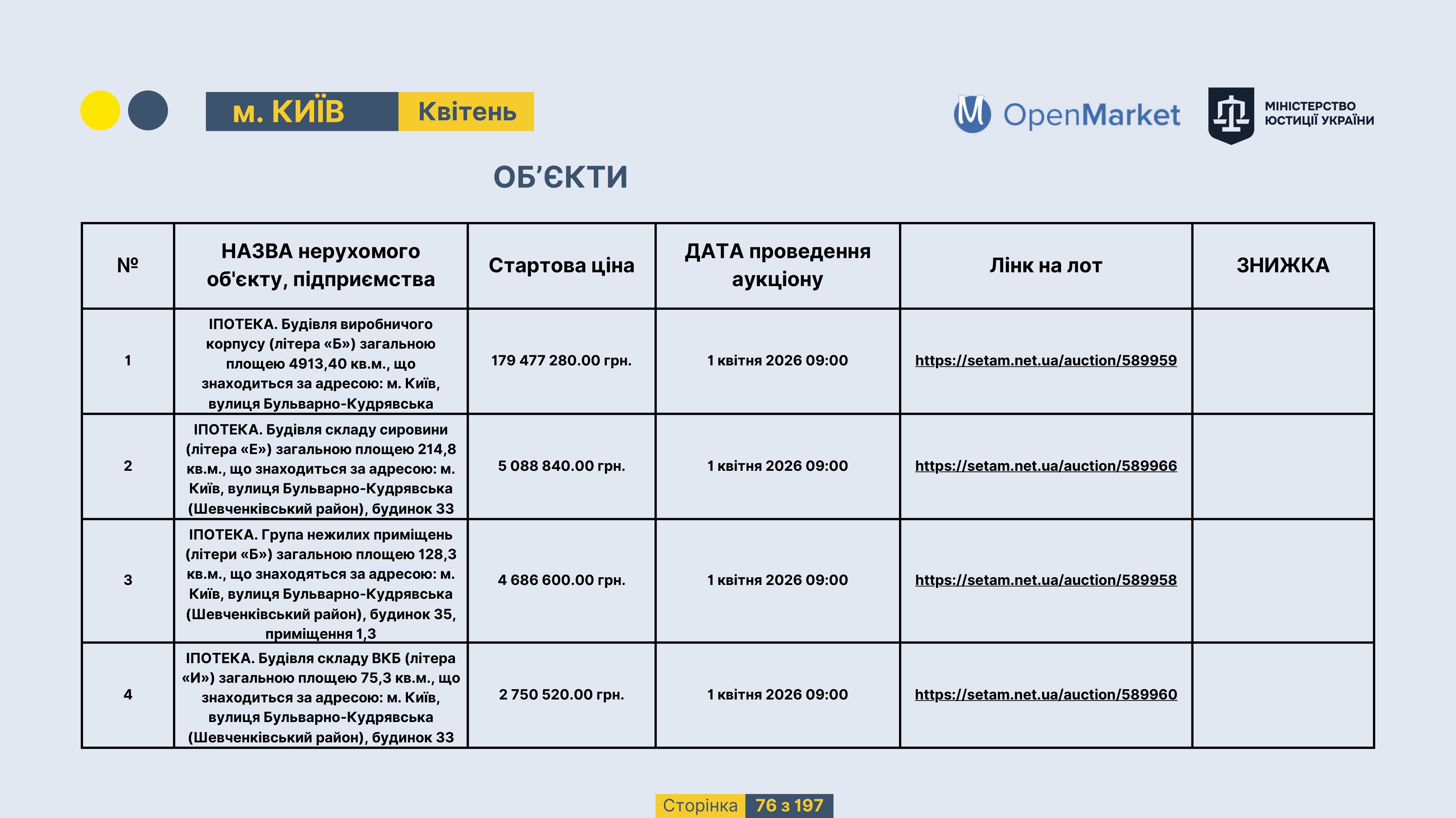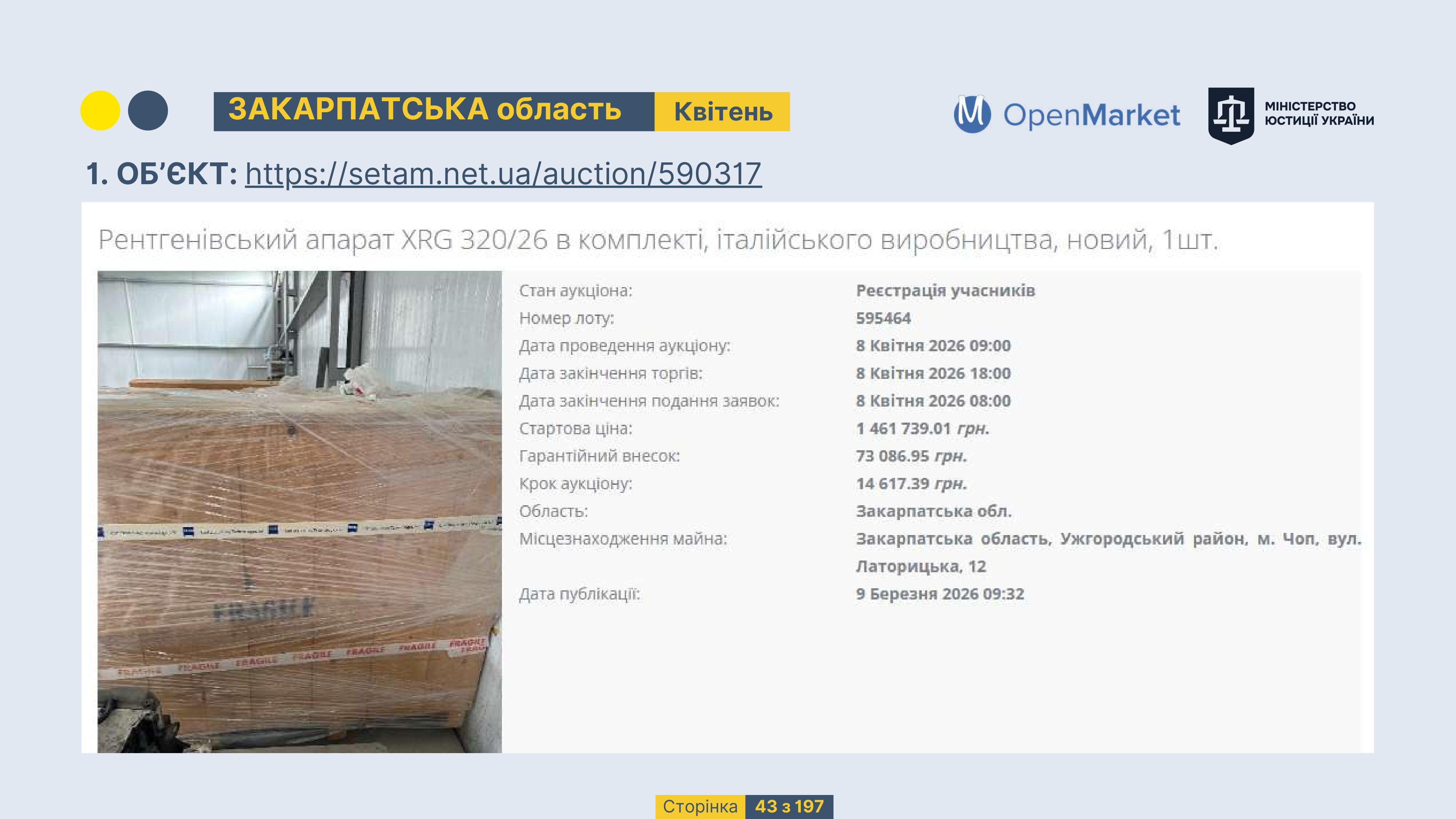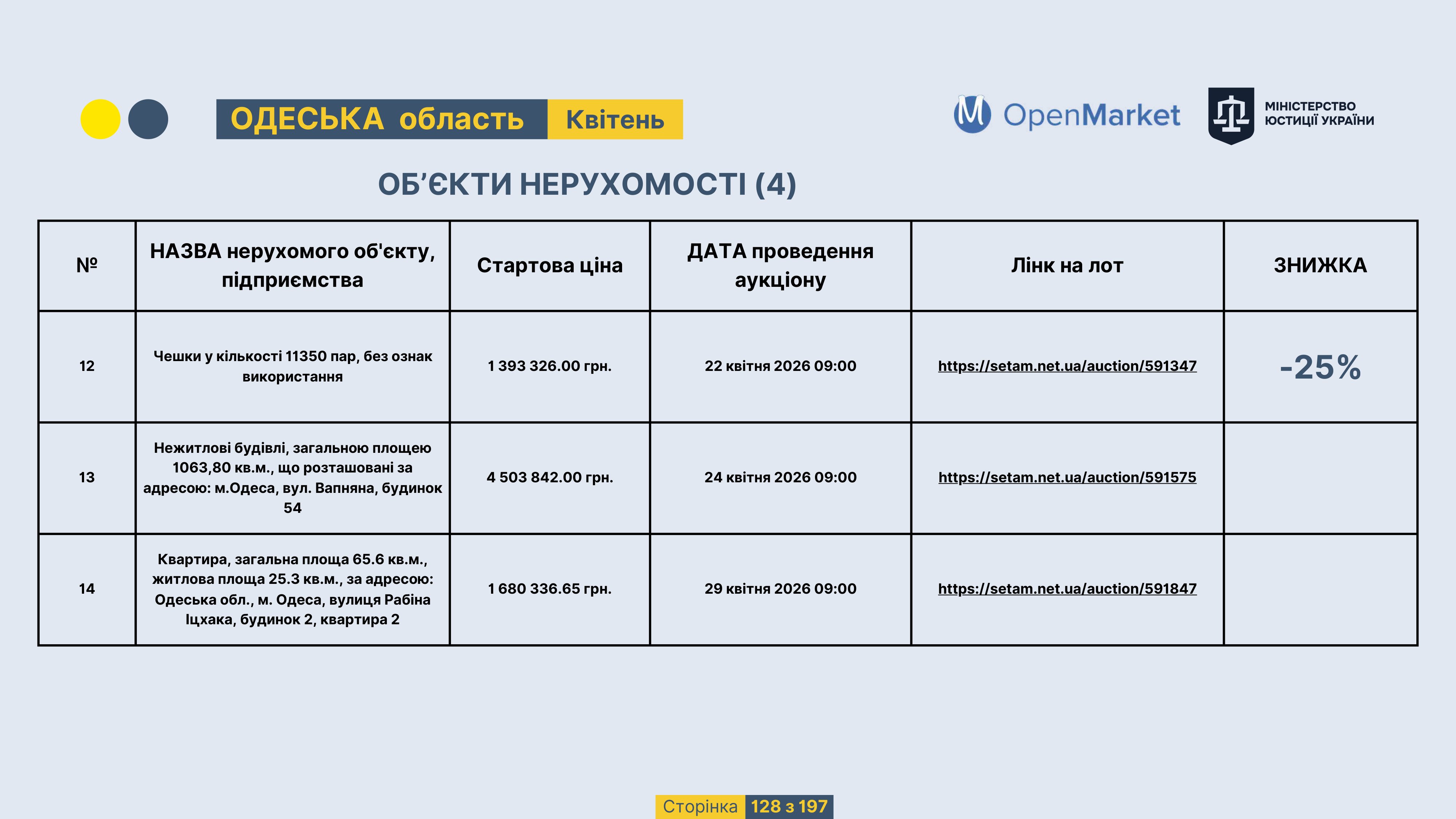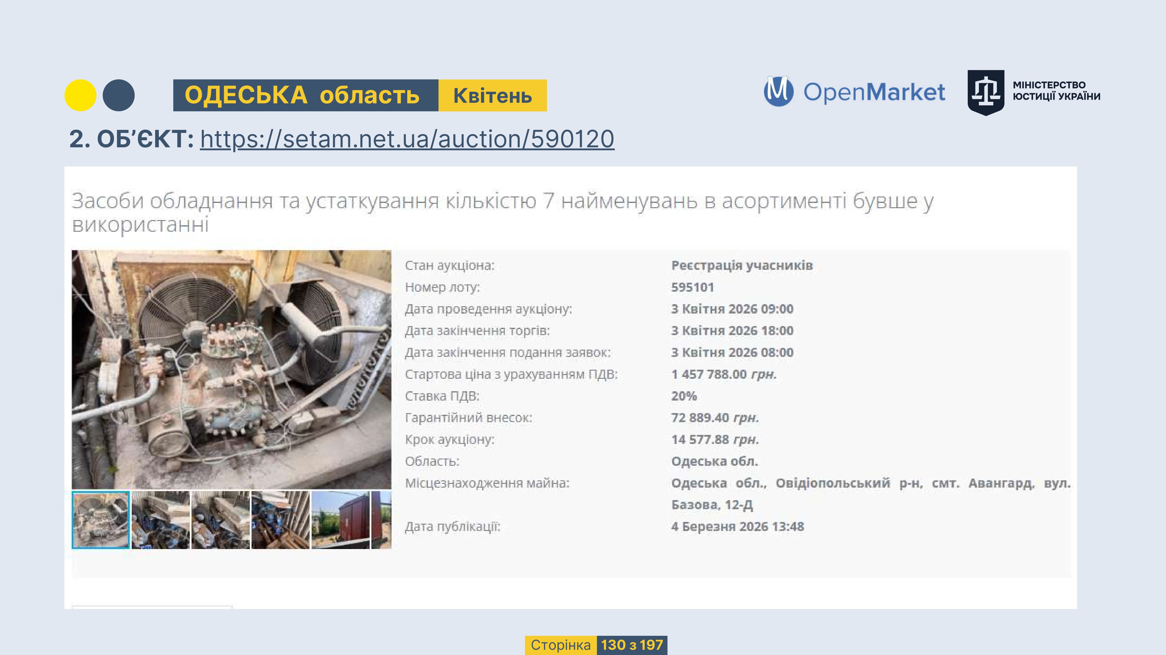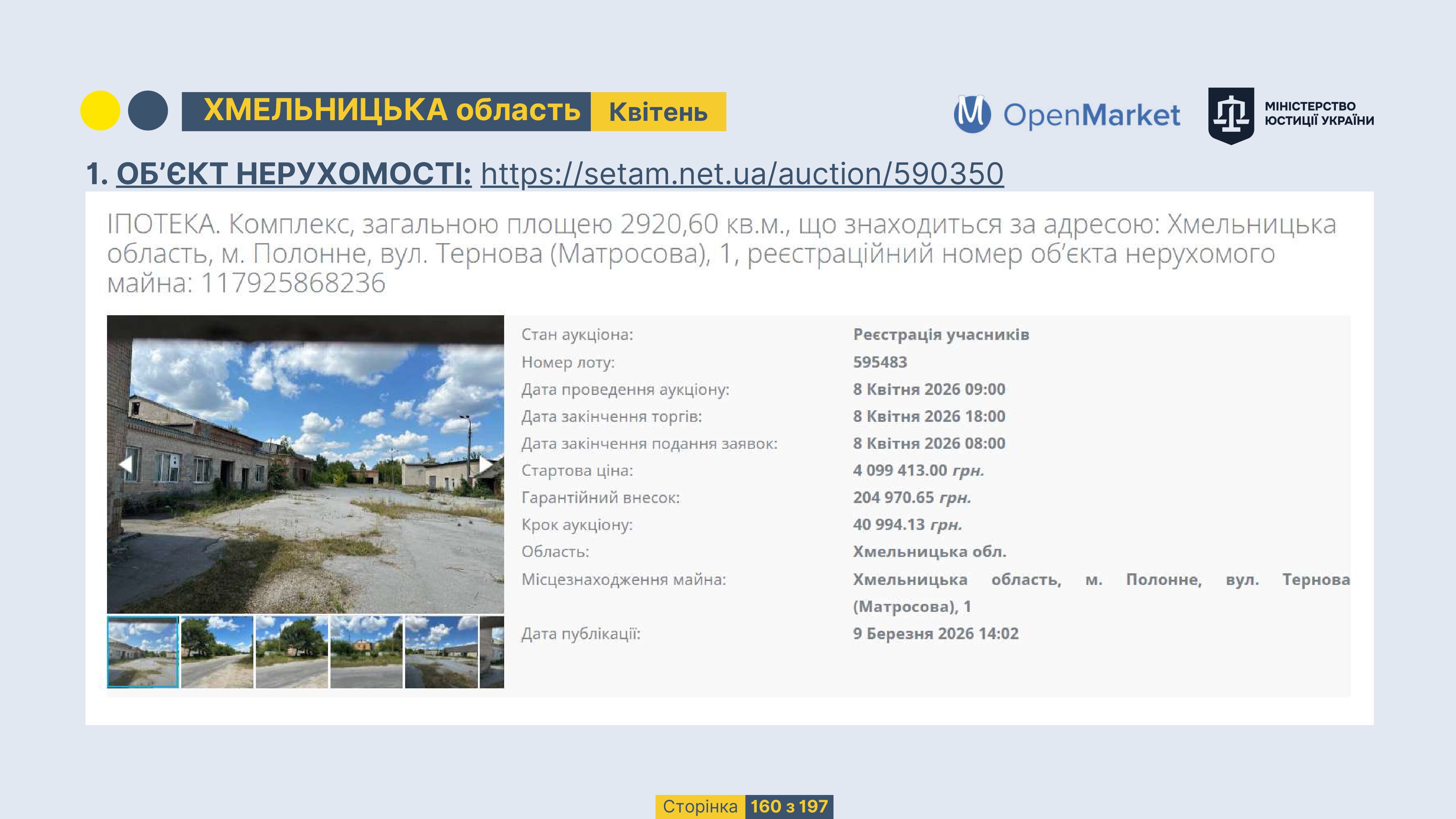 Державне підприємство «СЕТАМ» Міністерства юстиції України (далі - ДП «СЕТАМ»), повідомляє, що відповідно до Порядку реалізації арештованого майна, затвердженого наказом Міністерства юстиції України 29.09.2016 №2831/5, зареєстрованим в Міністерстві юстиції України 30.09.2016 за №1301/29431 (далі - Порядок реалізації), відповідно до частини другої та четвертої статті 61 Закону України від 02.06.2016 «Про виконавче провадження» через державну електронну аукціонну платформу OpenMarket ДП «СЕТАМ» у поточному місяці 2026 року оголошено проведення низки електронних аукціонів («Інвестиційний дайджест №3», що додається).
