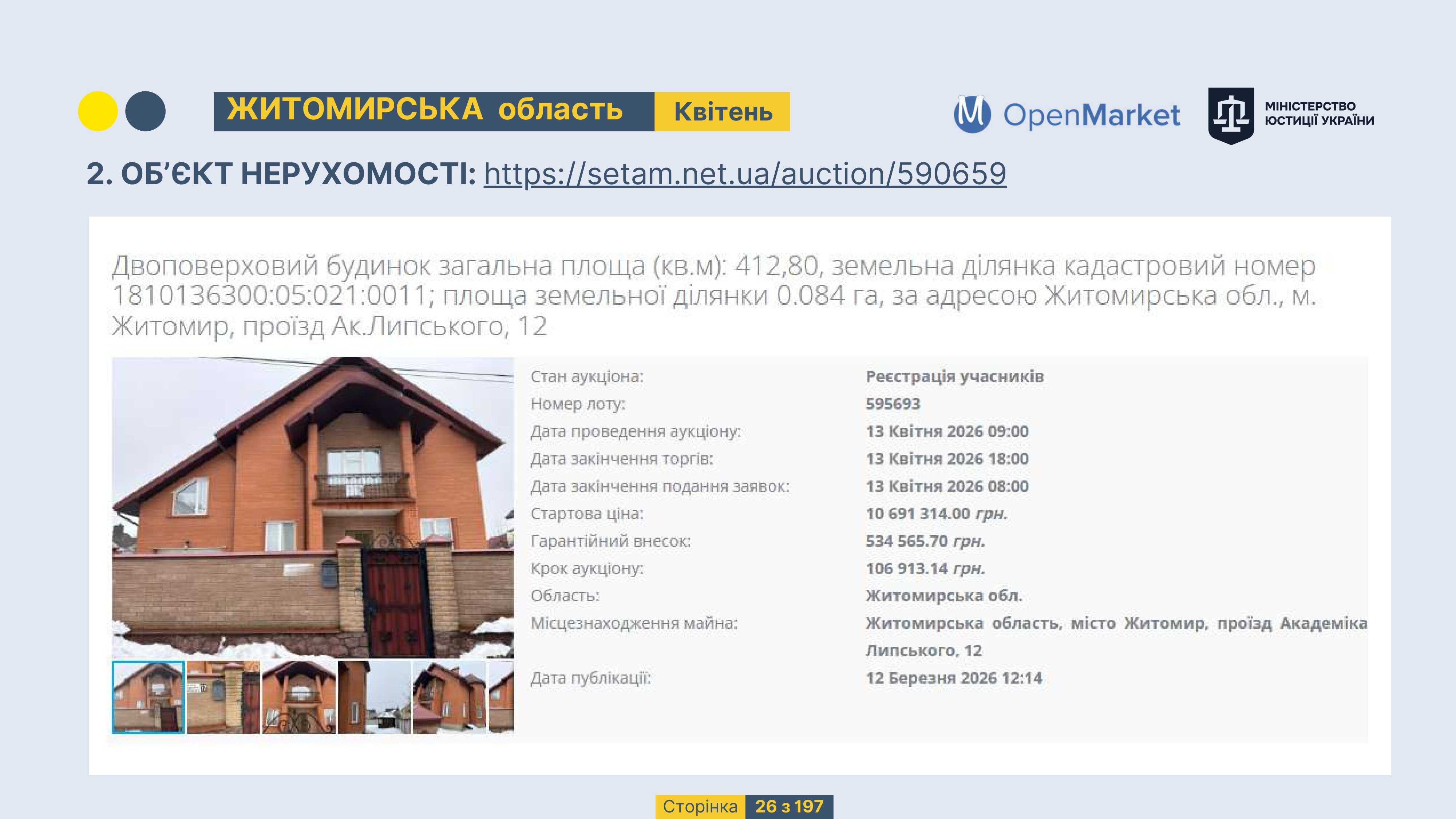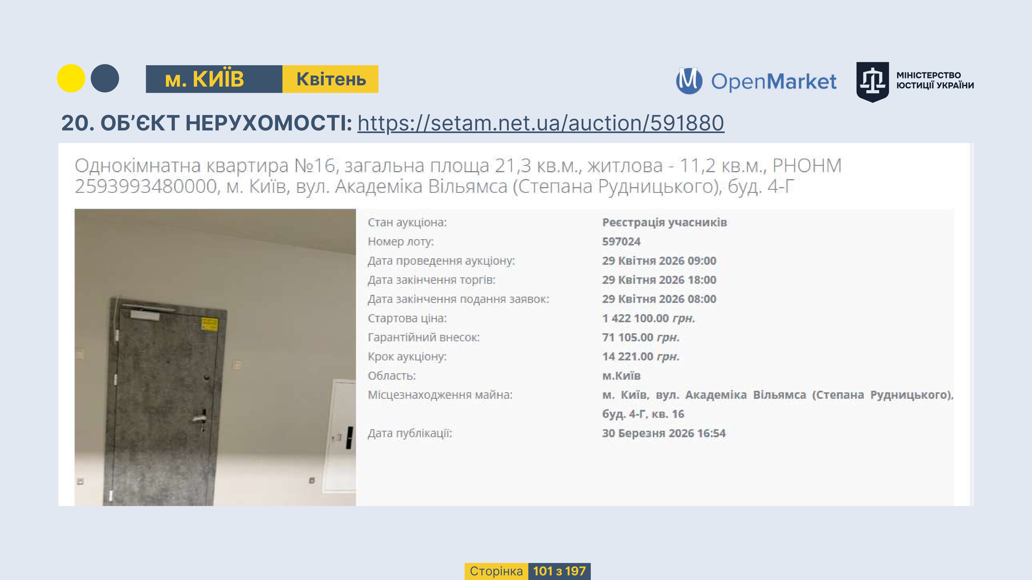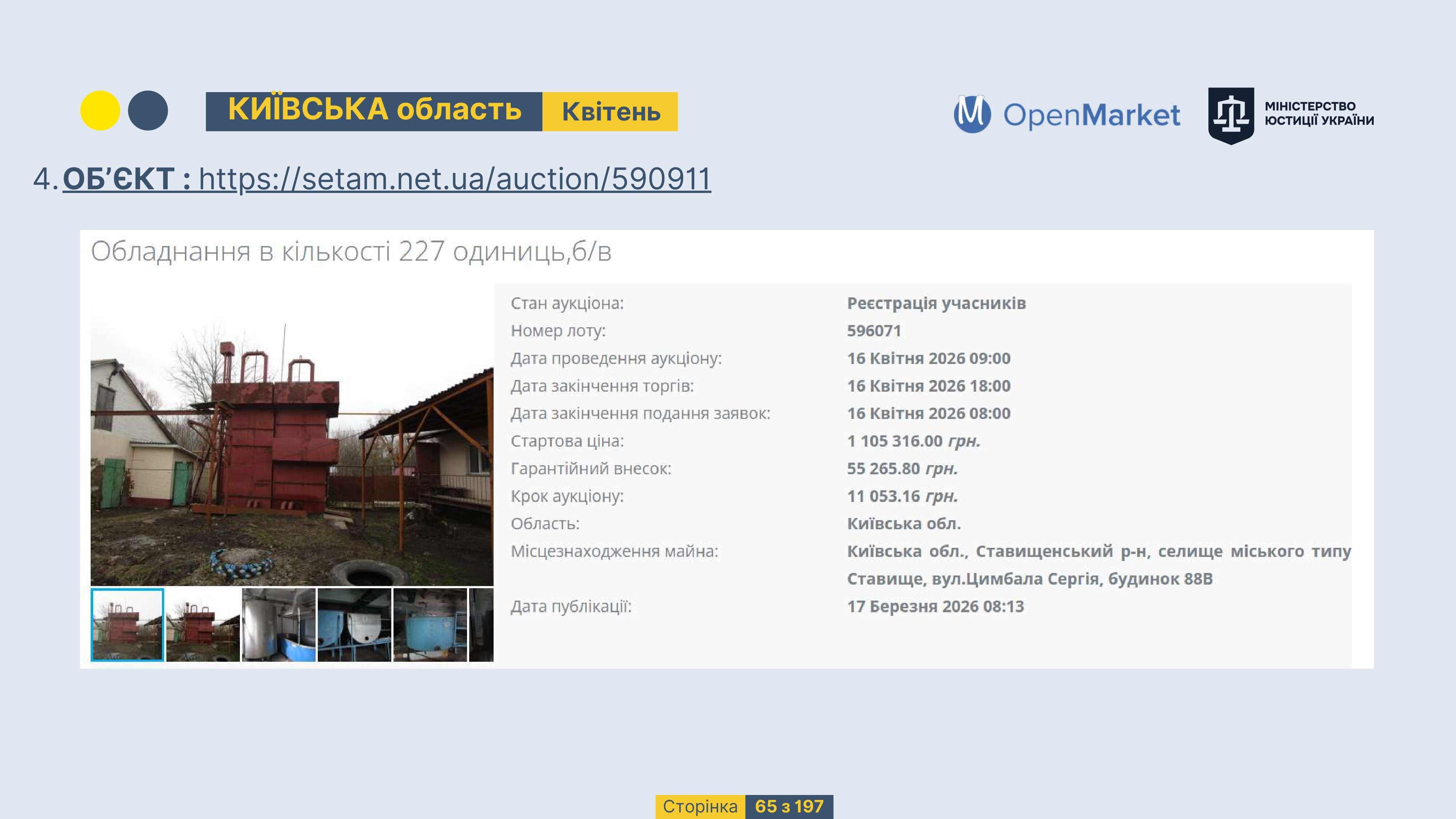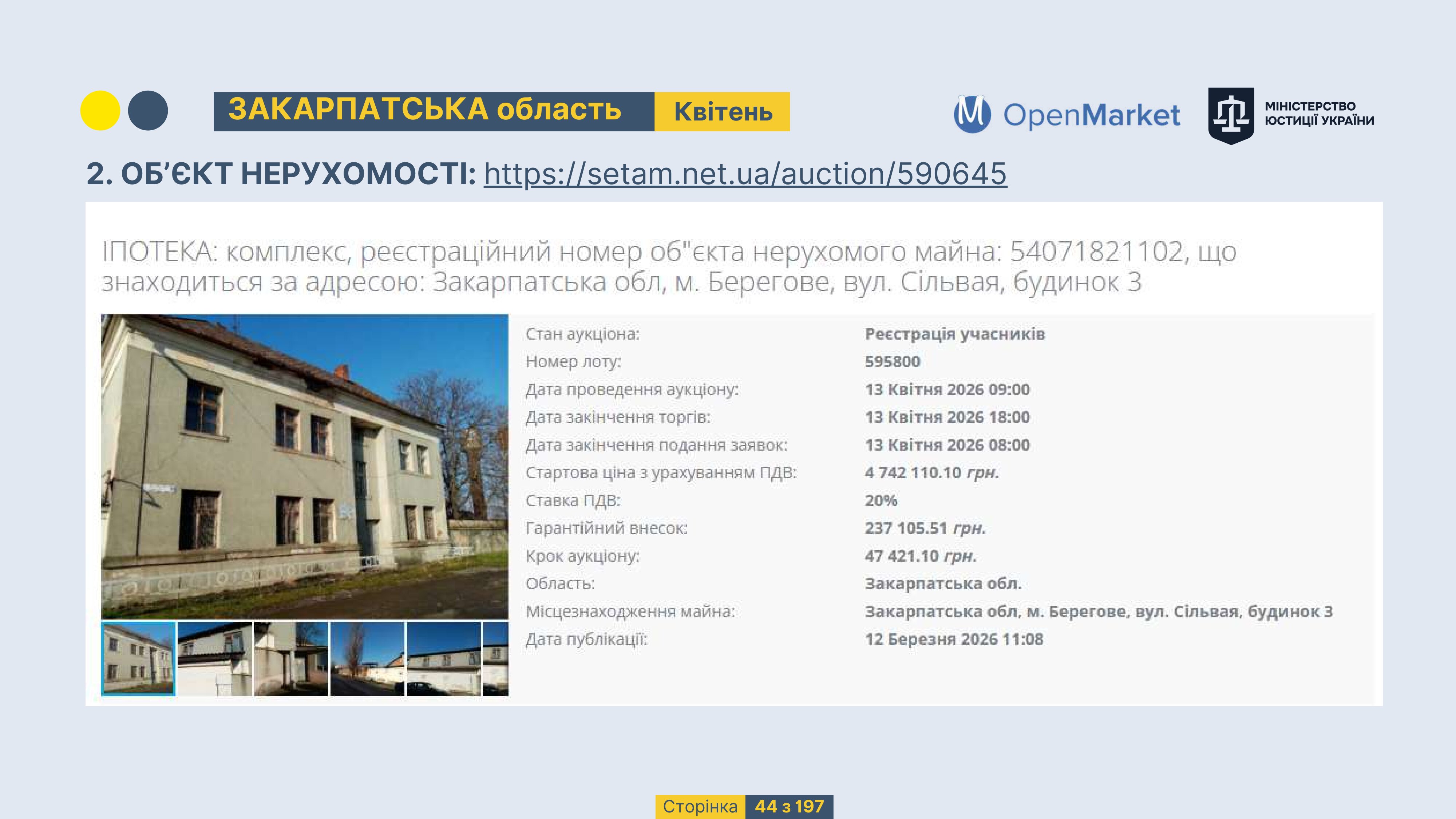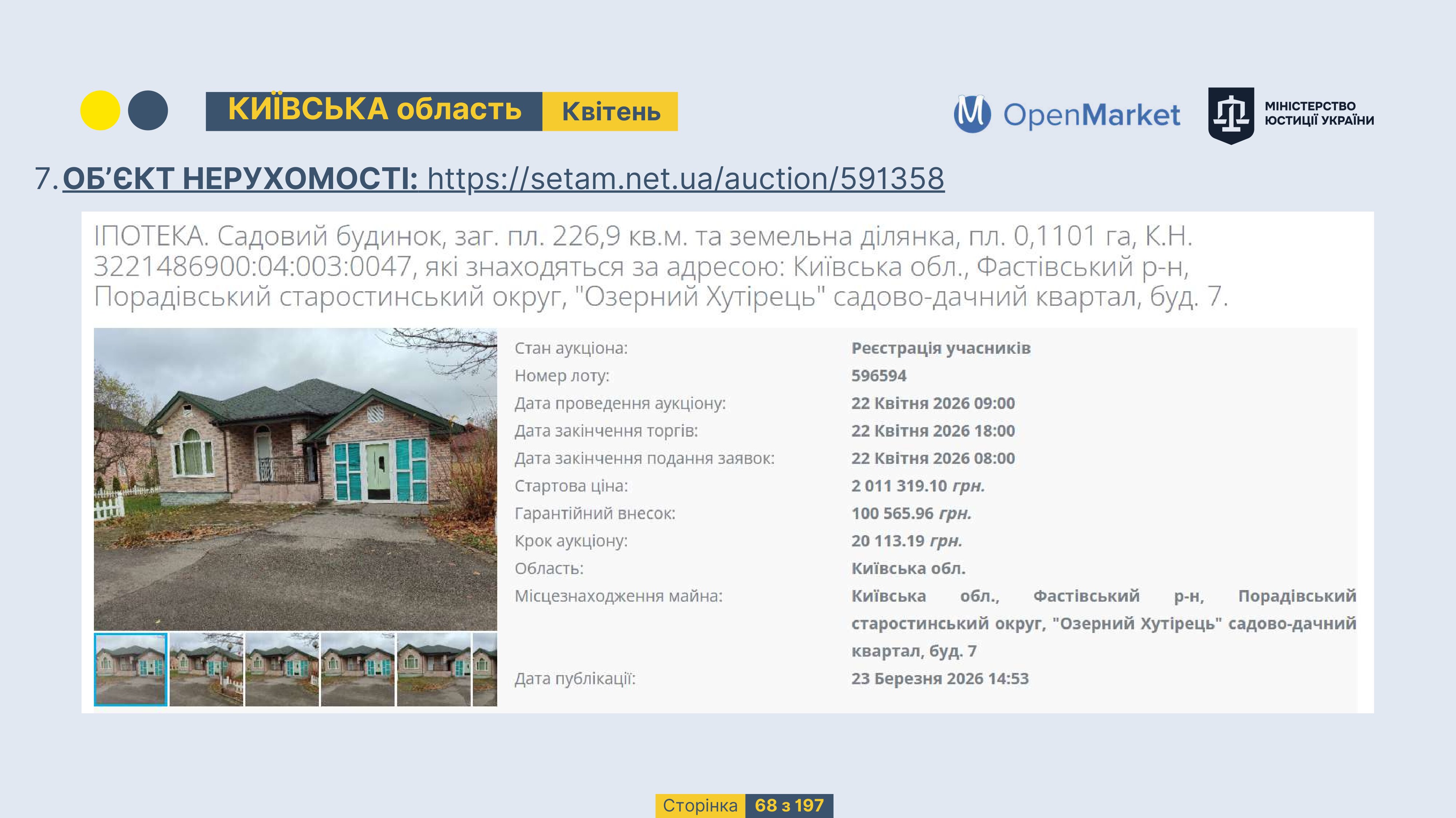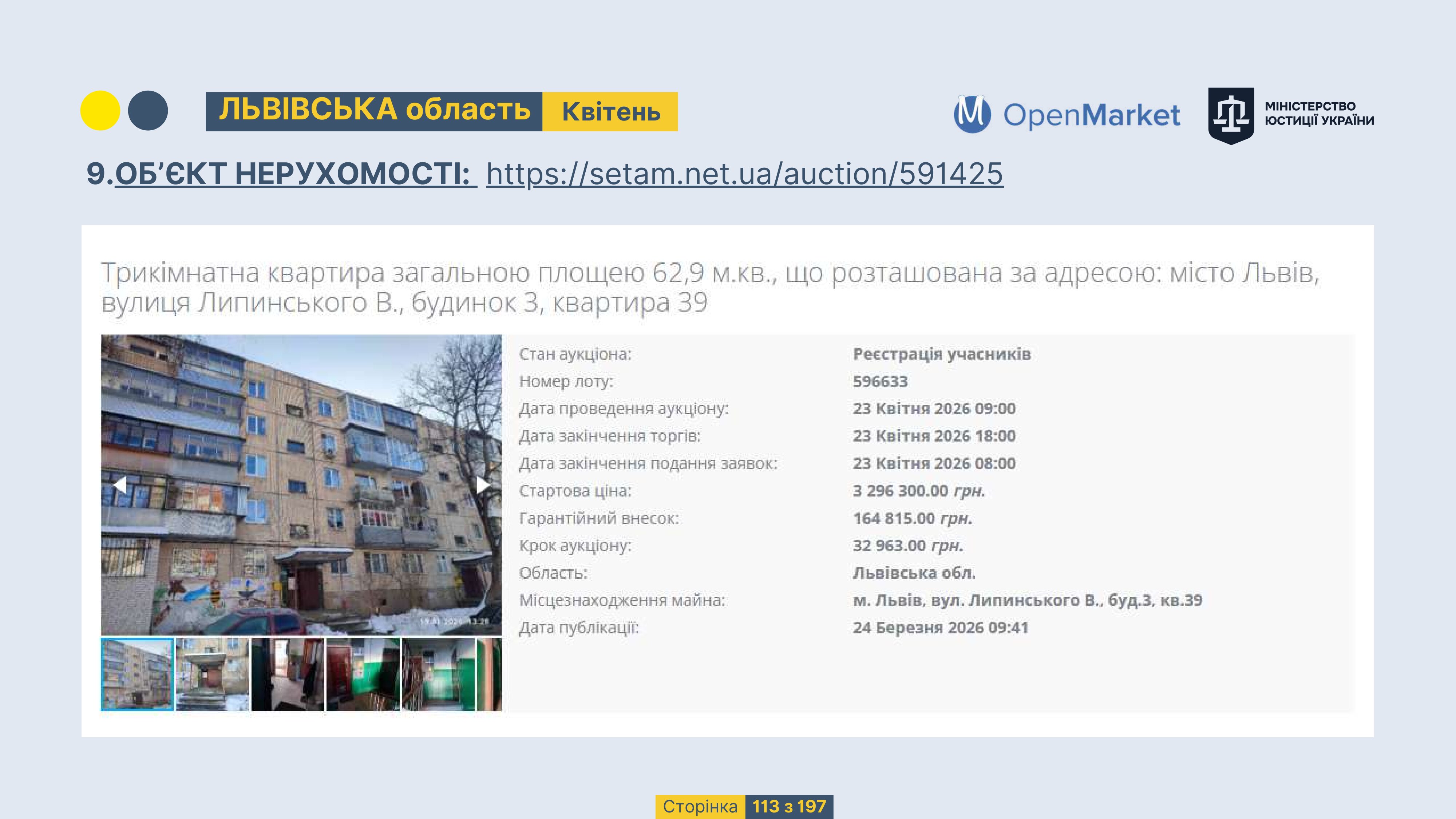 Державне підприємство «СЕТАМ» Міністерства юстиції України (далі - ДП «СЕТАМ»), повідомляє, що відповідно до Порядку реалізації арештованого майна, затвердженого наказом Міністерства юстиції України 29.09.2016 №2831/5, зареєстрованим в Міністерстві юстиції України 30.09.2016 за №1301/29431 (далі - Порядок реалізації), відповідно до частини другої та четвертої статті 61 Закону України від 02.06.2016 «Про виконавче провадження» через державну електронну аукціонну платформу OpenMarket ДП «СЕТАМ» у поточному місяці 2026 року оголошено проведення низки електронних аукціонів («Інвестиційний дайджест №3», що додається).