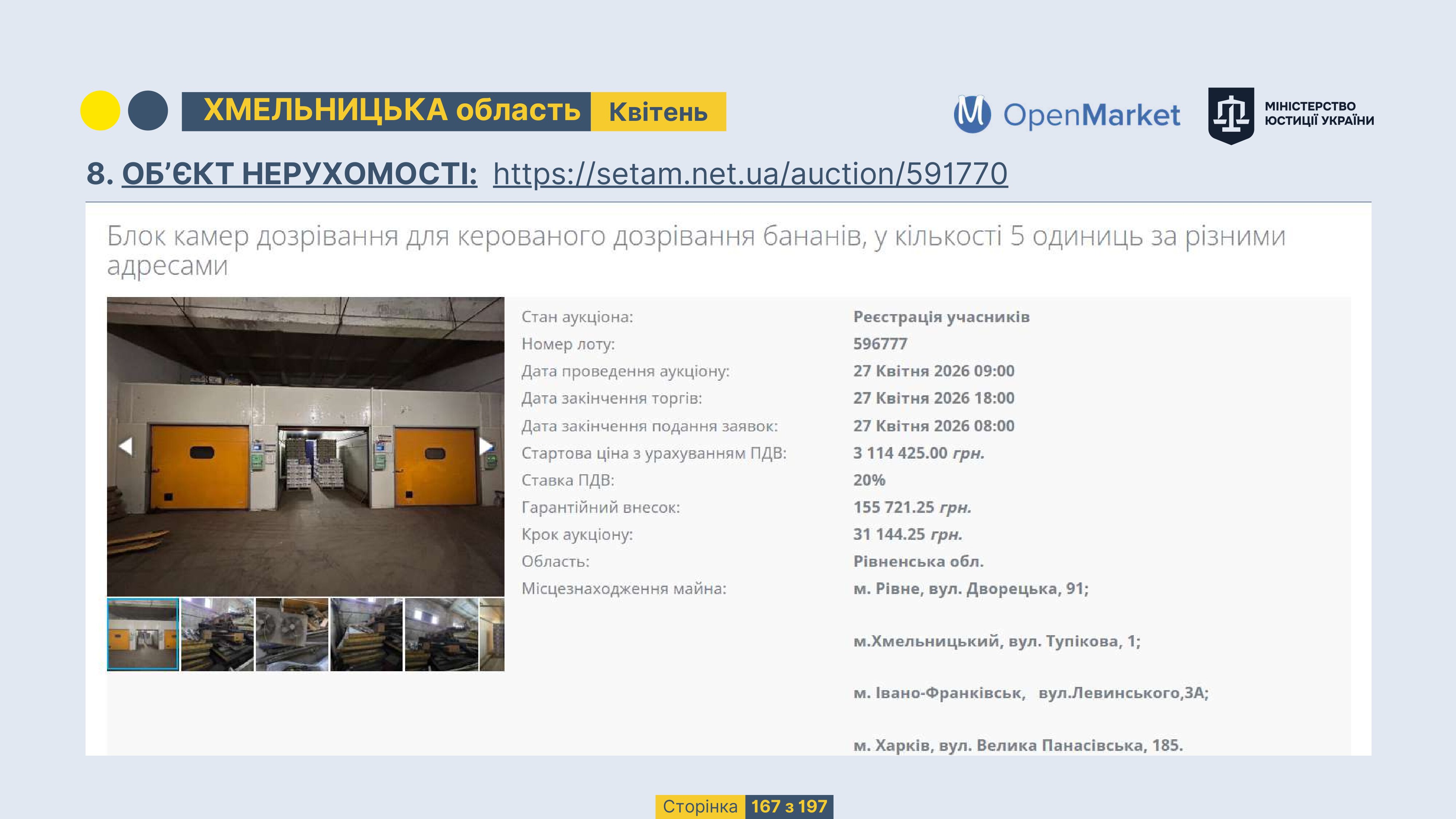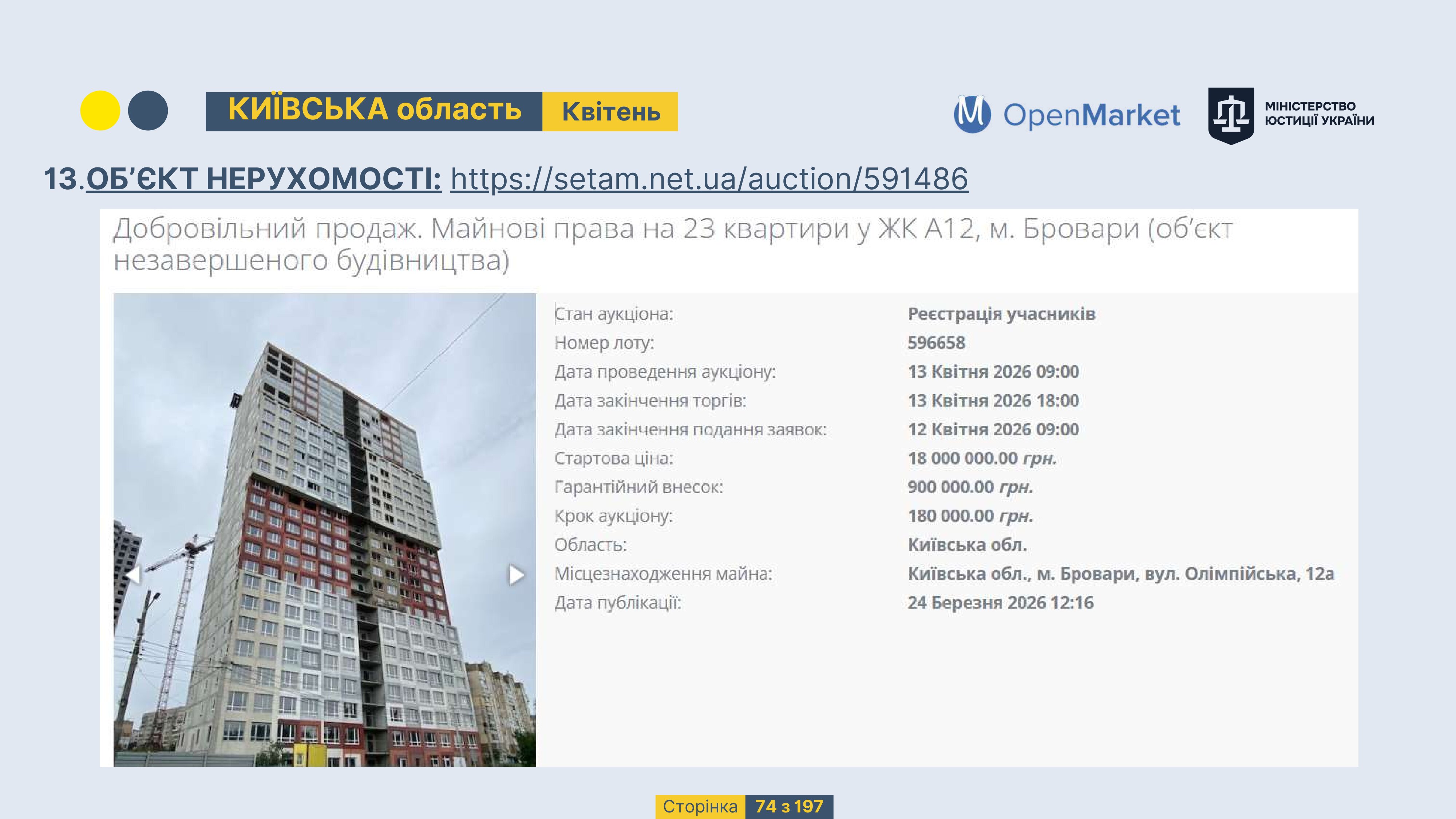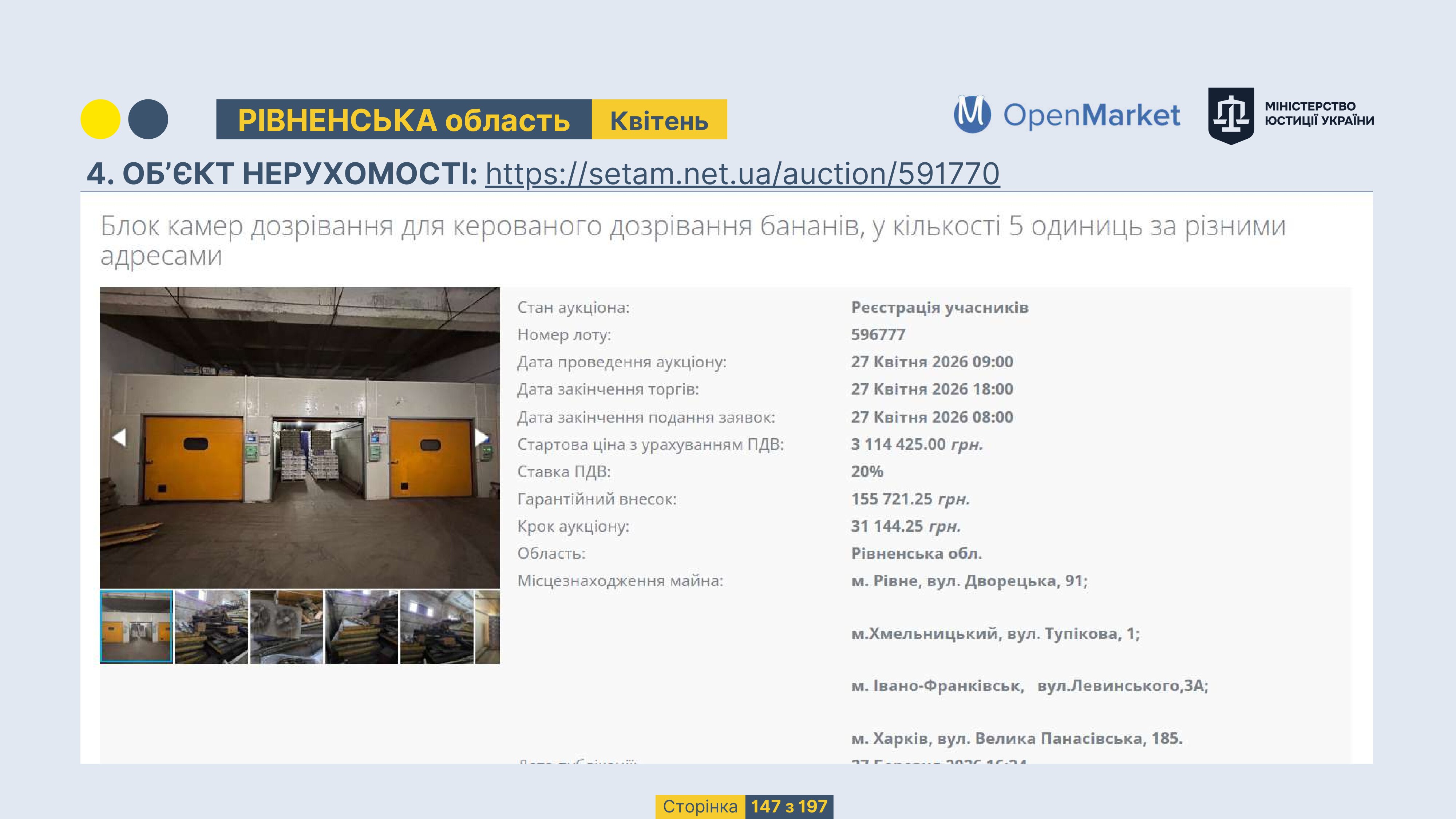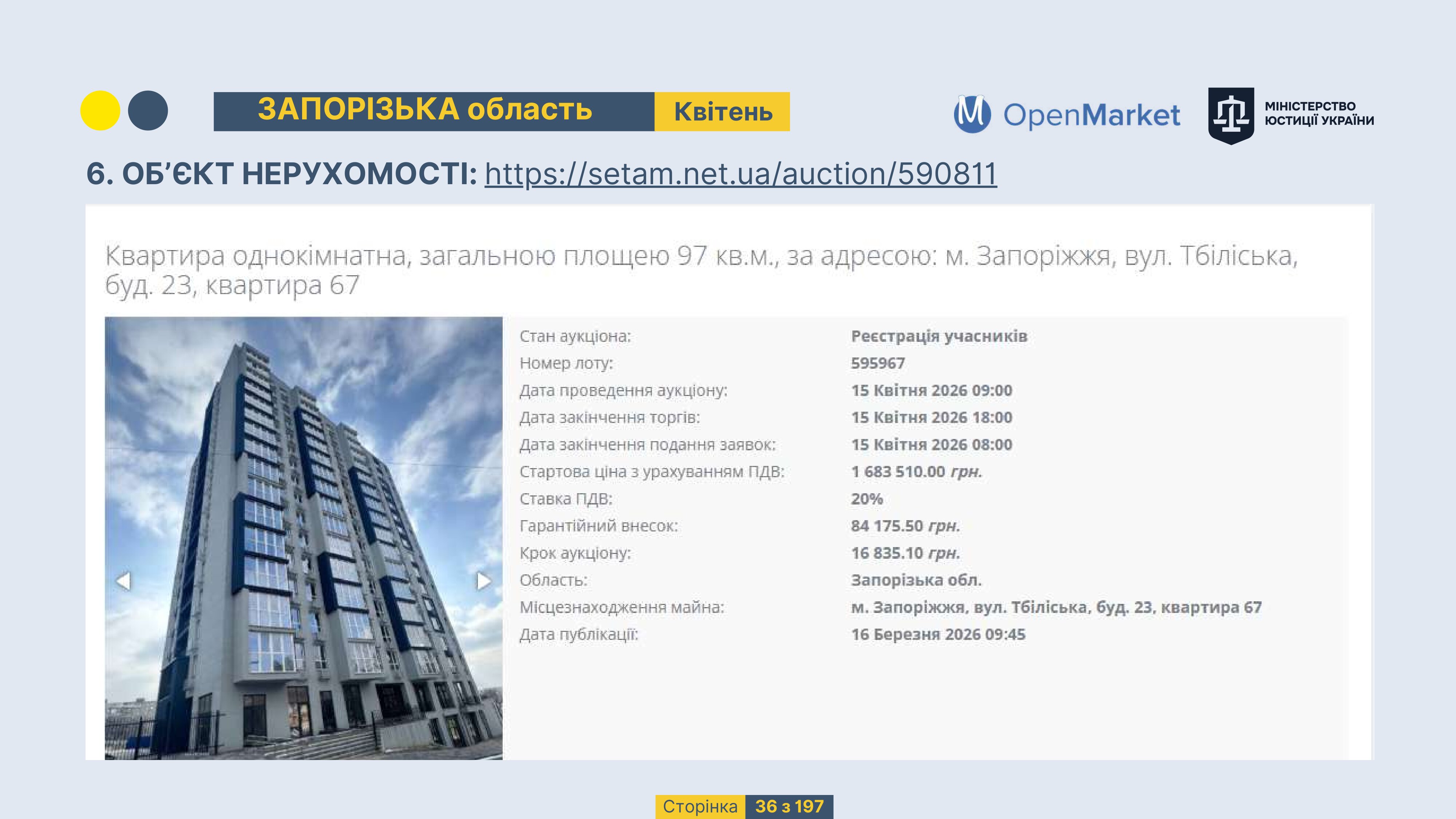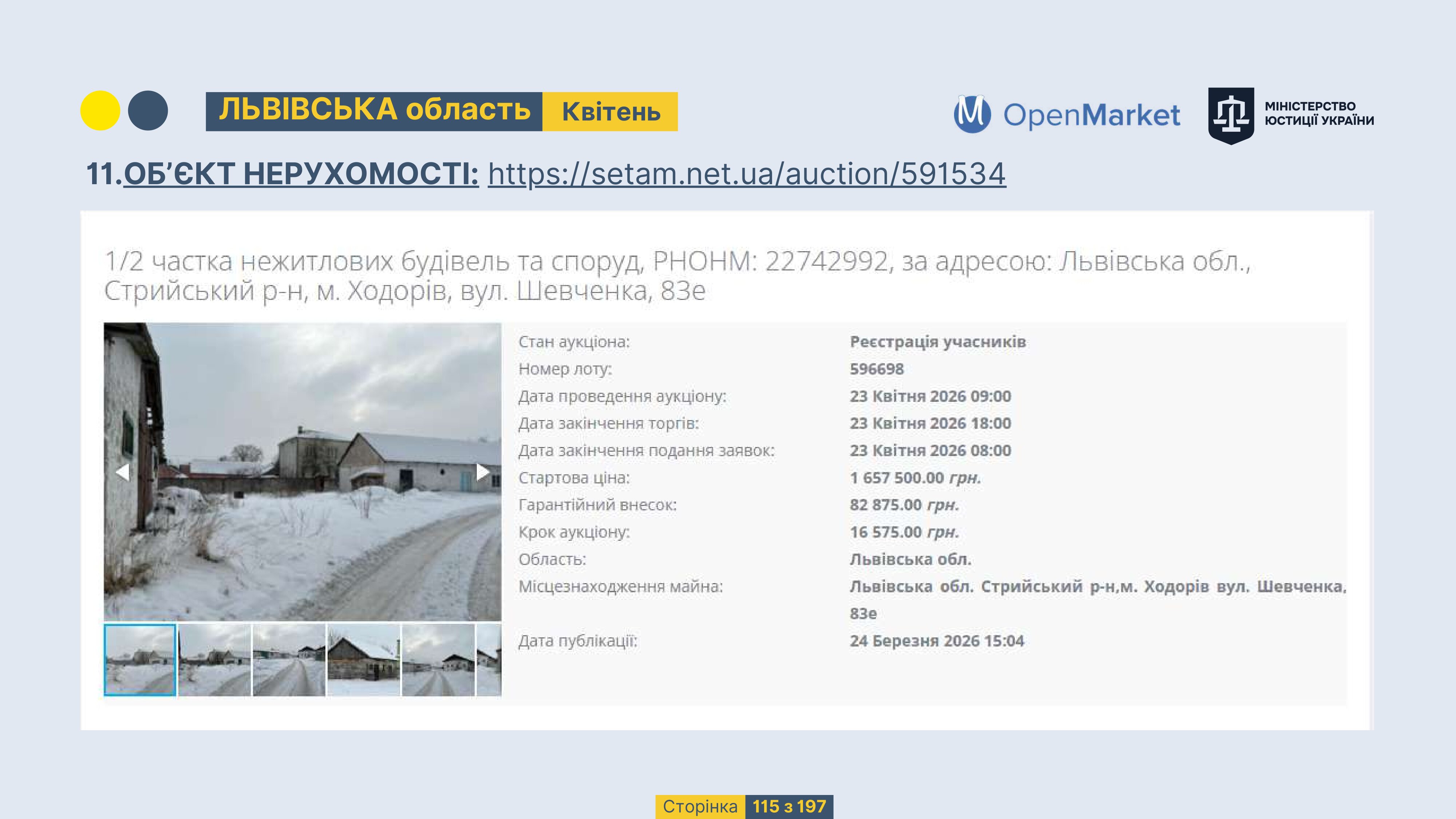 Державне підприємство «СЕТАМ» Міністерства юстиції України (далі - ДП «СЕТАМ»), повідомляє, що відповідно до Порядку реалізації арештованого майна, затвердженого наказом Міністерства юстиції України 29.09.2016 №2831/5, зареєстрованим в Міністерстві юстиції України 30.09.2016 за №1301/29431 (далі - Порядок реалізації), відповідно до частини другої та четвертої статті 61 Закону України від 02.06.2016 «Про виконавче провадження» через державну електронну аукціонну платформу OpenMarket ДП «СЕТАМ» у поточному місяці 2026 року оголошено проведення низки електронних аукціонів («Інвестиційний дайджест №3», що додається).
