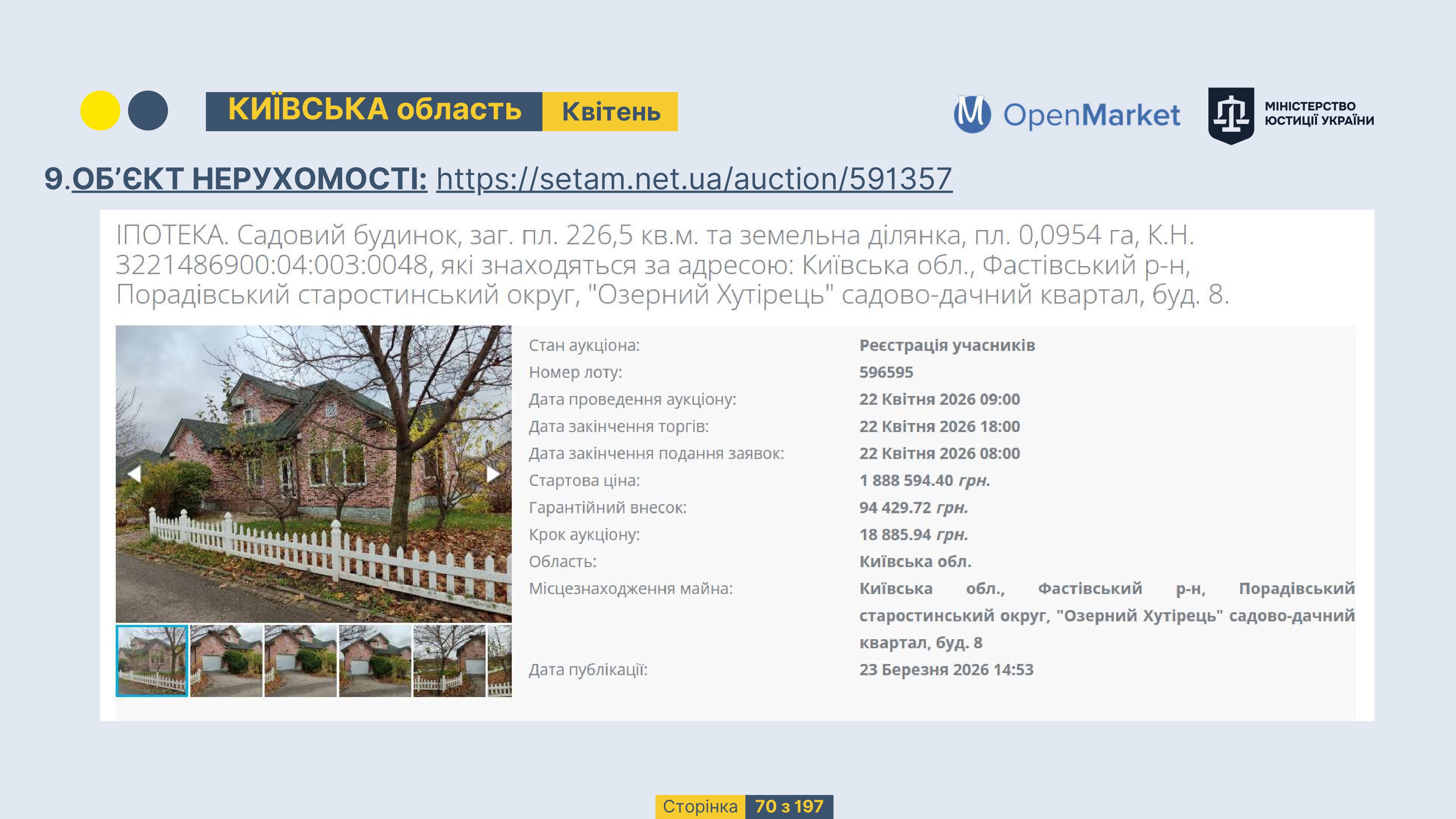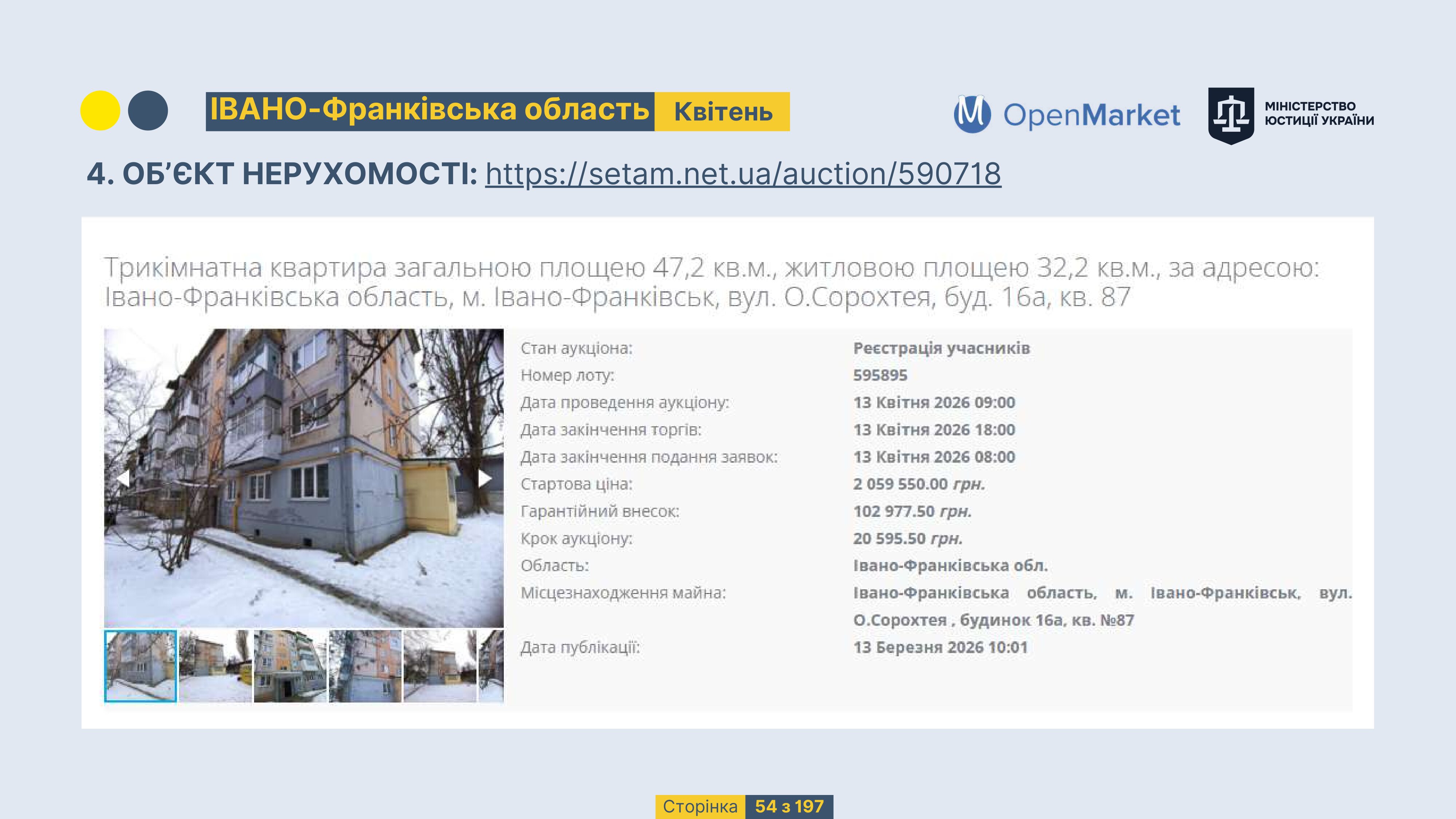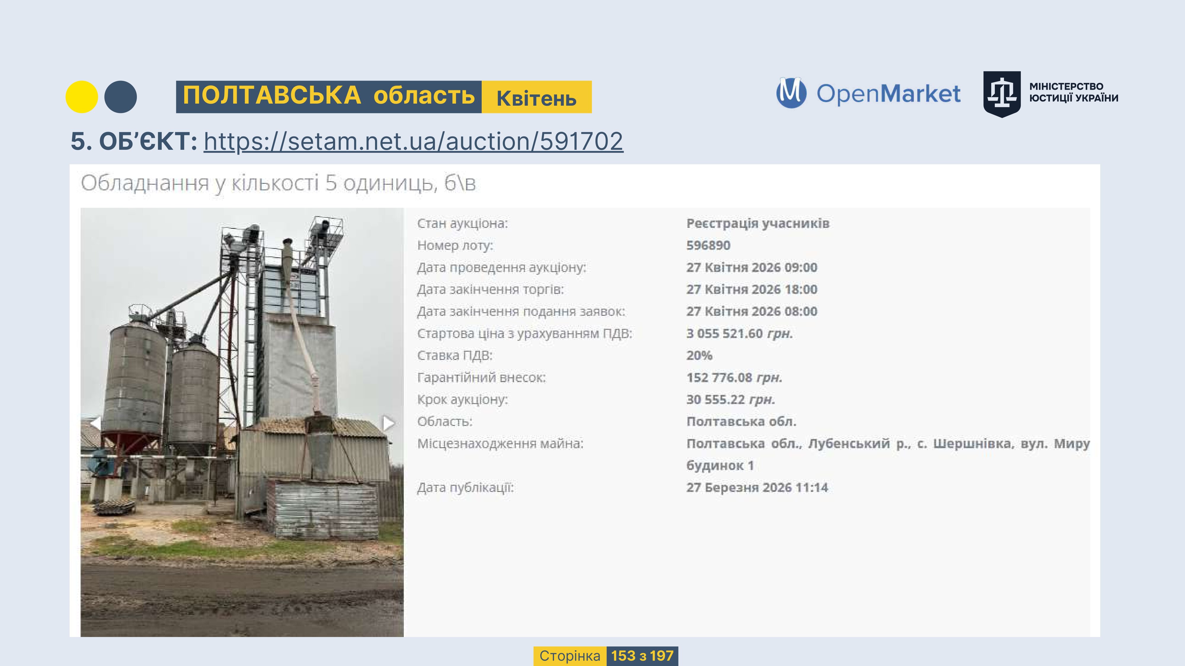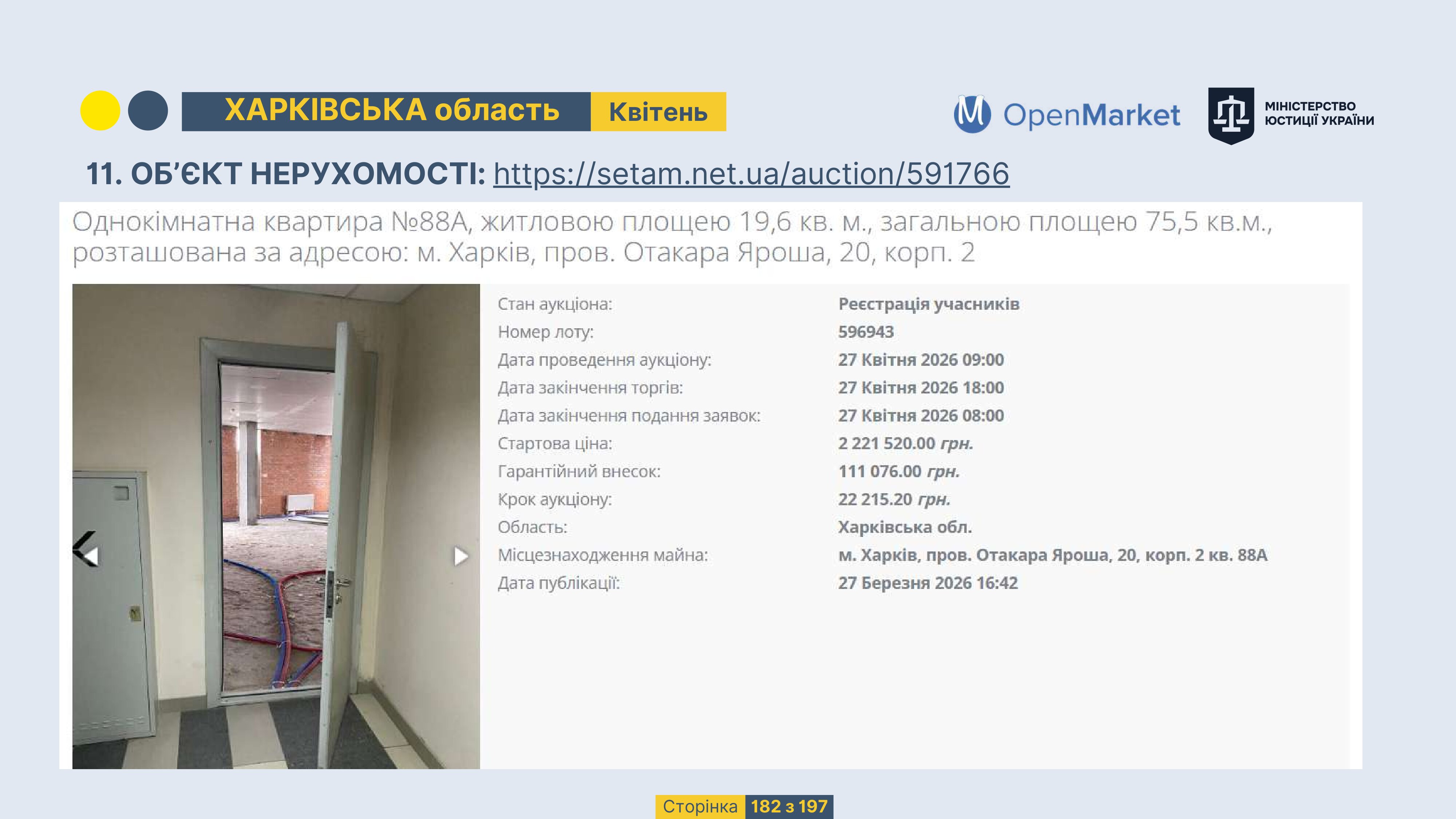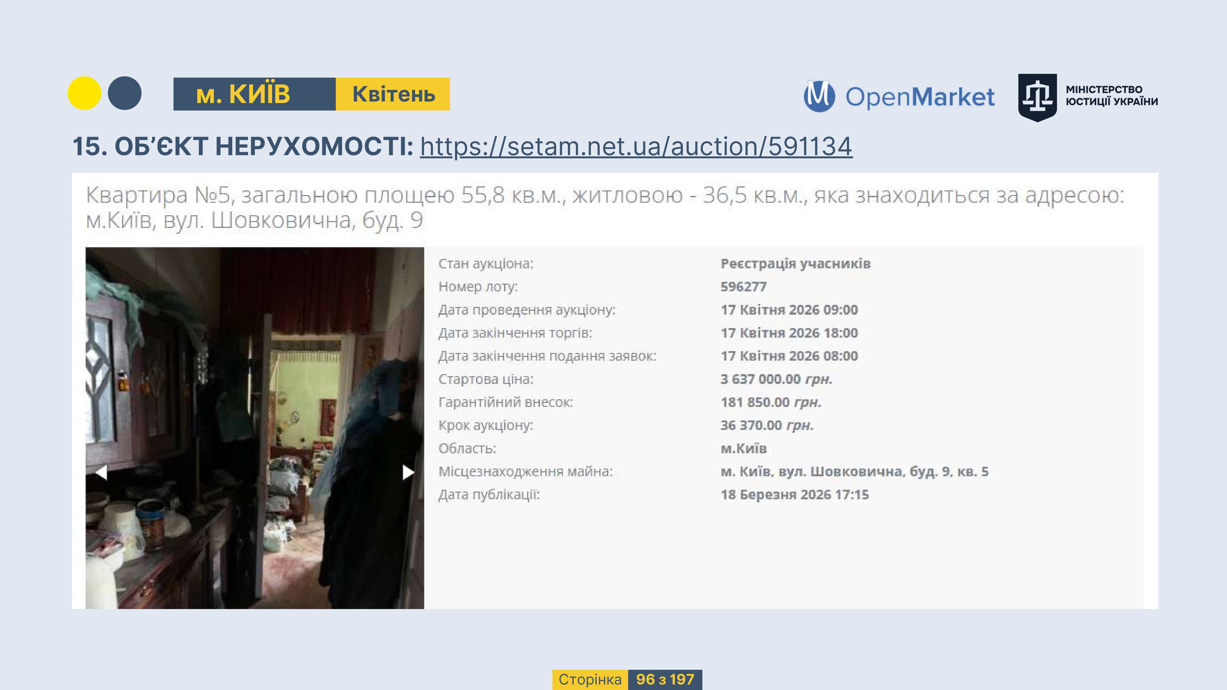 Державне підприємство «СЕТАМ» Міністерства юстиції України (далі - ДП «СЕТАМ»), повідомляє, що відповідно до Порядку реалізації арештованого майна, затвердженого наказом Міністерства юстиції України 29.09.2016 №2831/5, зареєстрованим в Міністерстві юстиції України 30.09.2016 за №1301/29431 (далі - Порядок реалізації), відповідно до частини другої та четвертої статті 61 Закону України від 02.06.2016 «Про виконавче провадження» через державну електронну аукціонну платформу OpenMarket ДП «СЕТАМ» у поточному місяці 2026 року оголошено проведення низки електронних аукціонів («Інвестиційний дайджест №3», що додається).