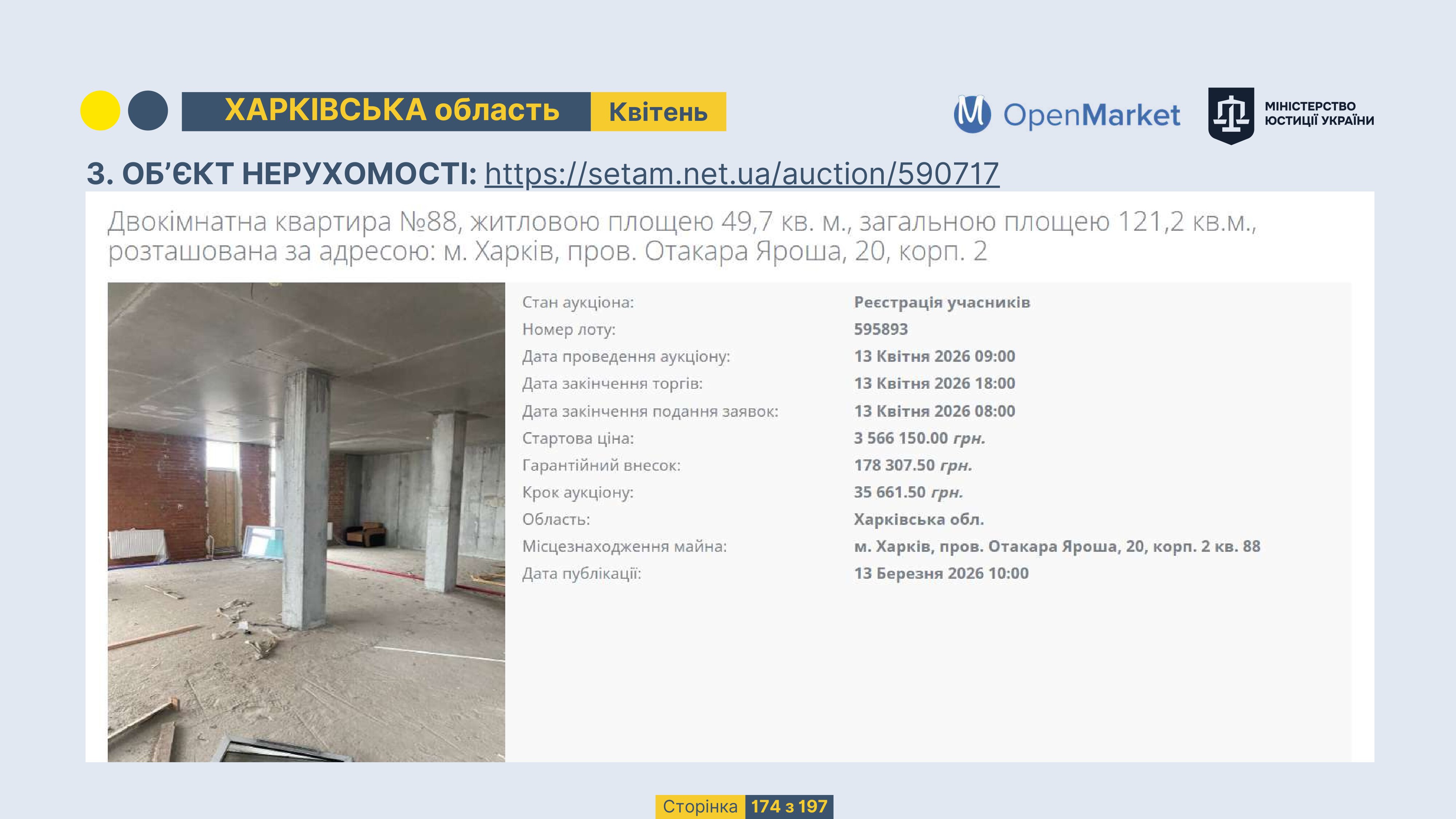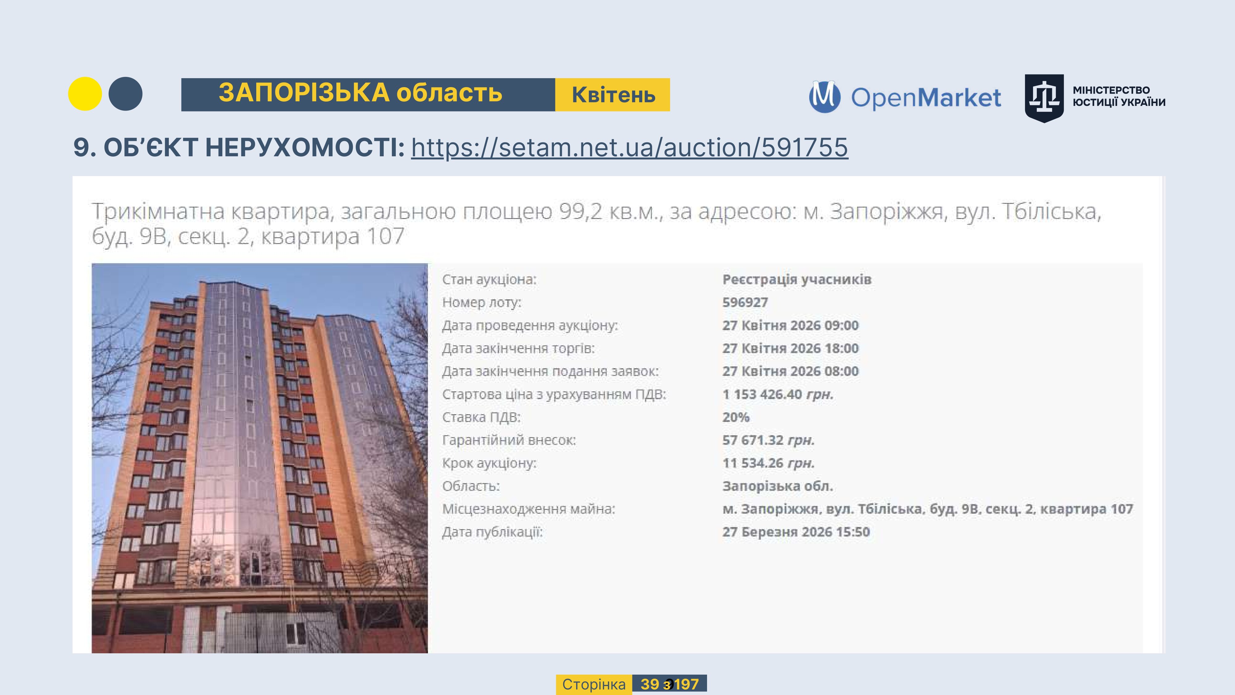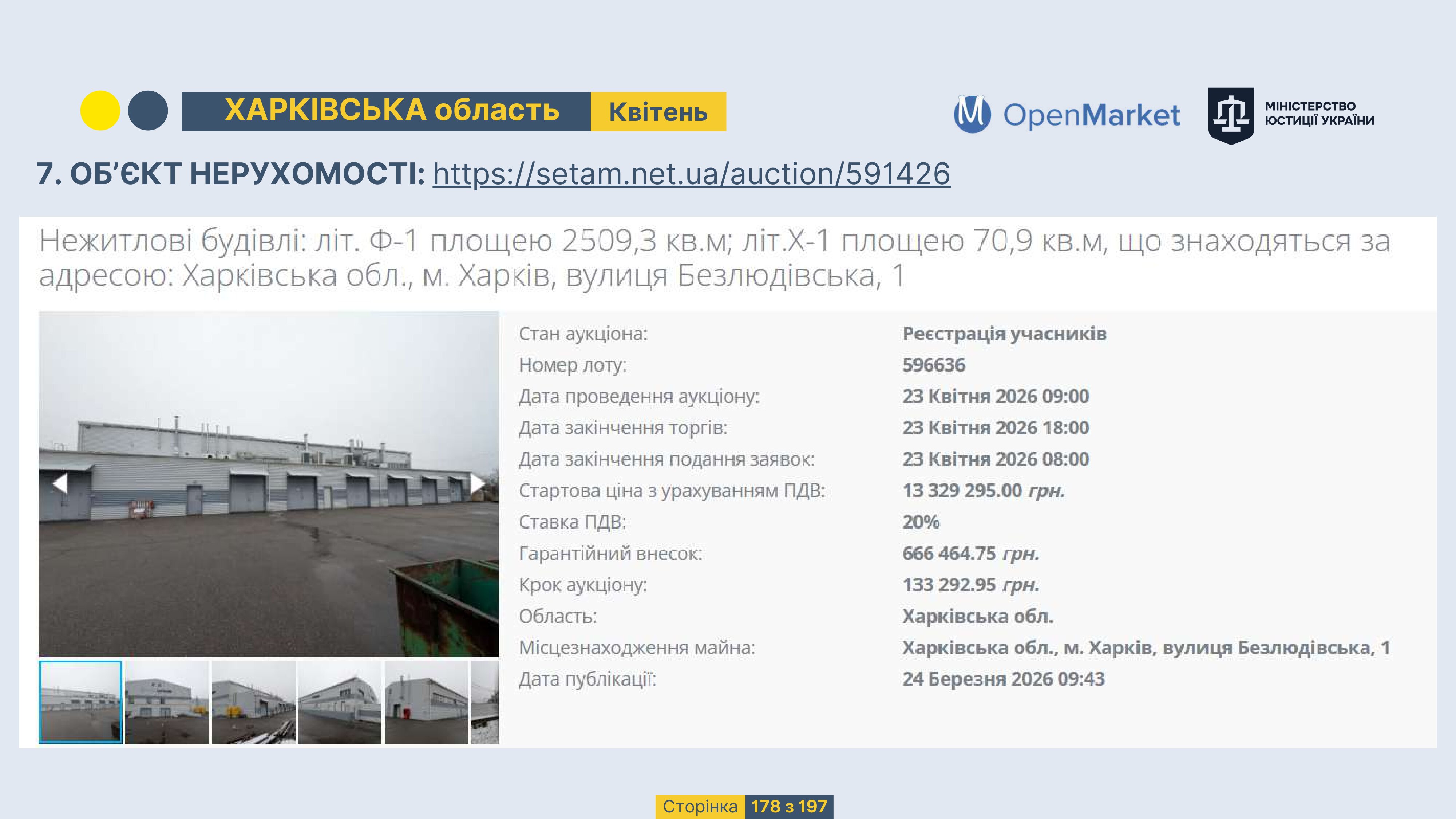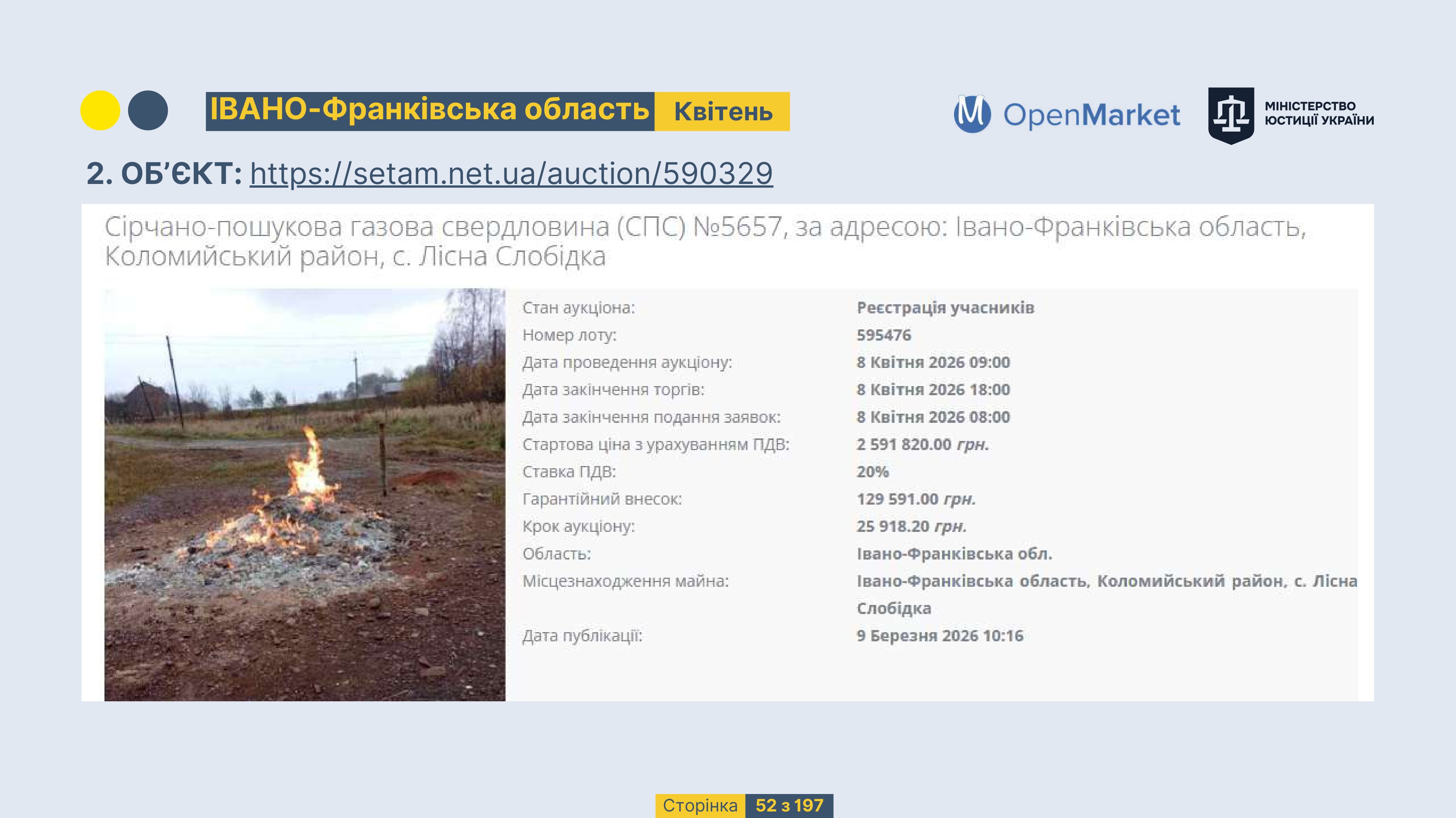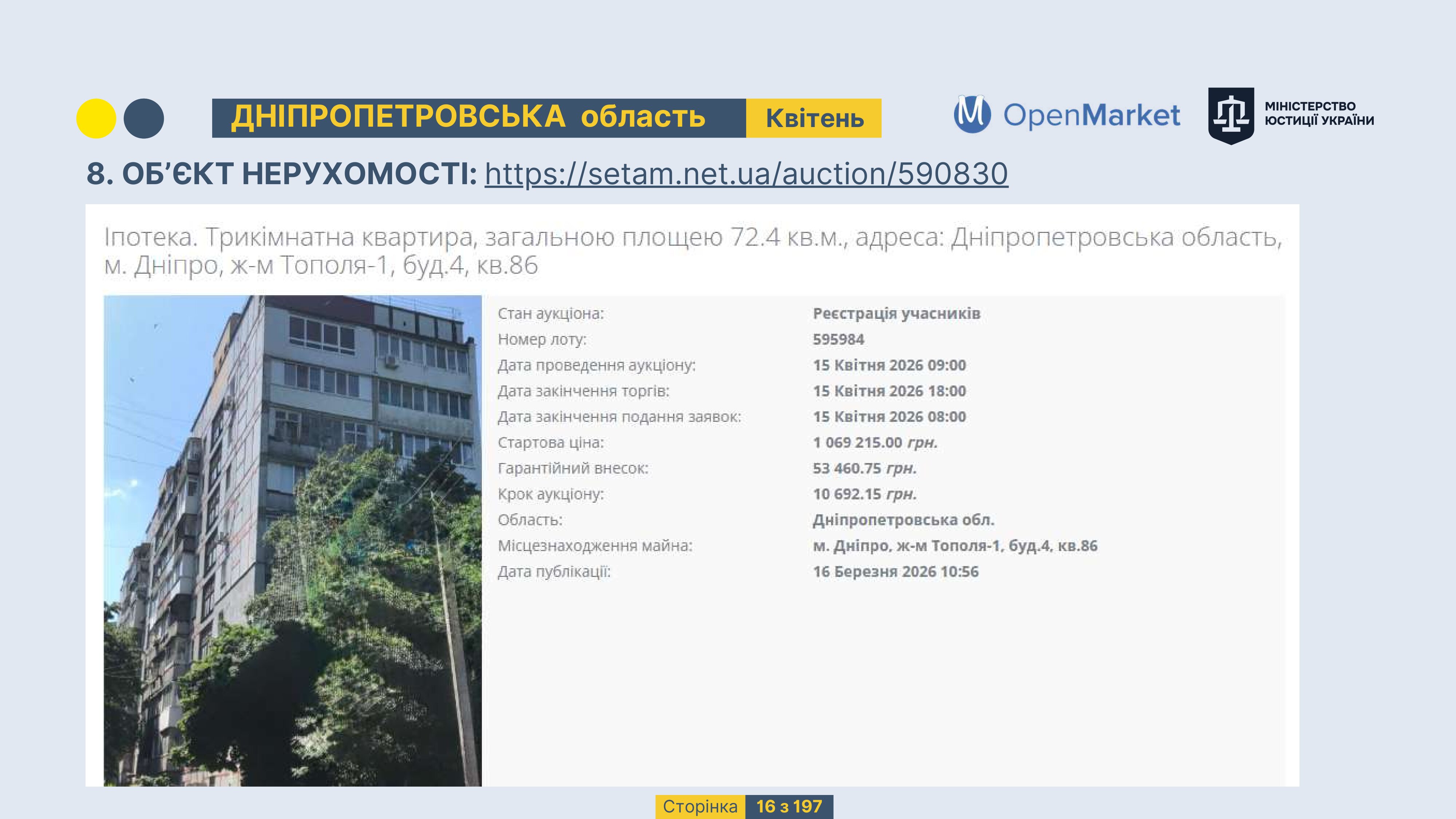 Державне підприємство «СЕТАМ» Міністерства юстиції України (далі - ДП «СЕТАМ»), повідомляє, що відповідно до Порядку реалізації арештованого майна, затвердженого наказом Міністерства юстиції України 29.09.2016 №2831/5, зареєстрованим в Міністерстві юстиції України 30.09.2016 за №1301/29431 (далі - Порядок реалізації), відповідно до частини другої та четвертої статті 61 Закону України від 02.06.2016 «Про виконавче провадження» через державну електронну аукціонну платформу OpenMarket ДП «СЕТАМ» у поточному місяці 2026 року оголошено проведення низки електронних аукціонів («Інвестиційний дайджест №3», що додається).