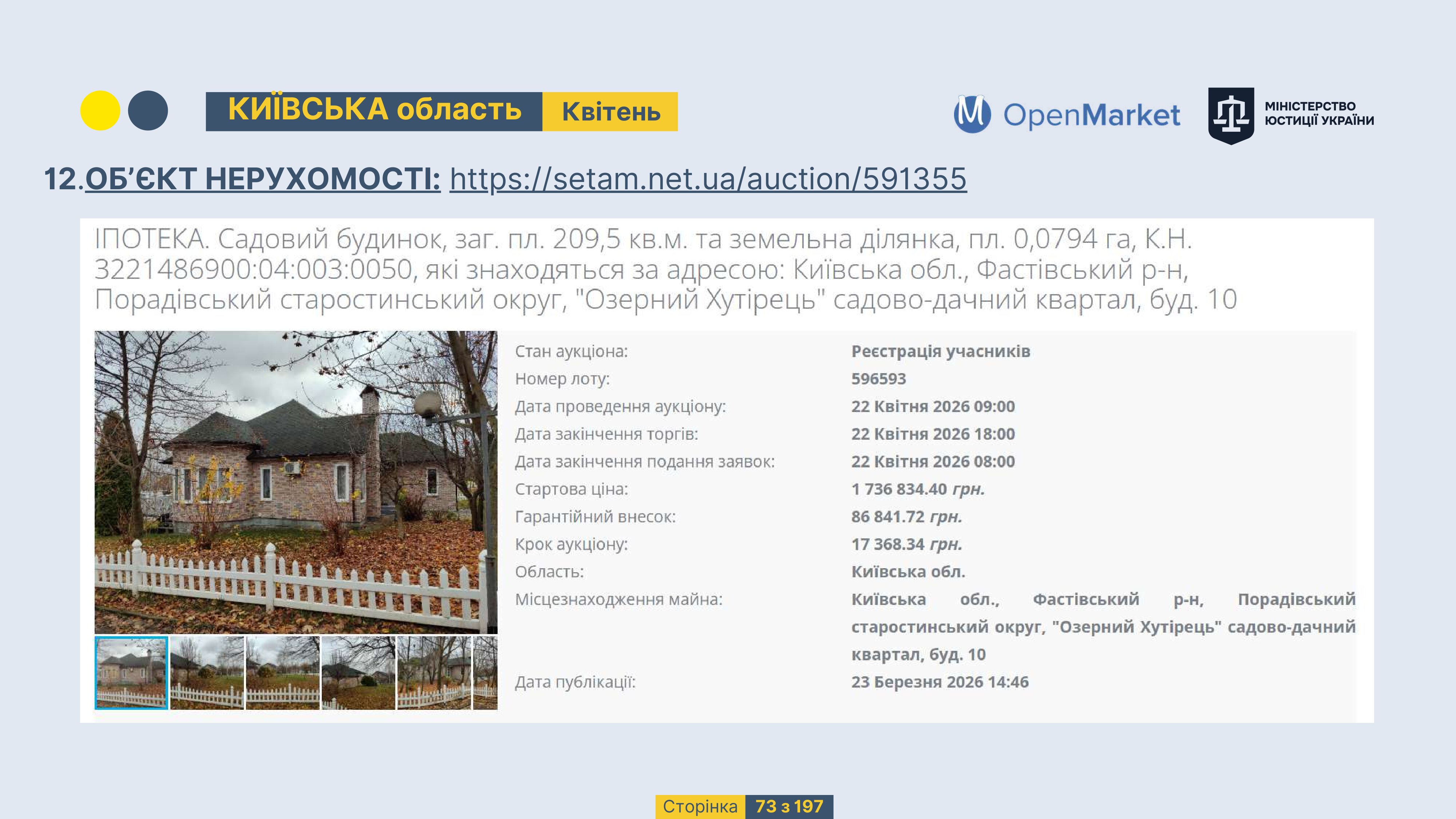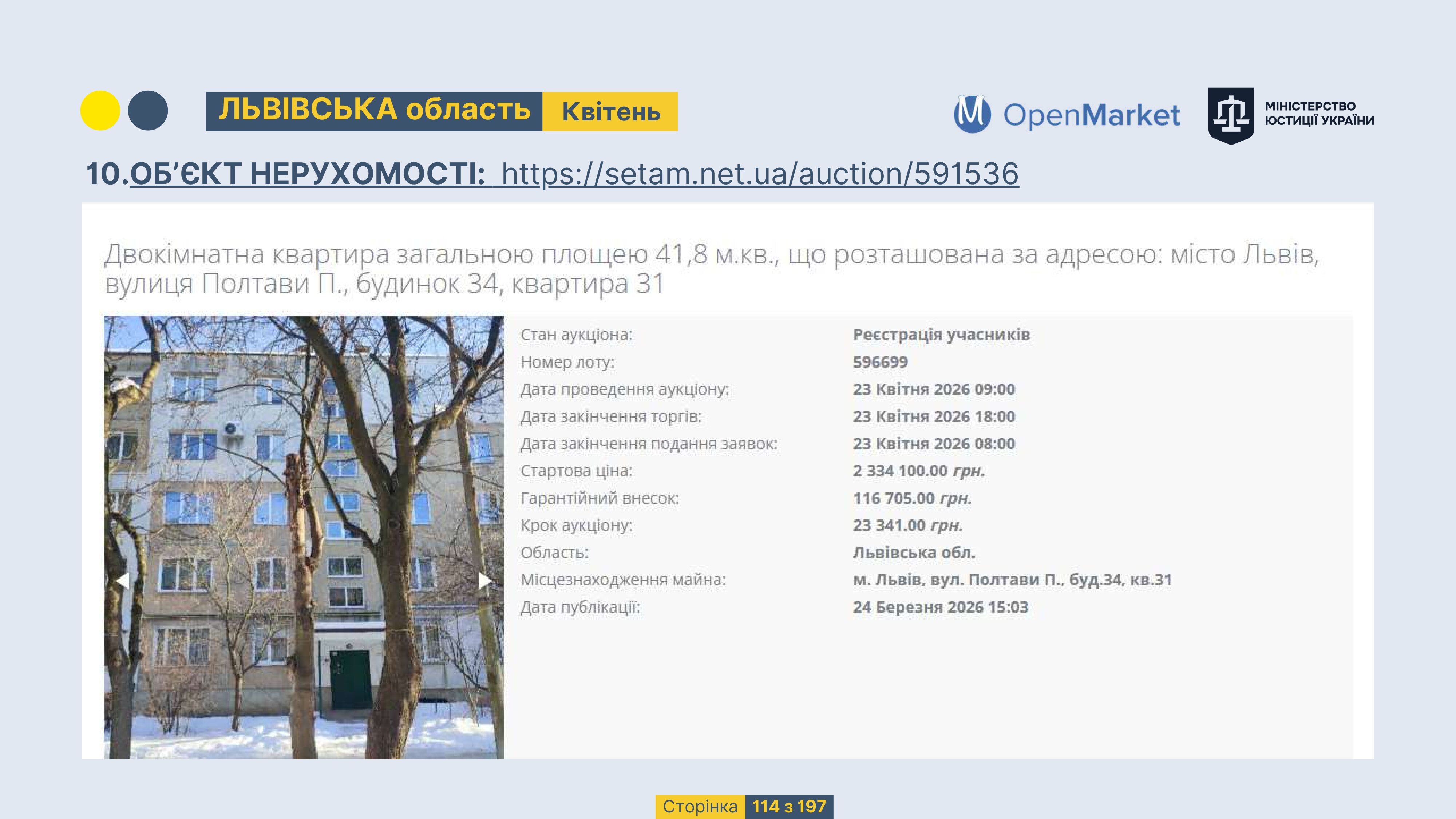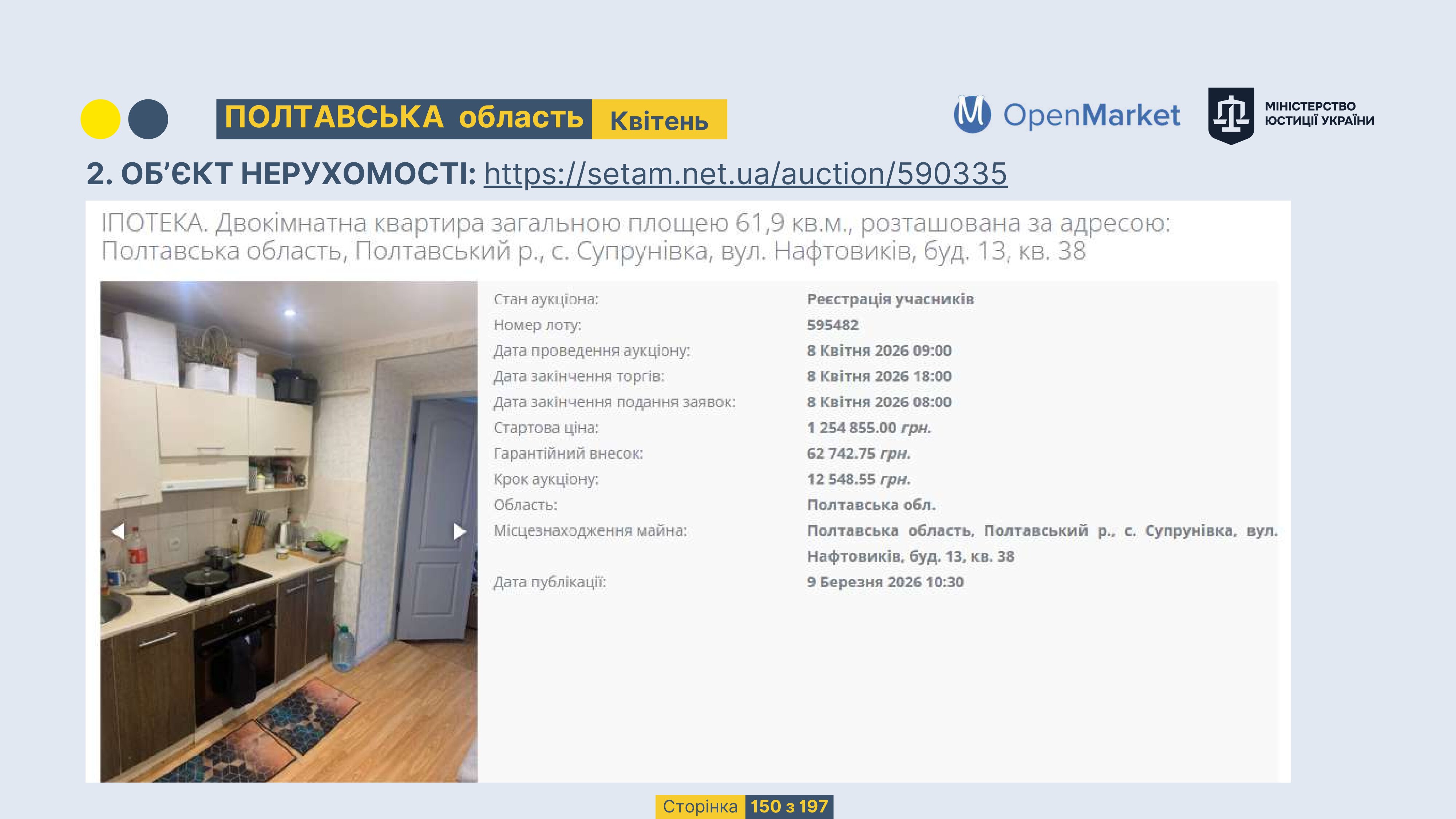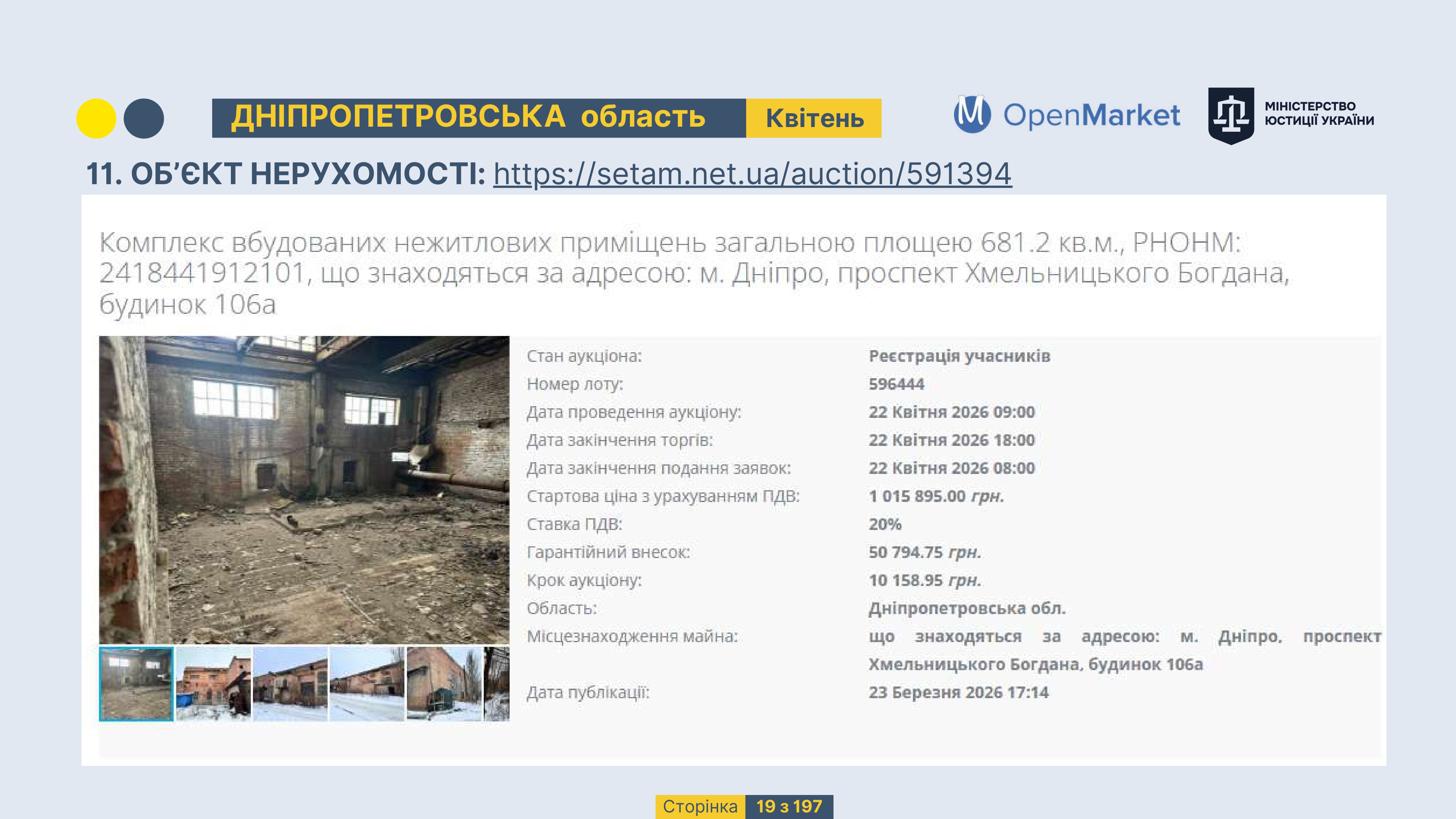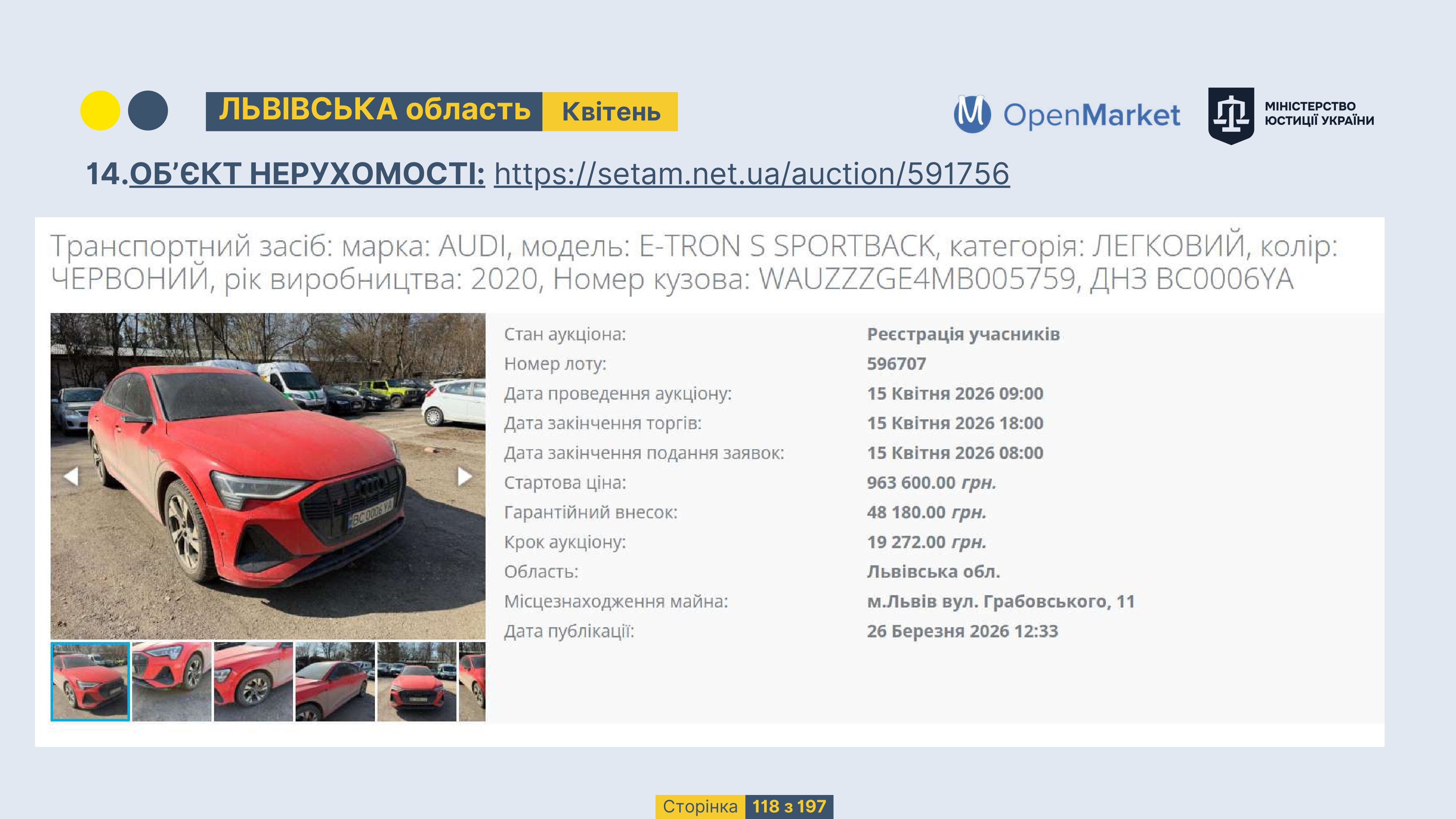 Державне підприємство «СЕТАМ» Міністерства юстиції України (далі - ДП «СЕТАМ»), повідомляє, що відповідно до Порядку реалізації арештованого майна, затвердженого наказом Міністерства юстиції України 29.09.2016 №2831/5, зареєстрованим в Міністерстві юстиції України 30.09.2016 за №1301/29431 (далі - Порядок реалізації), відповідно до частини другої та четвертої статті 61 Закону України від 02.06.2016 «Про виконавче провадження» через державну електронну аукціонну платформу OpenMarket ДП «СЕТАМ» у поточному місяці 2026 року оголошено проведення низки електронних аукціонів («Інвестиційний дайджест №3», що додається).