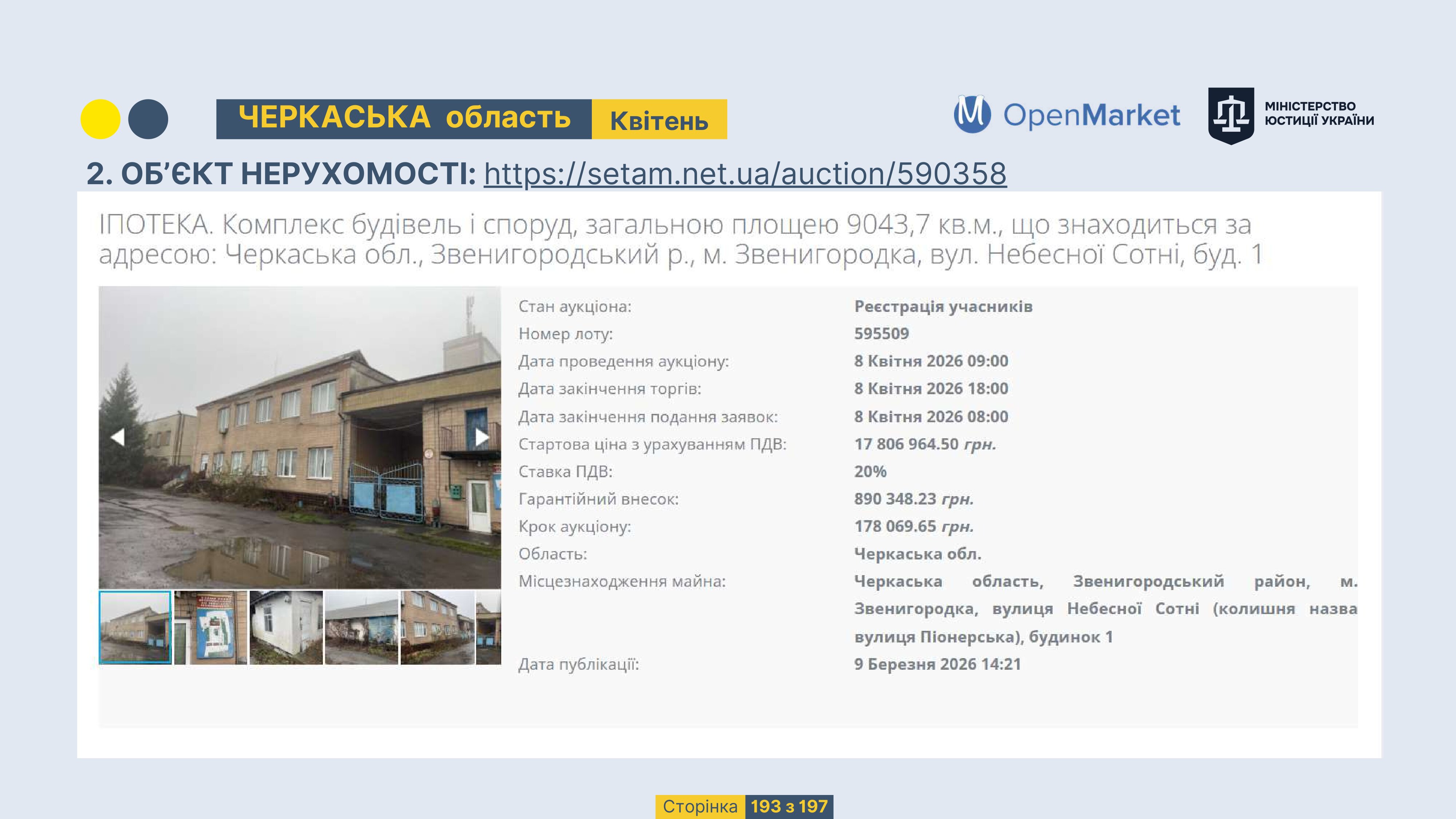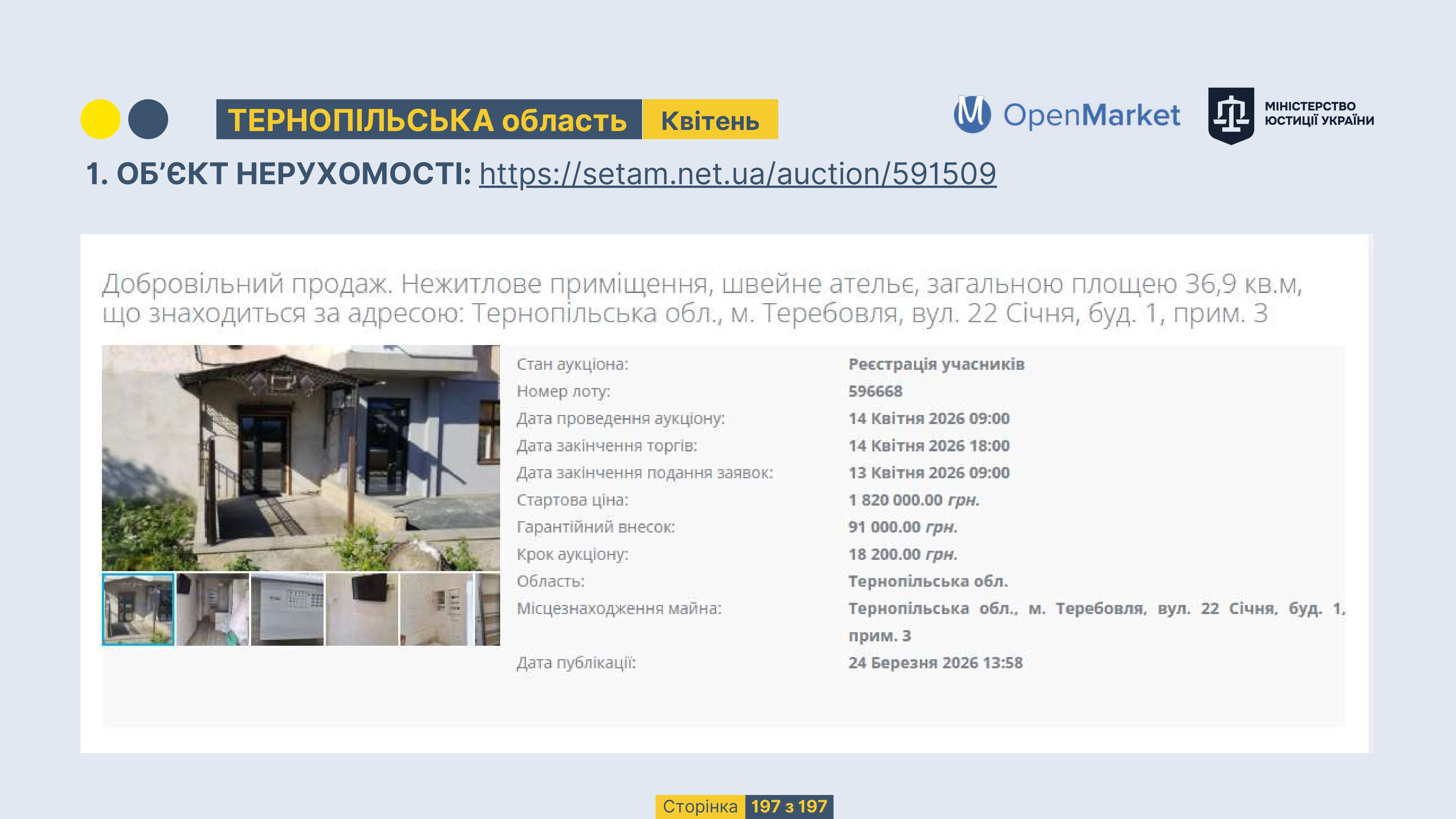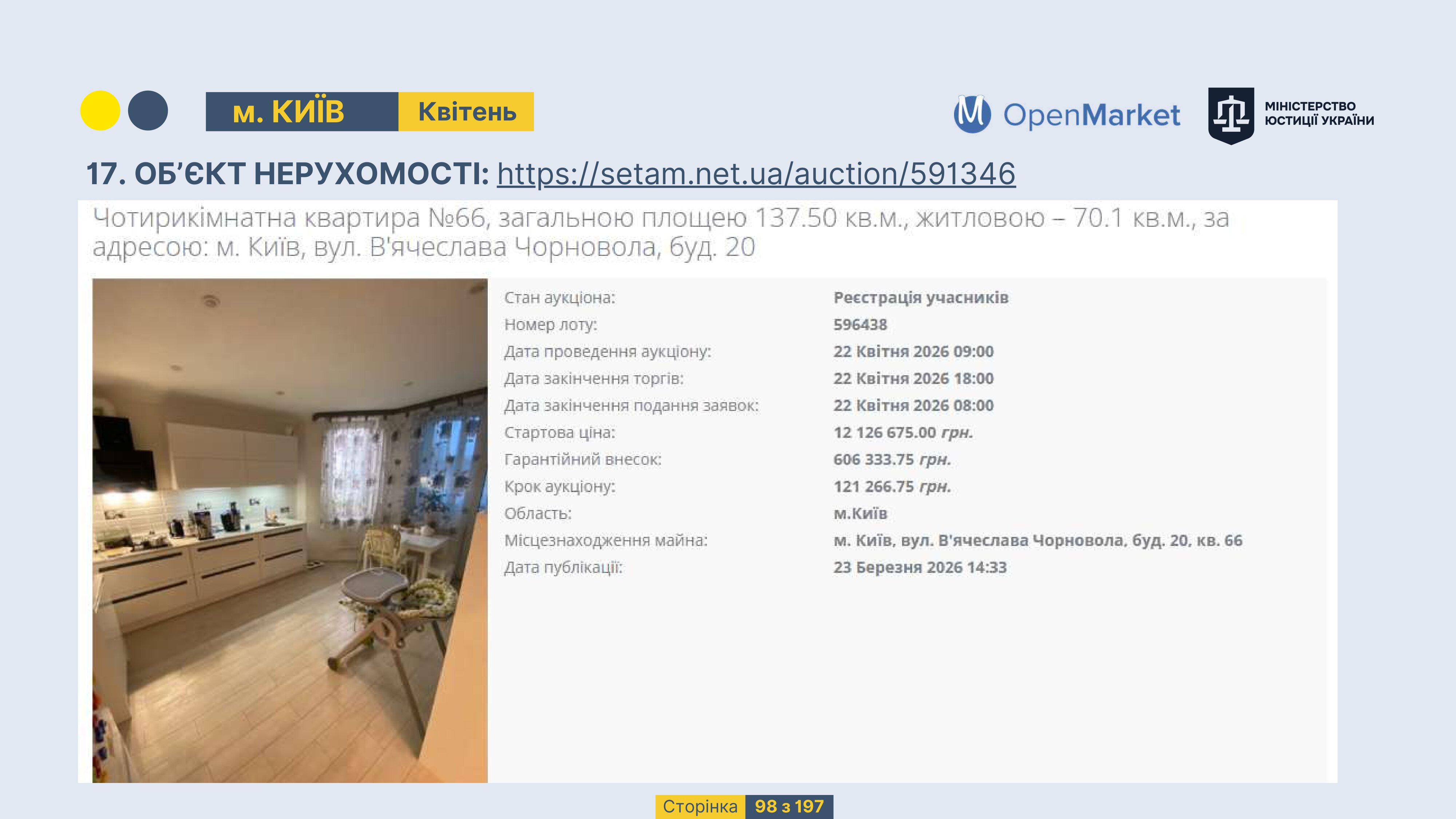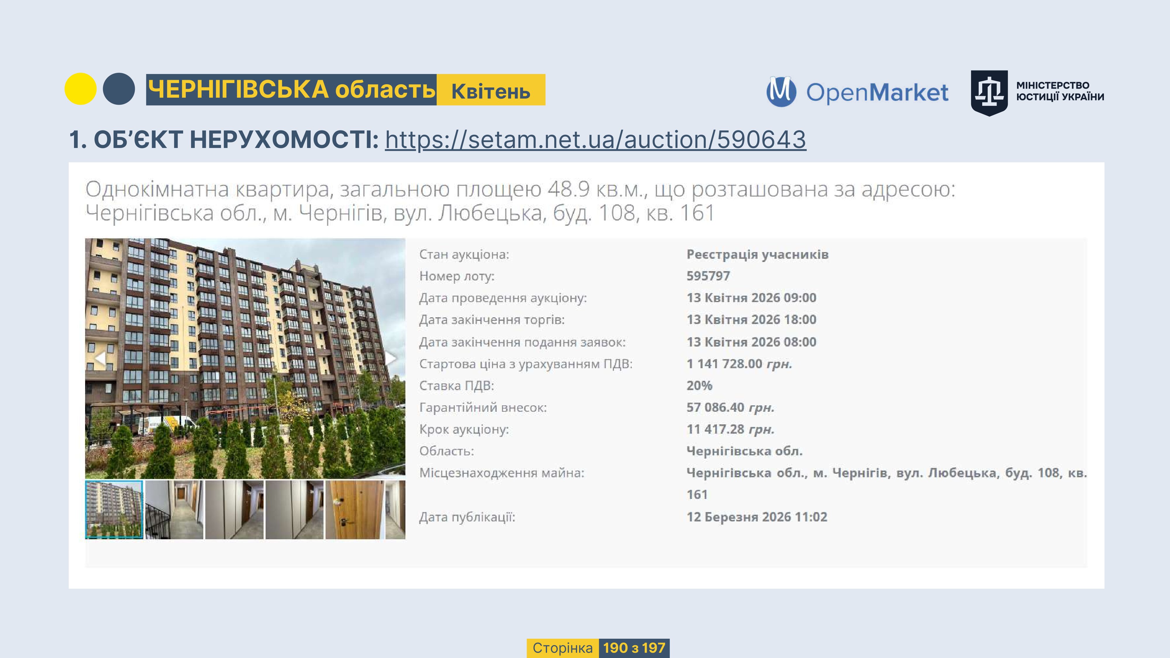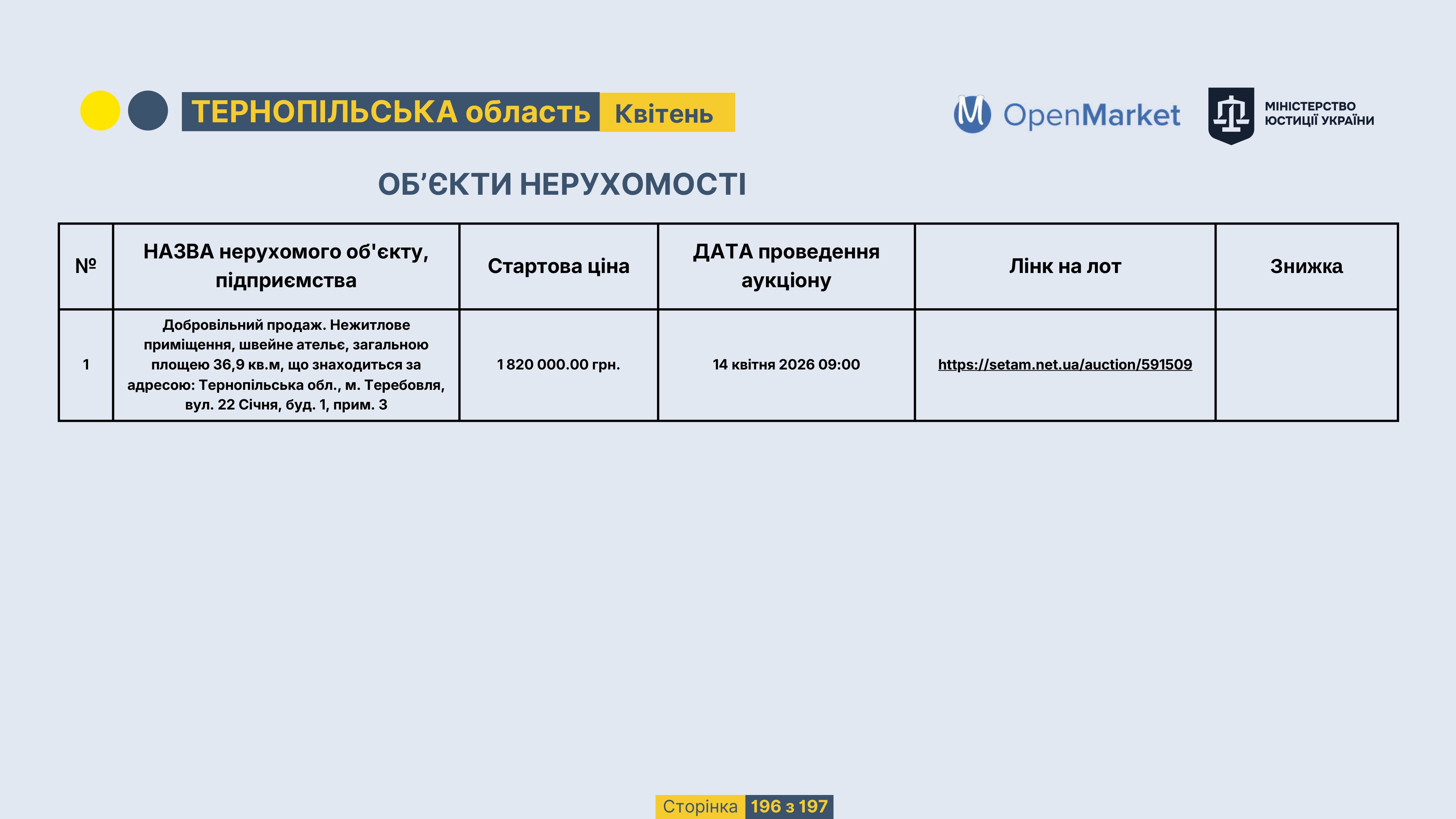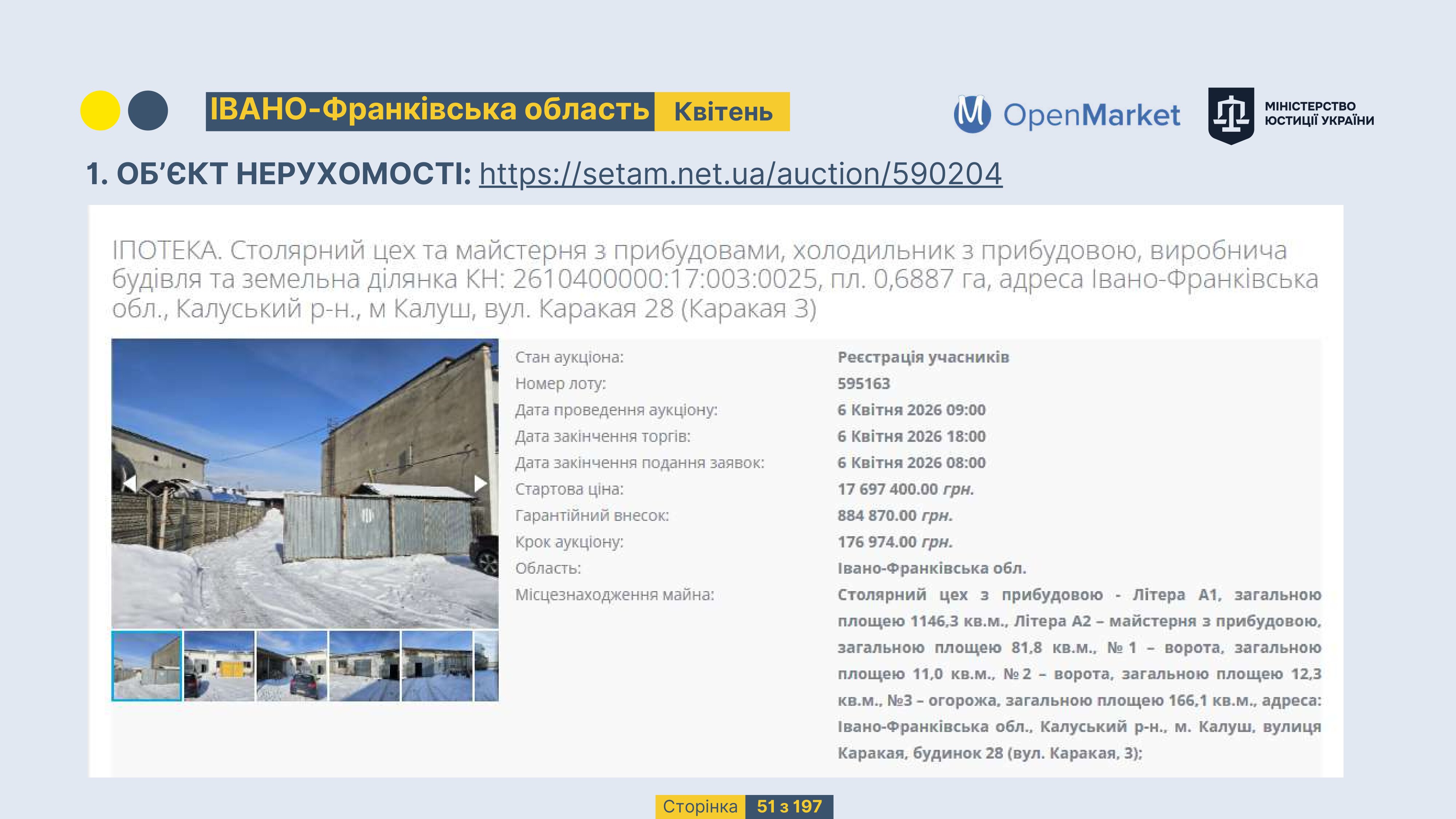 Державне підприємство «СЕТАМ» Міністерства юстиції України (далі - ДП «СЕТАМ»), повідомляє, що відповідно до Порядку реалізації арештованого майна, затвердженого наказом Міністерства юстиції України 29.09.2016 №2831/5, зареєстрованим в Міністерстві юстиції України 30.09.2016 за №1301/29431 (далі - Порядок реалізації), відповідно до частини другої та четвертої статті 61 Закону України від 02.06.2016 «Про виконавче провадження» через державну електронну аукціонну платформу OpenMarket ДП «СЕТАМ» у поточному місяці 2026 року оголошено проведення низки електронних аукціонів («Інвестиційний дайджест №3», що додається).