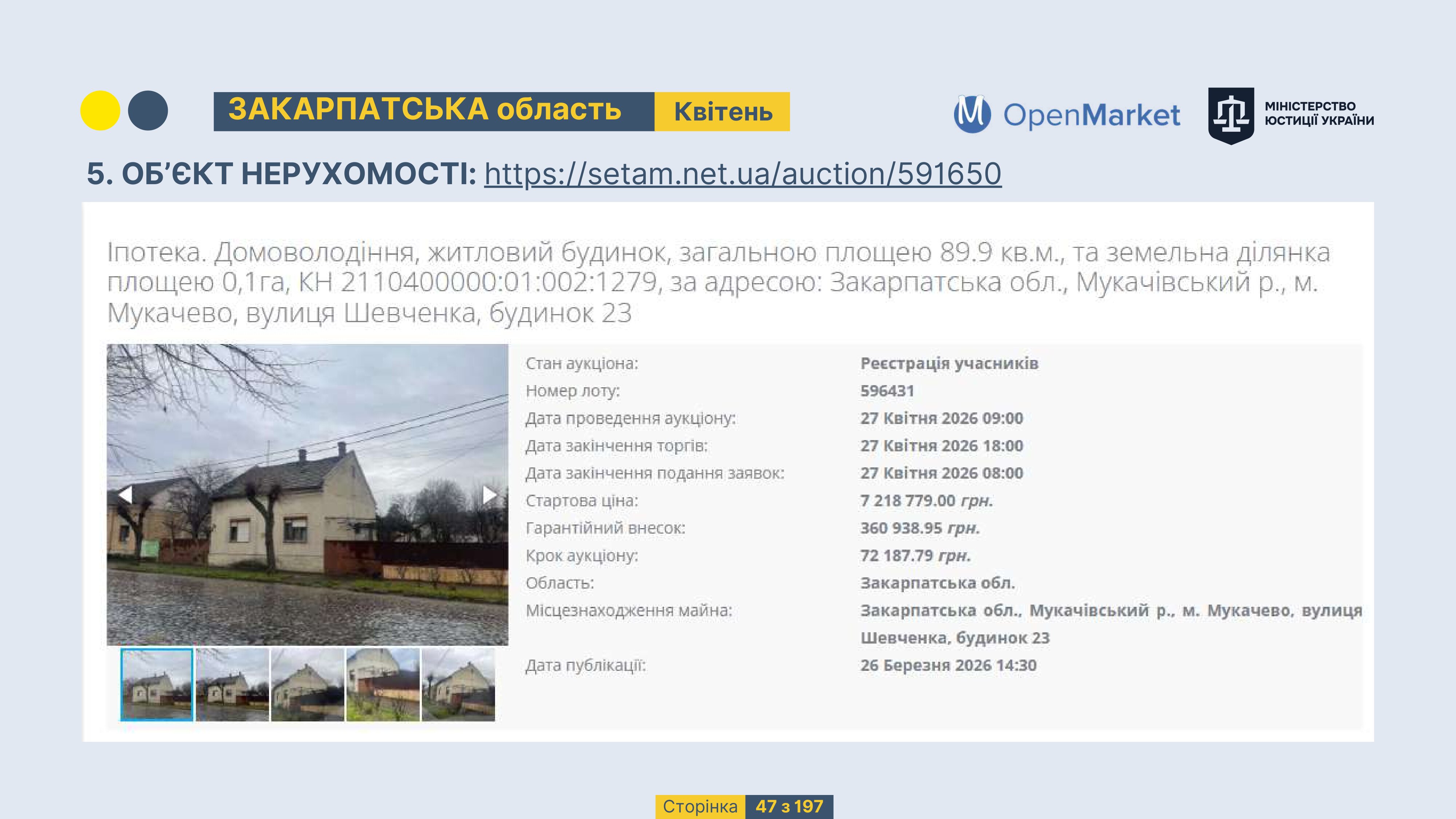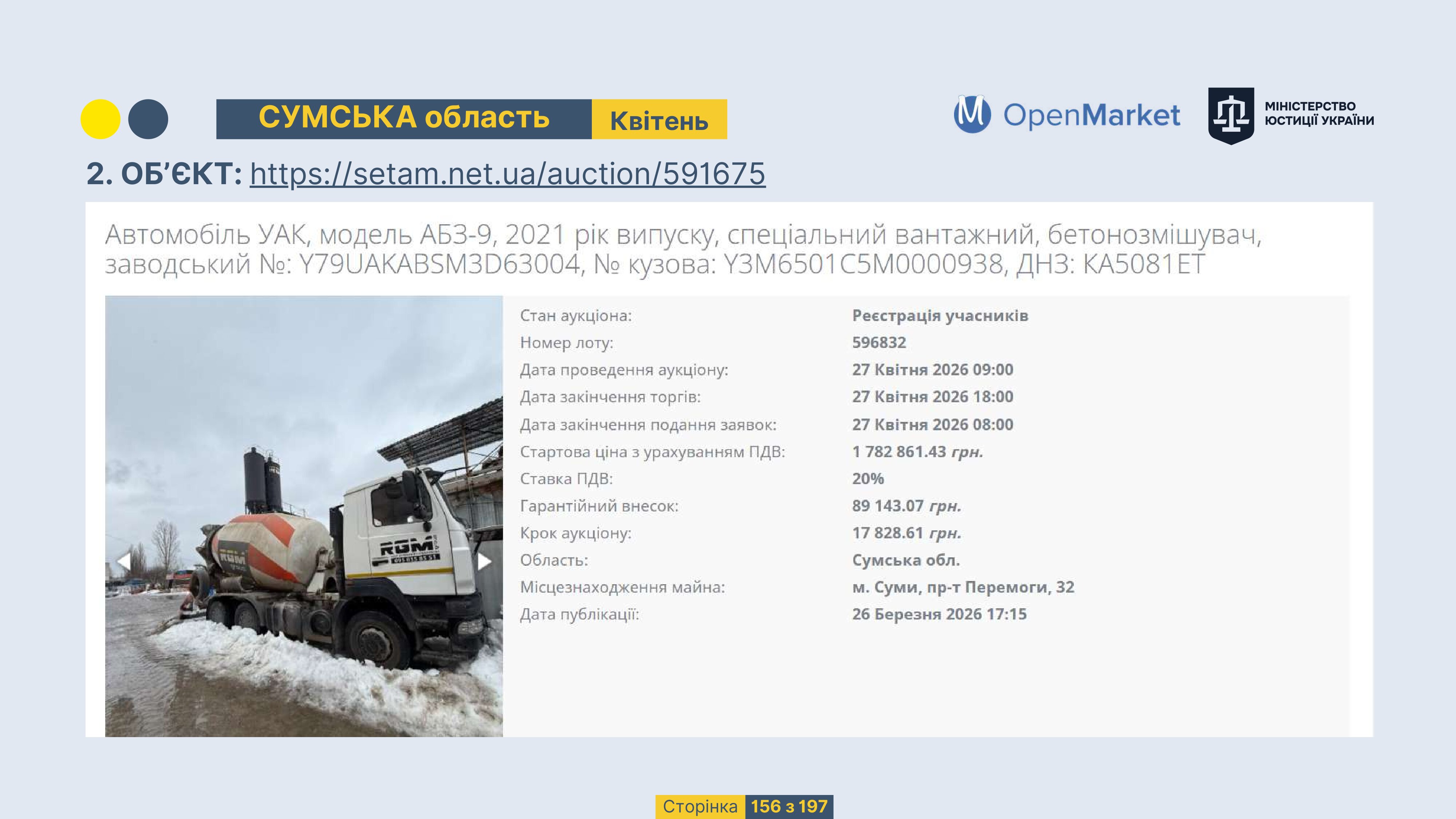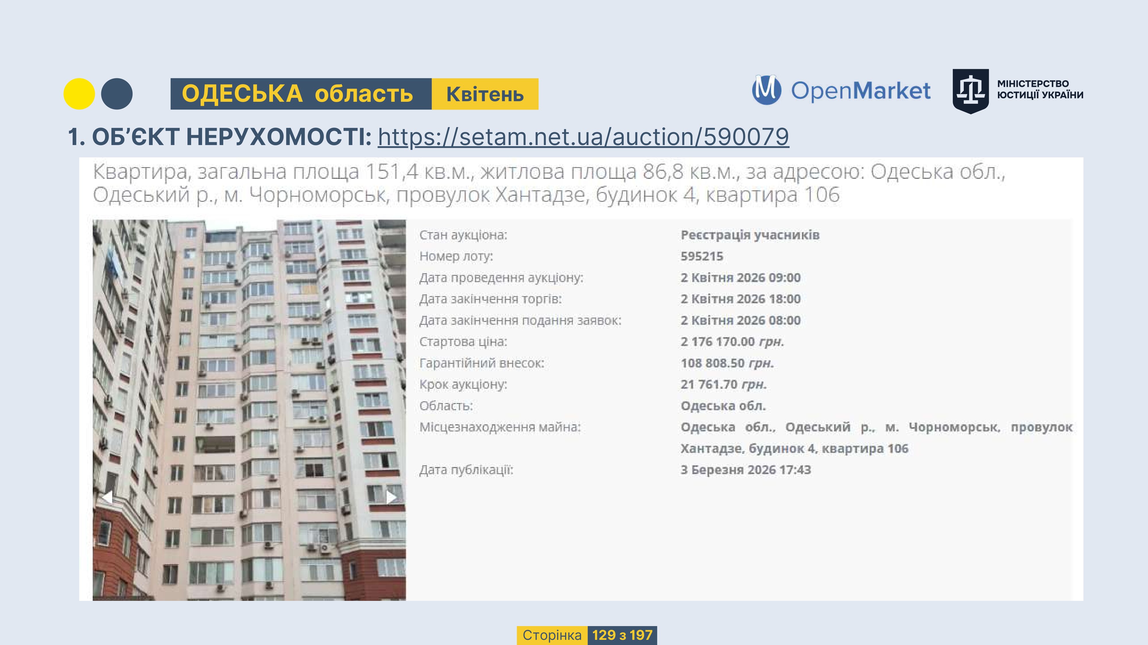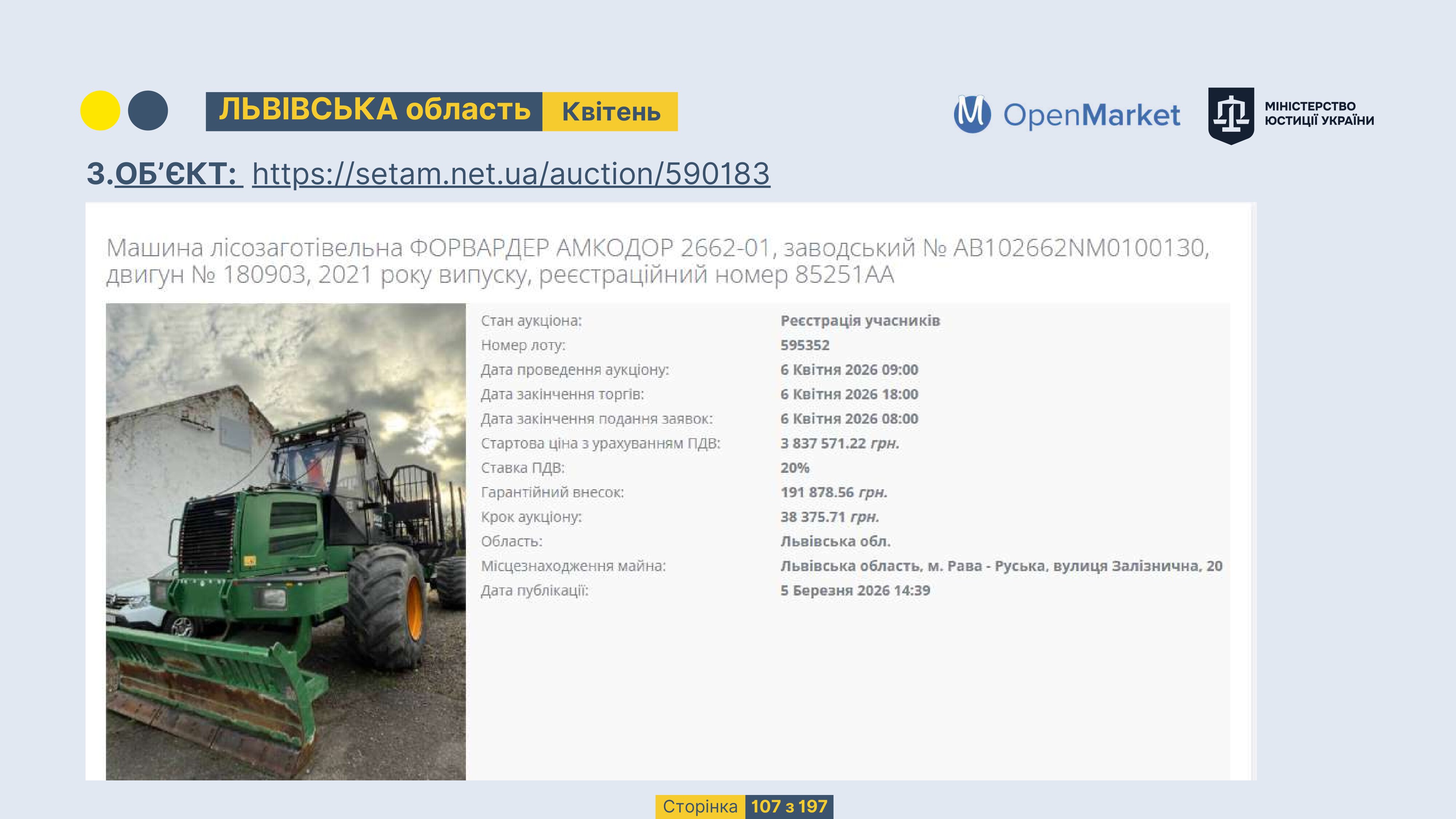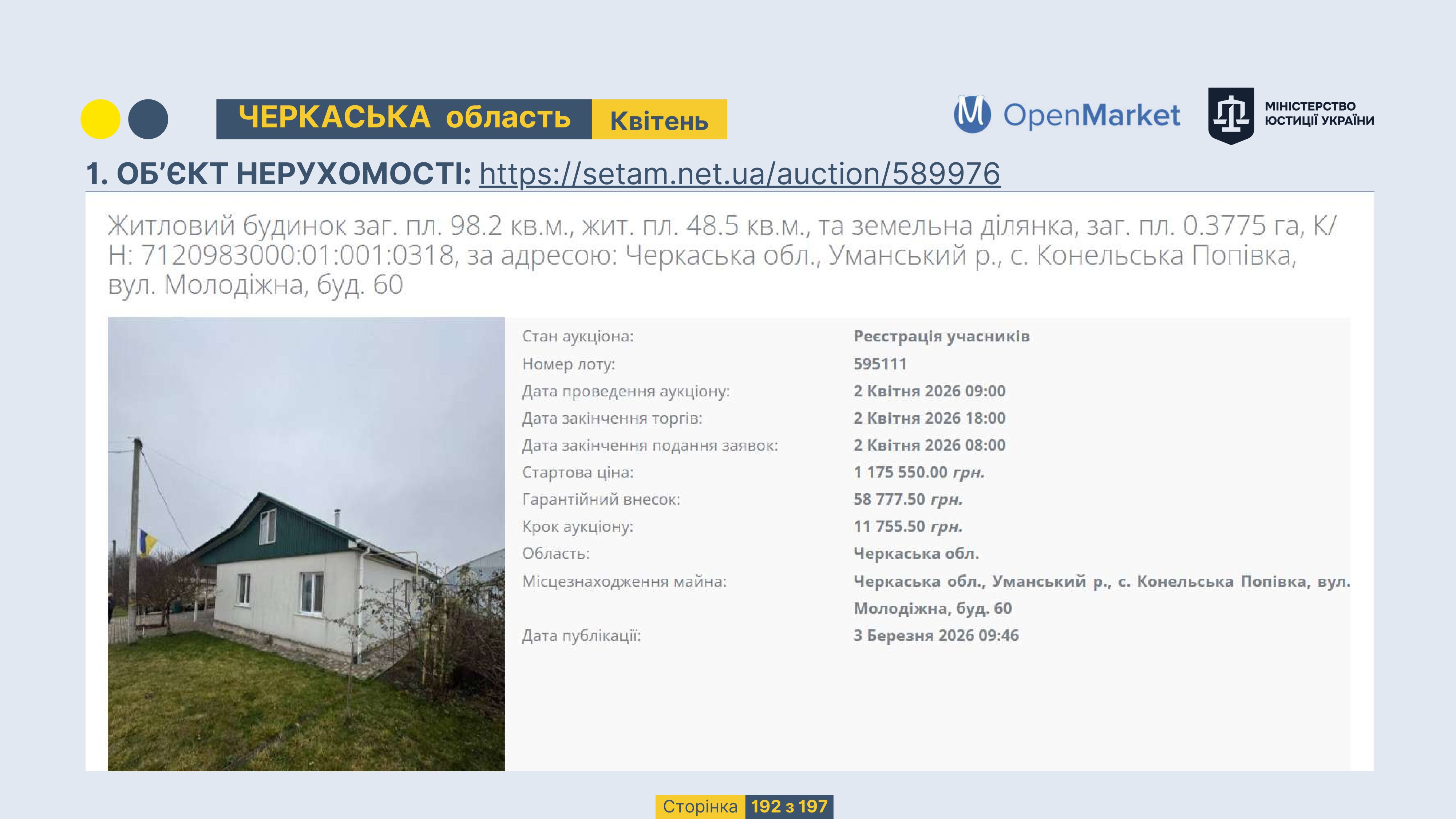 Державне підприємство «СЕТАМ» Міністерства юстиції України (далі - ДП «СЕТАМ»), повідомляє, що відповідно до Порядку реалізації арештованого майна, затвердженого наказом Міністерства юстиції України 29.09.2016 №2831/5, зареєстрованим в Міністерстві юстиції України 30.09.2016 за №1301/29431 (далі - Порядок реалізації), відповідно до частини другої та четвертої статті 61 Закону України від 02.06.2016 «Про виконавче провадження» через державну електронну аукціонну платформу OpenMarket ДП «СЕТАМ» у поточному місяці 2026 року оголошено проведення низки електронних аукціонів («Інвестиційний дайджест №3», що додається).