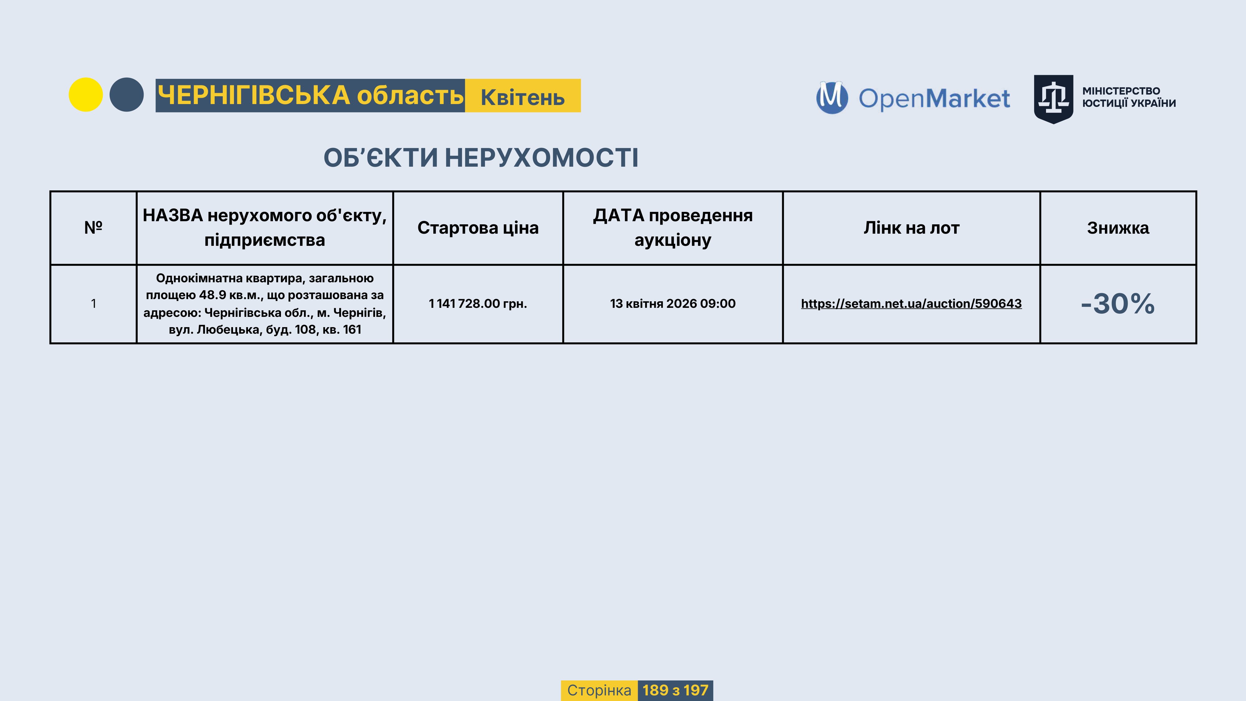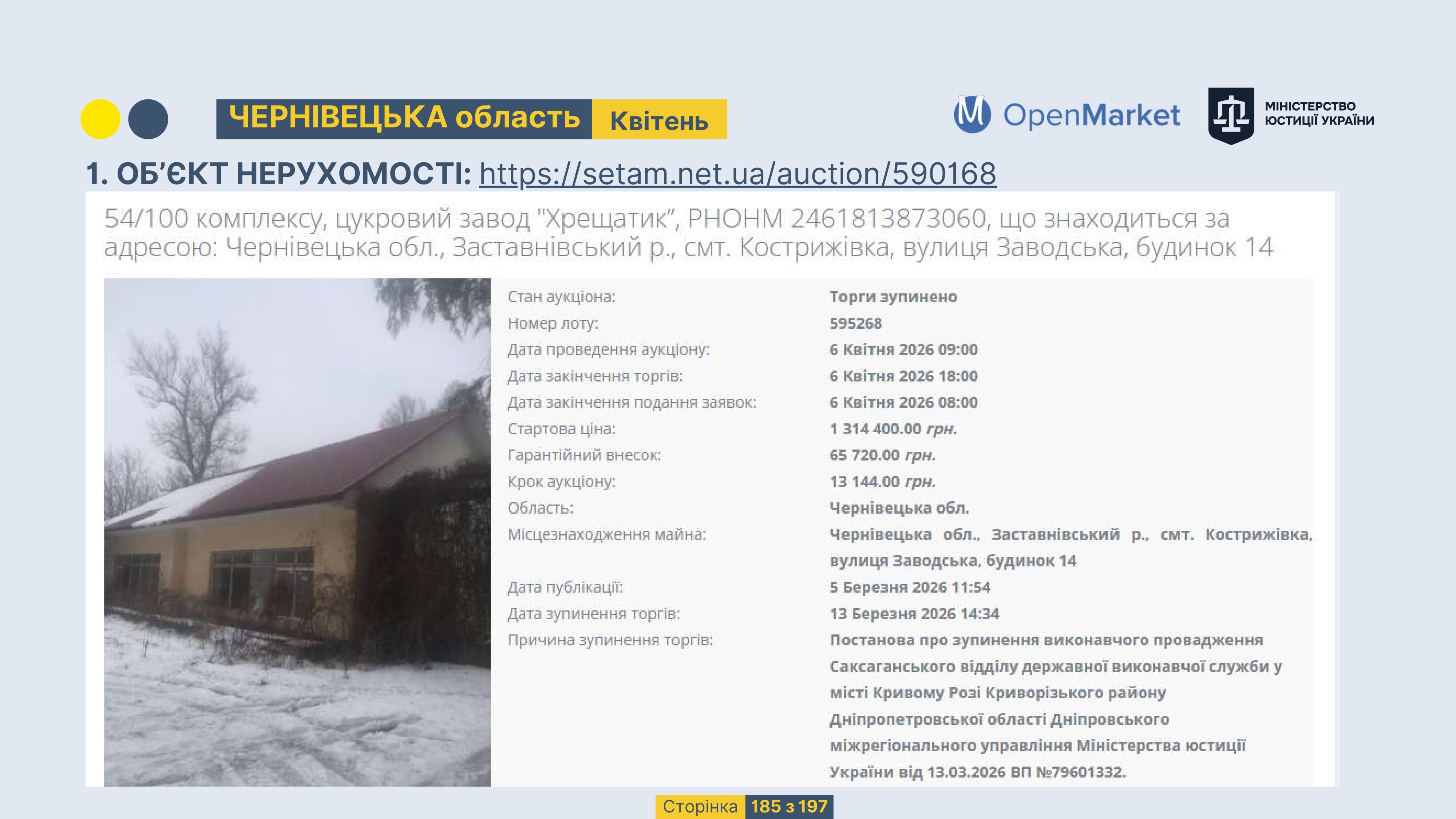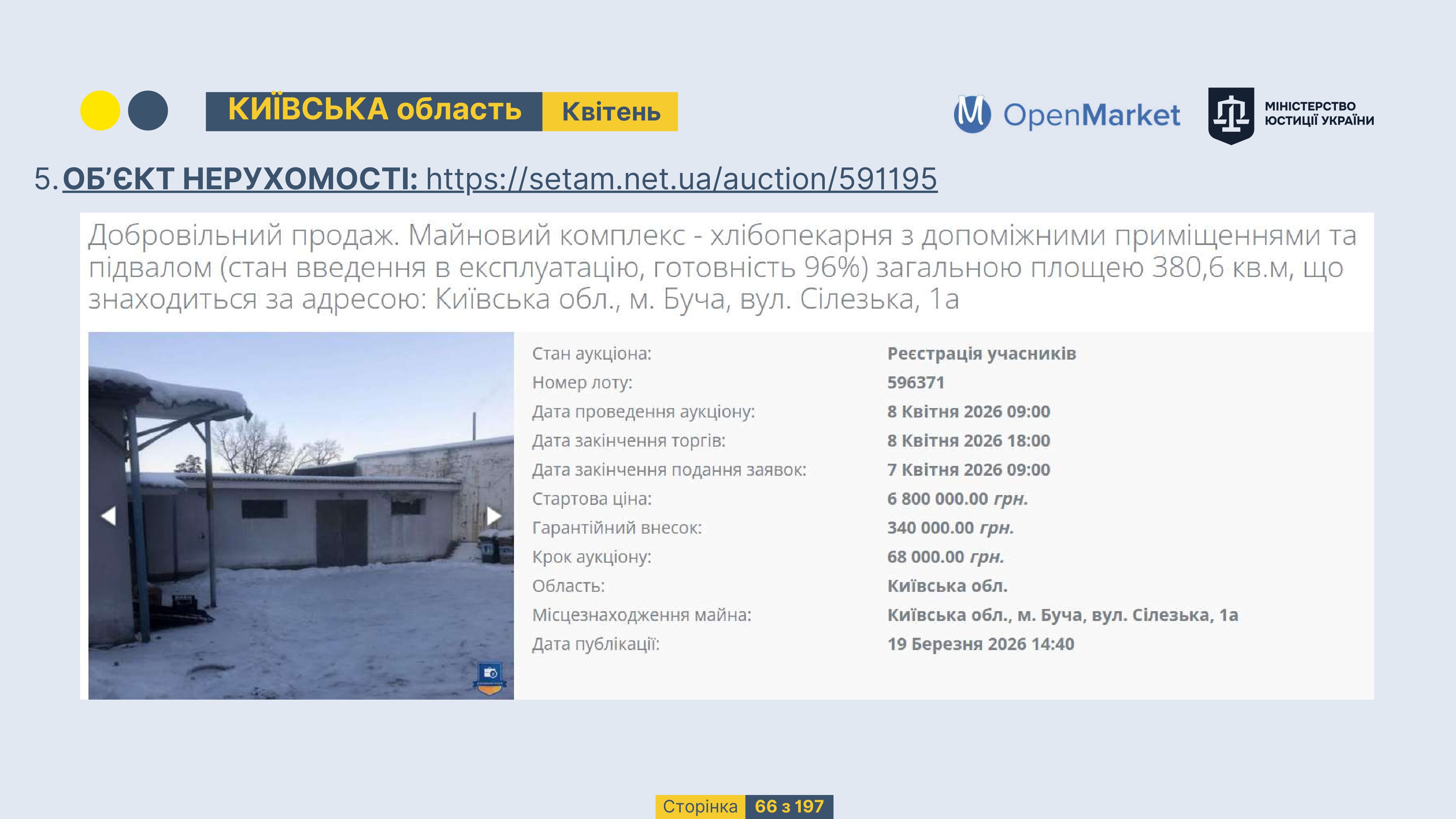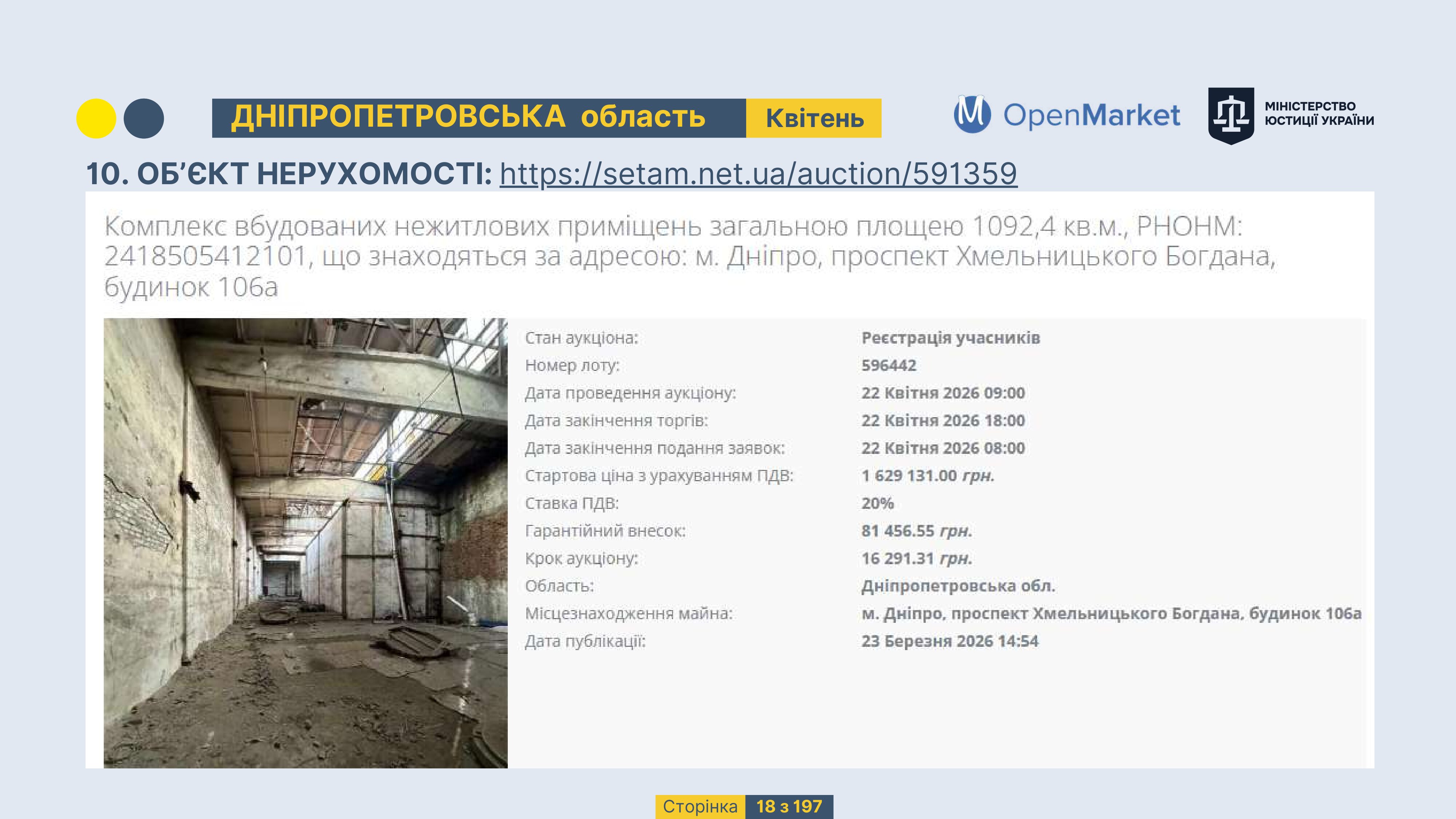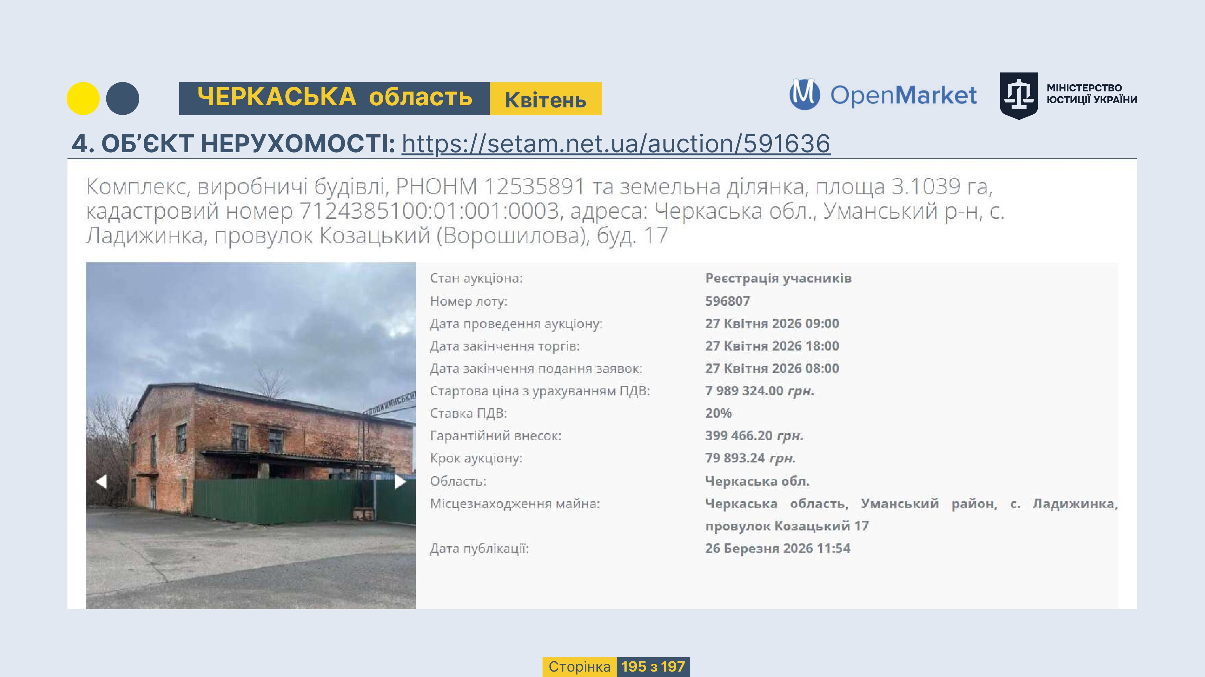 Державне підприємство «СЕТАМ» Міністерства юстиції України (далі - ДП «СЕТАМ»), повідомляє, що відповідно до Порядку реалізації арештованого майна, затвердженого наказом Міністерства юстиції України 29.09.2016 №2831/5, зареєстрованим в Міністерстві юстиції України 30.09.2016 за №1301/29431 (далі - Порядок реалізації), відповідно до частини другої та четвертої статті 61 Закону України від 02.06.2016 «Про виконавче провадження» через державну електронну аукціонну платформу OpenMarket ДП «СЕТАМ» у поточному місяці 2026 року оголошено проведення низки електронних аукціонів («Інвестиційний дайджест №3», що додається).