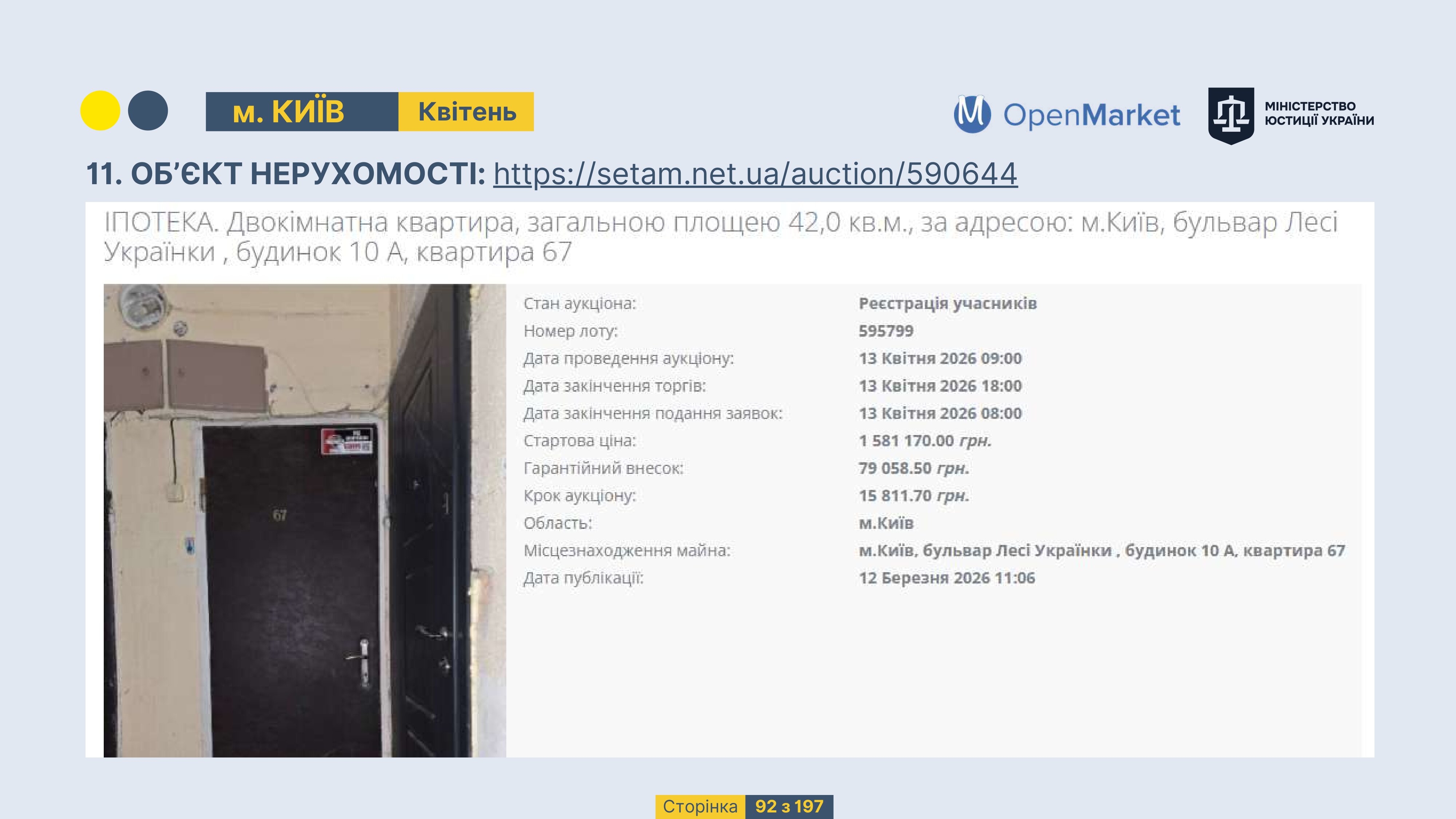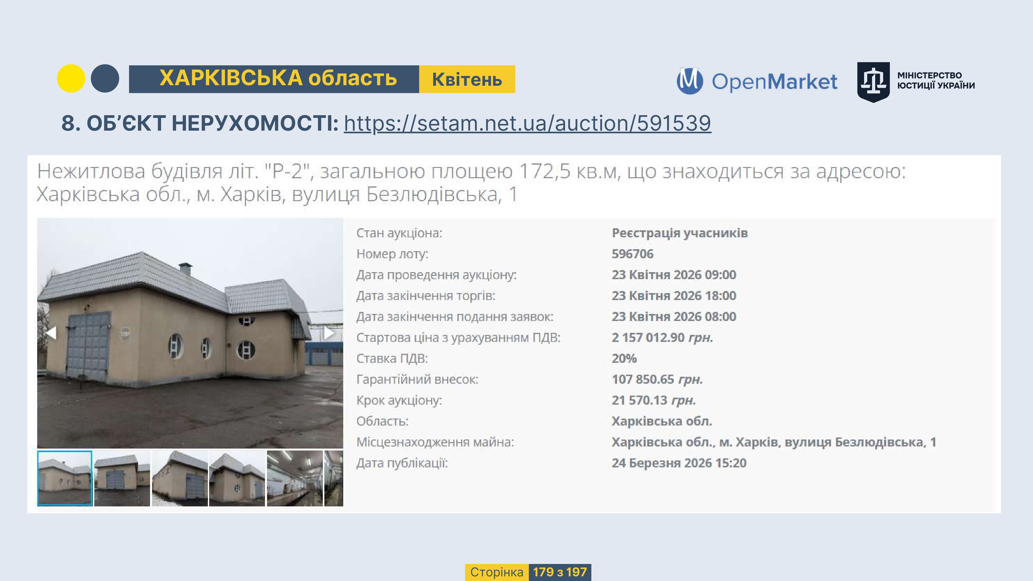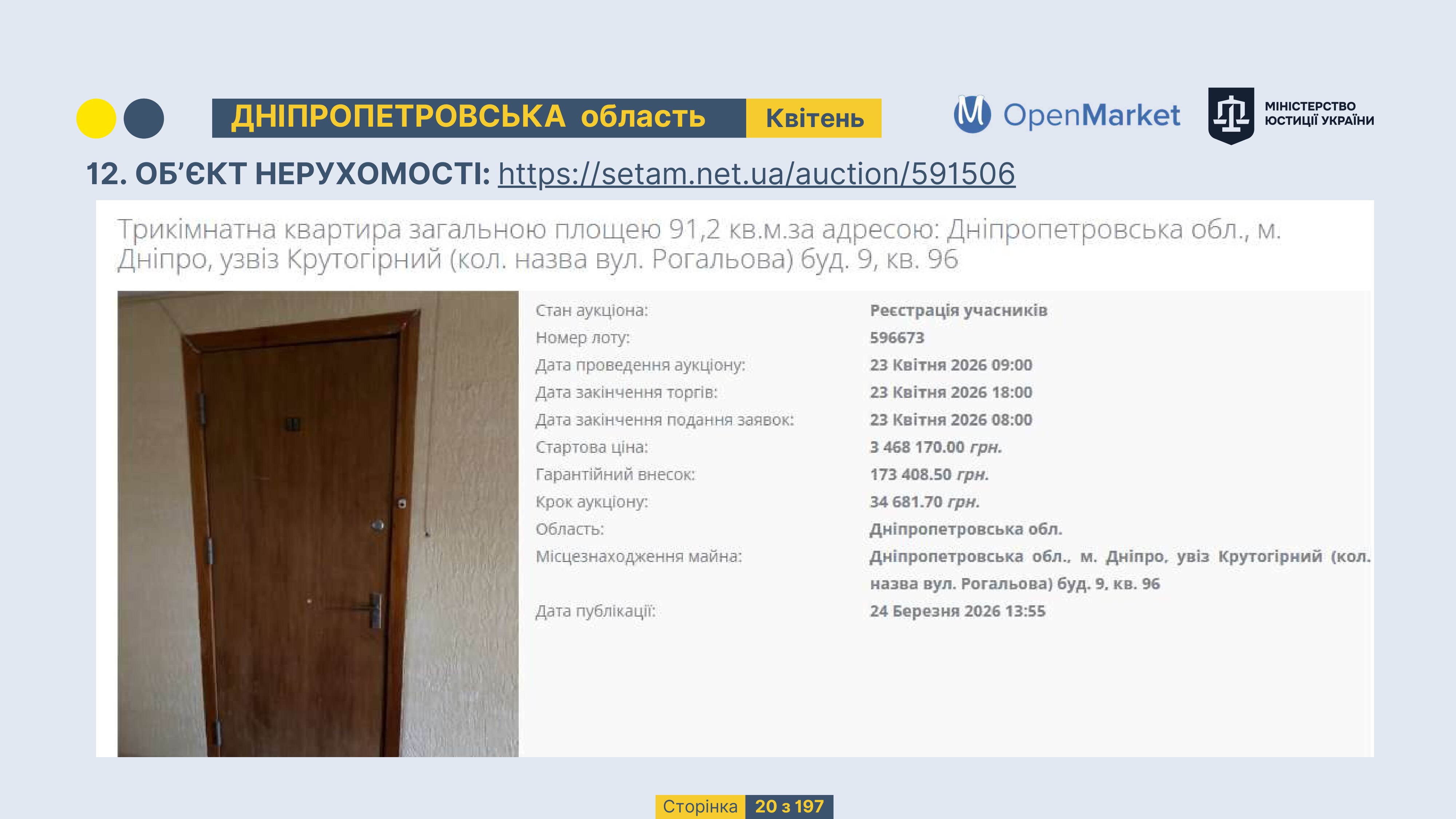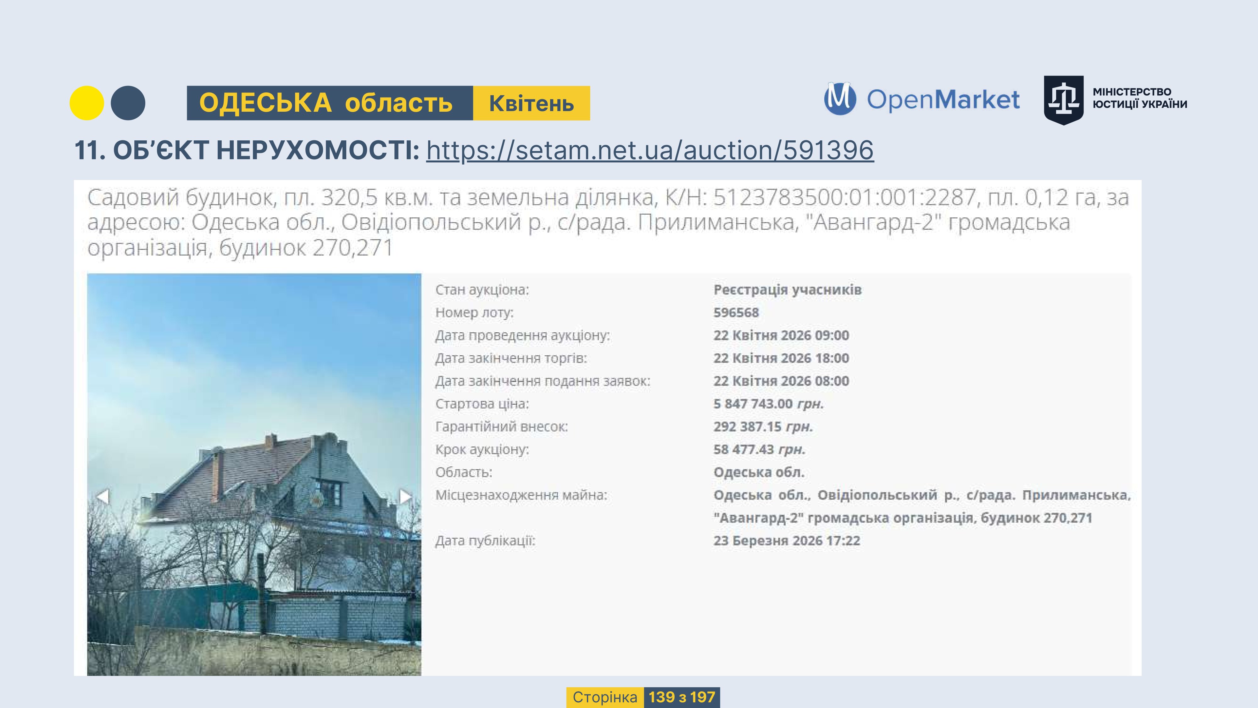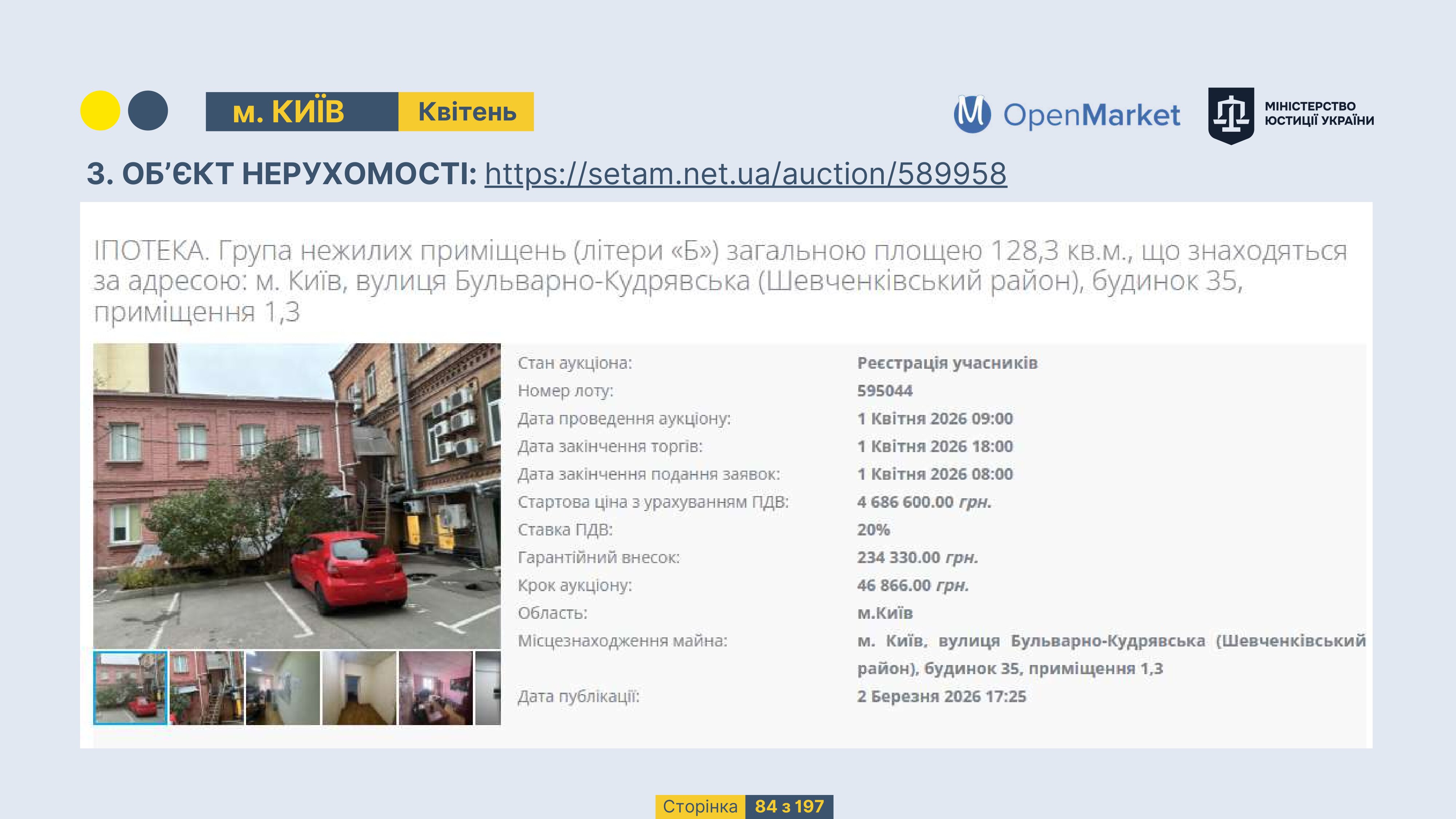 Державне підприємство «СЕТАМ» Міністерства юстиції України (далі - ДП «СЕТАМ»), повідомляє, що відповідно до Порядку реалізації арештованого майна, затвердженого наказом Міністерства юстиції України 29.09.2016 №2831/5, зареєстрованим в Міністерстві юстиції України 30.09.2016 за №1301/29431 (далі - Порядок реалізації), відповідно до частини другої та четвертої статті 61 Закону України від 02.06.2016 «Про виконавче провадження» через державну електронну аукціонну платформу OpenMarket ДП «СЕТАМ» у поточному місяці 2026 року оголошено проведення низки електронних аукціонів («Інвестиційний дайджест №3», що додається).
