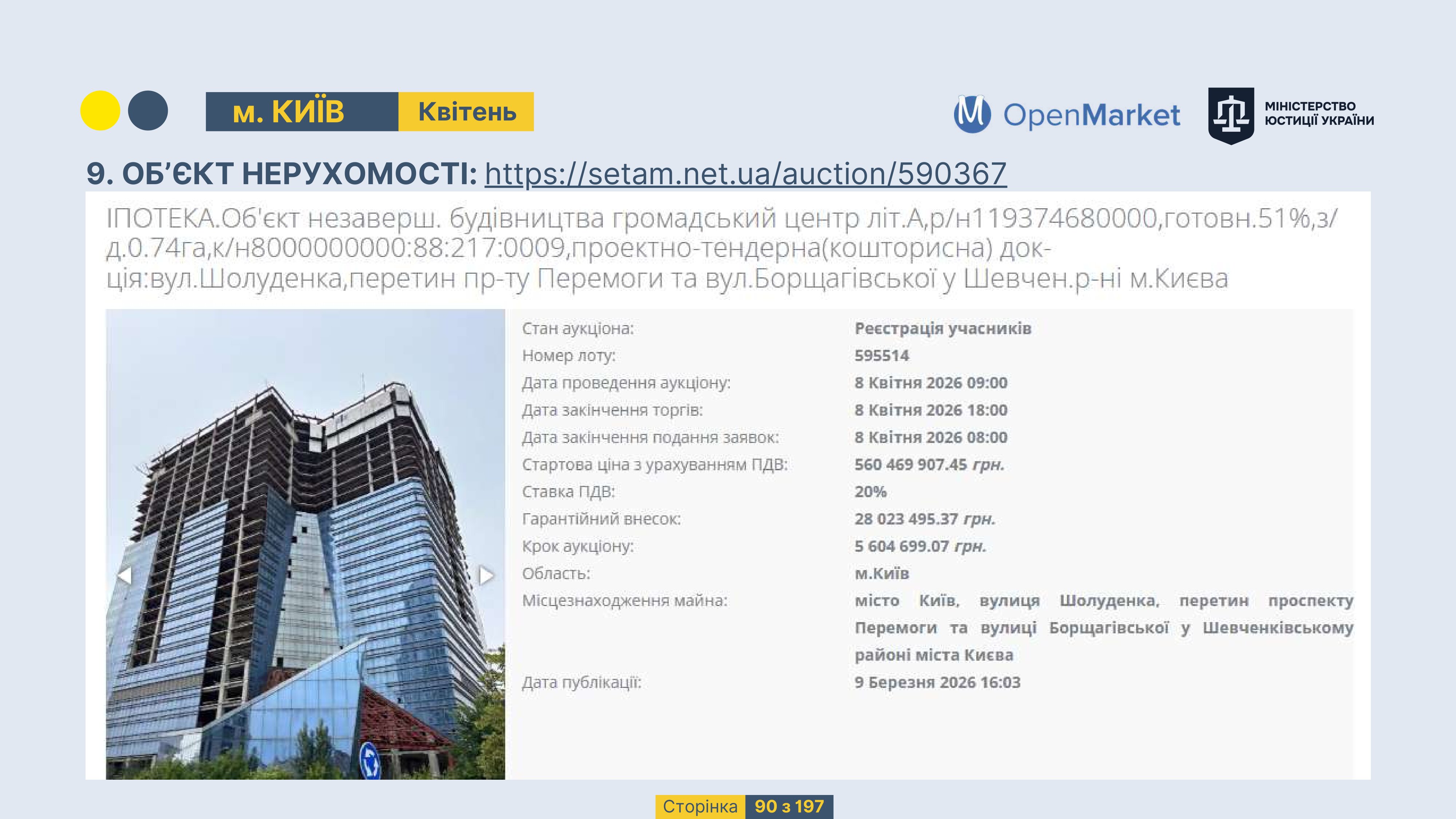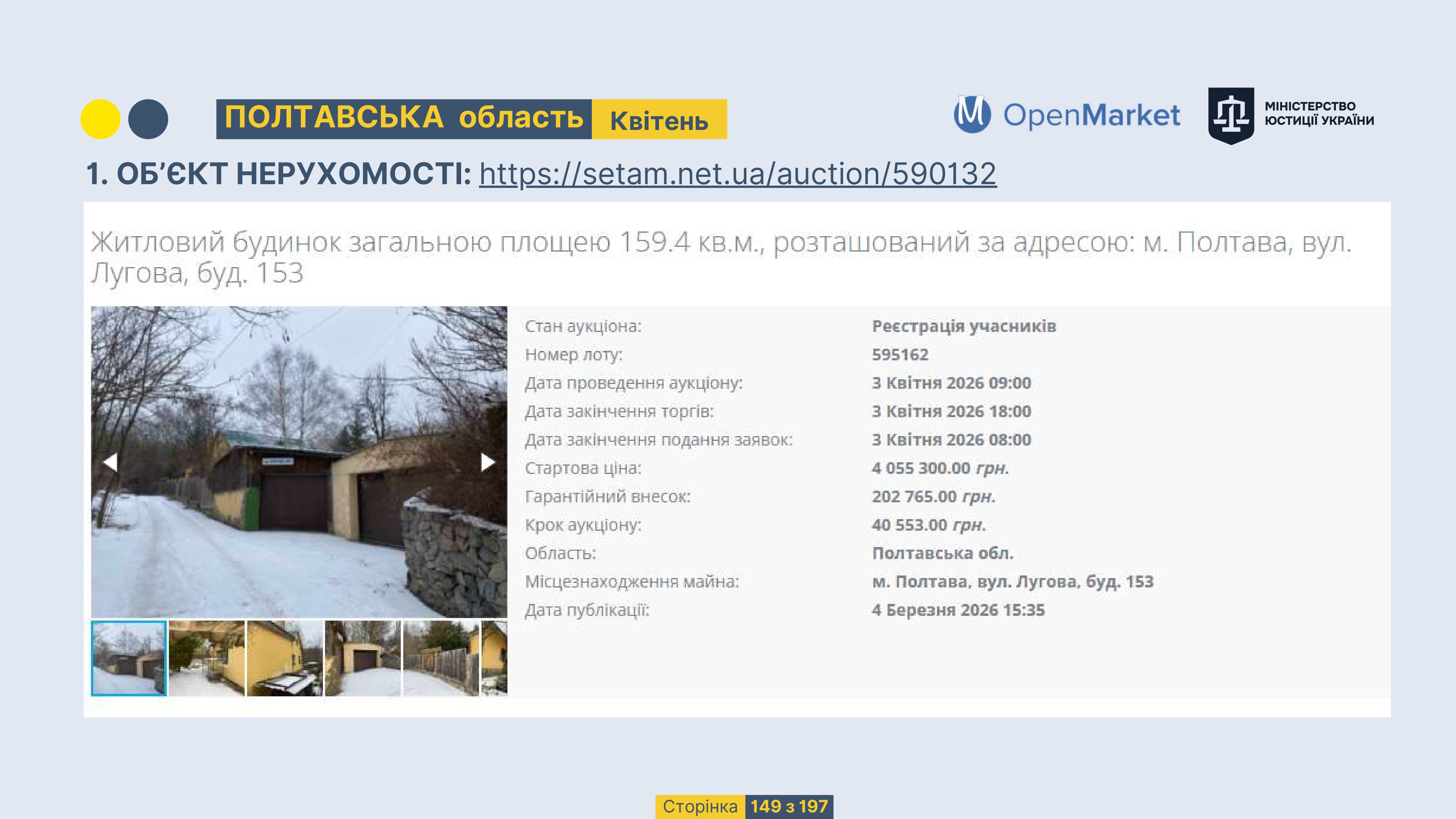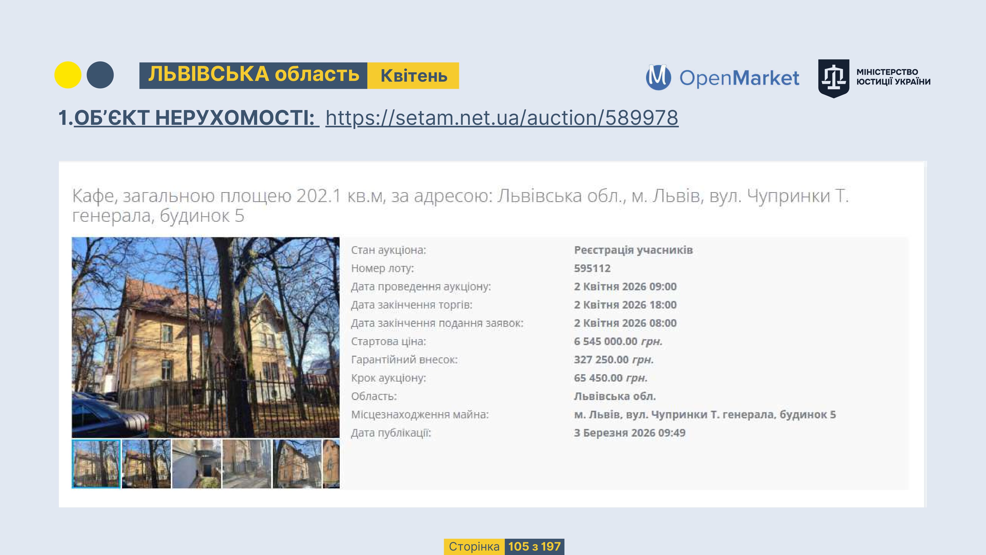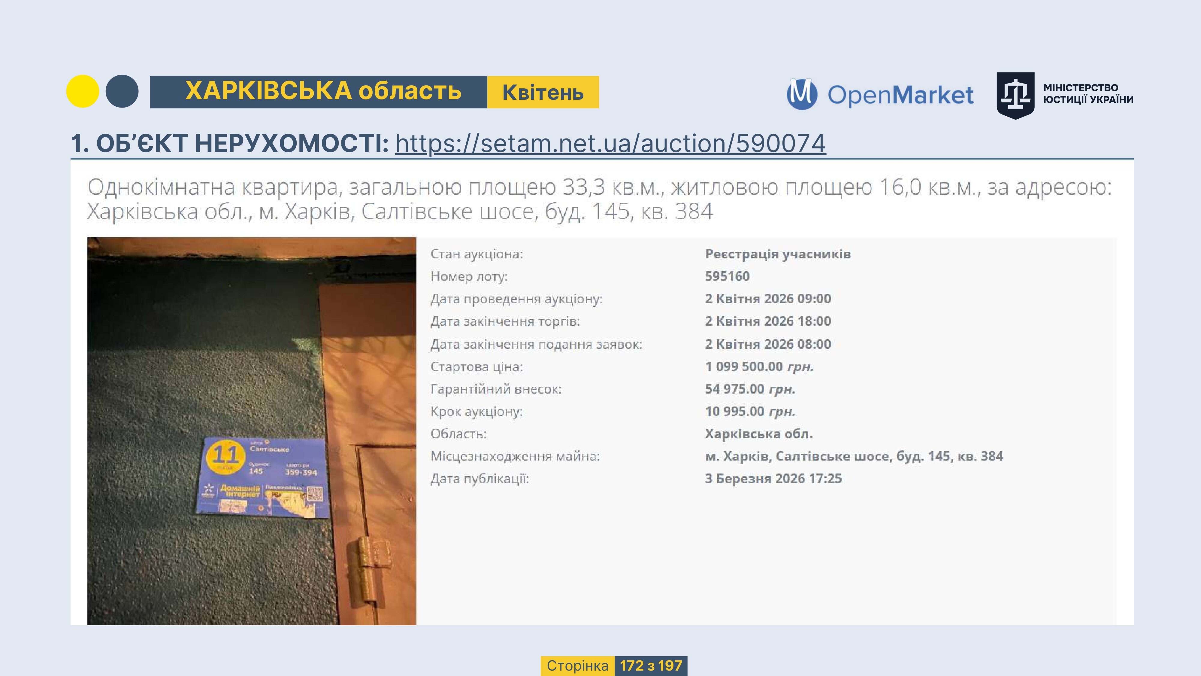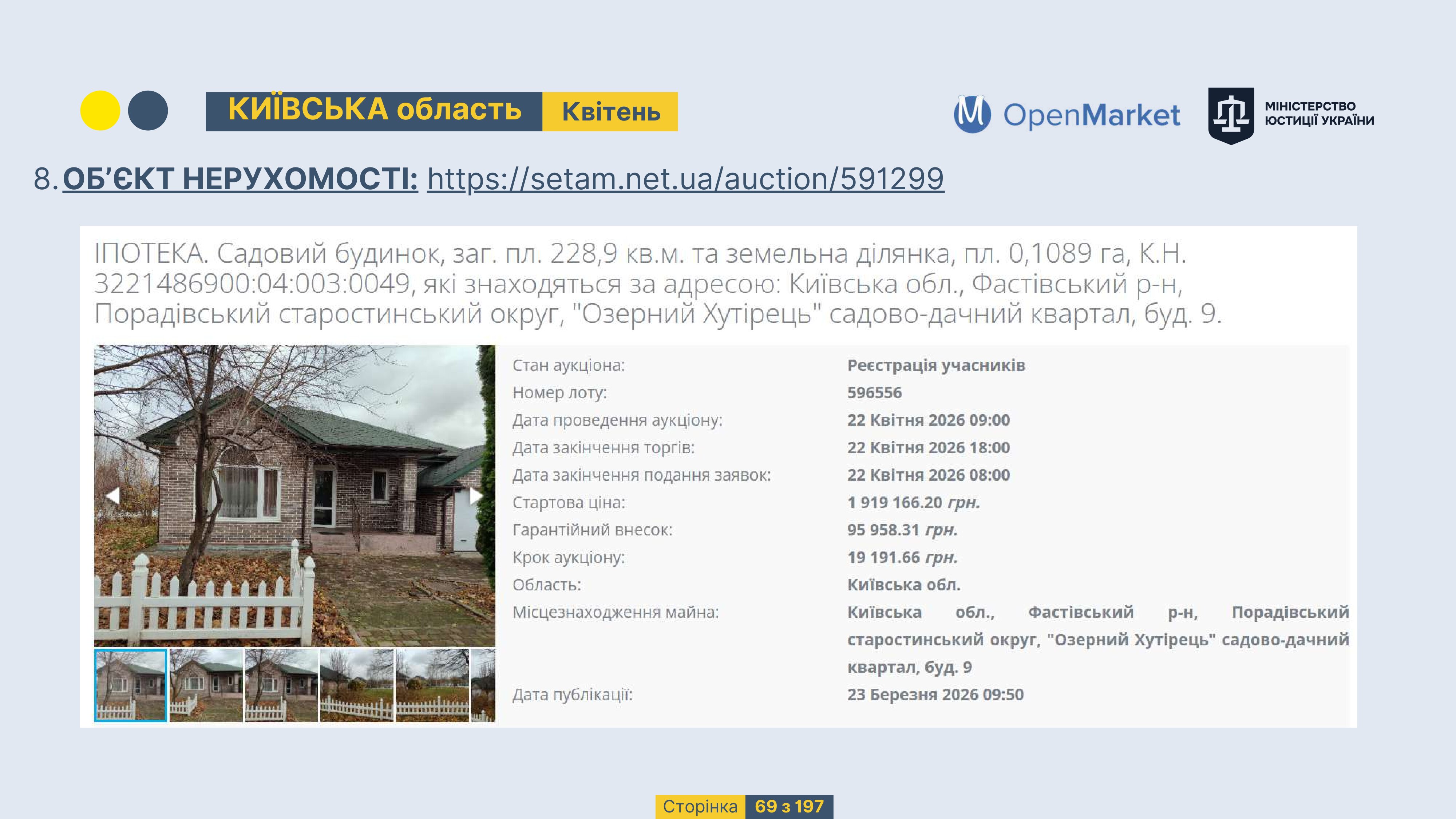 Державне підприємство «СЕТАМ» Міністерства юстиції України (далі - ДП «СЕТАМ»), повідомляє, що відповідно до Порядку реалізації арештованого майна, затвердженого наказом Міністерства юстиції України 29.09.2016 №2831/5, зареєстрованим в Міністерстві юстиції України 30.09.2016 за №1301/29431 (далі - Порядок реалізації), відповідно до частини другої та четвертої статті 61 Закону України від 02.06.2016 «Про виконавче провадження» через державну електронну аукціонну платформу OpenMarket ДП «СЕТАМ» у поточному місяці 2026 року оголошено проведення низки електронних аукціонів («Інвестиційний дайджест №3», що додається).