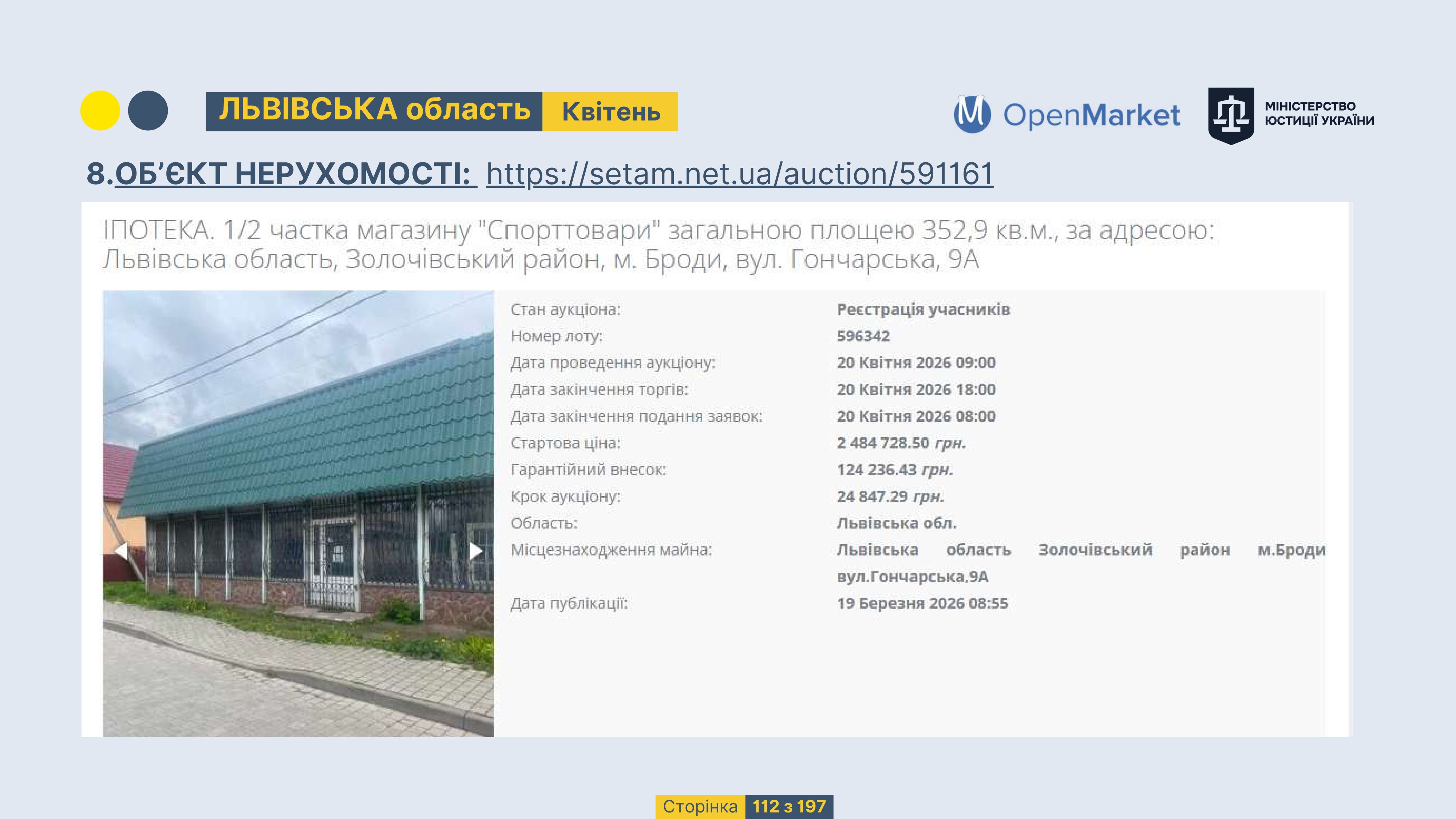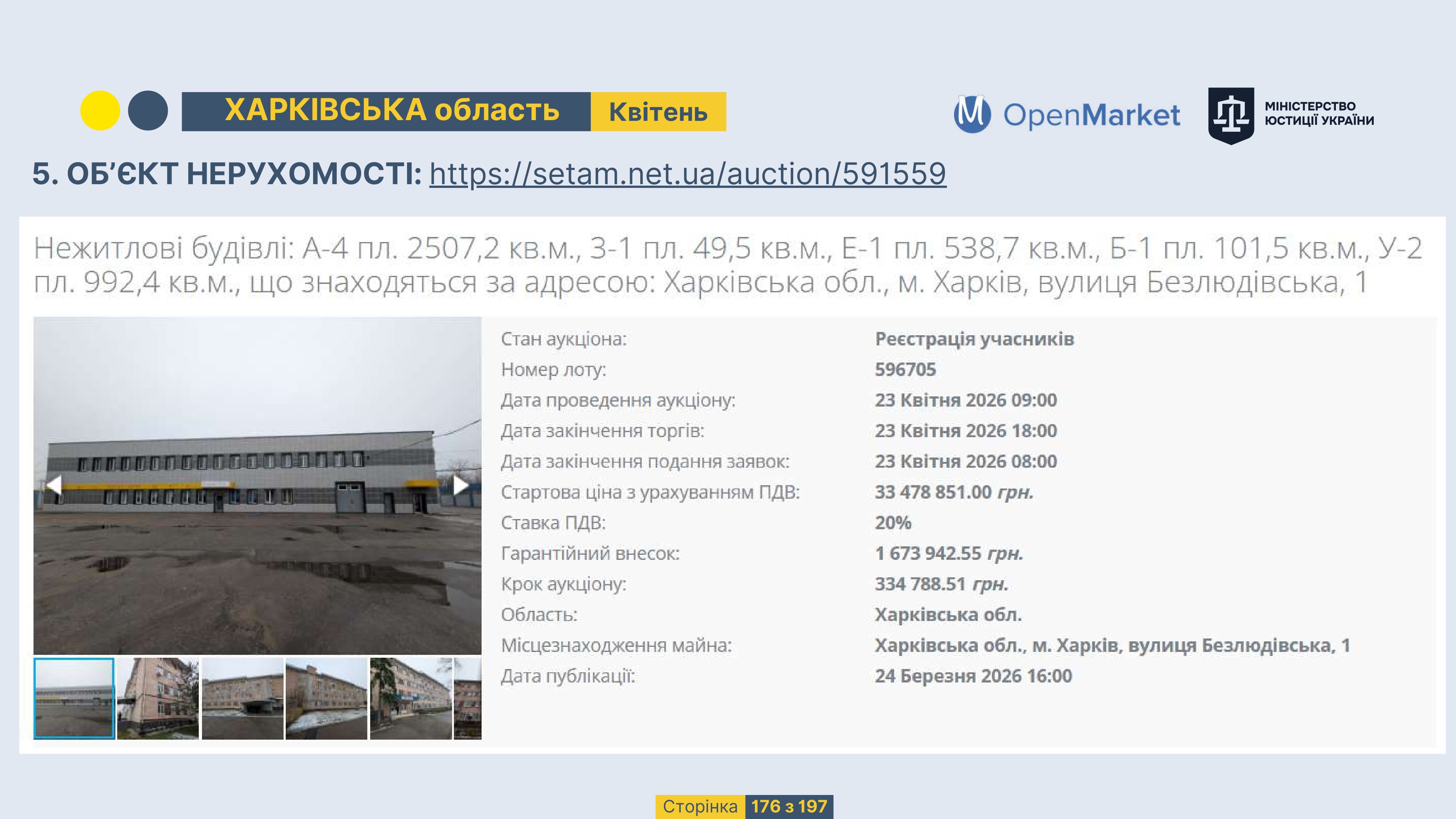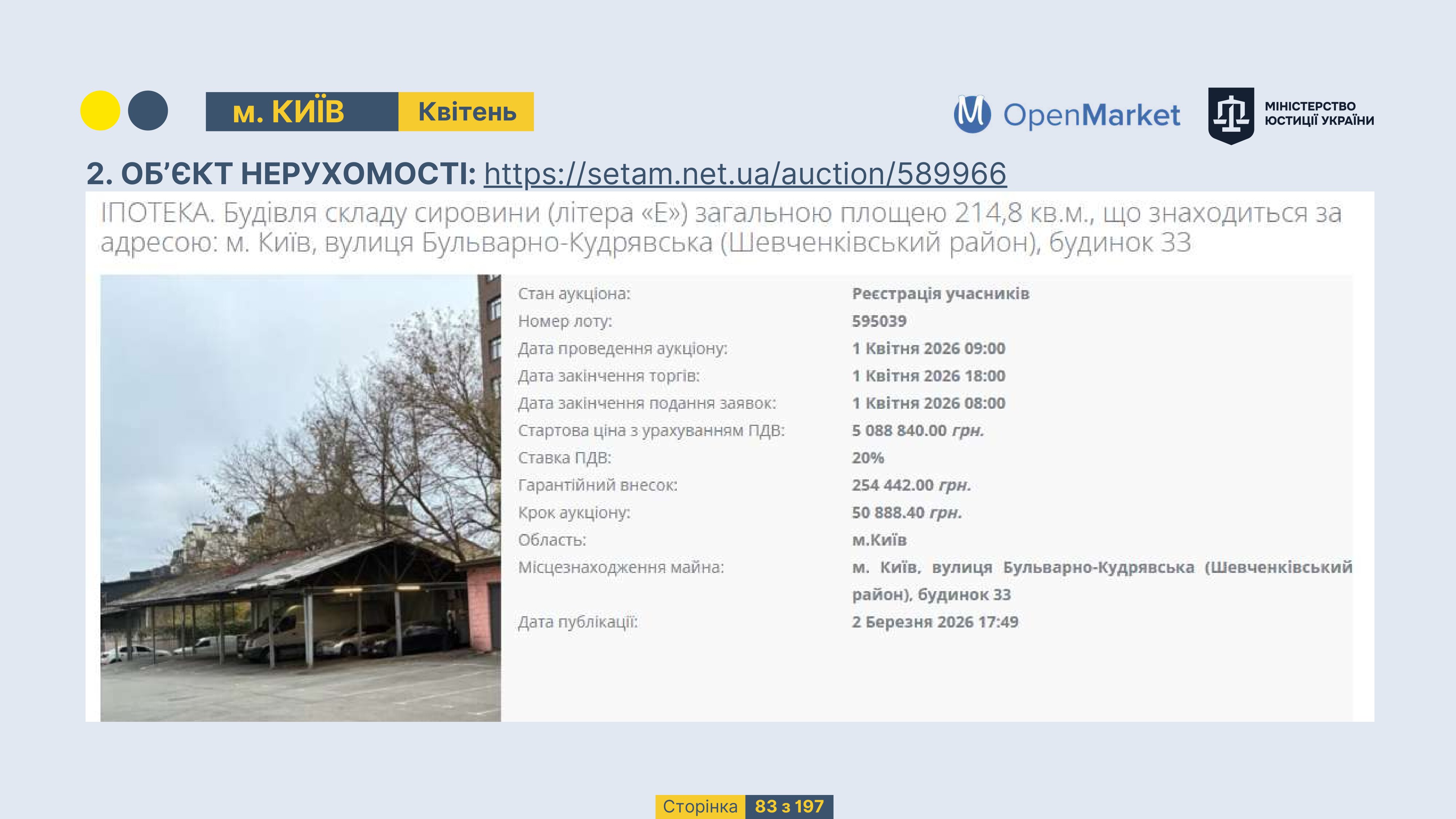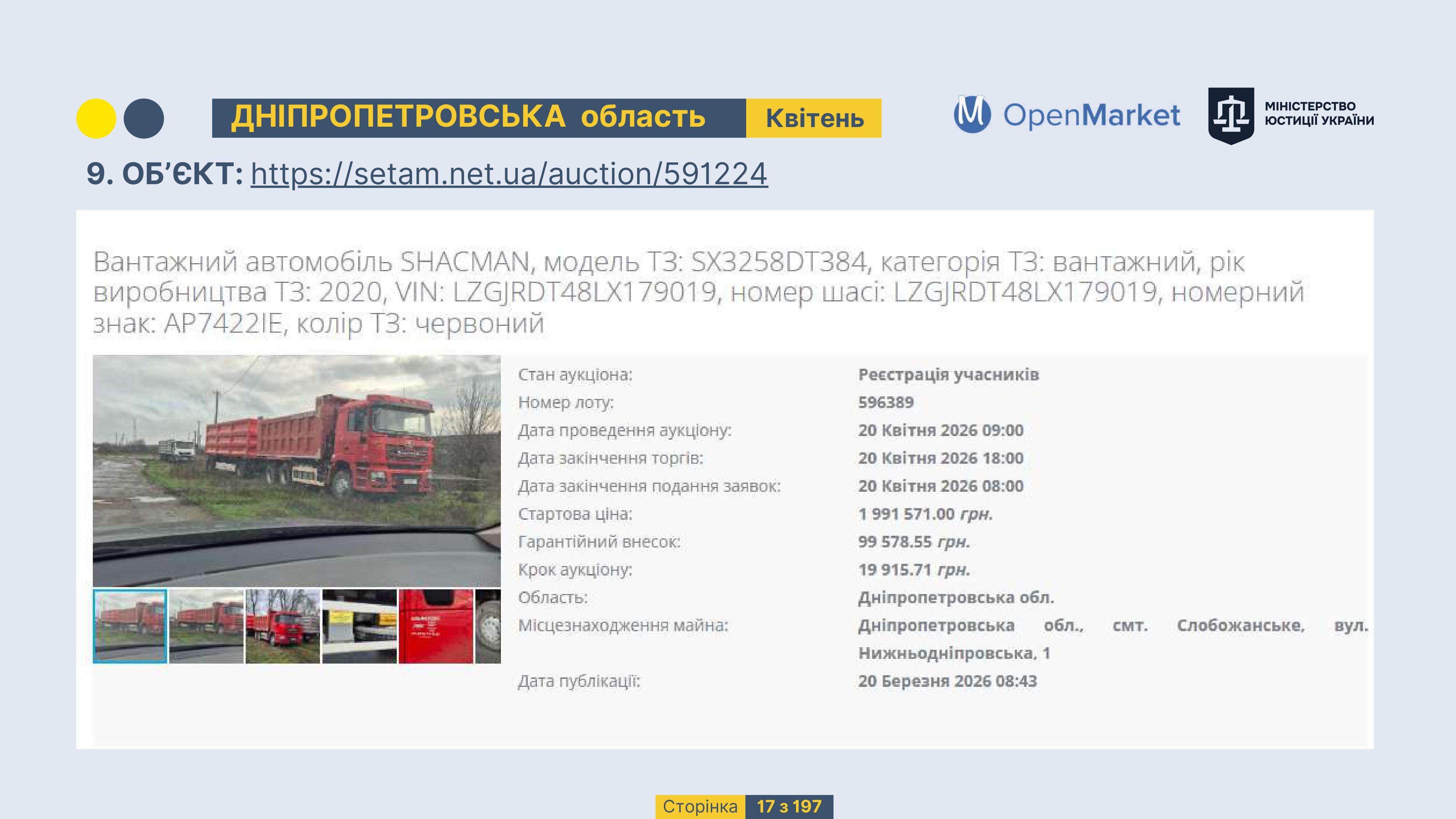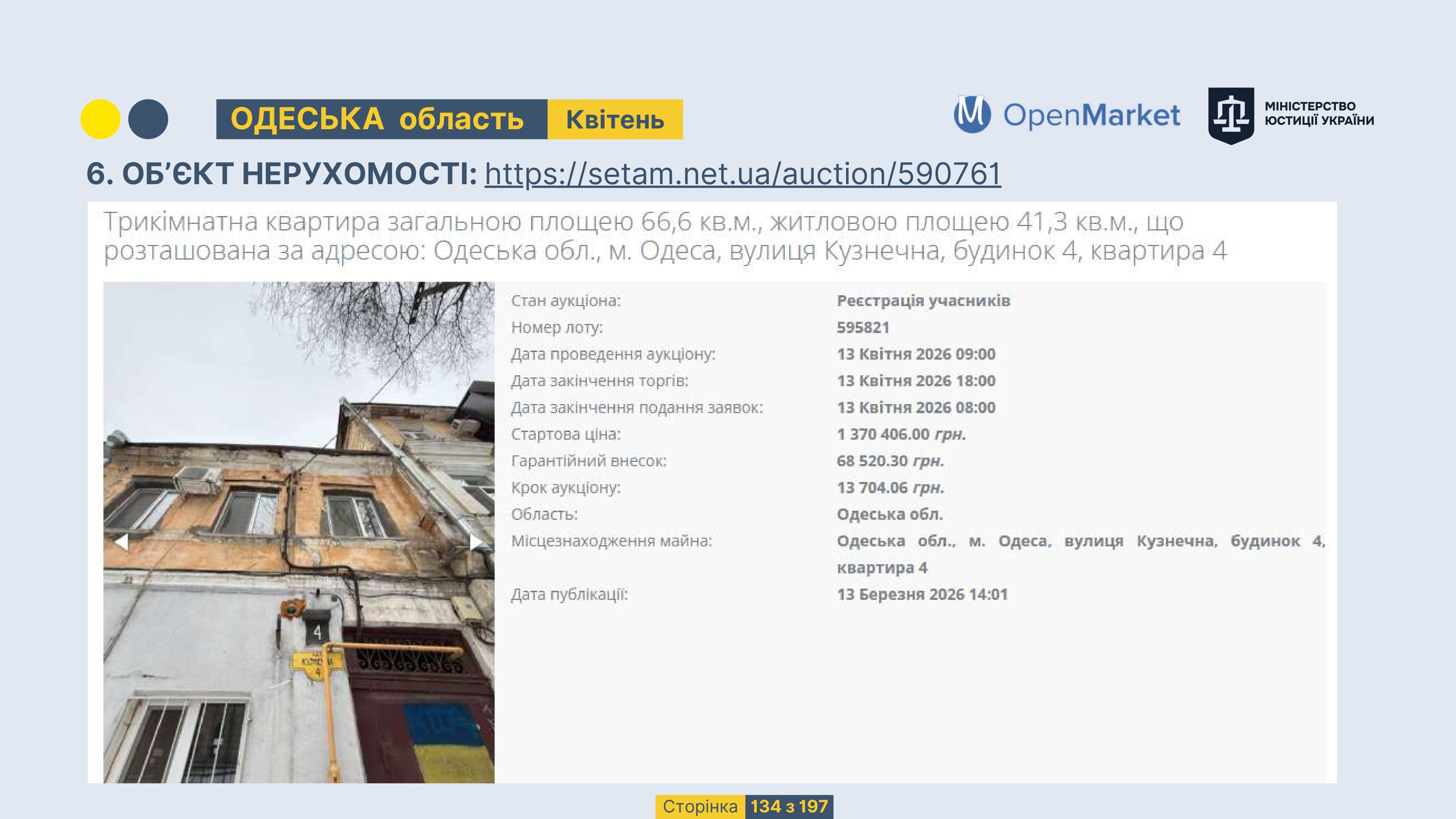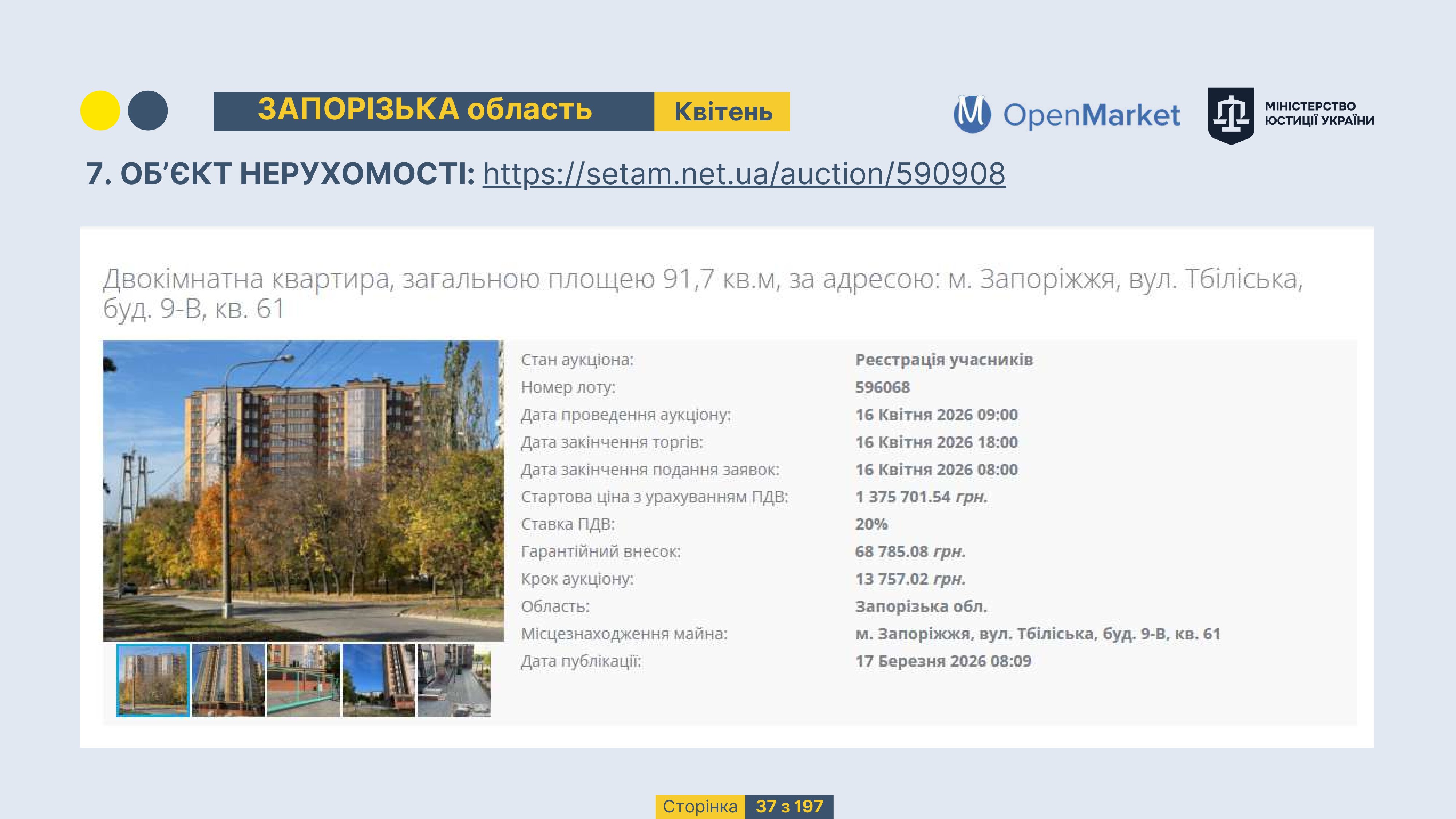 Державне підприємство «СЕТАМ» Міністерства юстиції України (далі - ДП «СЕТАМ»), повідомляє, що відповідно до Порядку реалізації арештованого майна, затвердженого наказом Міністерства юстиції України 29.09.2016 №2831/5, зареєстрованим в Міністерстві юстиції України 30.09.2016 за №1301/29431 (далі - Порядок реалізації), відповідно до частини другої та четвертої статті 61 Закону України від 02.06.2016 «Про виконавче провадження» через державну електронну аукціонну платформу OpenMarket ДП «СЕТАМ» у поточному місяці 2026 року оголошено проведення низки електронних аукціонів («Інвестиційний дайджест №3», що додається).