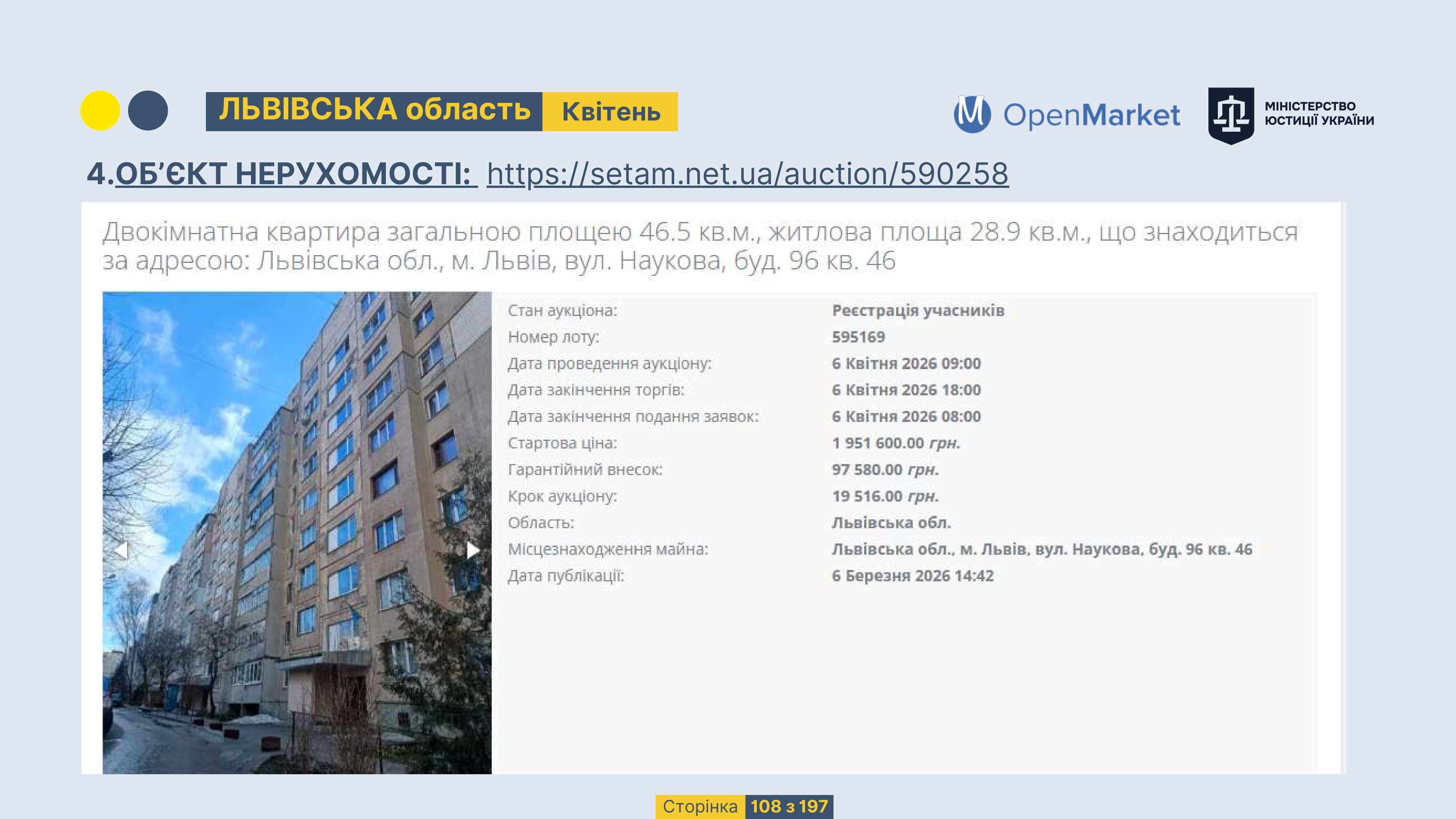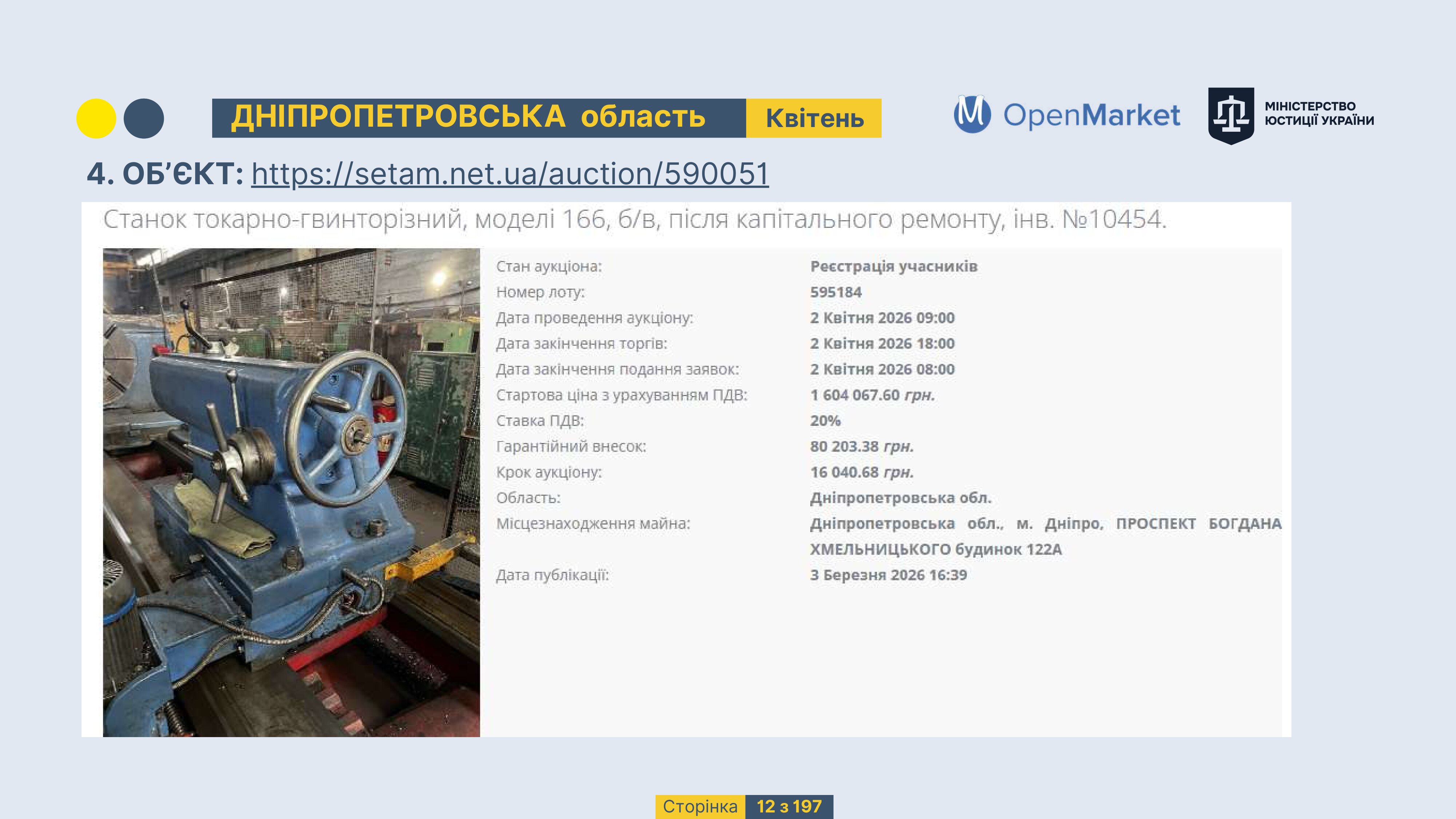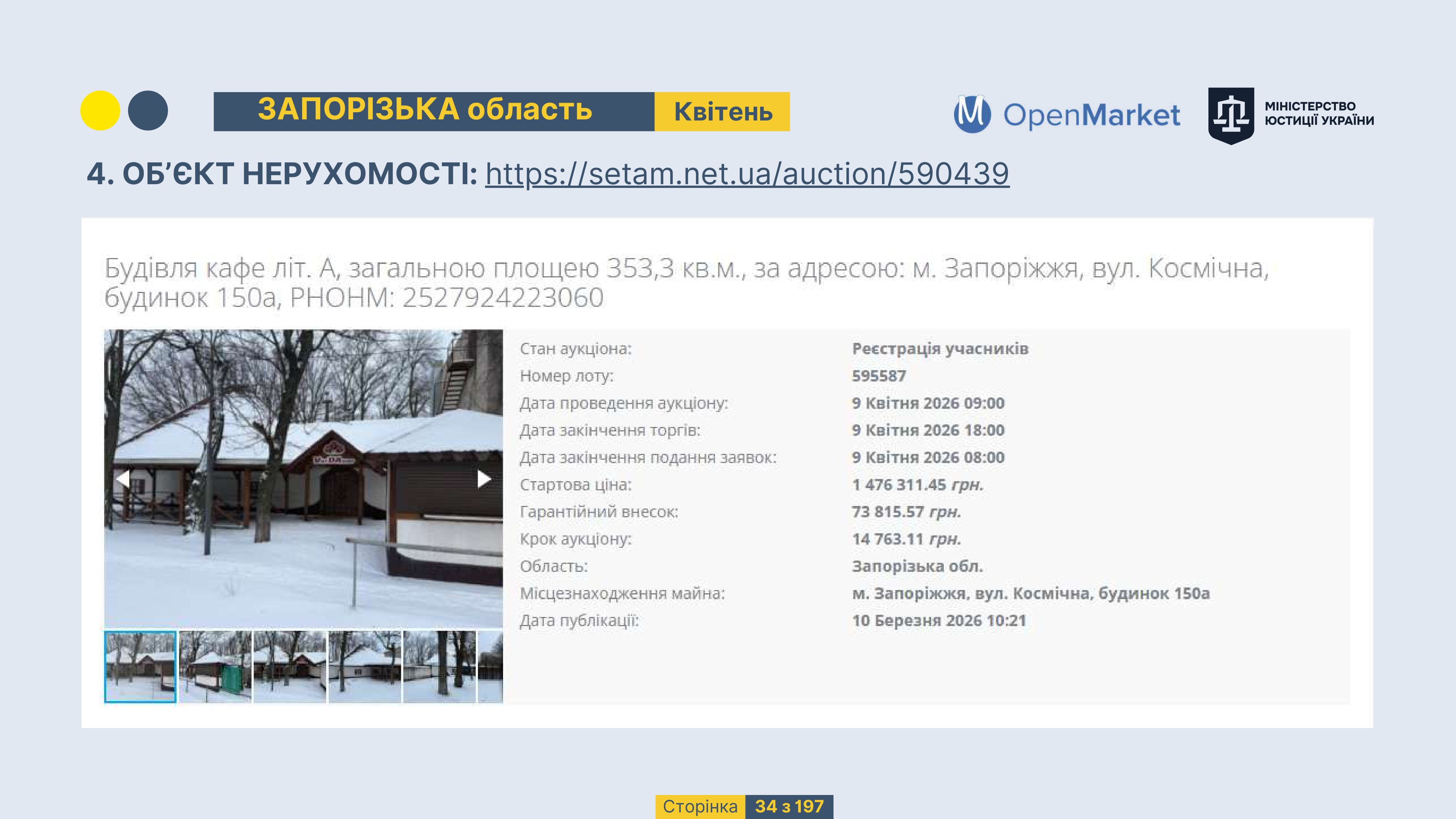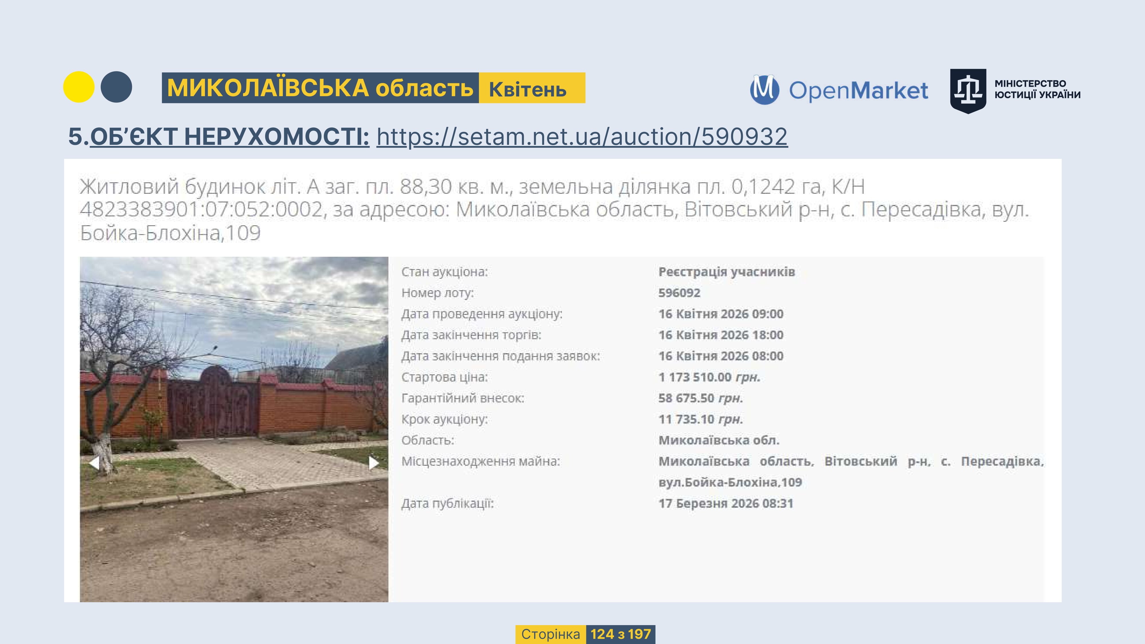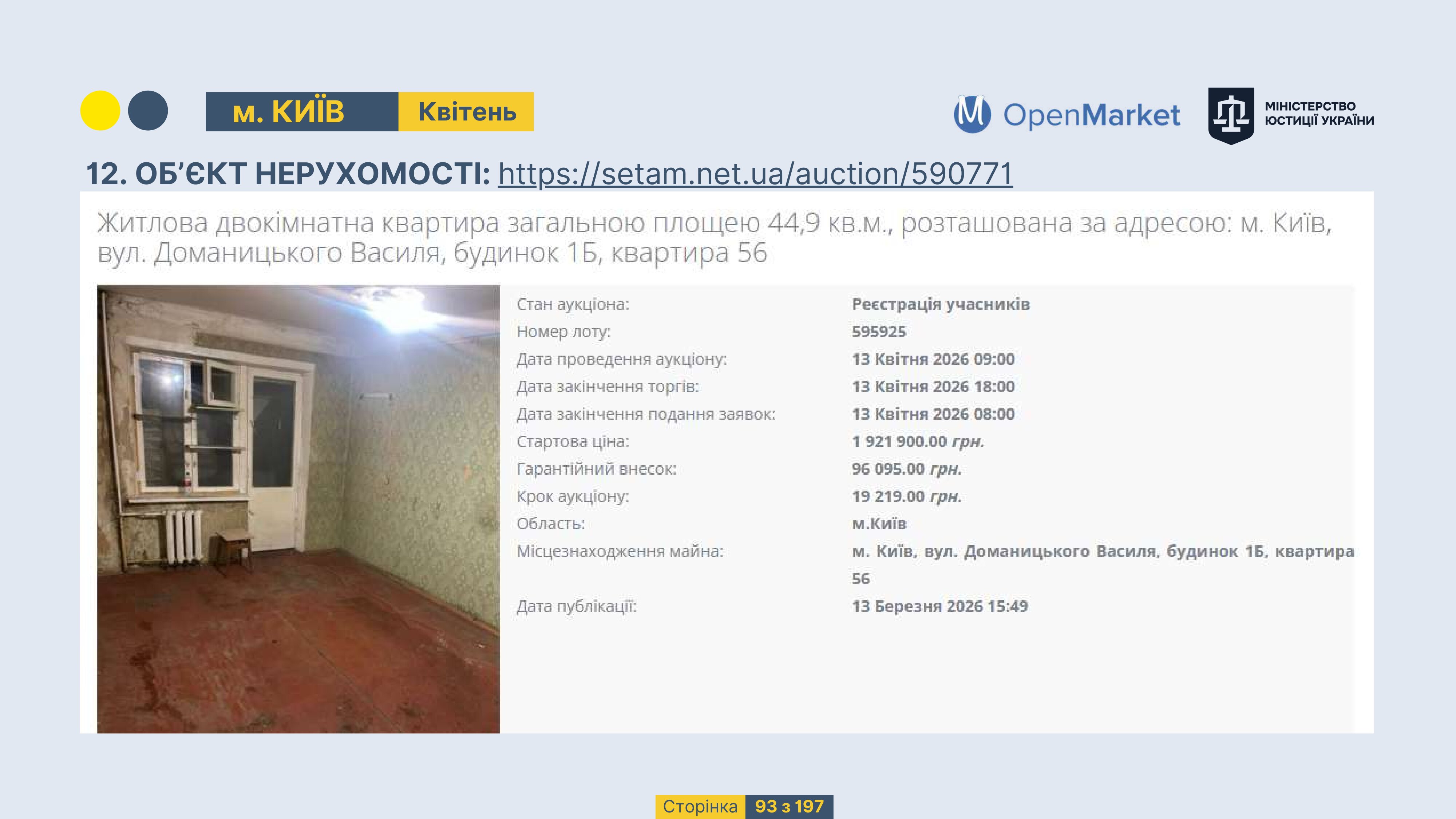Державне підприємство «СЕТАМ» Міністерства юстиції України (далі - ДП «СЕТАМ»), повідомляє, що відповідно до Порядку реалізації арештованого майна, затвердженого наказом Міністерства юстиції України 29.09.2016 №2831/5, зареєстрованим в Міністерстві юстиції України 30.09.2016 за №1301/29431 (далі - Порядок реалізації), відповідно до частини другої та четвертої статті 61 Закону України від 02.06.2016 «Про виконавче провадження» через державну електронну аукціонну платформу OpenMarket ДП «СЕТАМ» у поточному місяці 2026 року оголошено проведення низки електронних аукціонів («Інвестиційний дайджест №3», що додається).