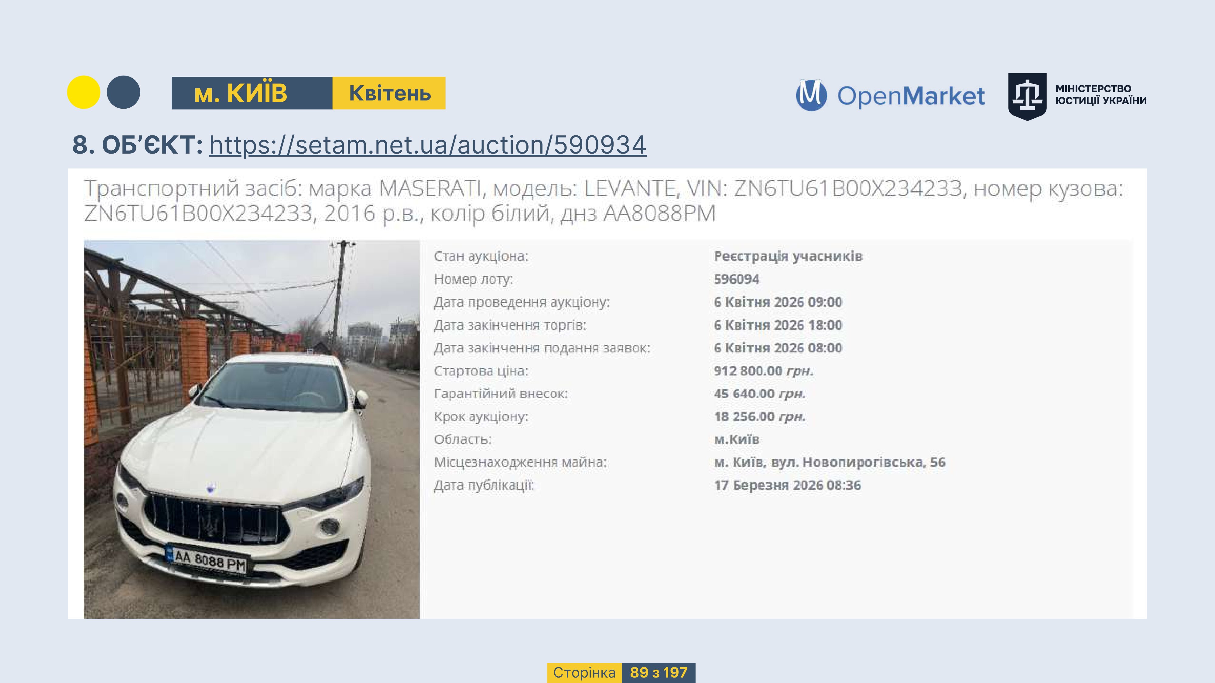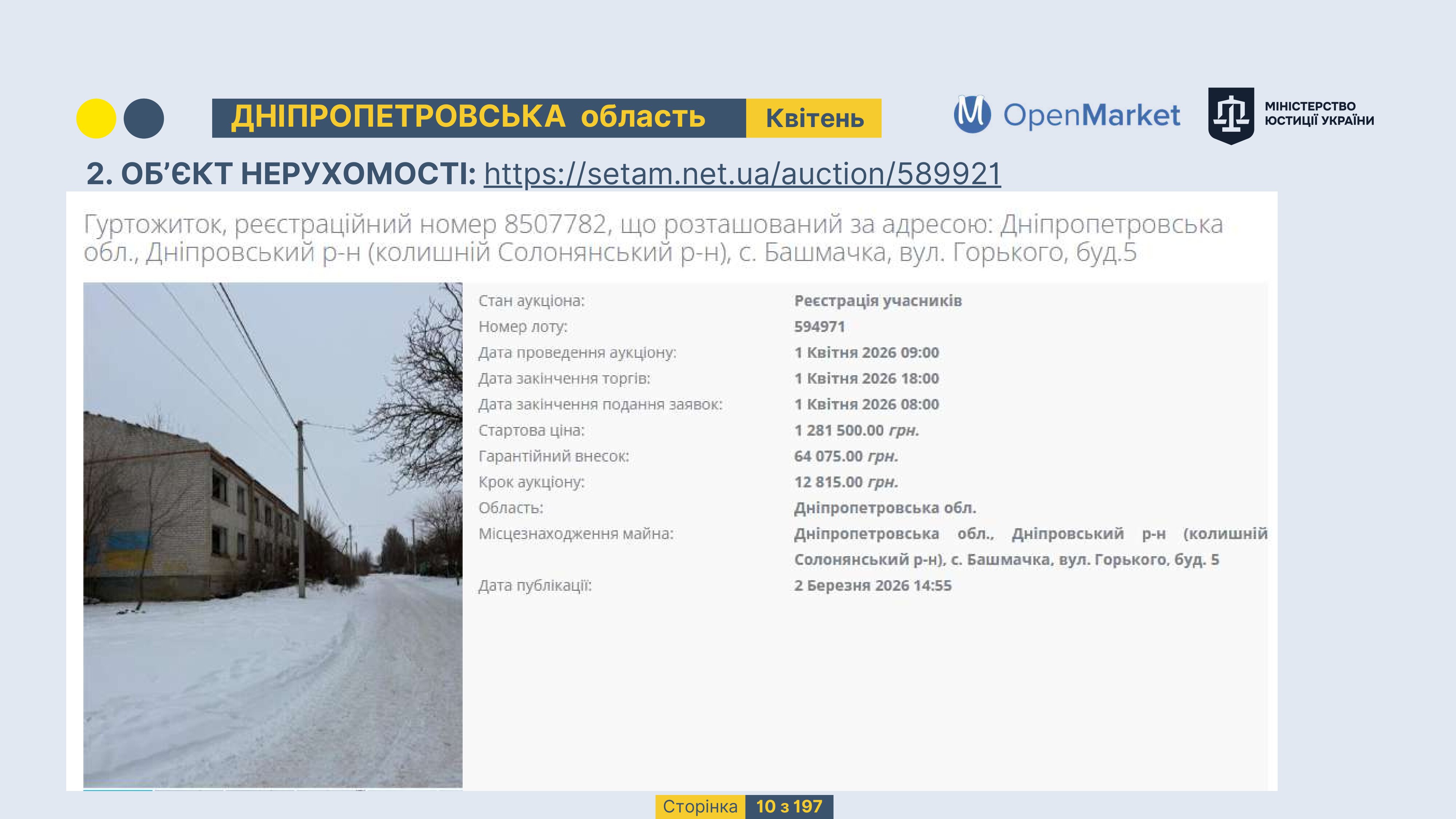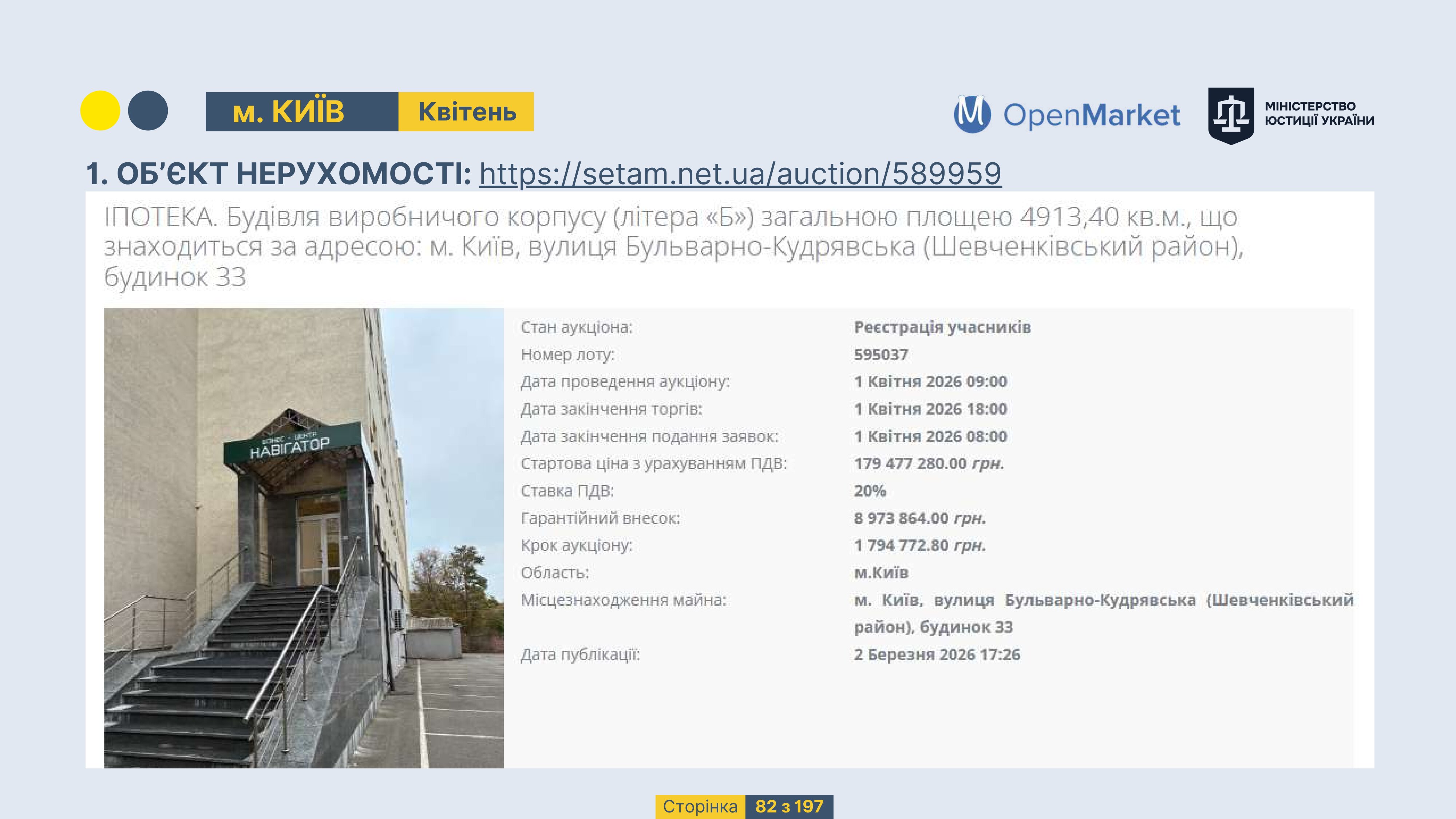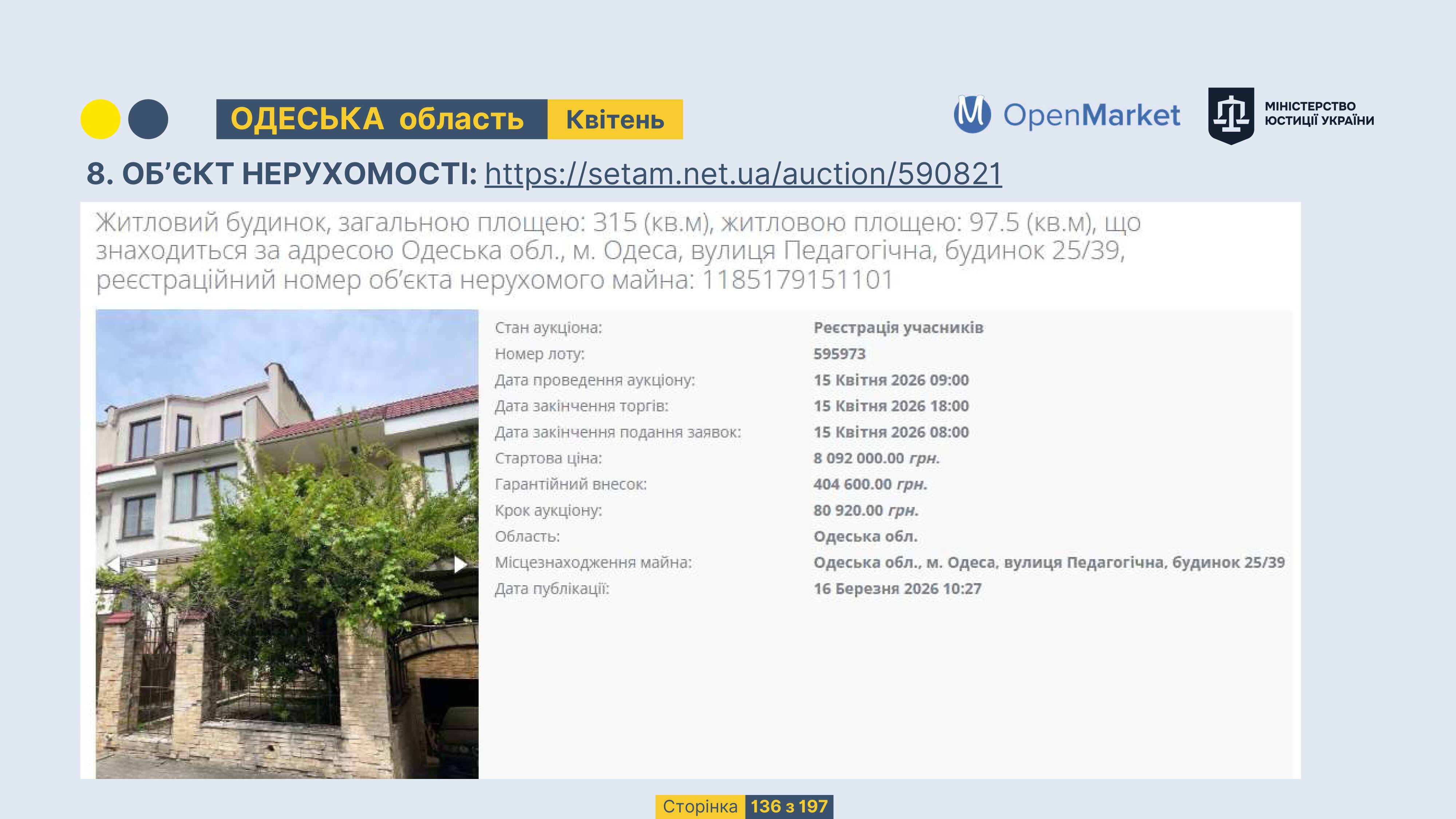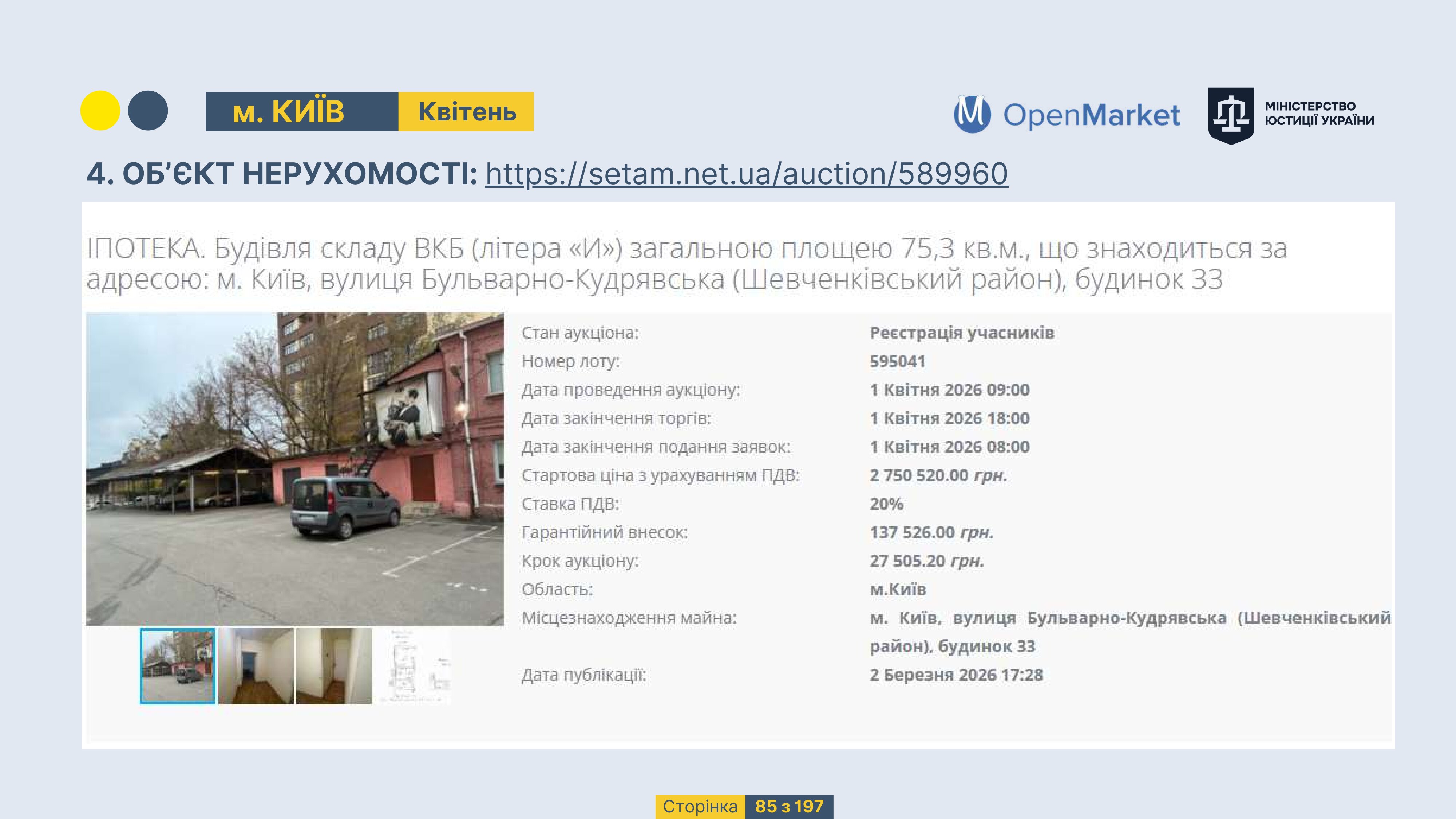 Державне підприємство «СЕТАМ» Міністерства юстиції України (далі - ДП «СЕТАМ»), повідомляє, що відповідно до Порядку реалізації арештованого майна, затвердженого наказом Міністерства юстиції України 29.09.2016 №2831/5, зареєстрованим в Міністерстві юстиції України 30.09.2016 за №1301/29431 (далі - Порядок реалізації), відповідно до частини другої та четвертої статті 61 Закону України від 02.06.2016 «Про виконавче провадження» через державну електронну аукціонну платформу OpenMarket ДП «СЕТАМ» у поточному місяці 2026 року оголошено проведення низки електронних аукціонів («Інвестиційний дайджест №3», що додається).