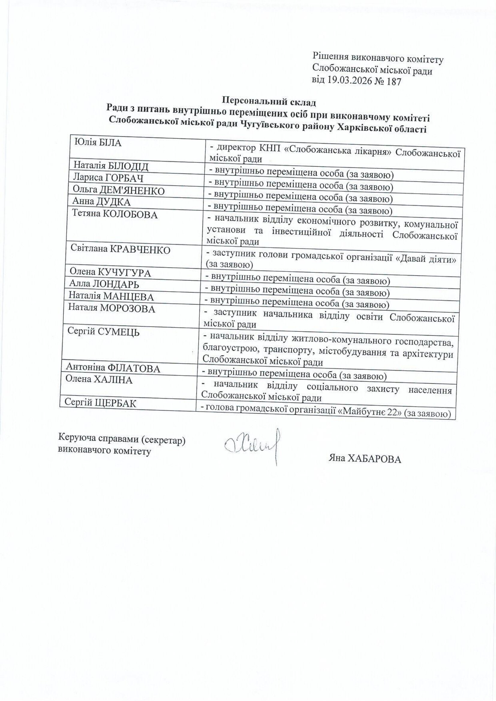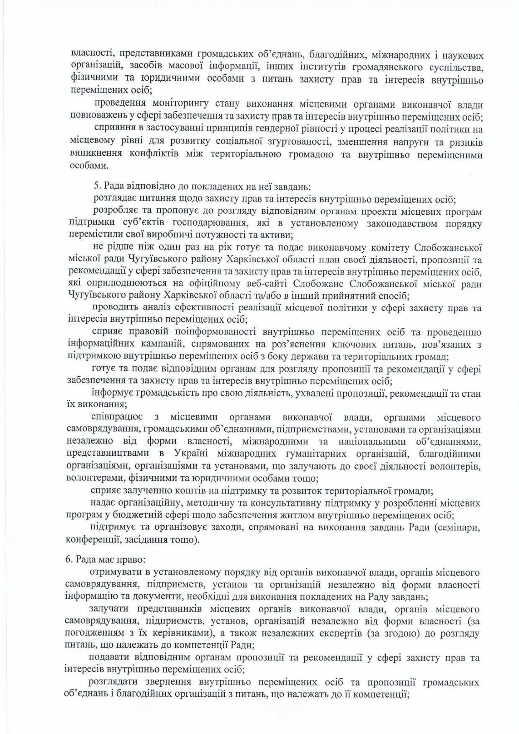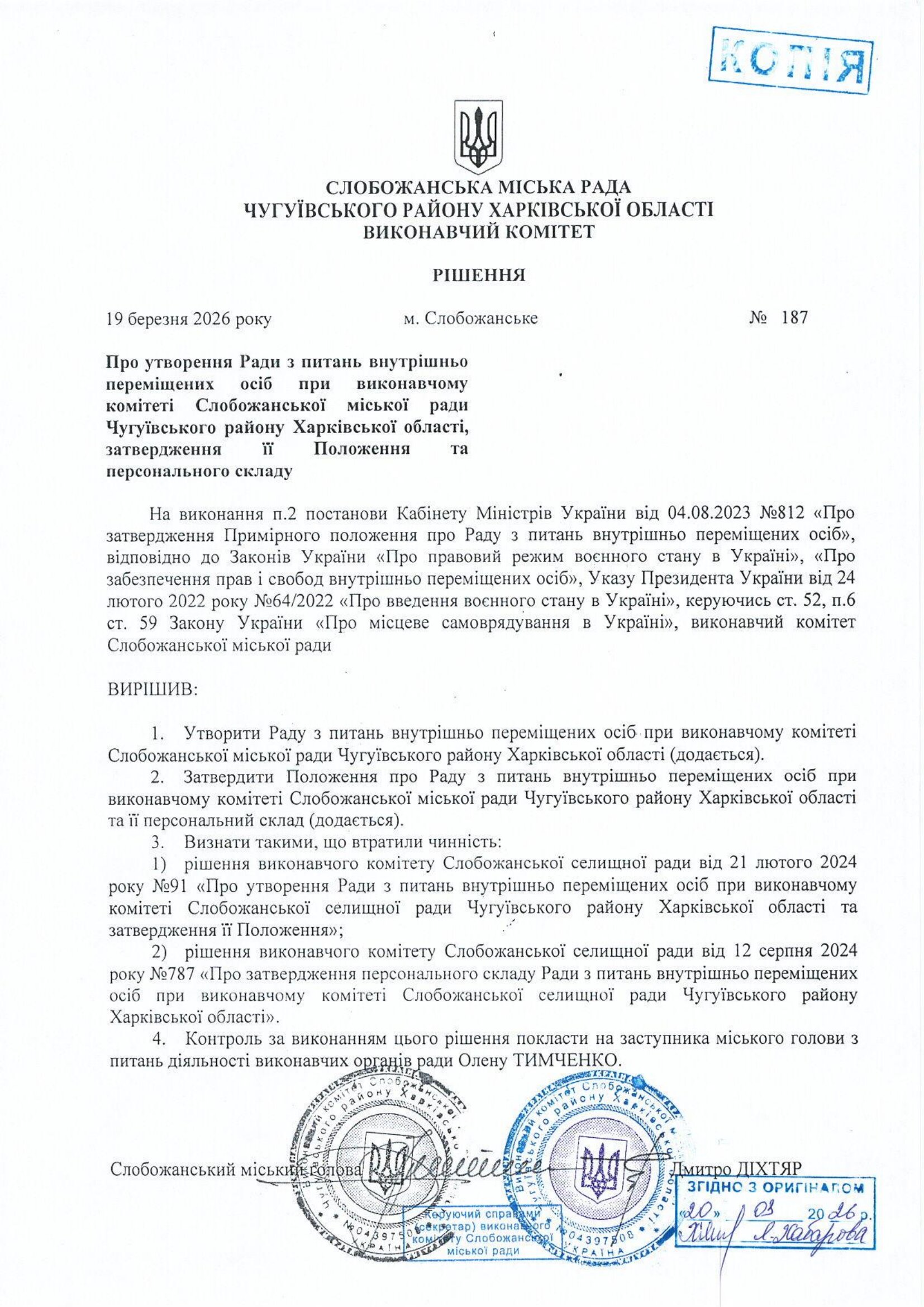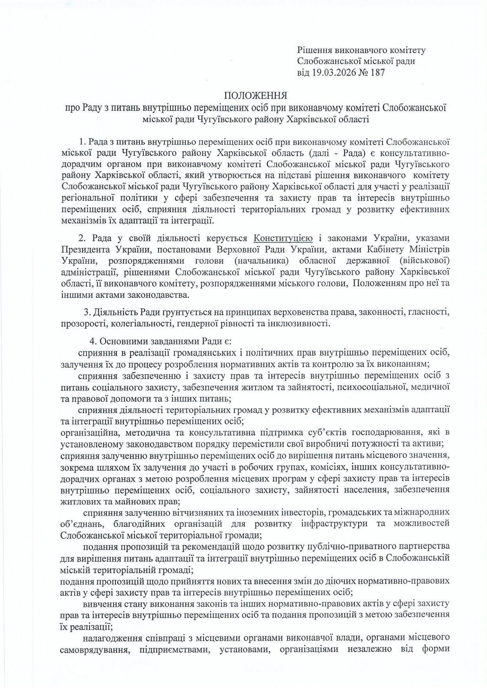 Рішення про утворення Ради з питань внутрішньо переміщених осіб при виконавчому комітеті Слобожанської міської ради Чугуївського району Харківської області, затвердження її Положення та персонального складу