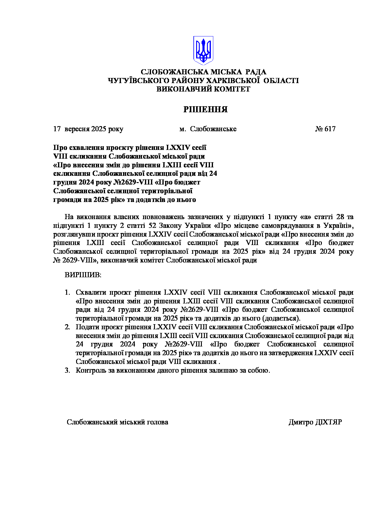 Рішення виконавчого комітету №617 Про схвалення проєкту рішення LXХIV сесії VIII скликання Слобожанської міської ради «Про внесення змін до рішення LXIII сесії VIII скликання Слобожанської селищної ради від 24 грудня 2024 року №2629-VIII «Про бюджет Слобожанської селищної територіальної громади на 2025 рік» та додатків до нього.