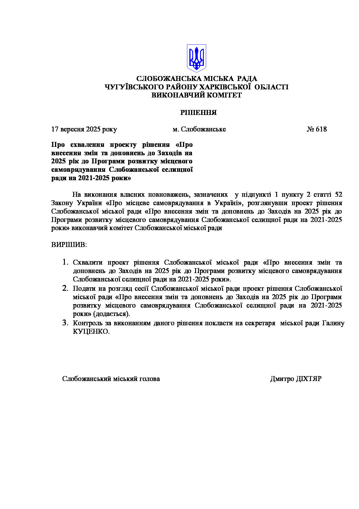 Рішення виконавчого комітету №618 Про схвалення проекту рішення «Про внесення змін та доповнень до Заходів на 2025 рік до Програми розвитку місцевого самоврядування Слобожанської селищної ради на 2021-2025 роки».