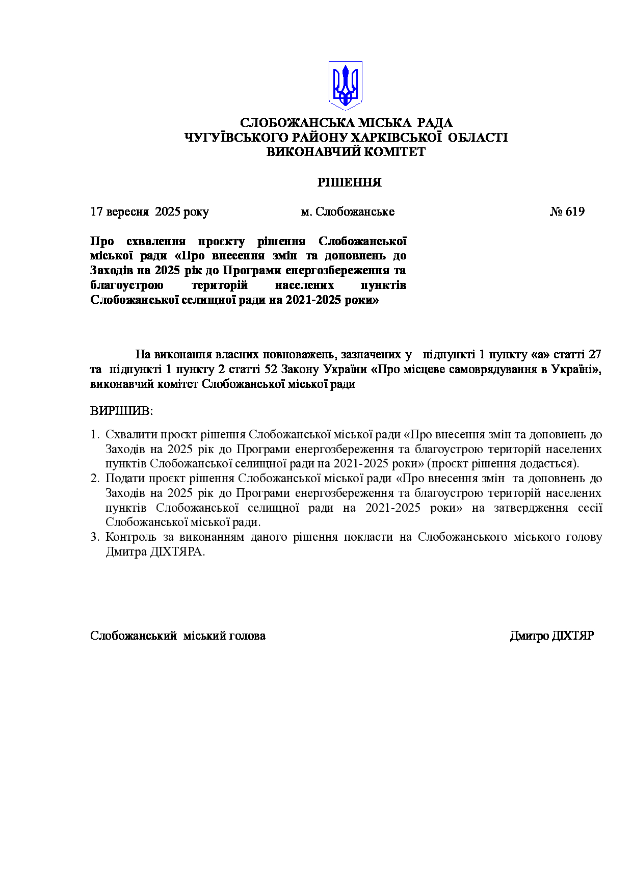 Рішення виконавчого комітету №619 Про схвалення проєкту рішення Слобожанської міської ради «Про внесення змін та доповнень до Заходів на 2025 рік до Програми енергозбереження та благоустрою територій населених пунктів Слобожанської селищної ради на 2021-2025 роки»